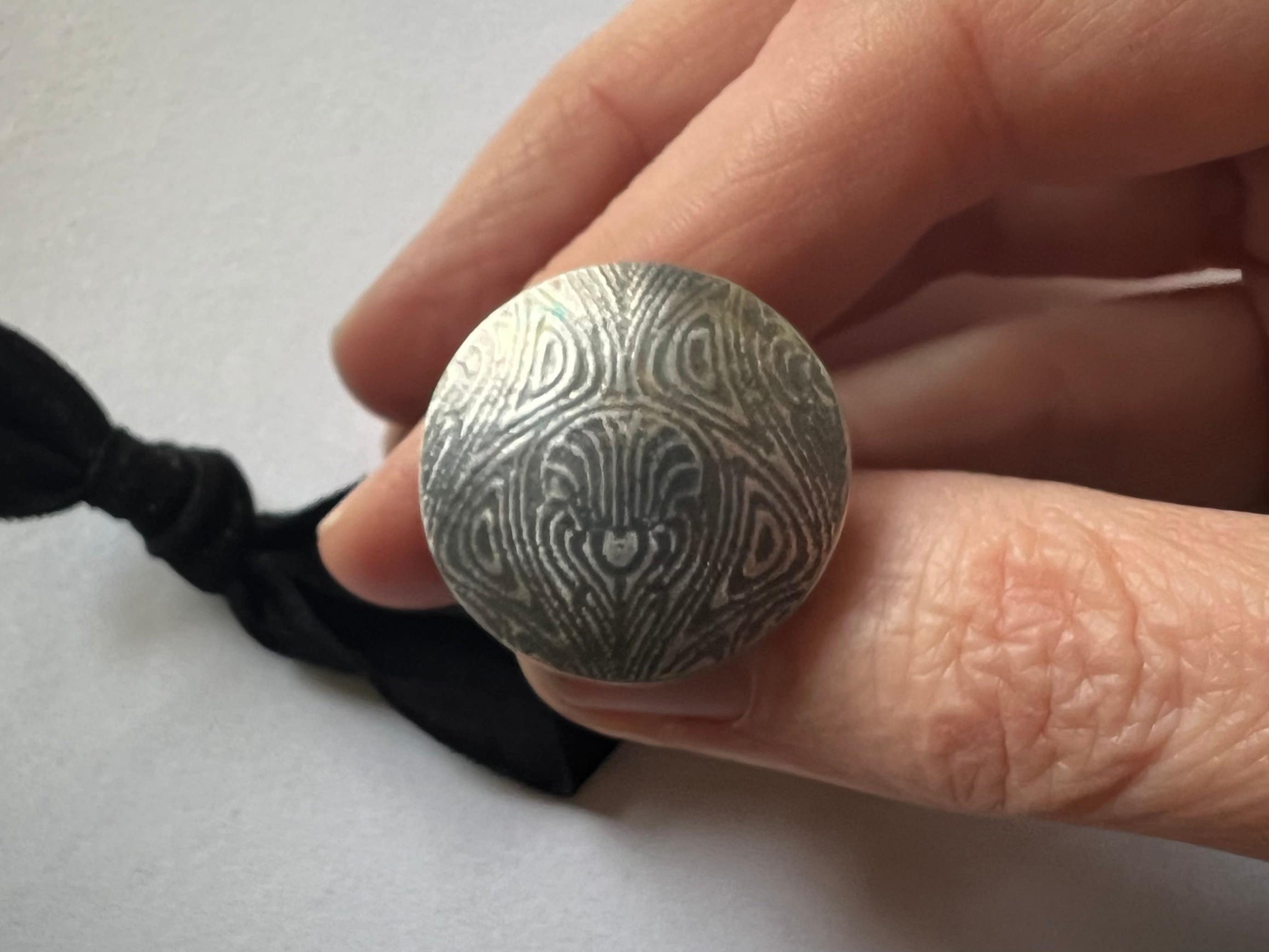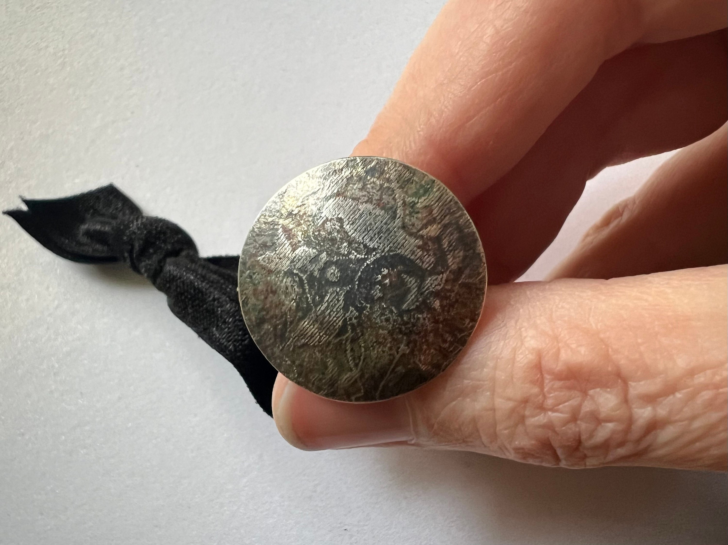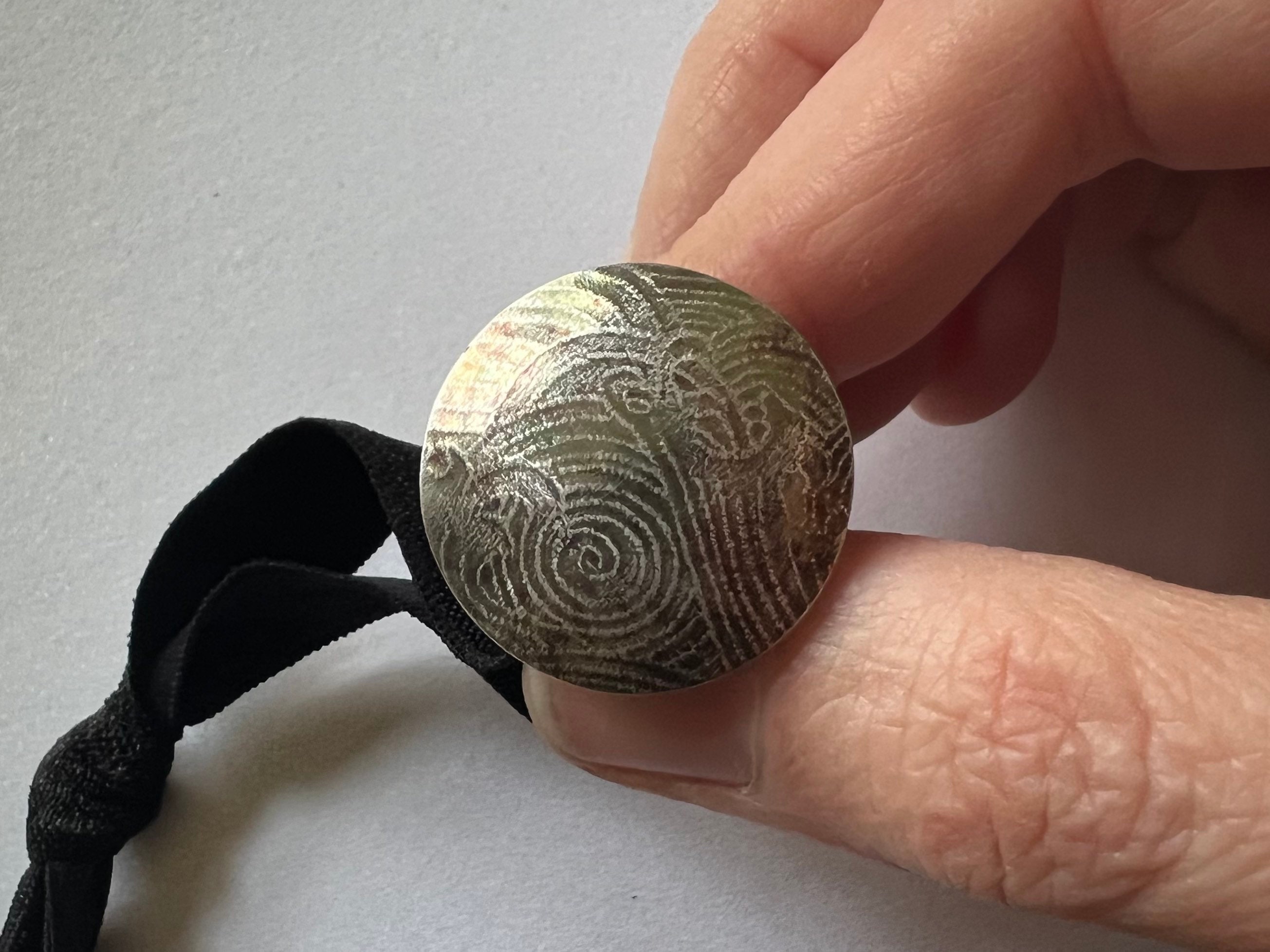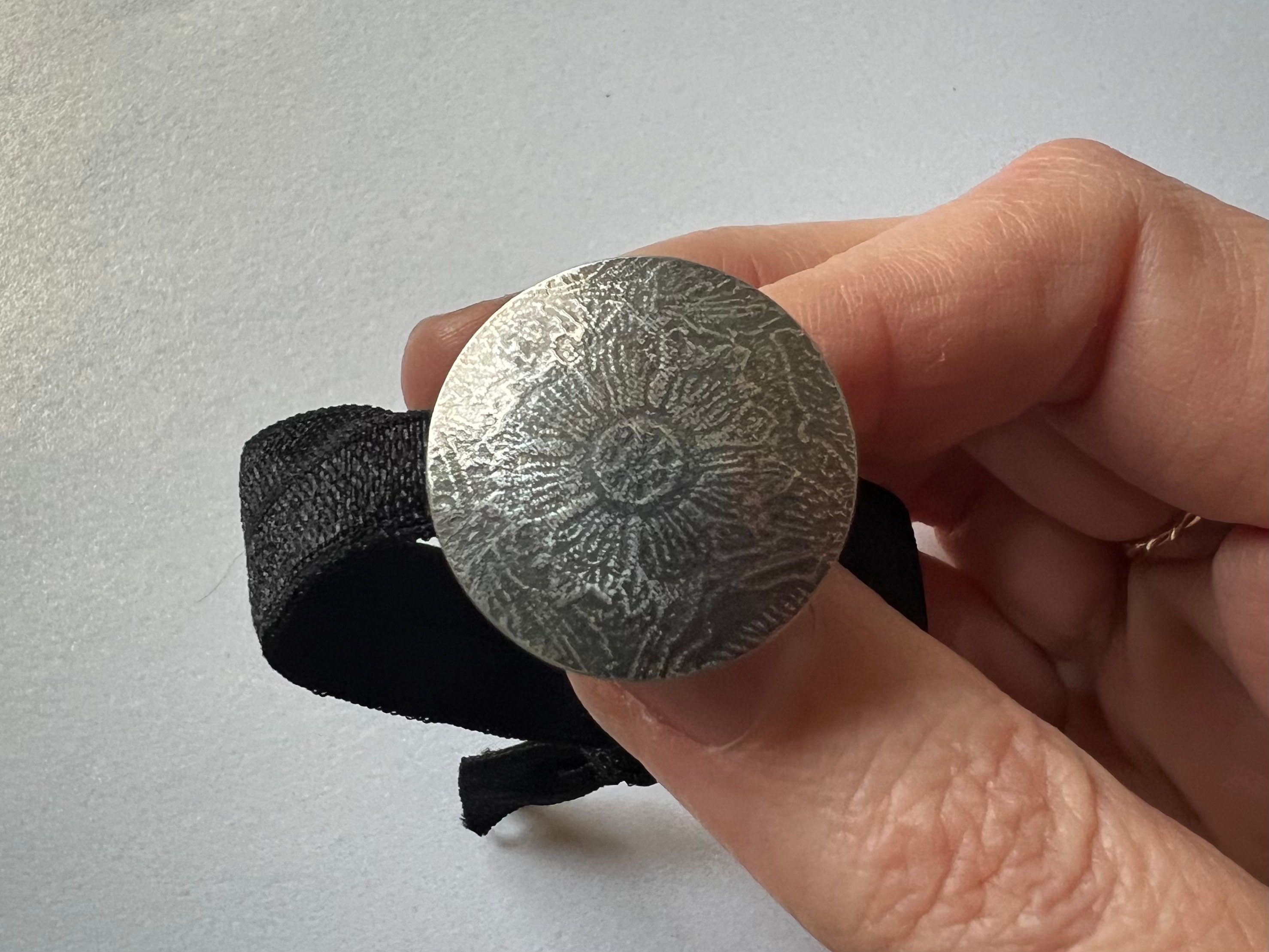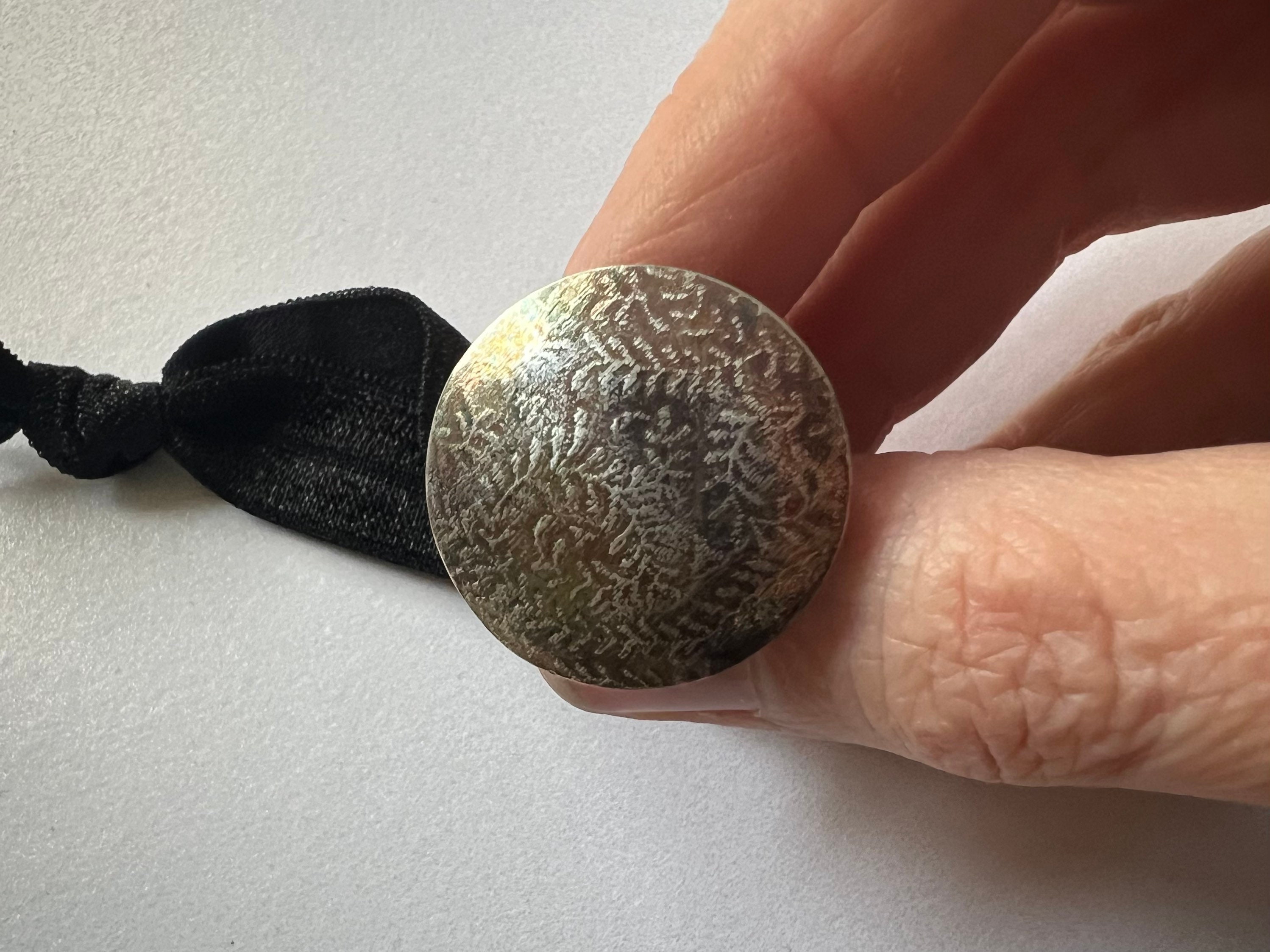 The disc measures just shy of 1 inch and has a sterling silver loop in the back.