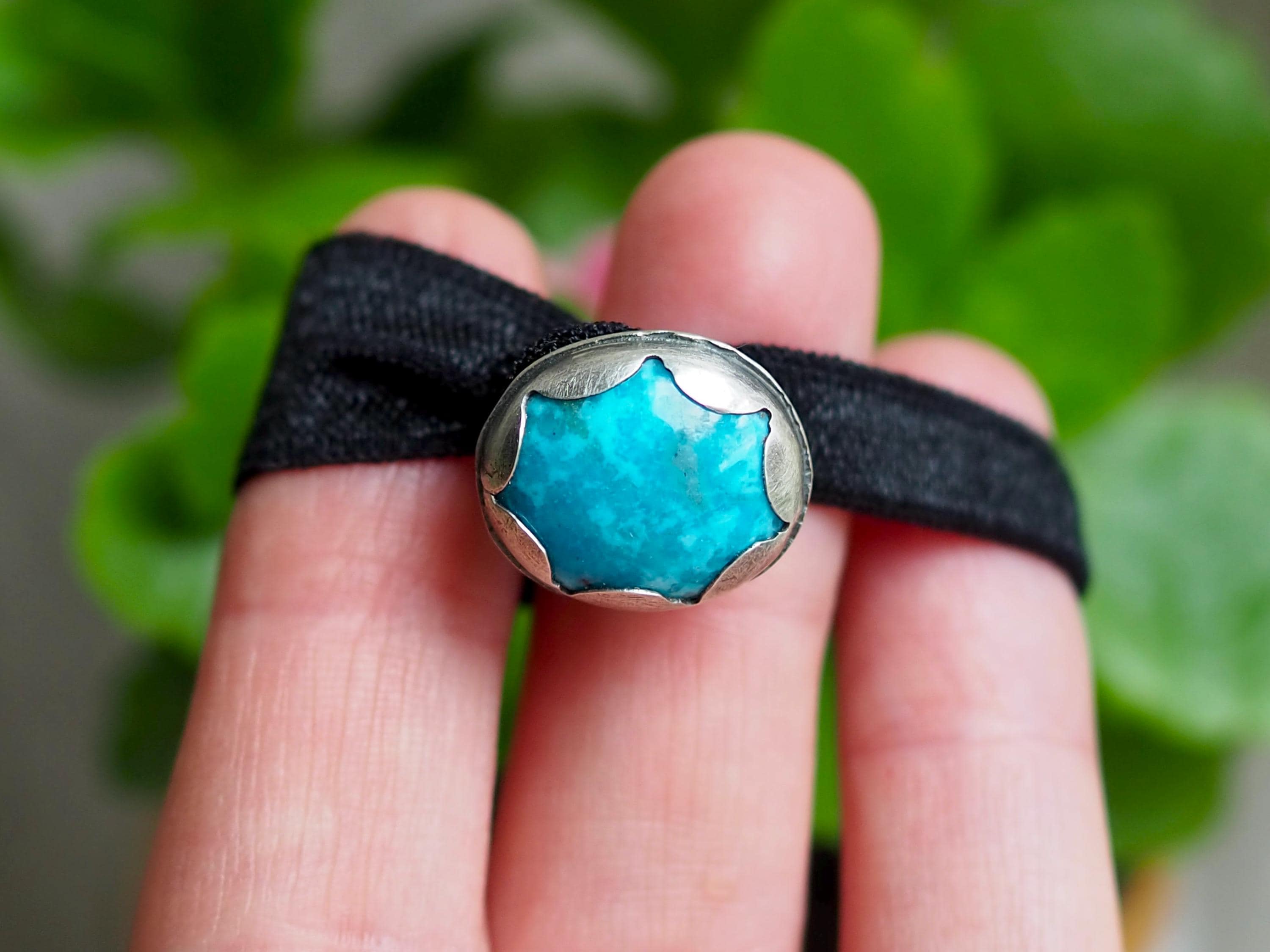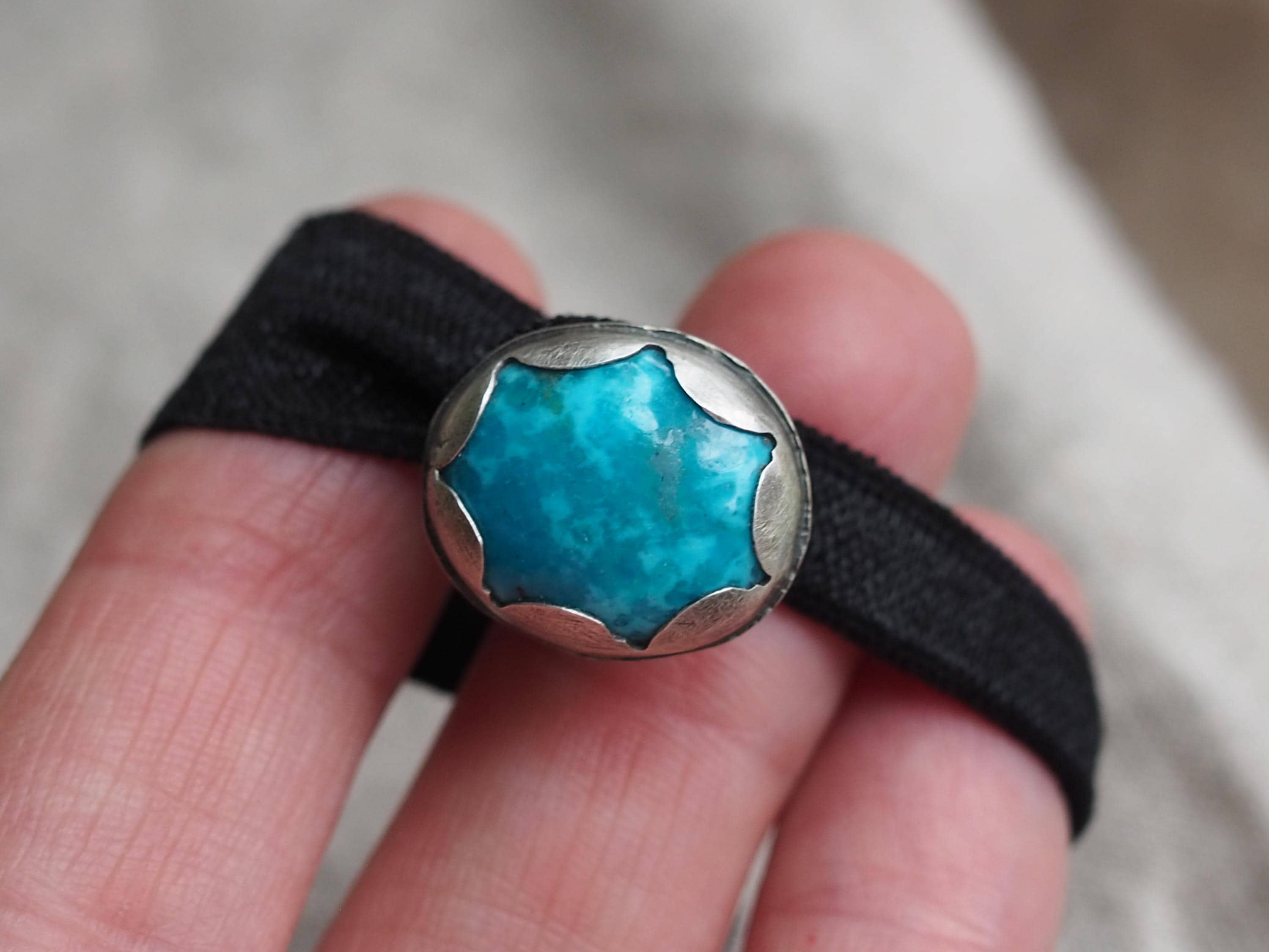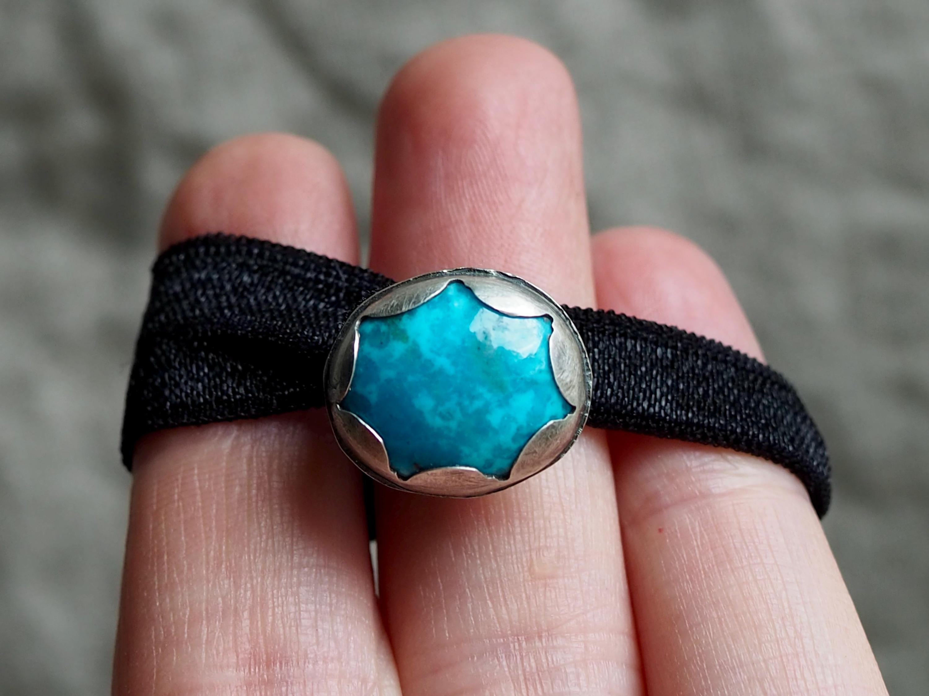 Recycled sterling silver oval disc with brushed texture is set with a large 14mm x 17mm oval Morenci turquoise in a fine silver scalloped bezel. The hair tie measures approximately .85 by 0.75 inches and has a sterling silver loop in the back.