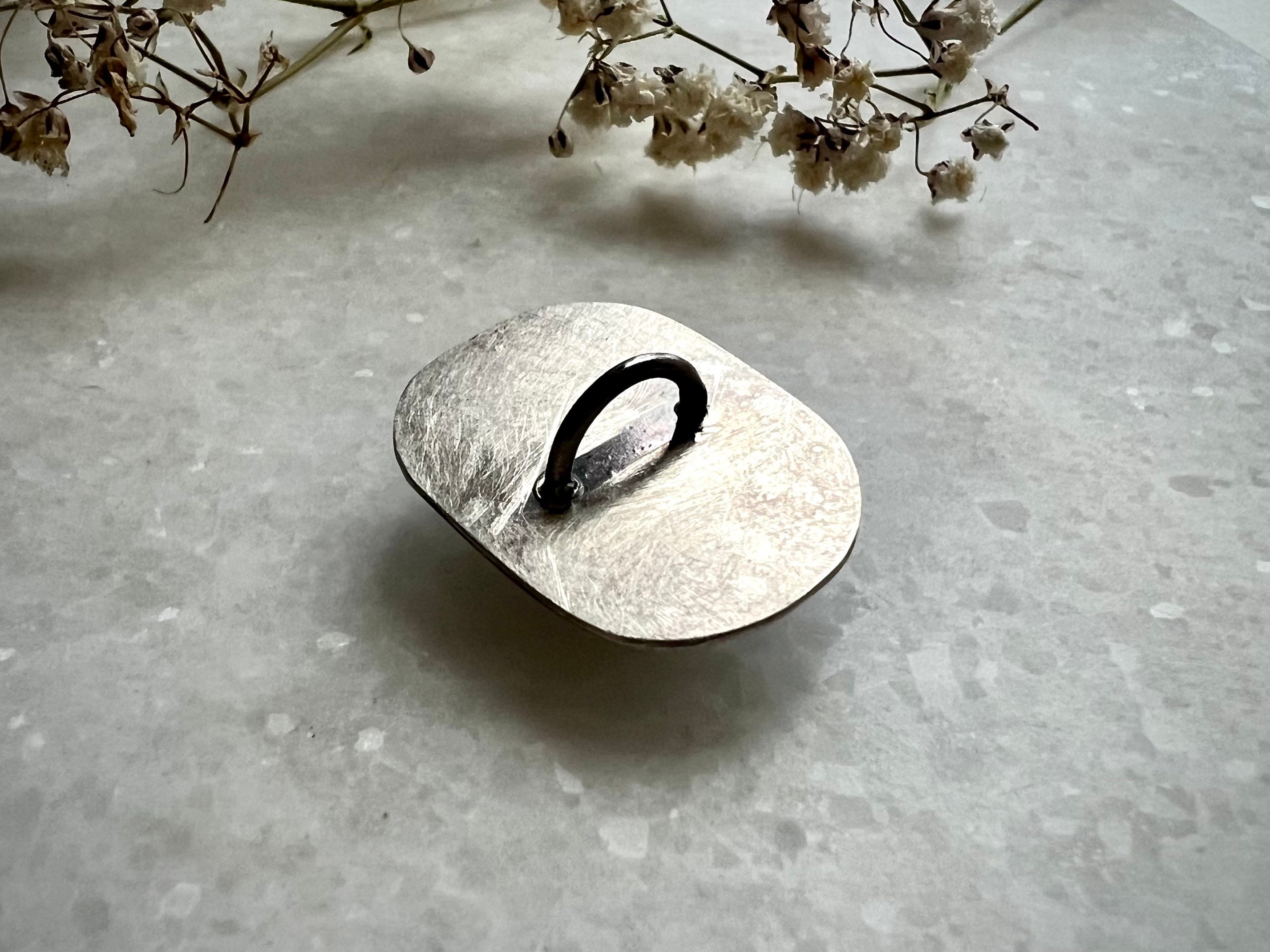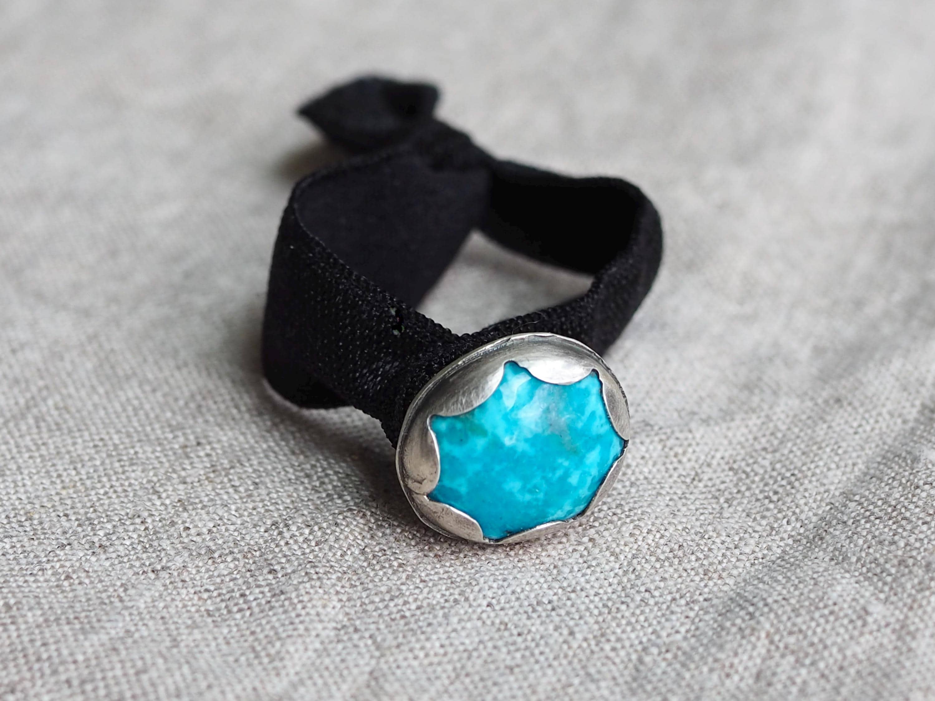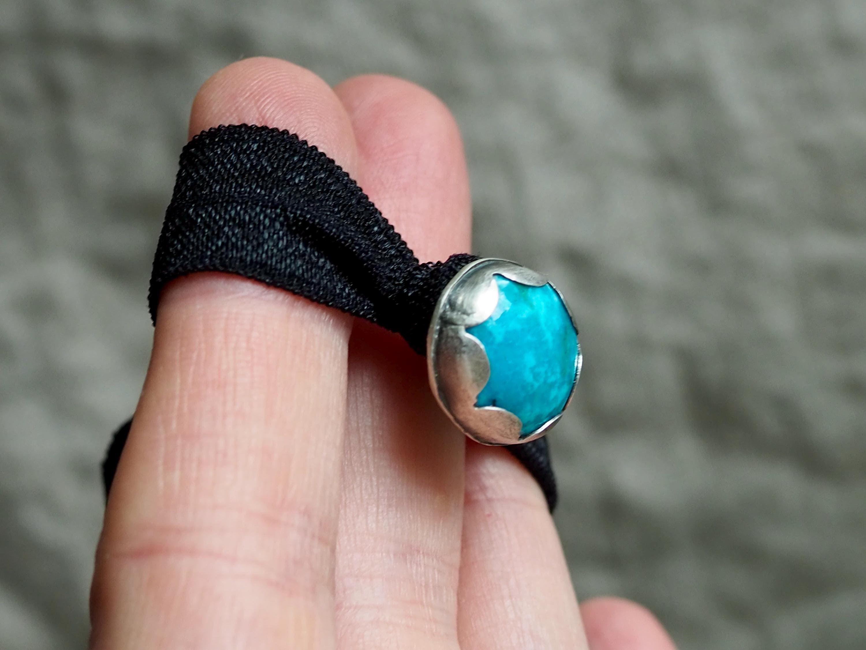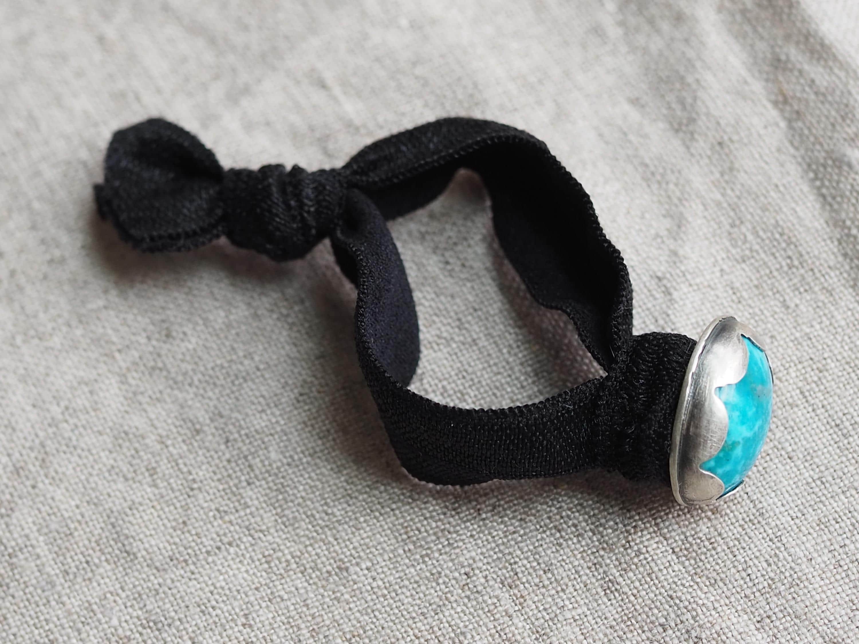 Recycled sterling silver oval disc with brushed texture is set with a large 14mm x 17mm oval Morenci turquoise in a fine silver scalloped bezel. The hair tie measures approximately .85 by 0.75 inches and has a sterling silver loop in the back.