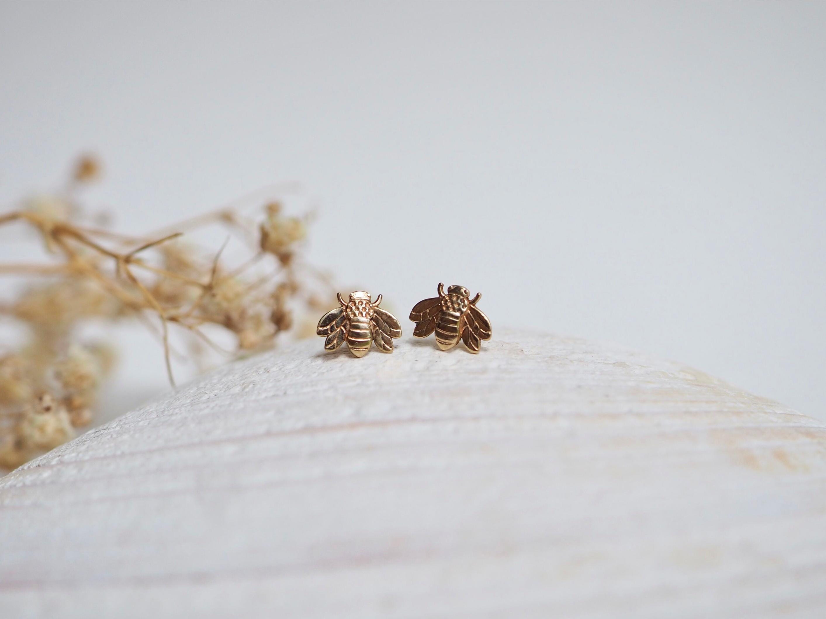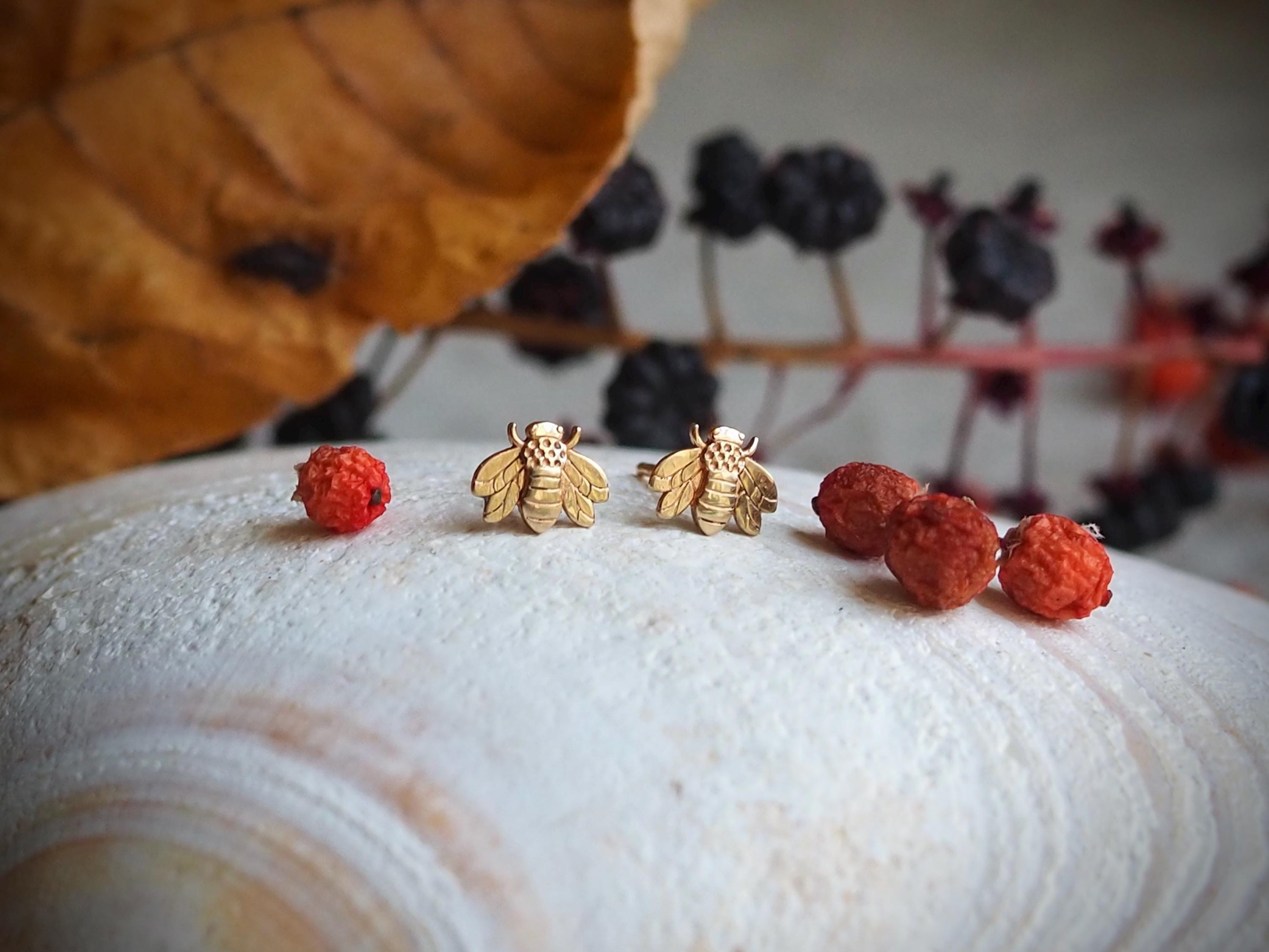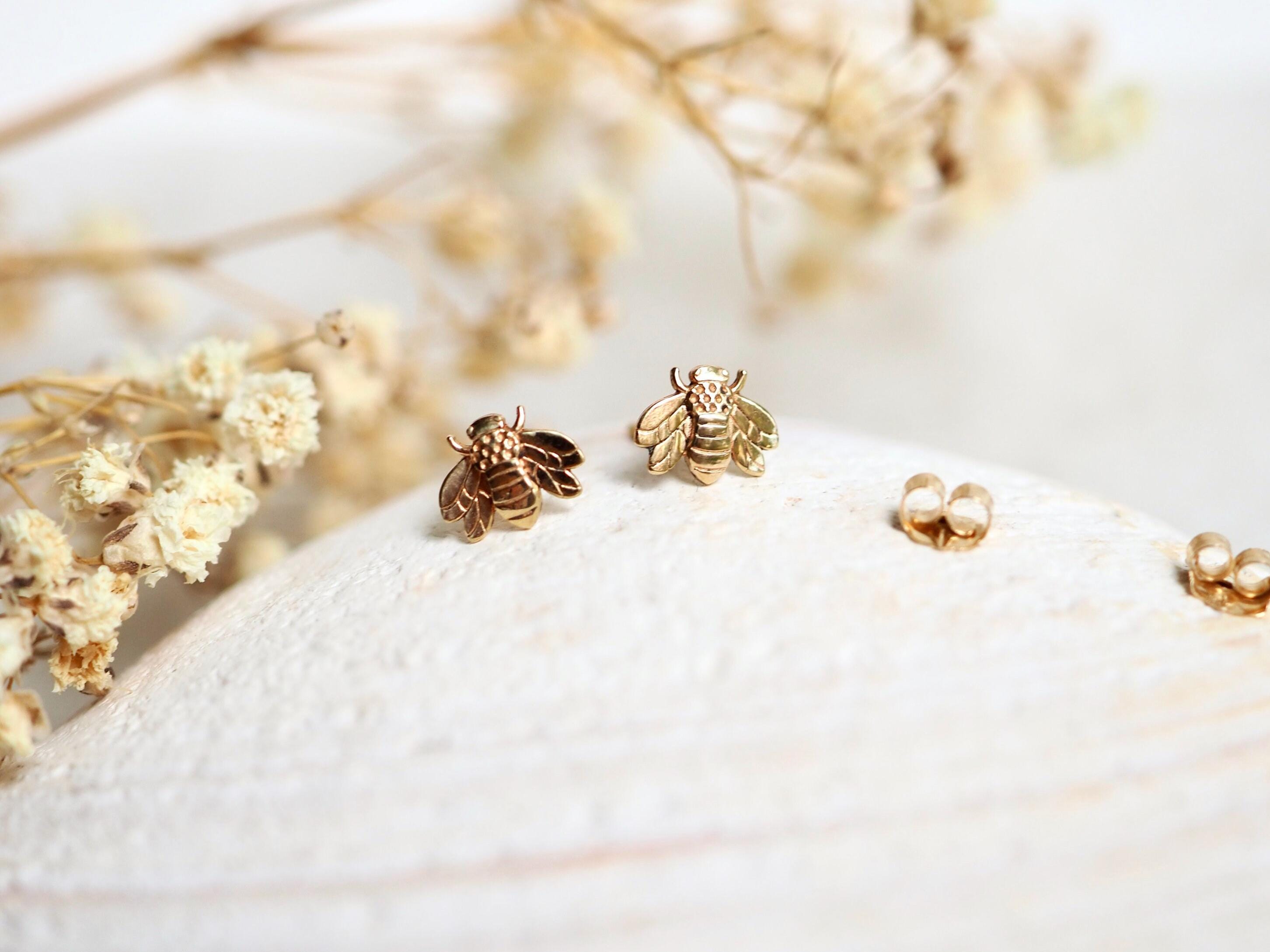 These solid 14k gold little bees can keep you company on your ears. They are subtle and elegant and measure approximately 7mm and 5mm.