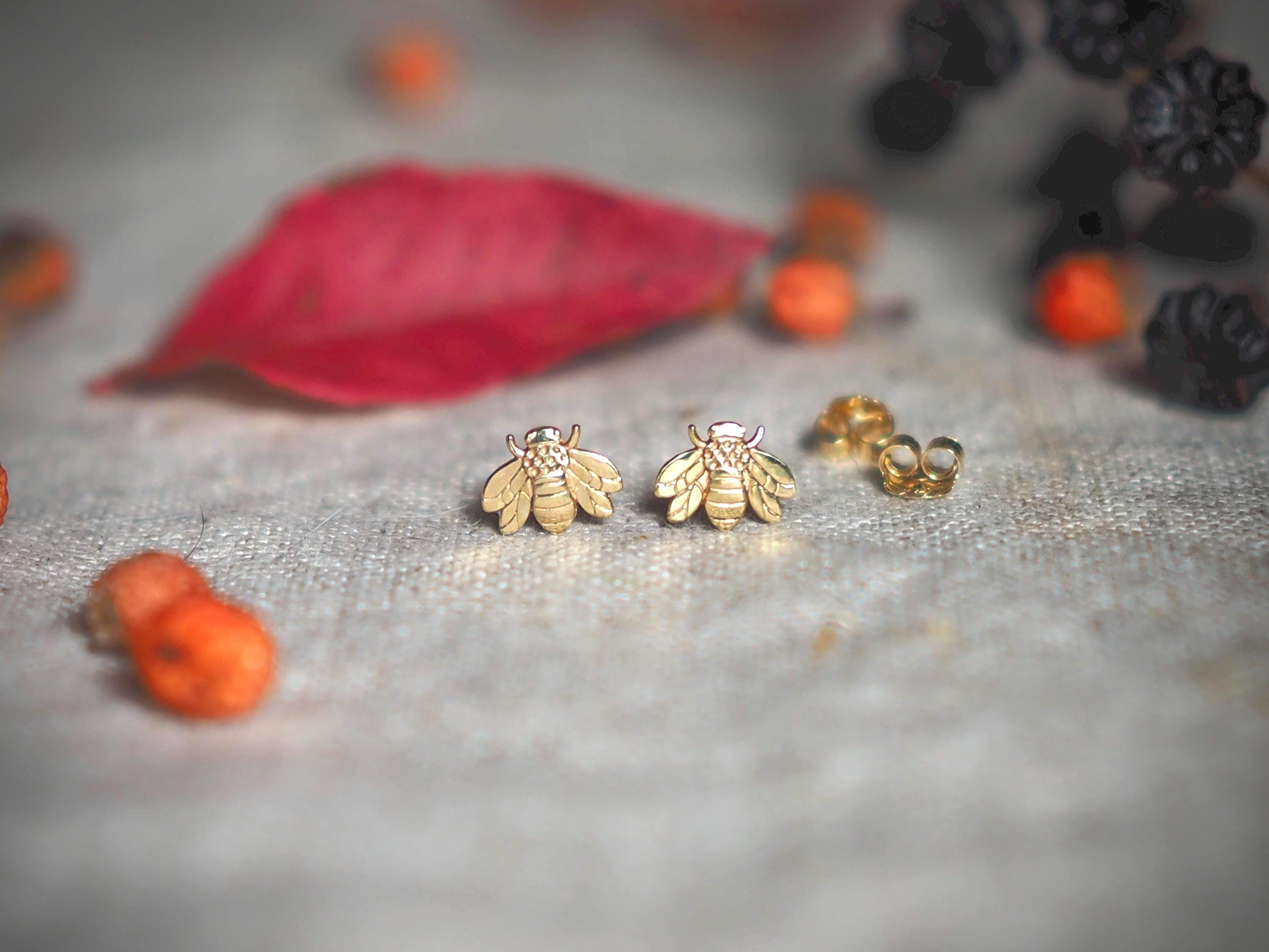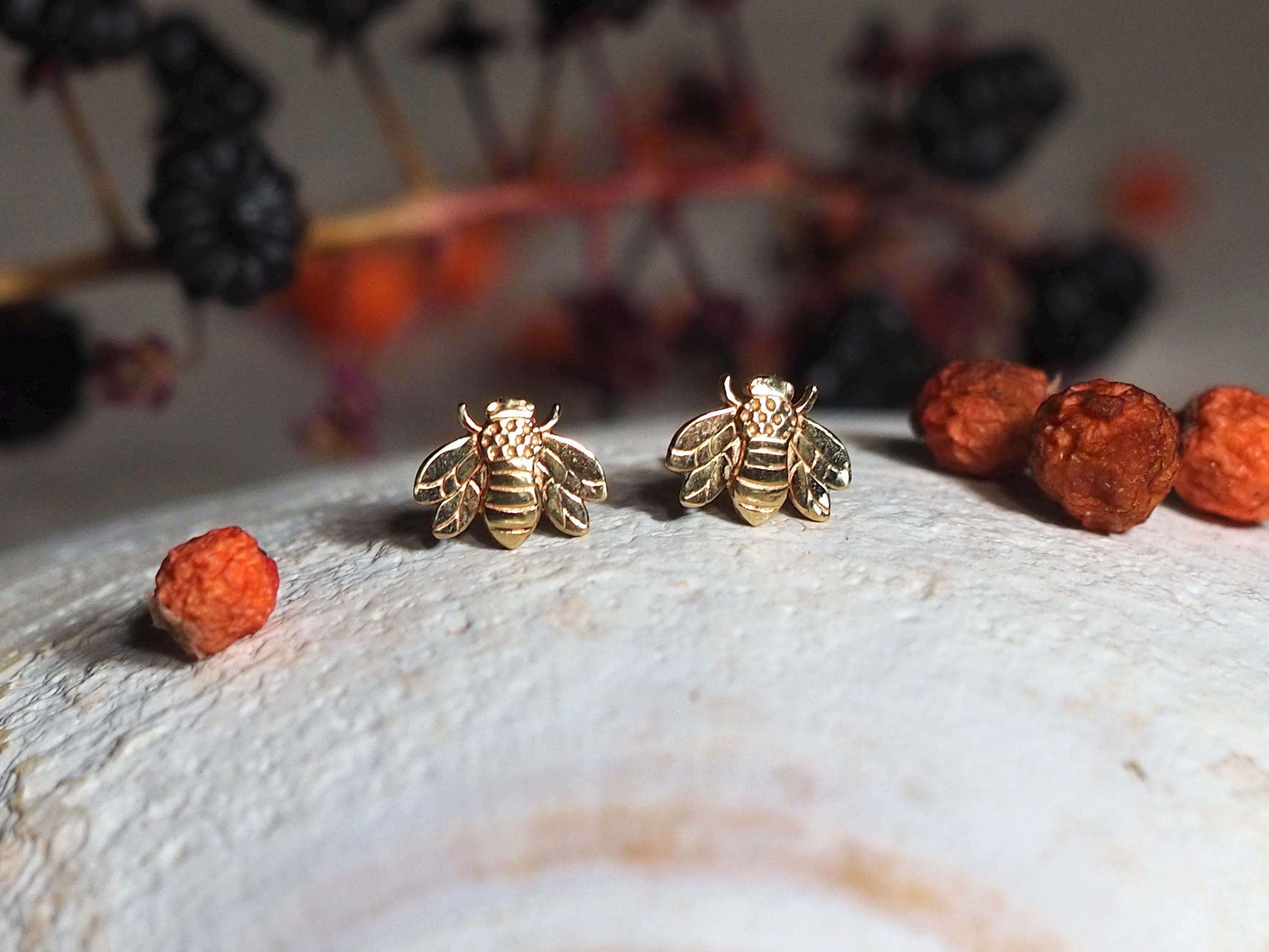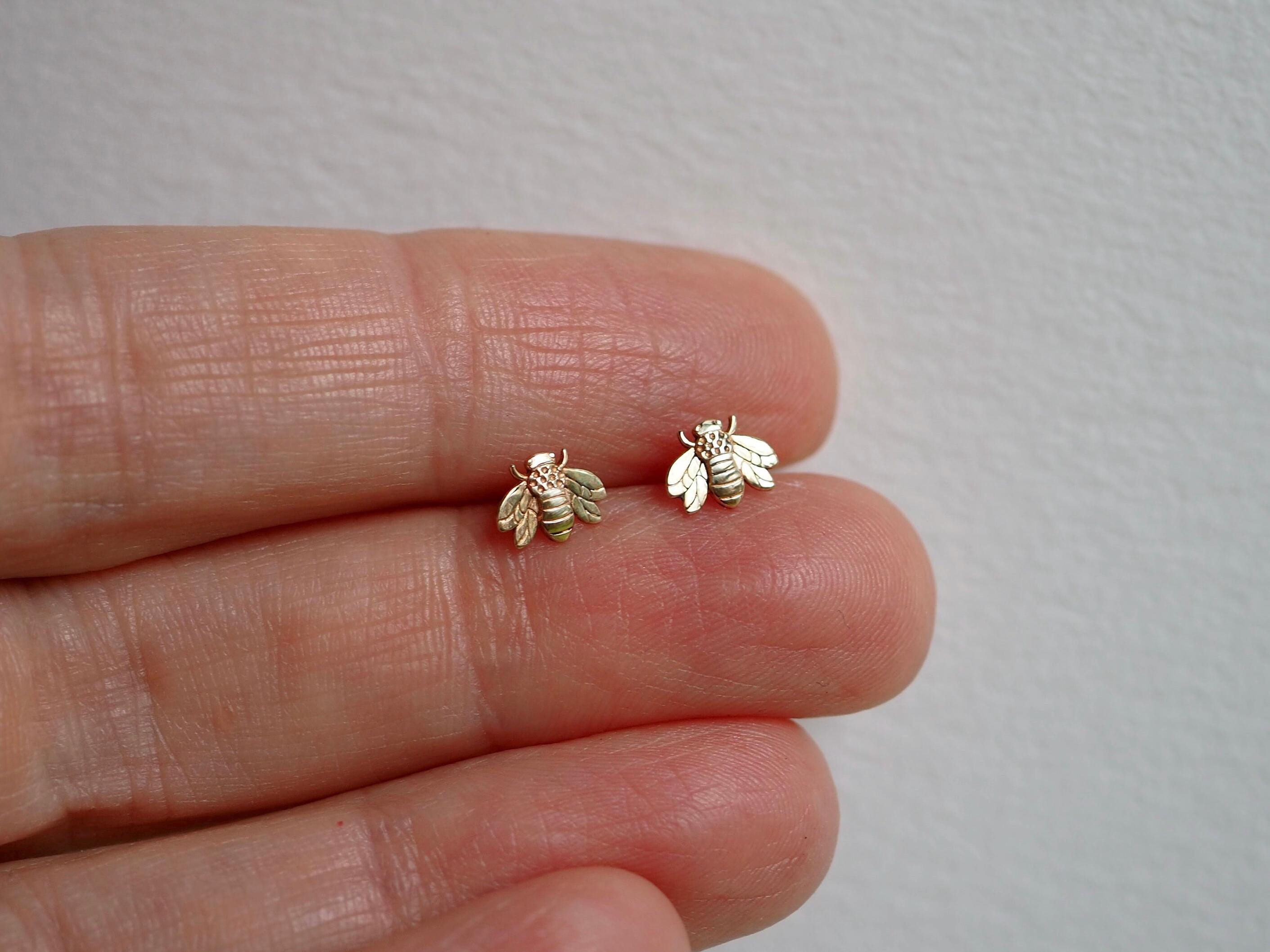 These solid 14k gold little bees can keep you company on your ears. They are subtle and elegant and measure approximately 7mm and 5mm.