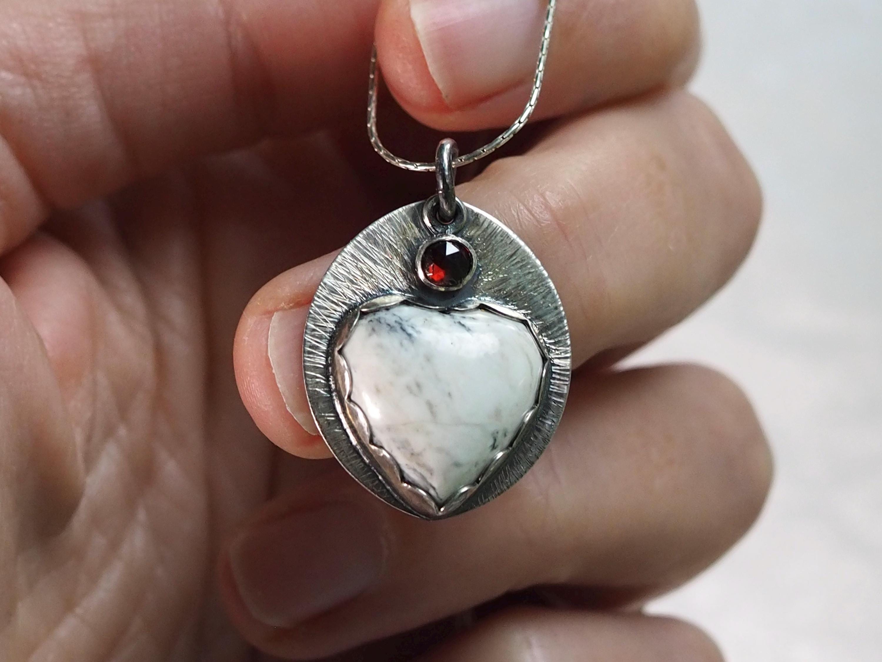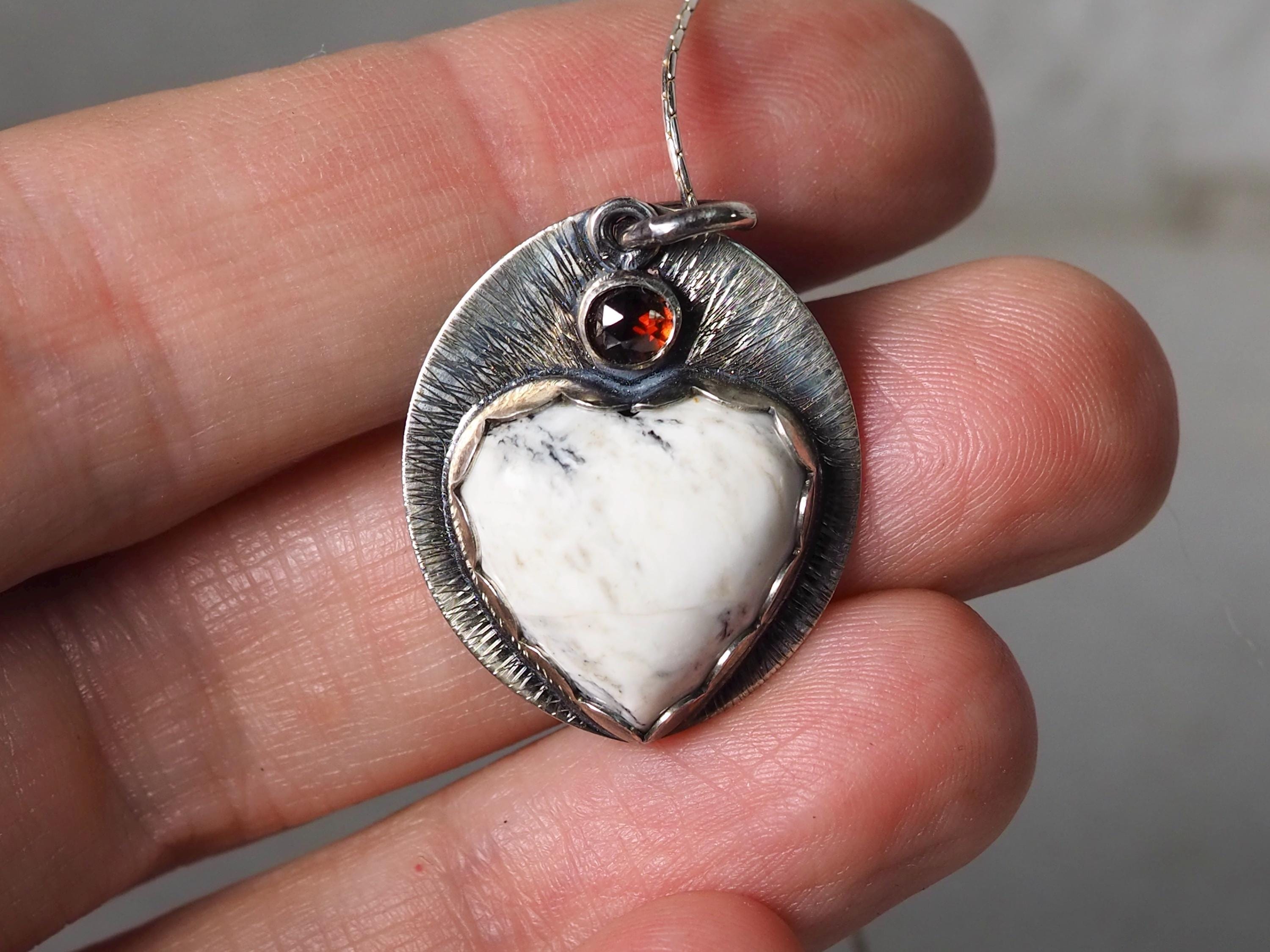A rare White Buffalo heart (19x19x6mm) is paired with wine-red, rose cut garnet (5mm). The garnet has lovely kite shaped facets that have so much sparkle. Stones are set in shiny fine silver bezels with a sterling silver marquise backplate, hand inscribed with a radiating pattern.
