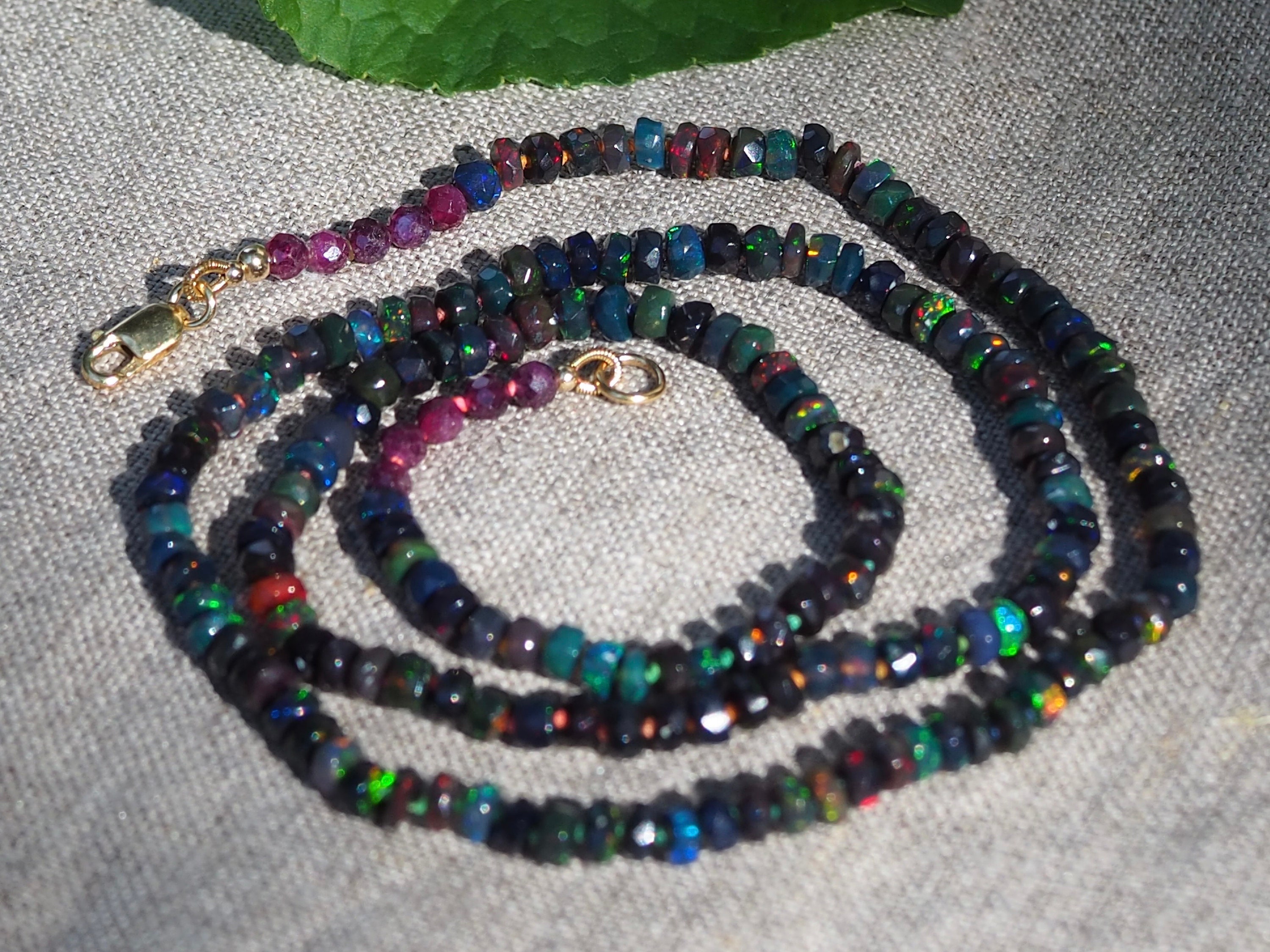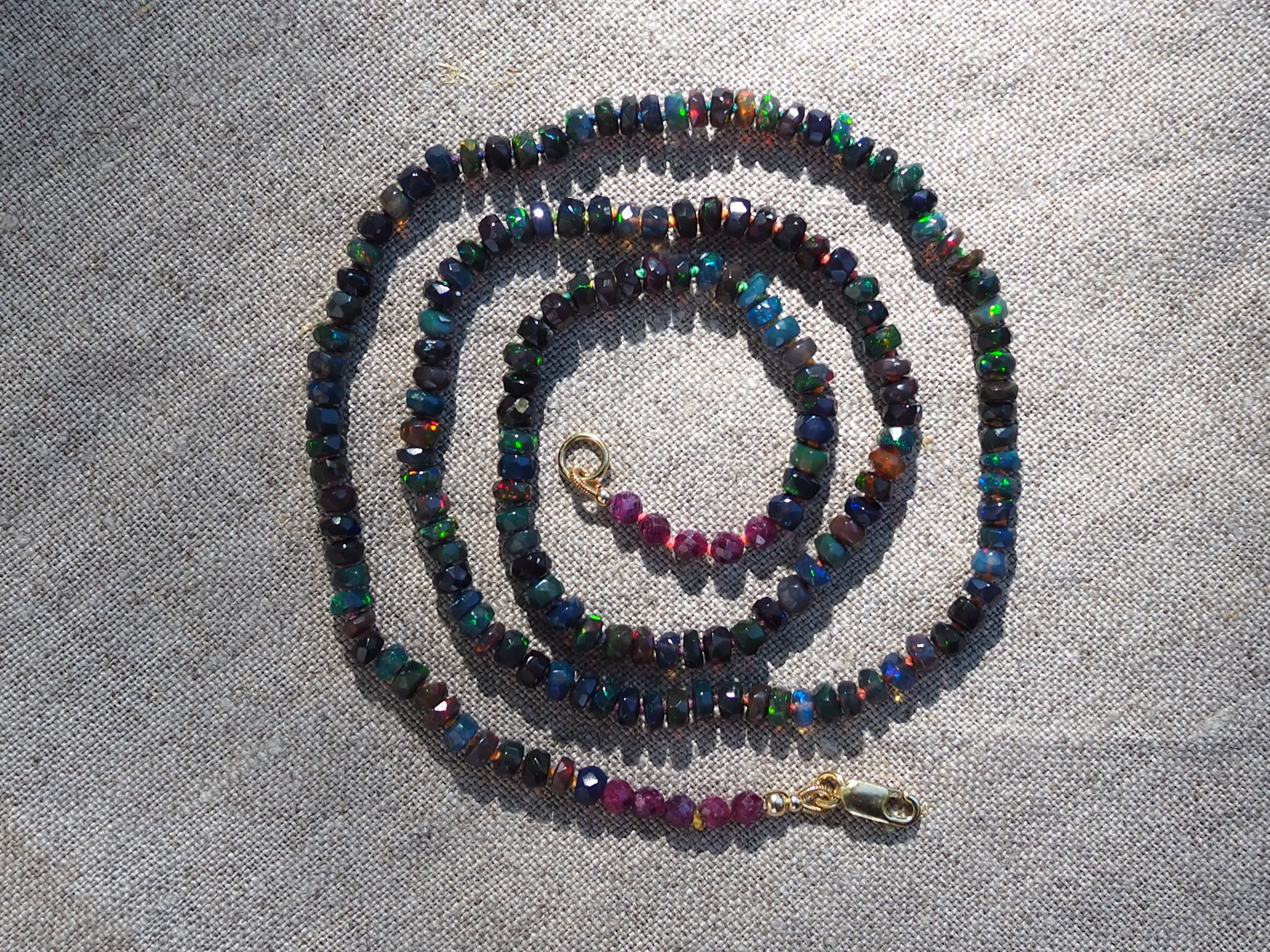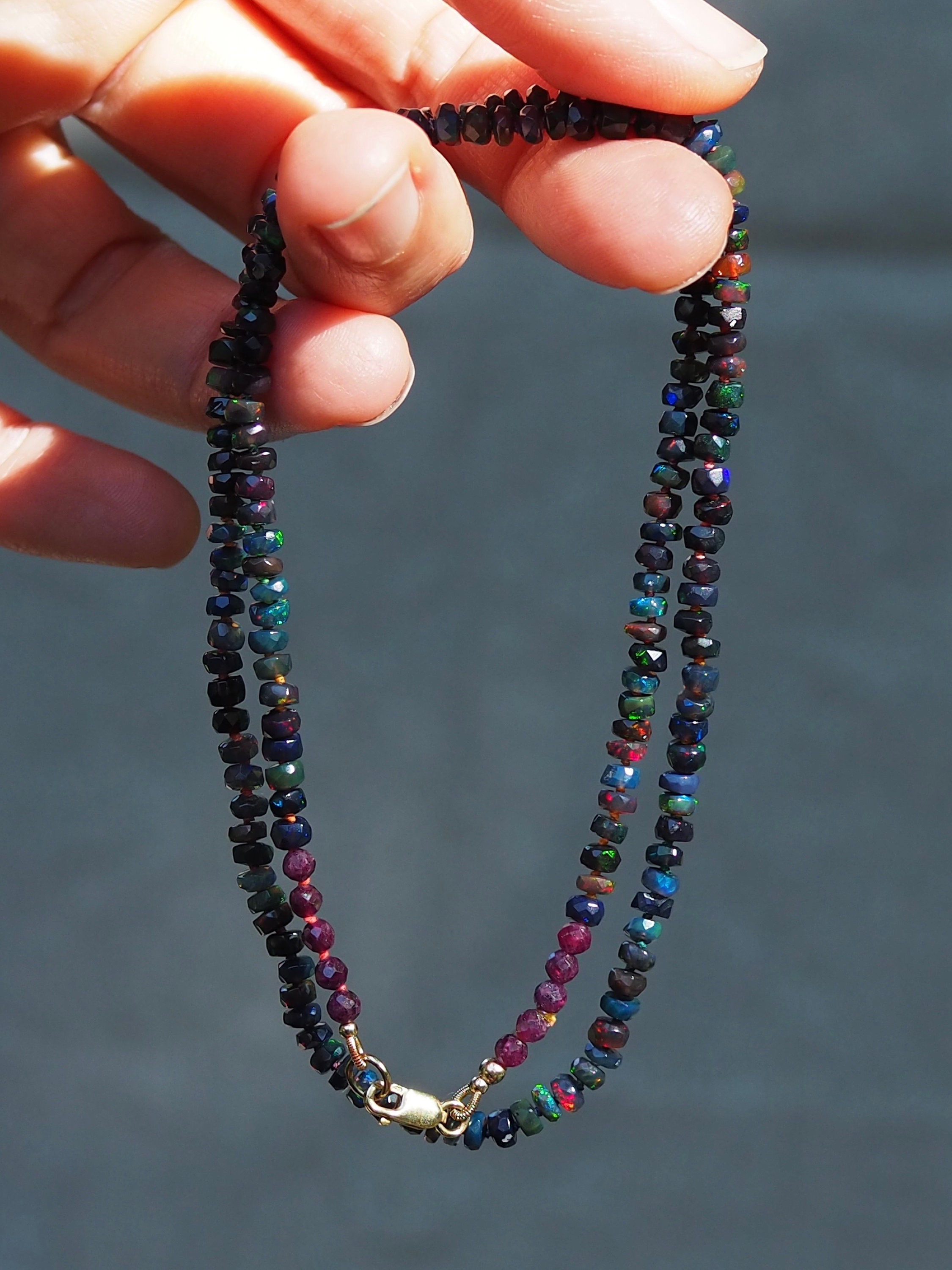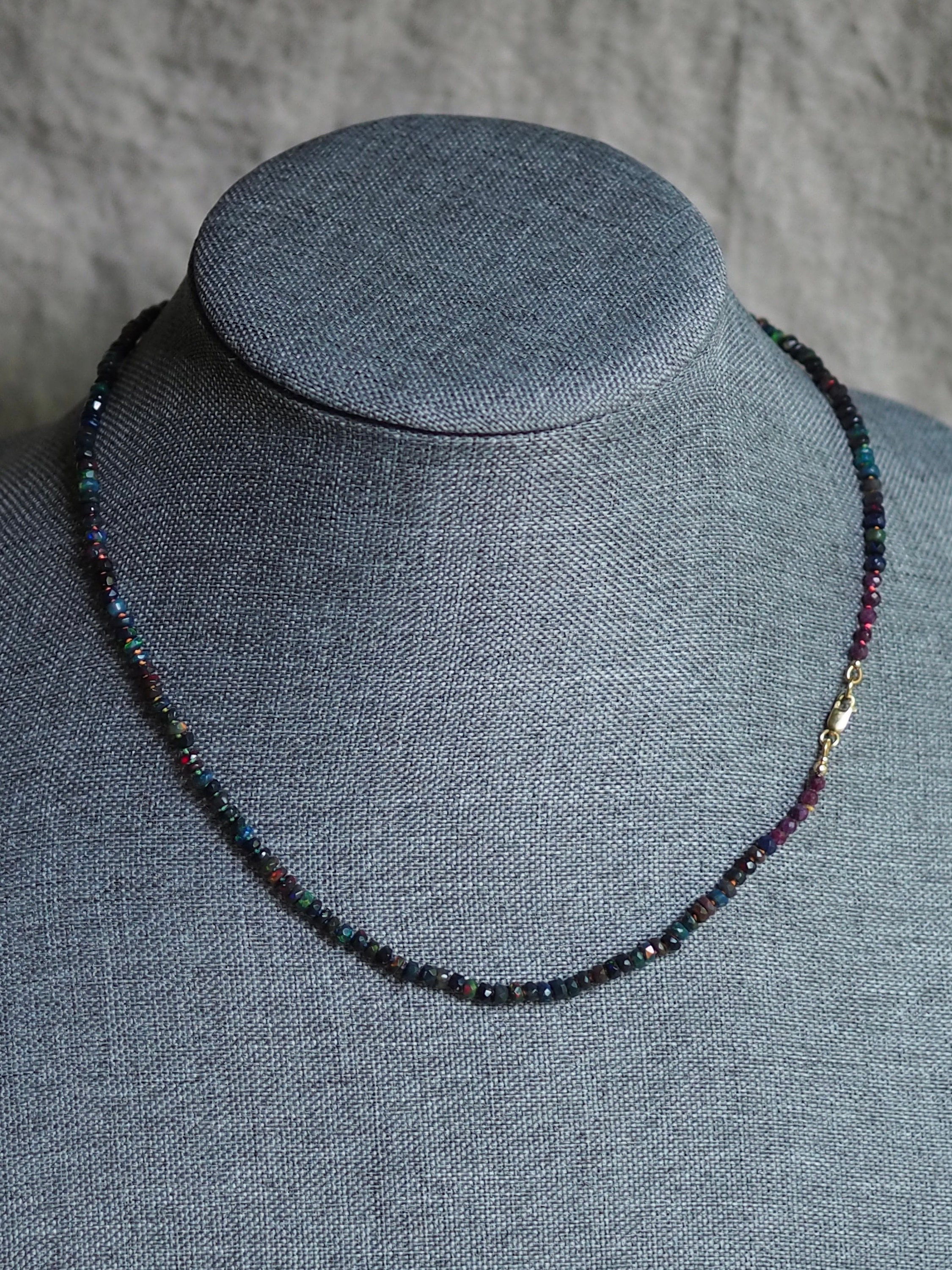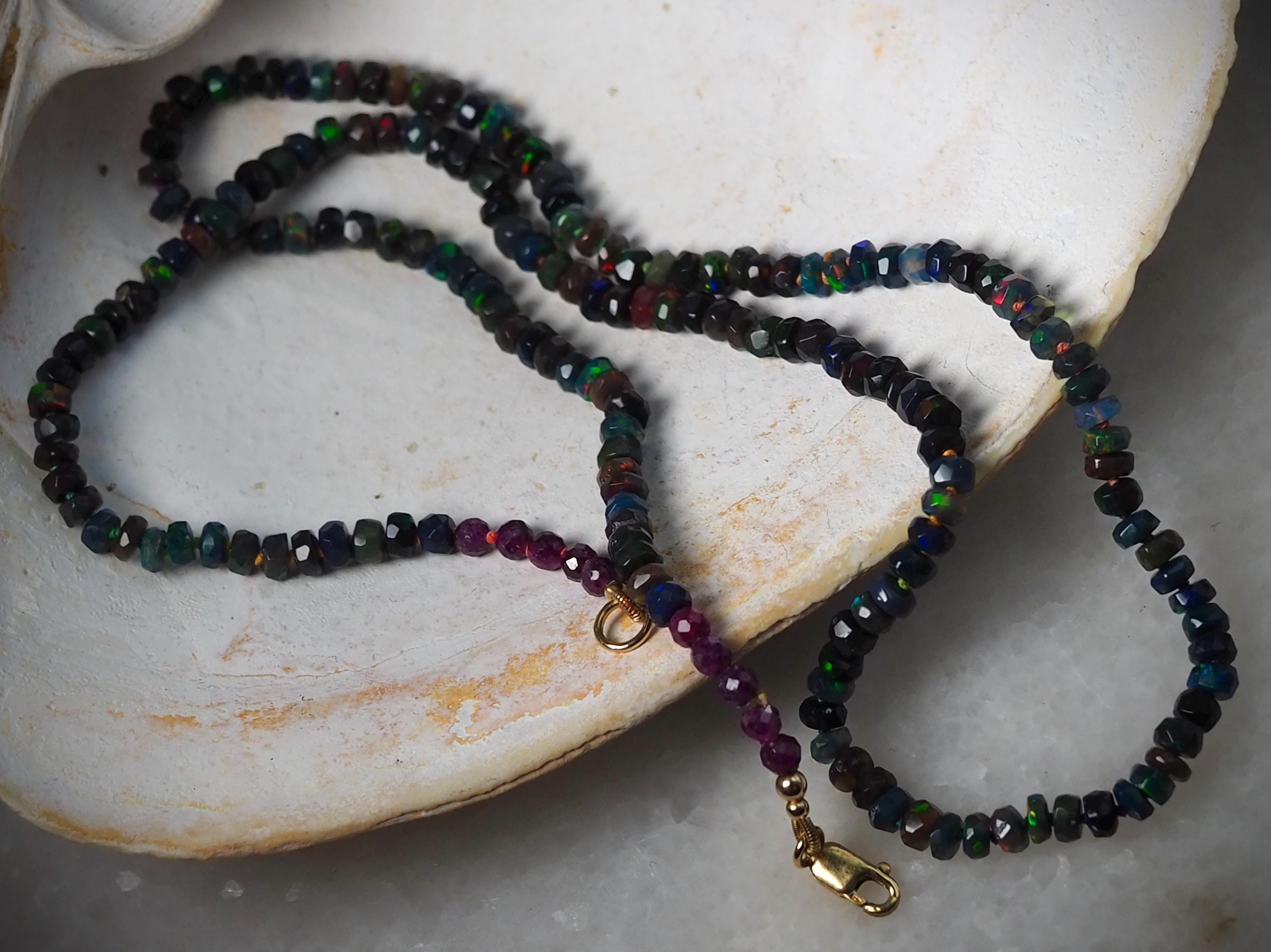 Hand-knotted candy style Ethiopian opal necklace was made with lovely, faceted rondelle beads. This opal has dark body and wonderful play of color with a multitude of gorgeous flashes from green to blue, yellow and red. The beads measure approximately 3.75-4mm in diameter and have varying width. Hand strung and knotted on custom dyed rainbow silk thread for durability and strength, this is a beautiful piece to wear alone or layered. The necklace is just under 19 inches long (18.75), finished with a row of five 3mm faceted ruby beads on either side, and a 14/20 gold filled lobster clasp.