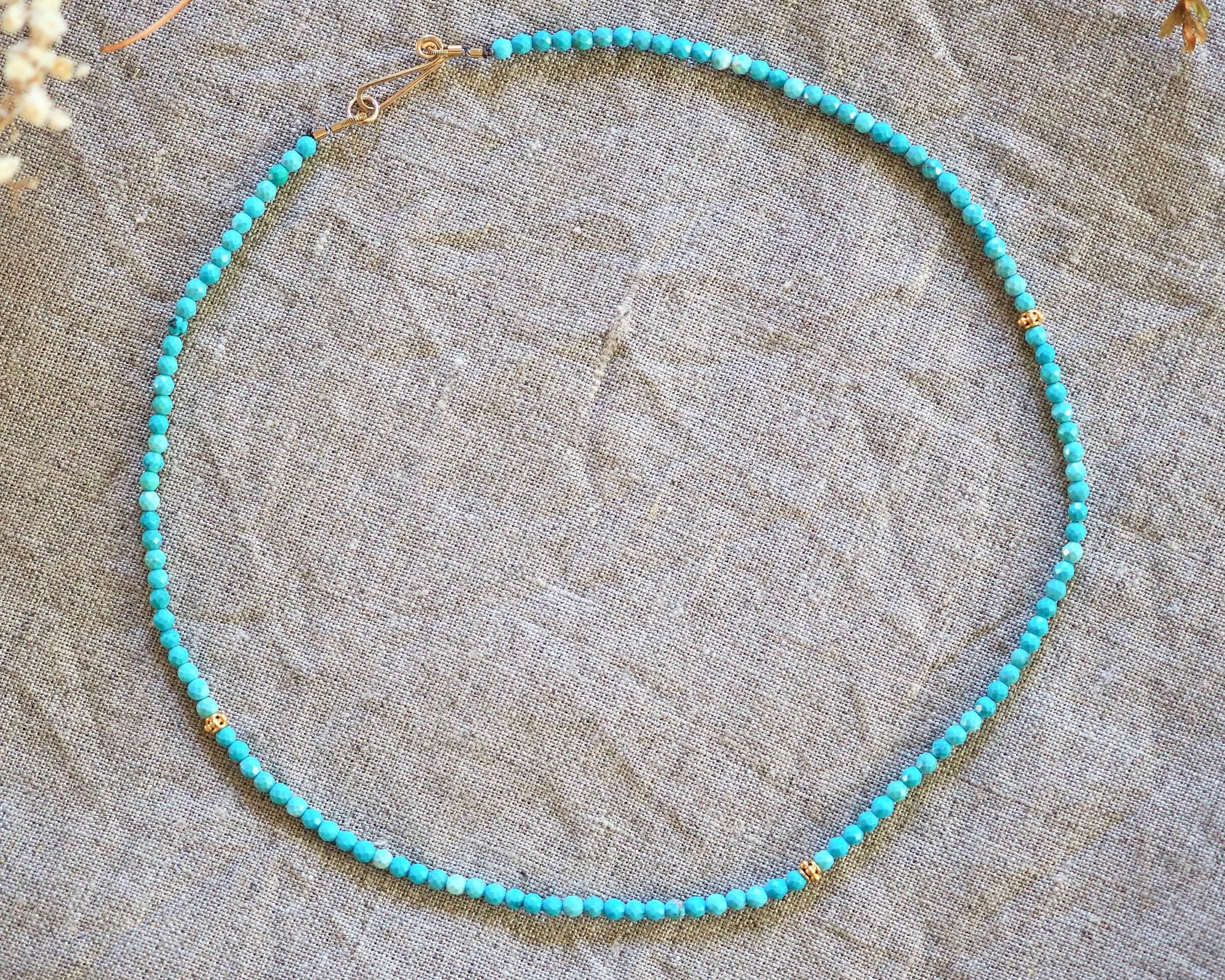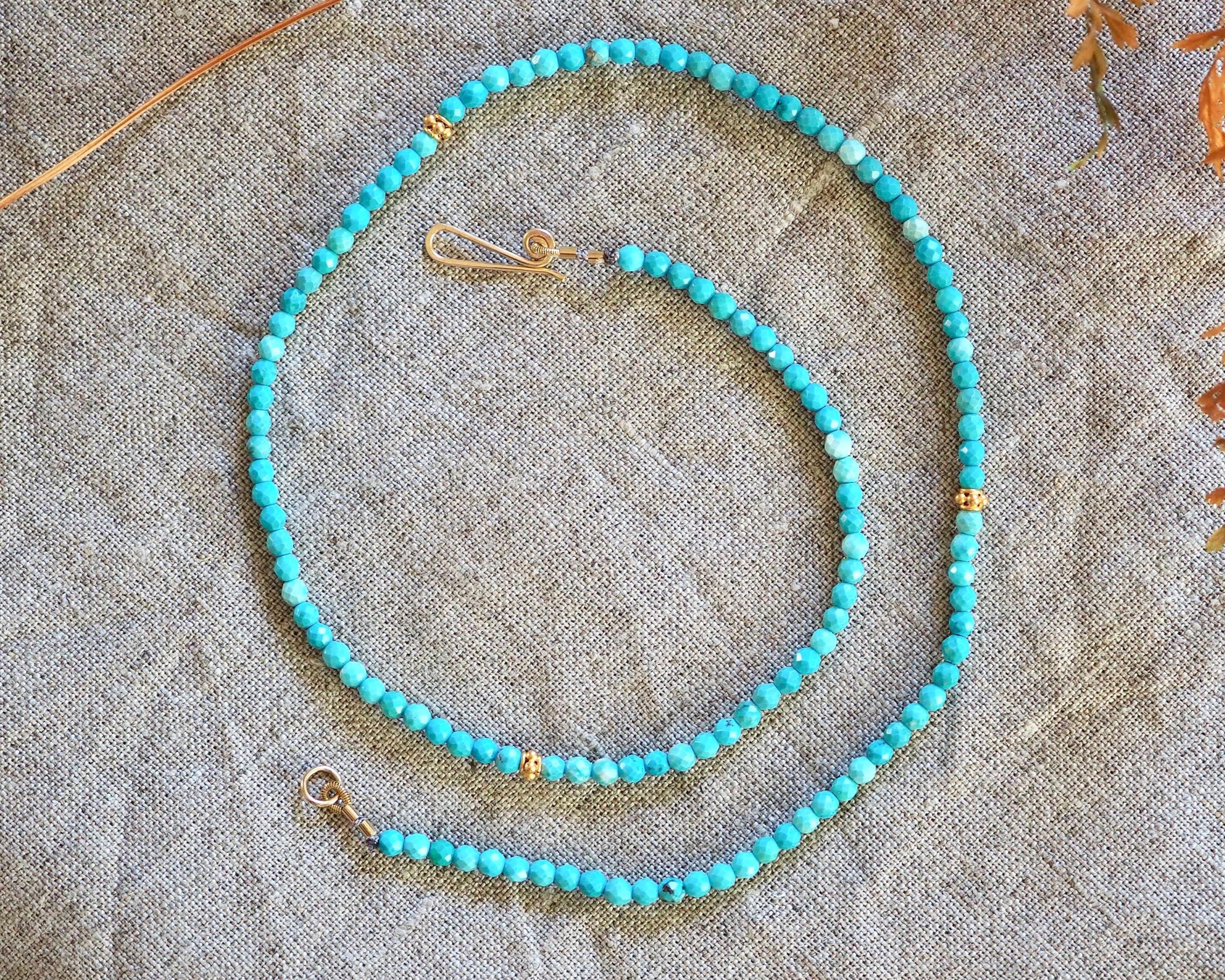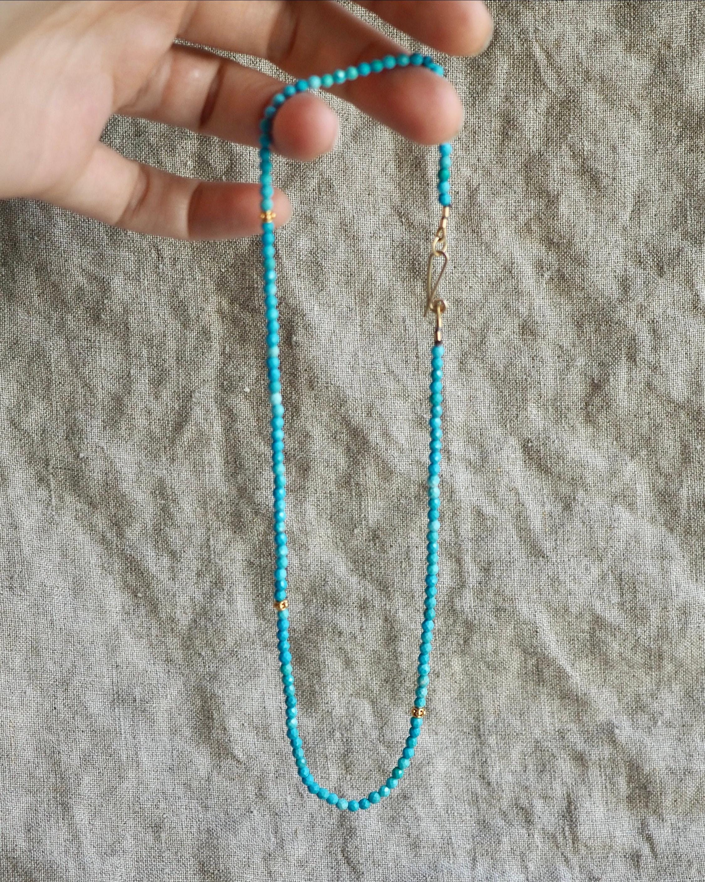 These cute turquoise beads have lovely blue tone with very minimal matrix. They come from the Kingman mine in Arizona. The 3mm beads are round, have tiny facets, and are paired with three bright 3.7 mm 24k gold vermeil (24k gold over sterling silver) decorative beads, and handmade gold filled hook clasp. These beads look great worn on their own, or layered with your other favorite necklaces. It is 16” long.