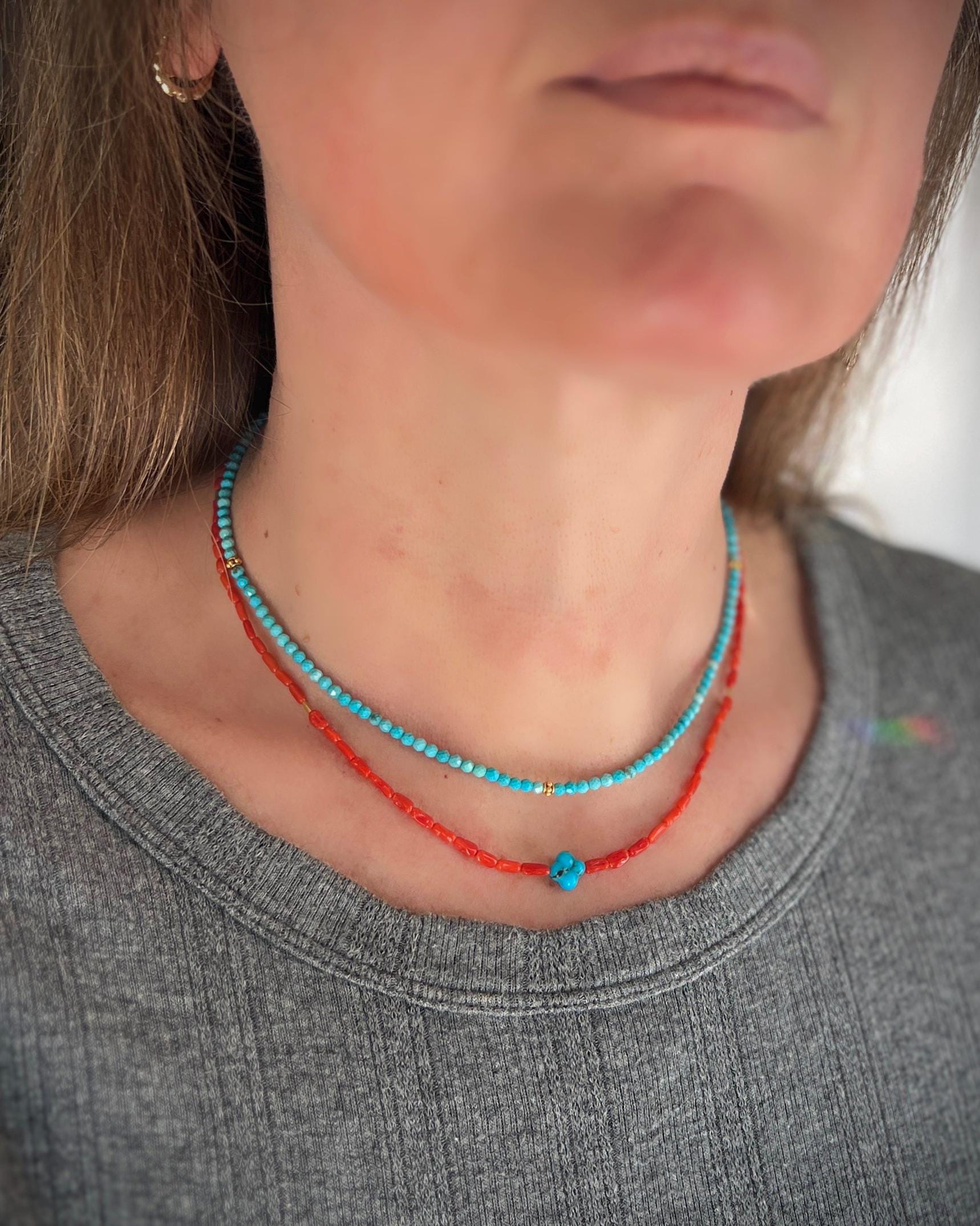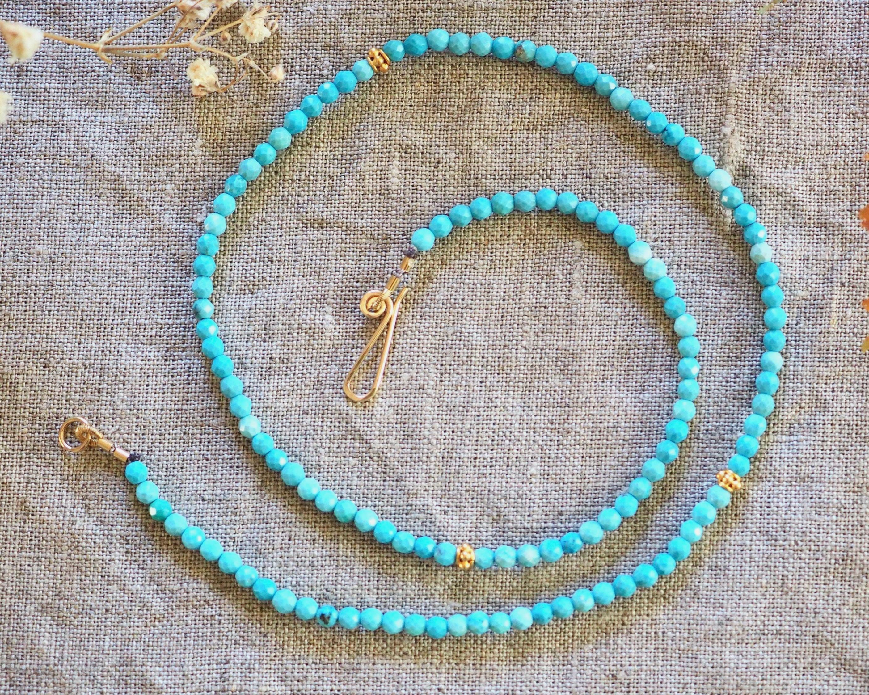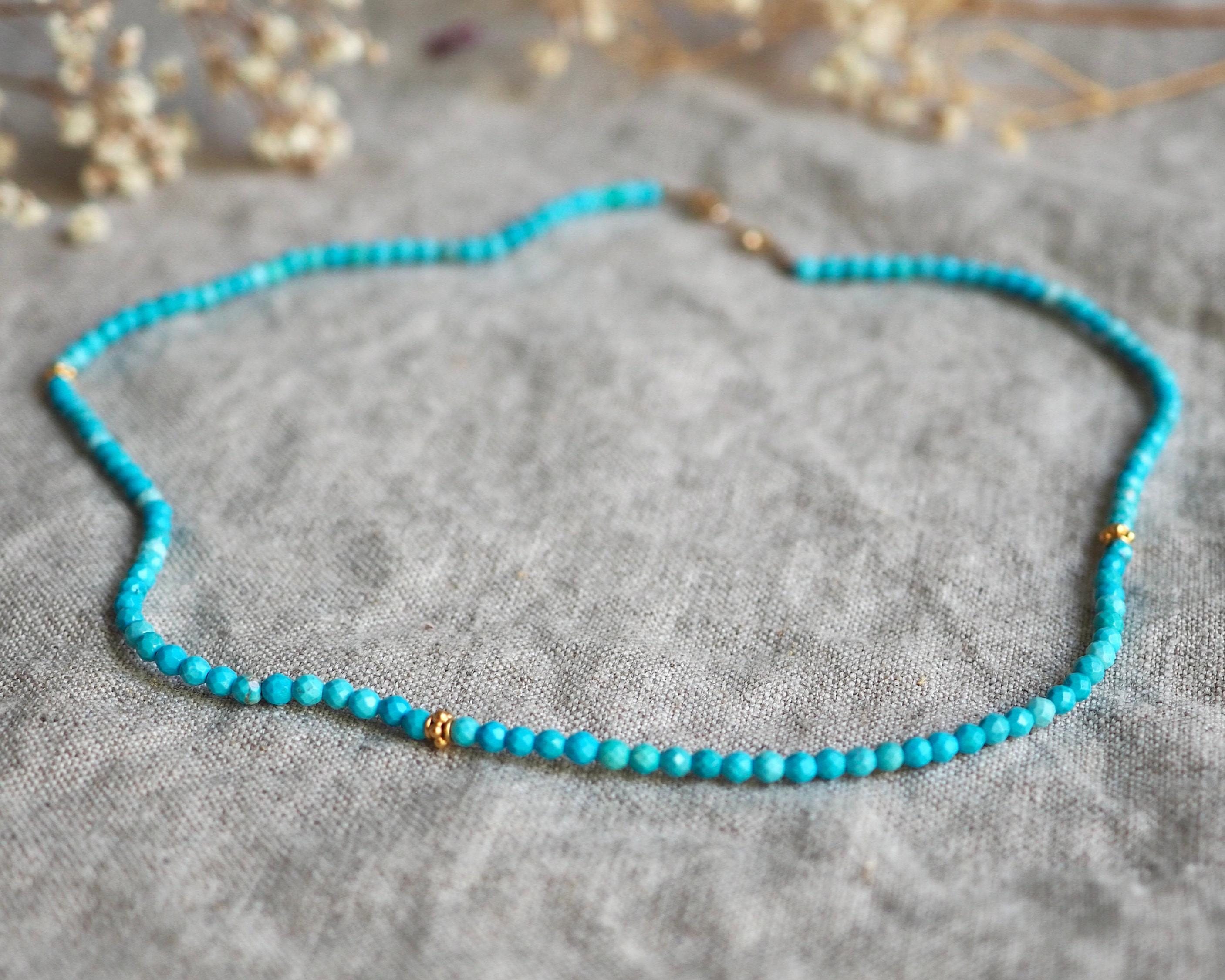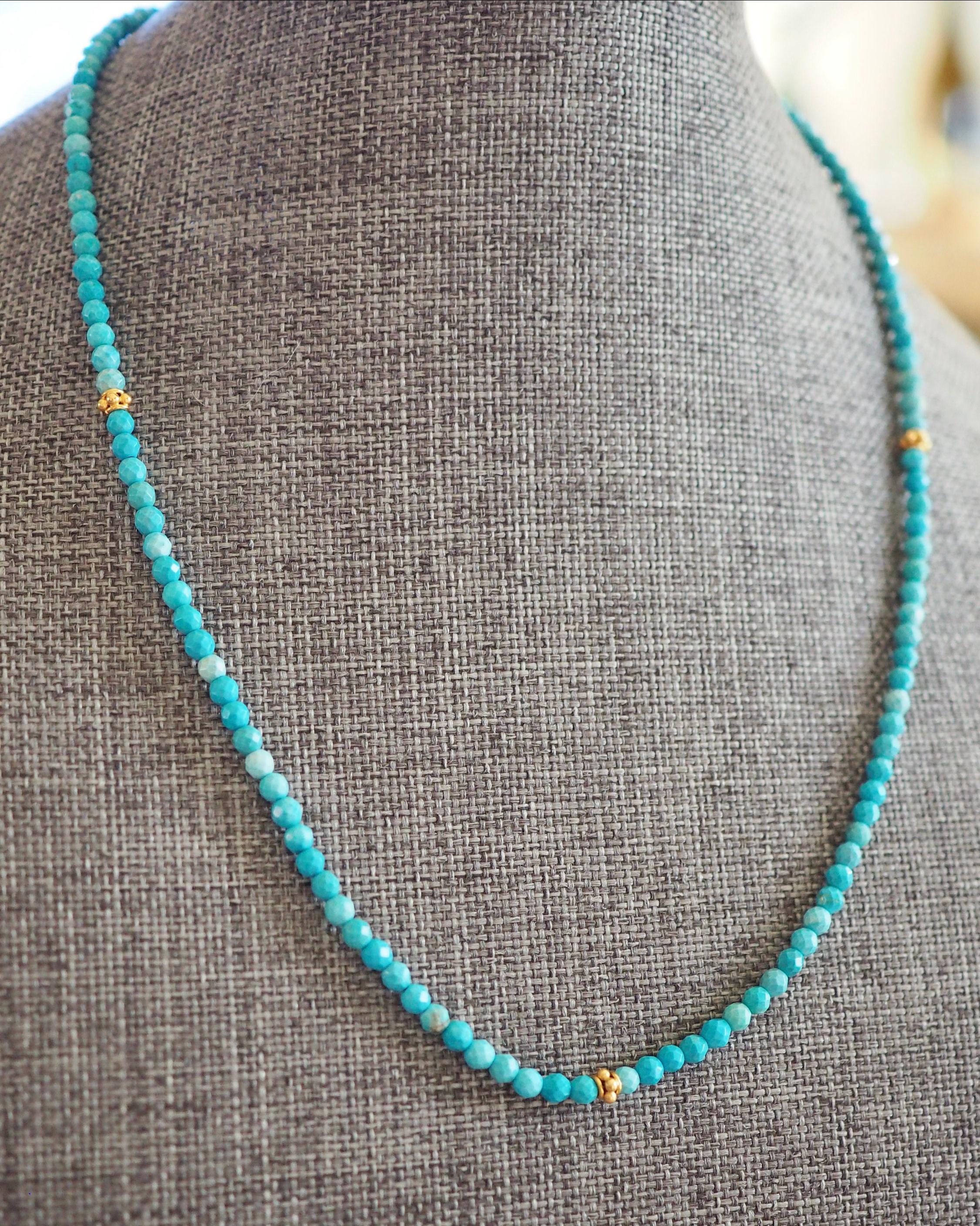 These cute turquoise beads have lovely blue tone with very minimal matrix. They come from the Kingman mine in Arizona. The 3mm beads are round, have tiny facets, and are paired with three bright 3.7 mm 24k gold vermeil (24k gold over sterling silver) decorative beads, and handmade gold filled hook clasp. These beads look great worn on their own, or layered with your other favorite necklaces. It is 16” long.