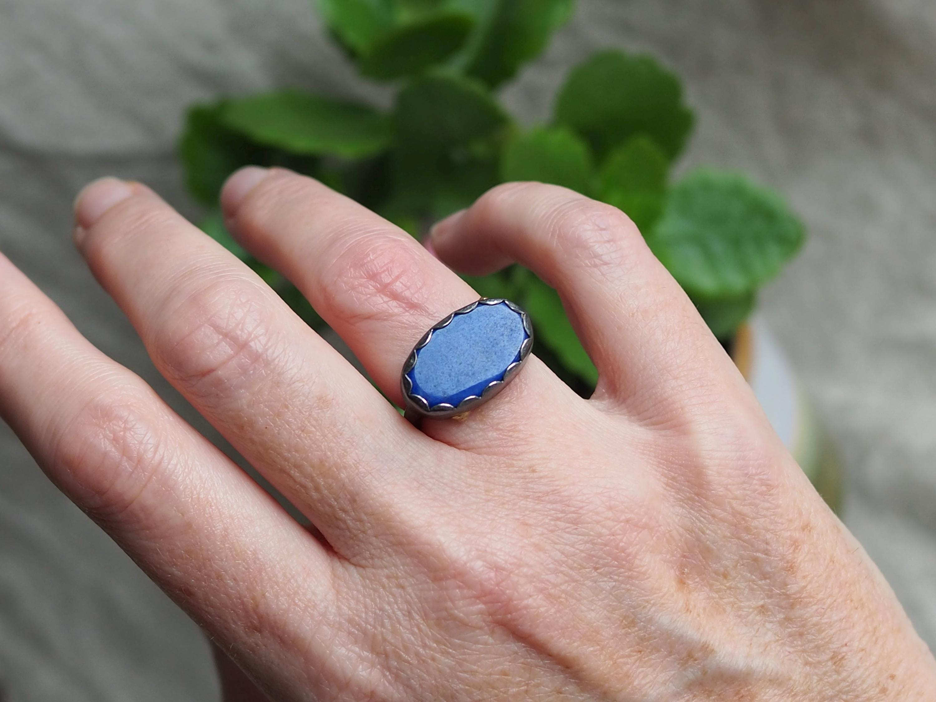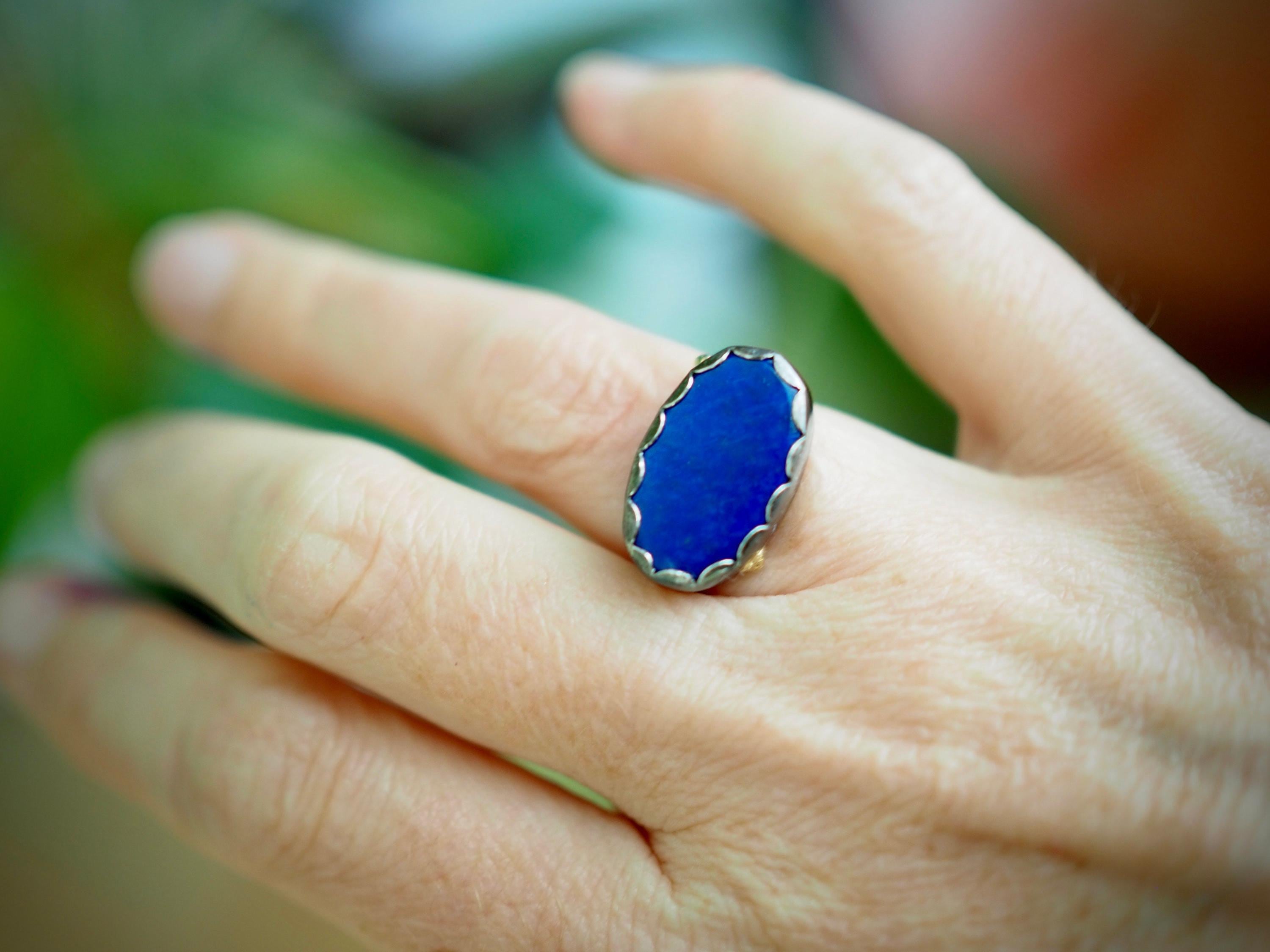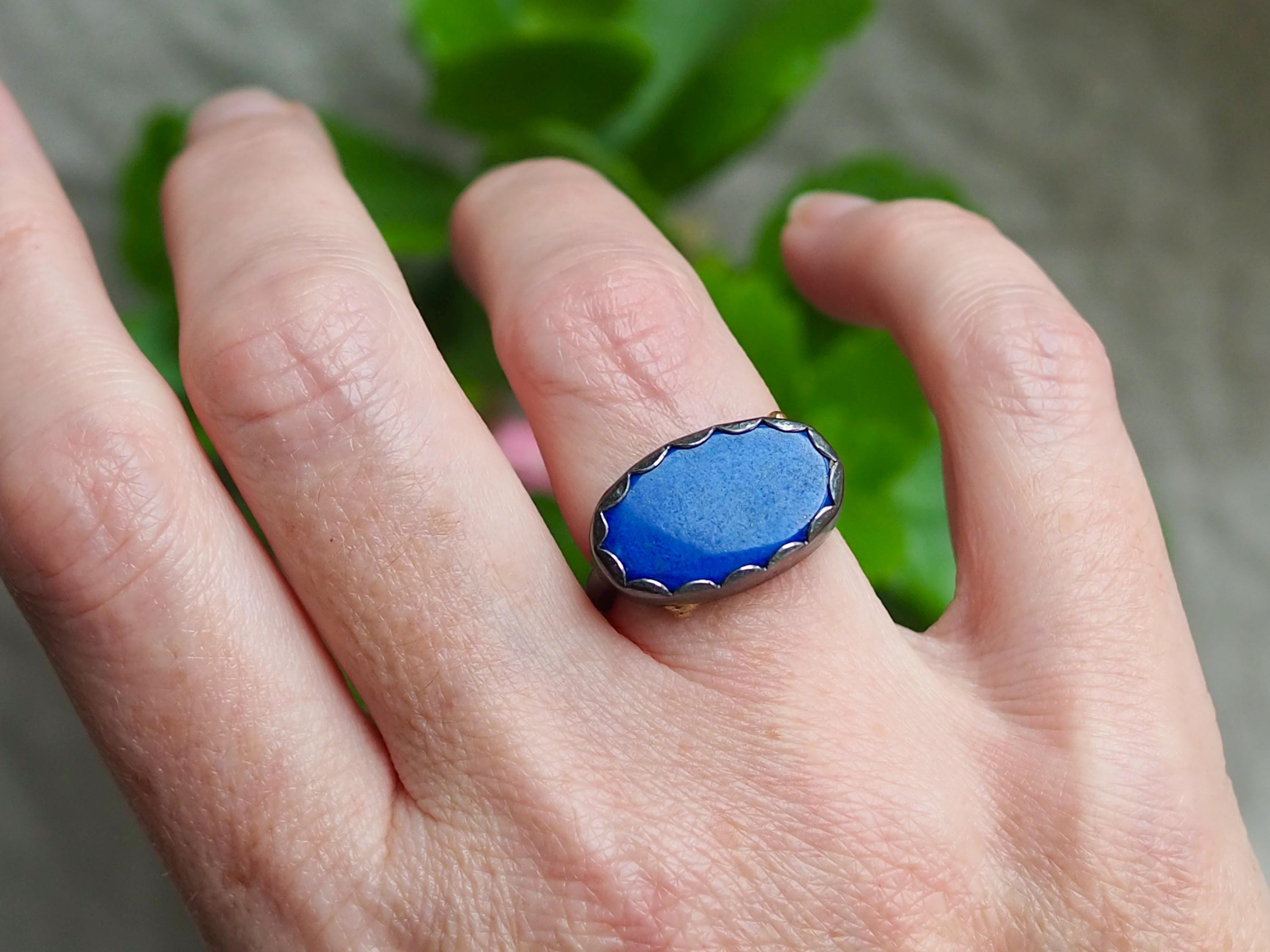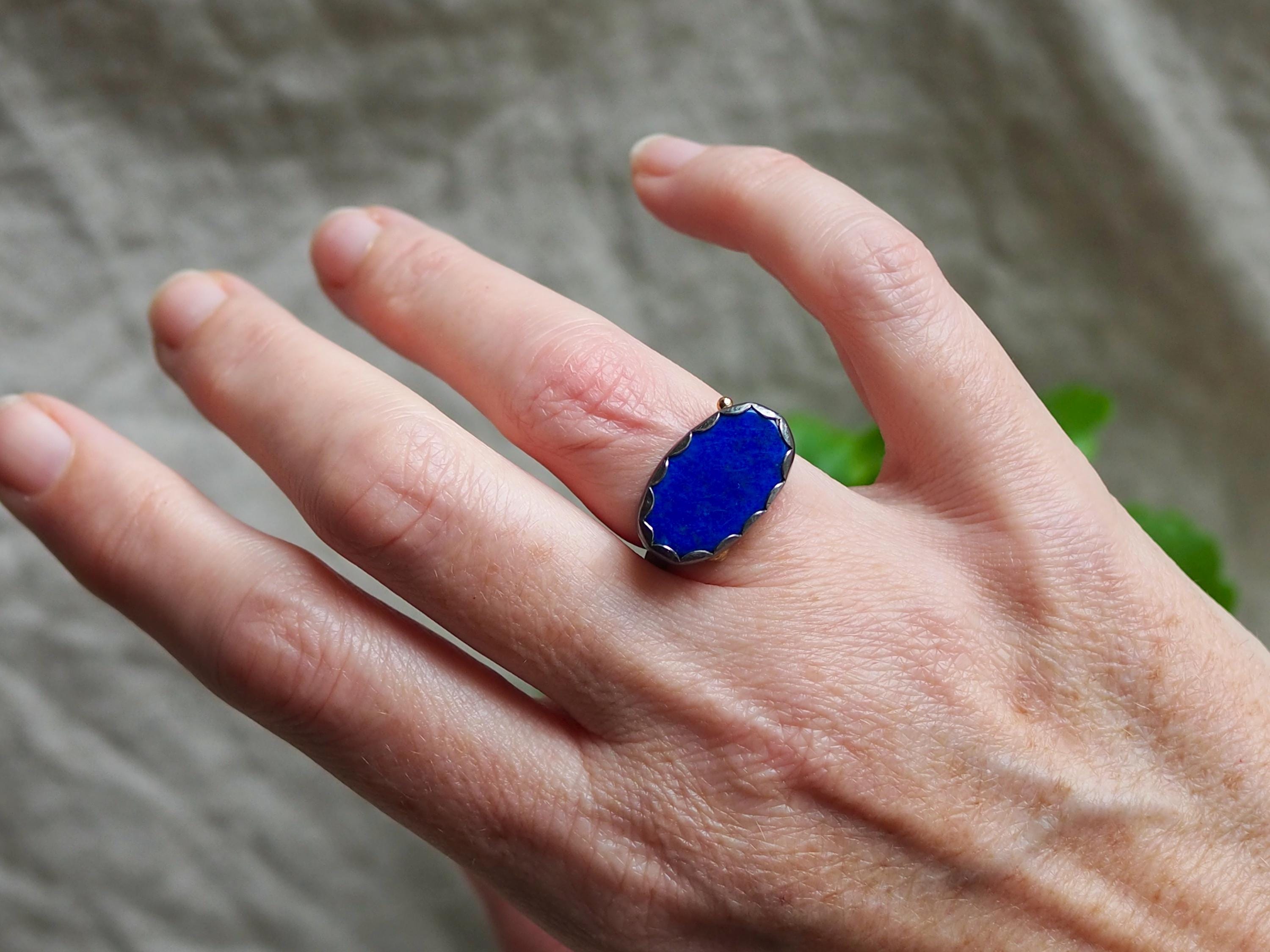 Beautiful, saturated royal blue lapis lazuli cabochon is set in a fine silver scalloped bezel adorned with two 14k gold dots, and has a textured sterling silver backplate with a cut out window . The flat top lapis lazuli stone has uniform color and measures 12mm by 20mm.