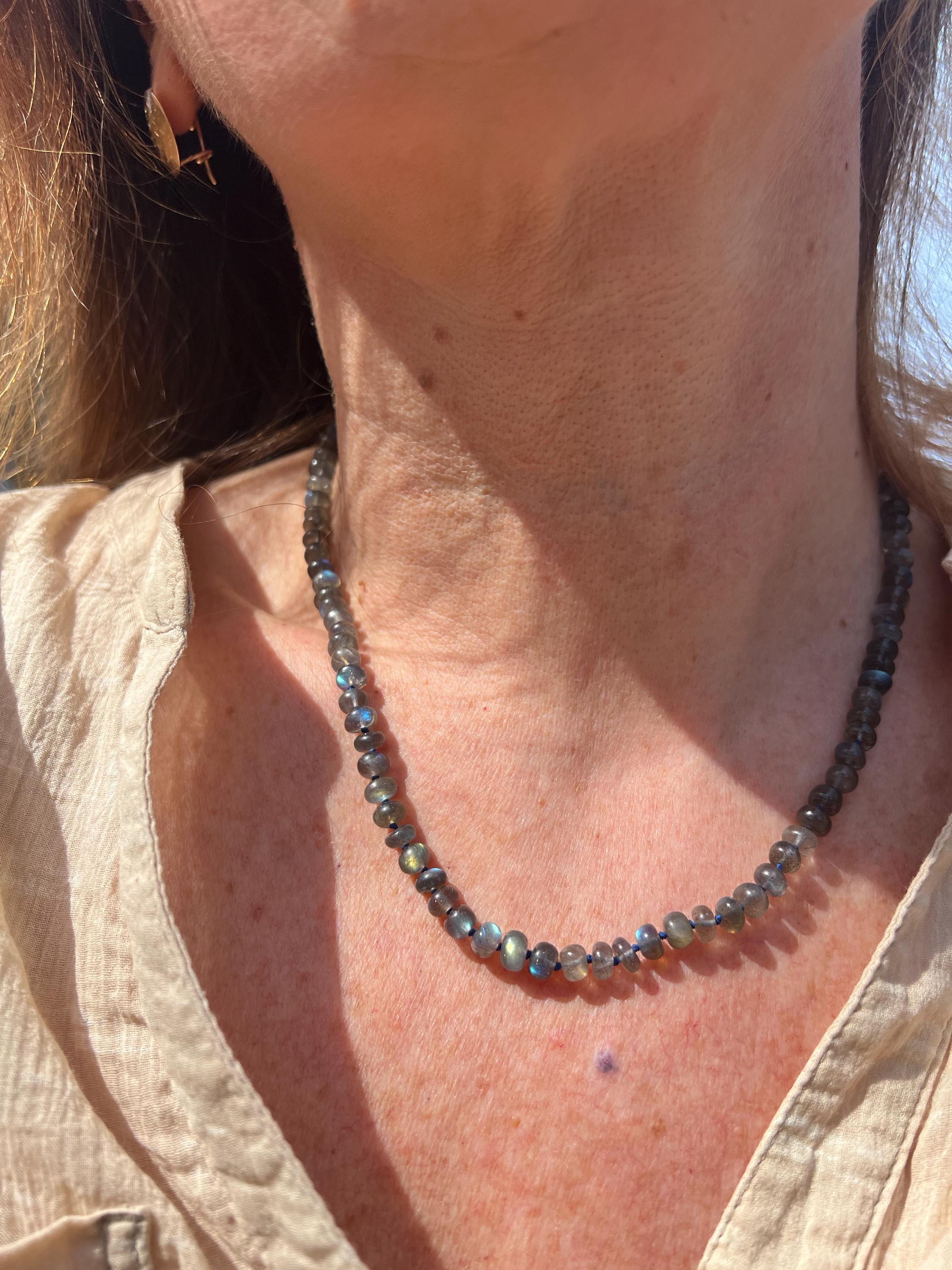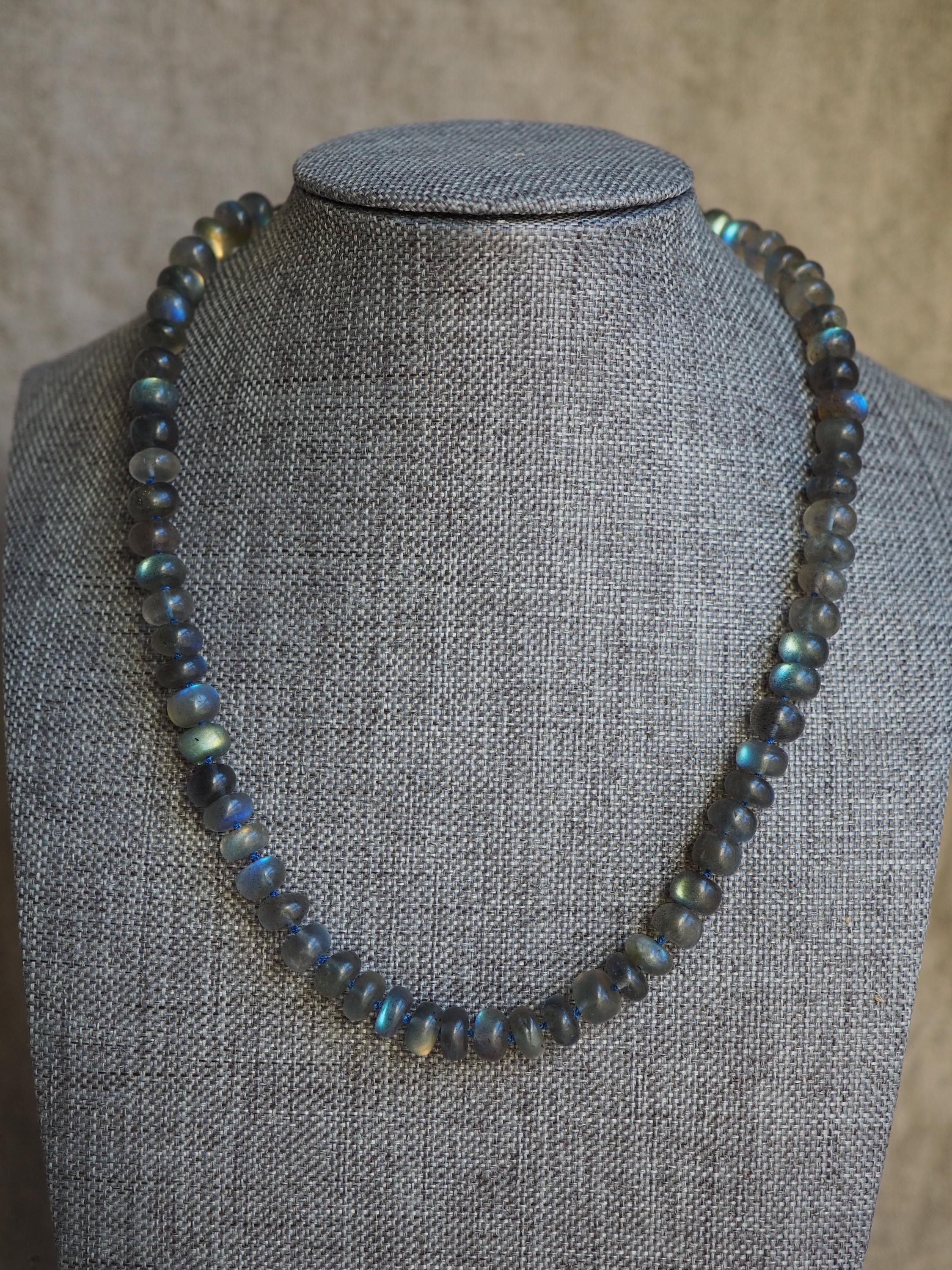 This beautiful necklace shimmers with the slightest move. The labradorite beads flash with tones ranging from aqua to medium blue, to gold. The beads are hand cut rondelles measuring 6-6.5mm in diameter, with varying widths, which gives them a nice organic feel. They are hand knotted candy style on navy blue silk cord, the length is 17.75", plus a 2” extender chain with a small labradorite bead dangle and a handmade gold filled hook clasp.