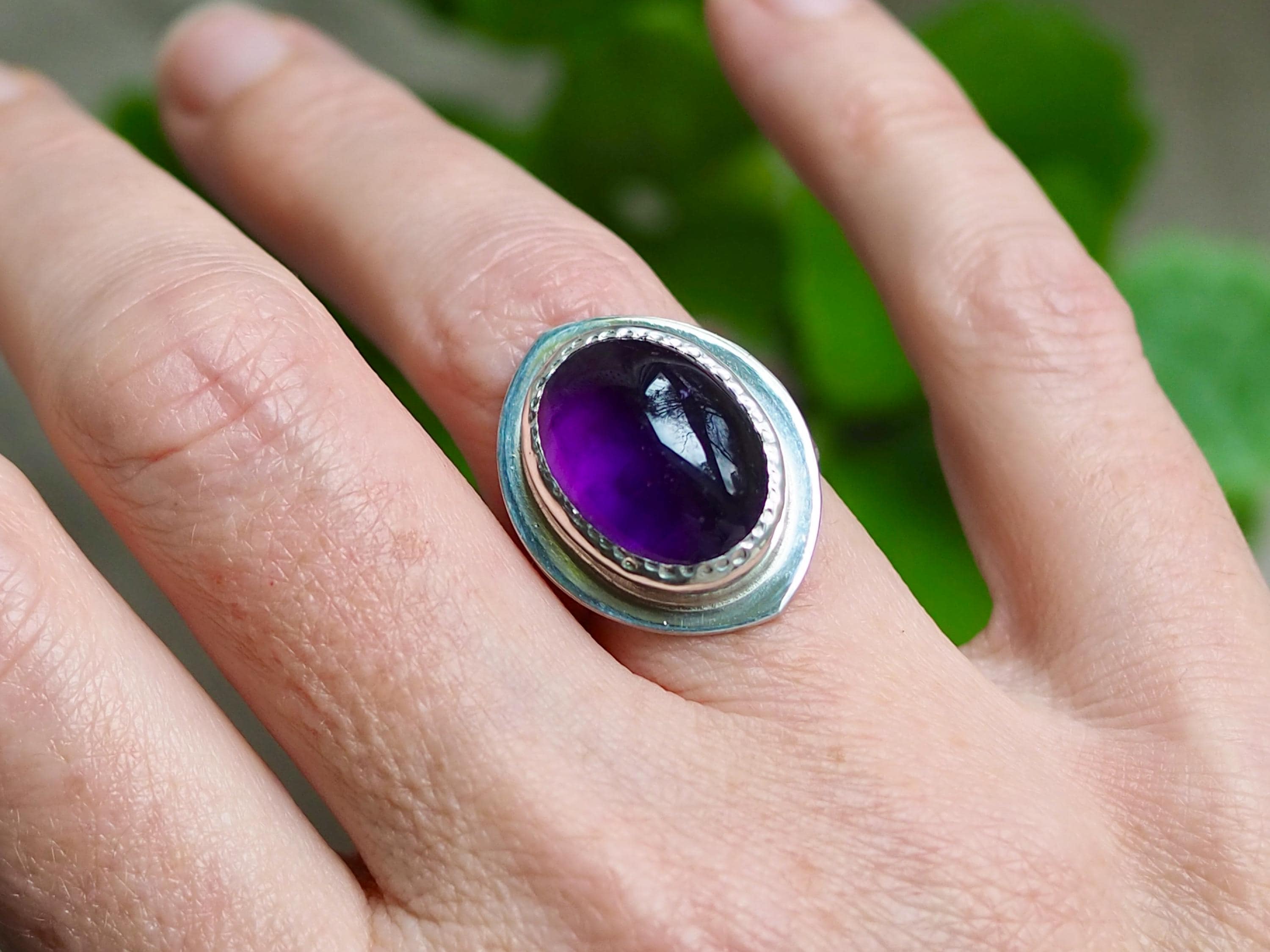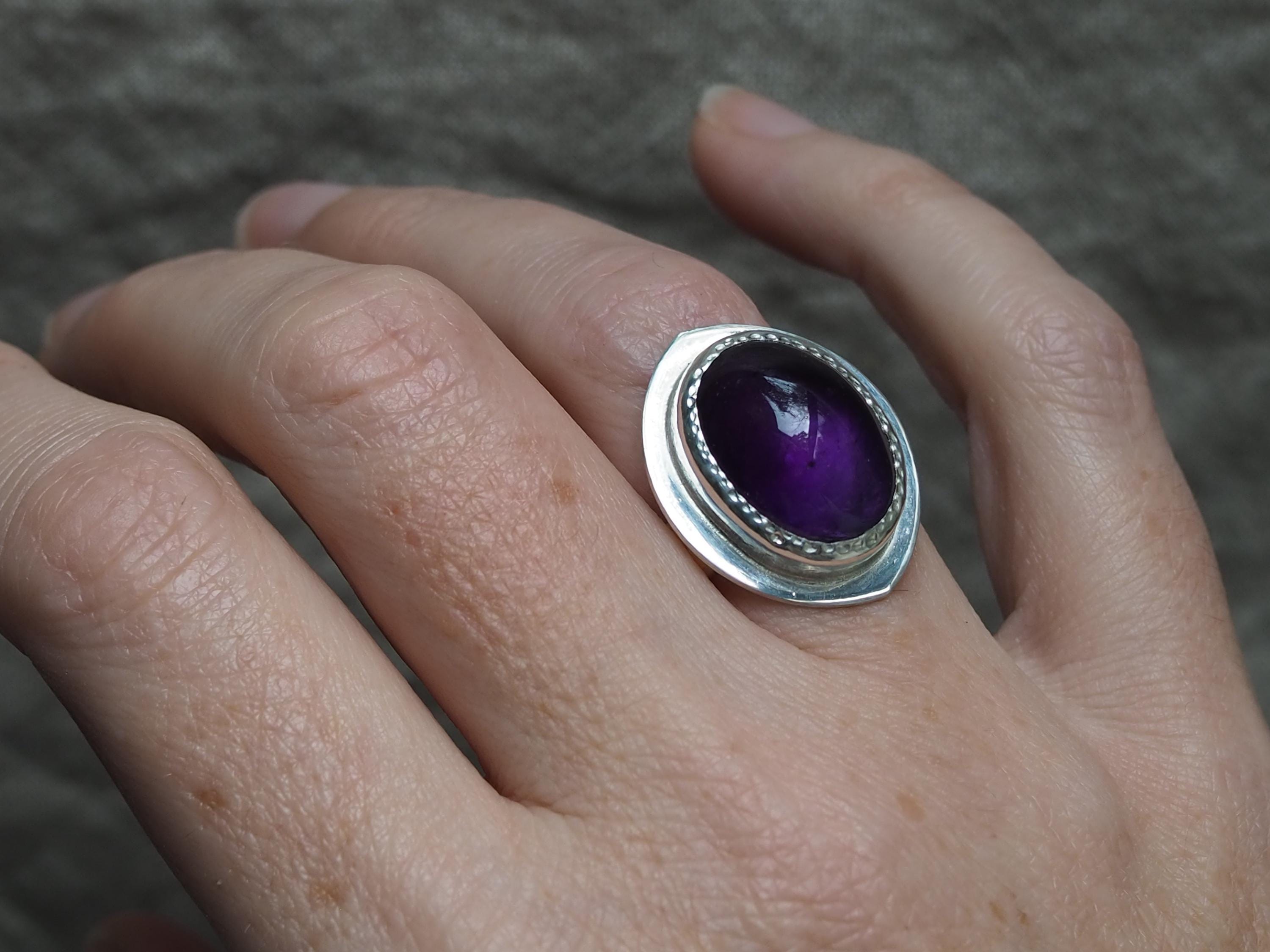 Stunning purple amethyst is set in dotted hand stamped fine silver bezel with marquise shaped sterling silver backplate. The stone has a beautiful, saturated color, and glows when sunlight hits it. The stone measures 14x18mm. The band is hammered and has lovely faceted texture. This unique ring is size 7.5.