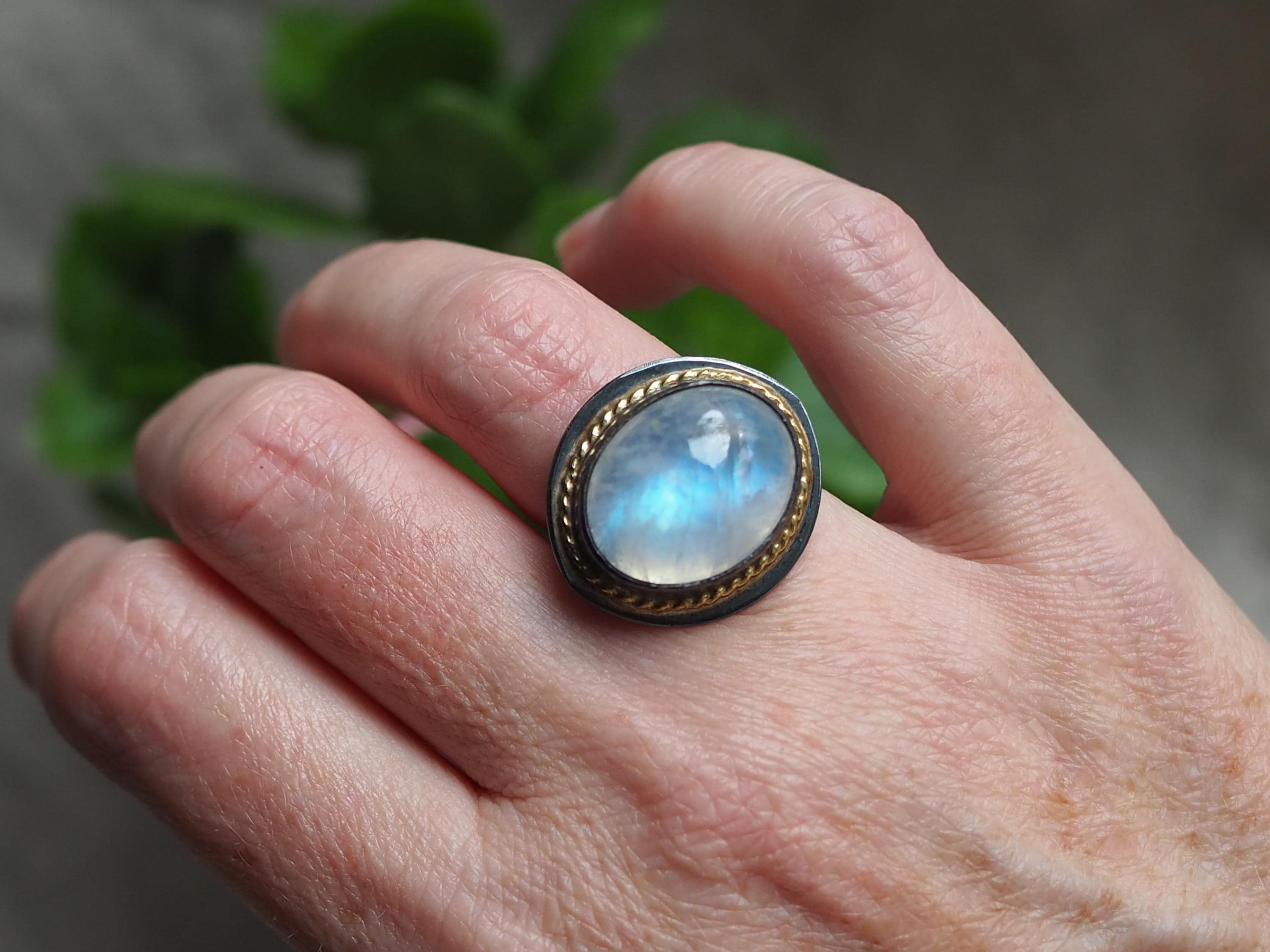 What a gorgeous stone this is! The moonstone is set in a fine silver bezel adorned by a 14k gold twisted frame . This gem has very pretty blue flash. The stone measures 16x20mm and sits on a wide hand stamped shank. The ring is darkened to a deep, luscious tone. This unique ring is size 8.