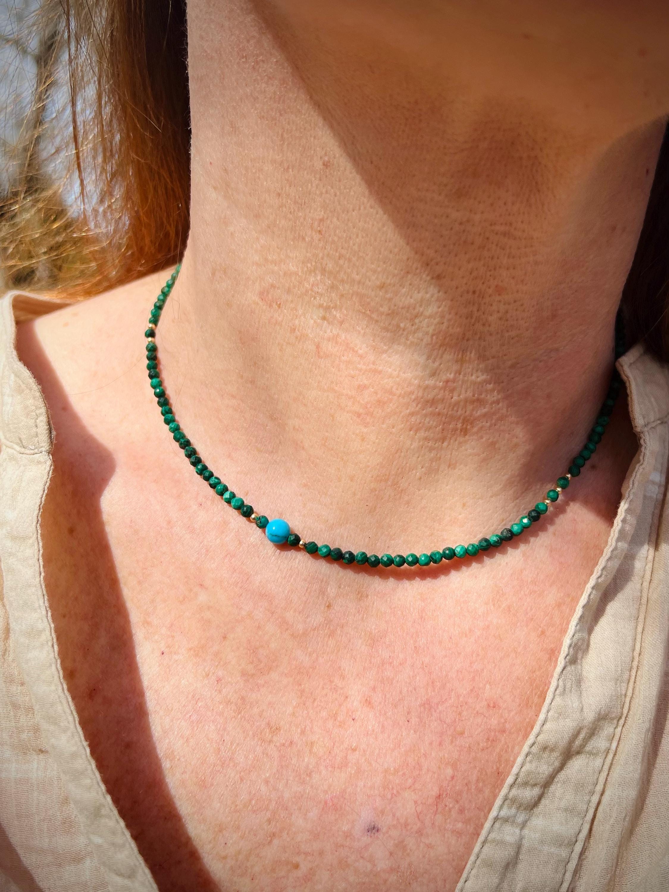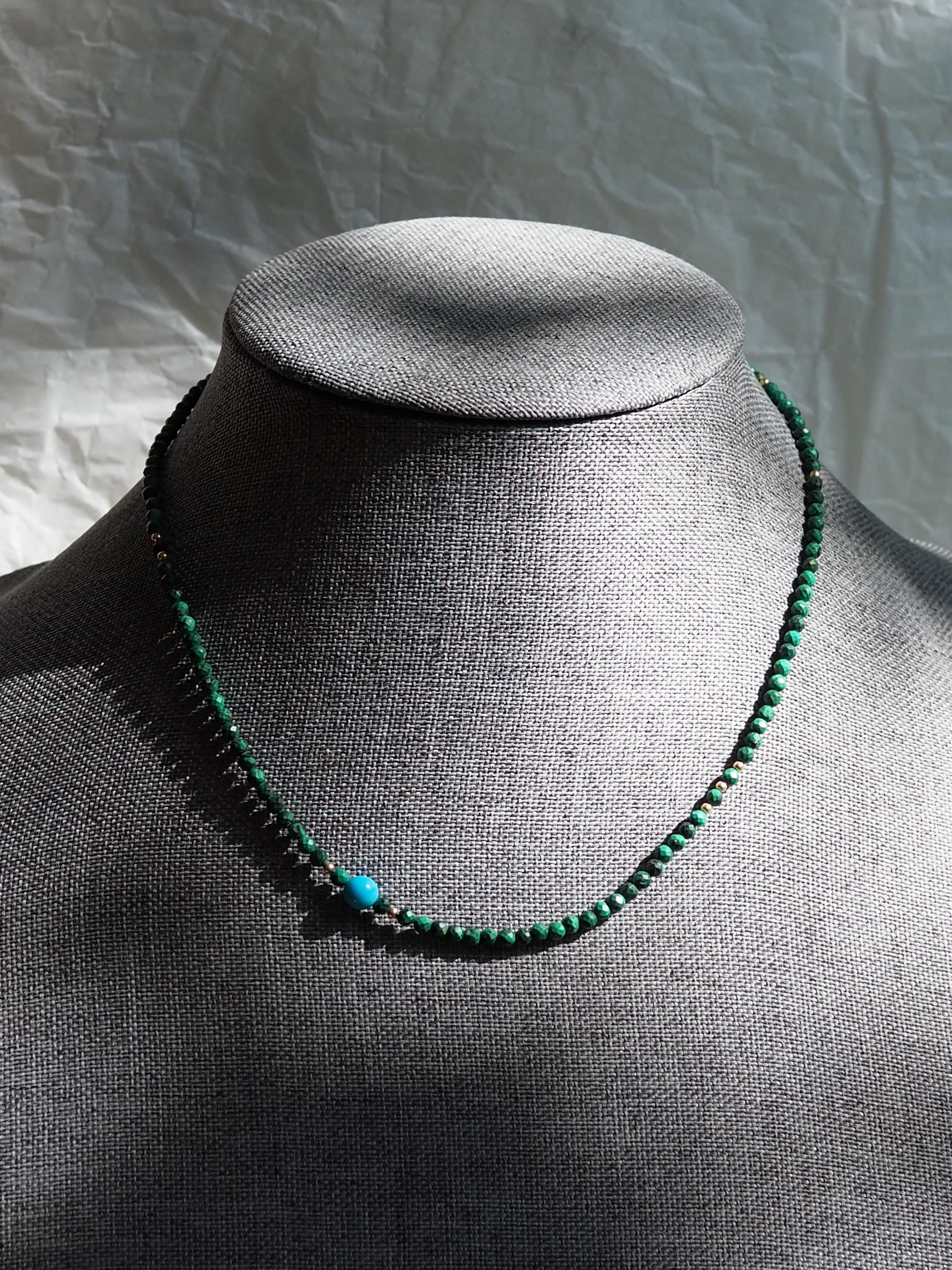 Faceted forest green malachite beads are paired with petite 14k gold beads and a bright blue Sleeping Beauty turquoise bead placed asymmetrically. This necklace is 16 inches long, including the 14k gold spring clasp.
