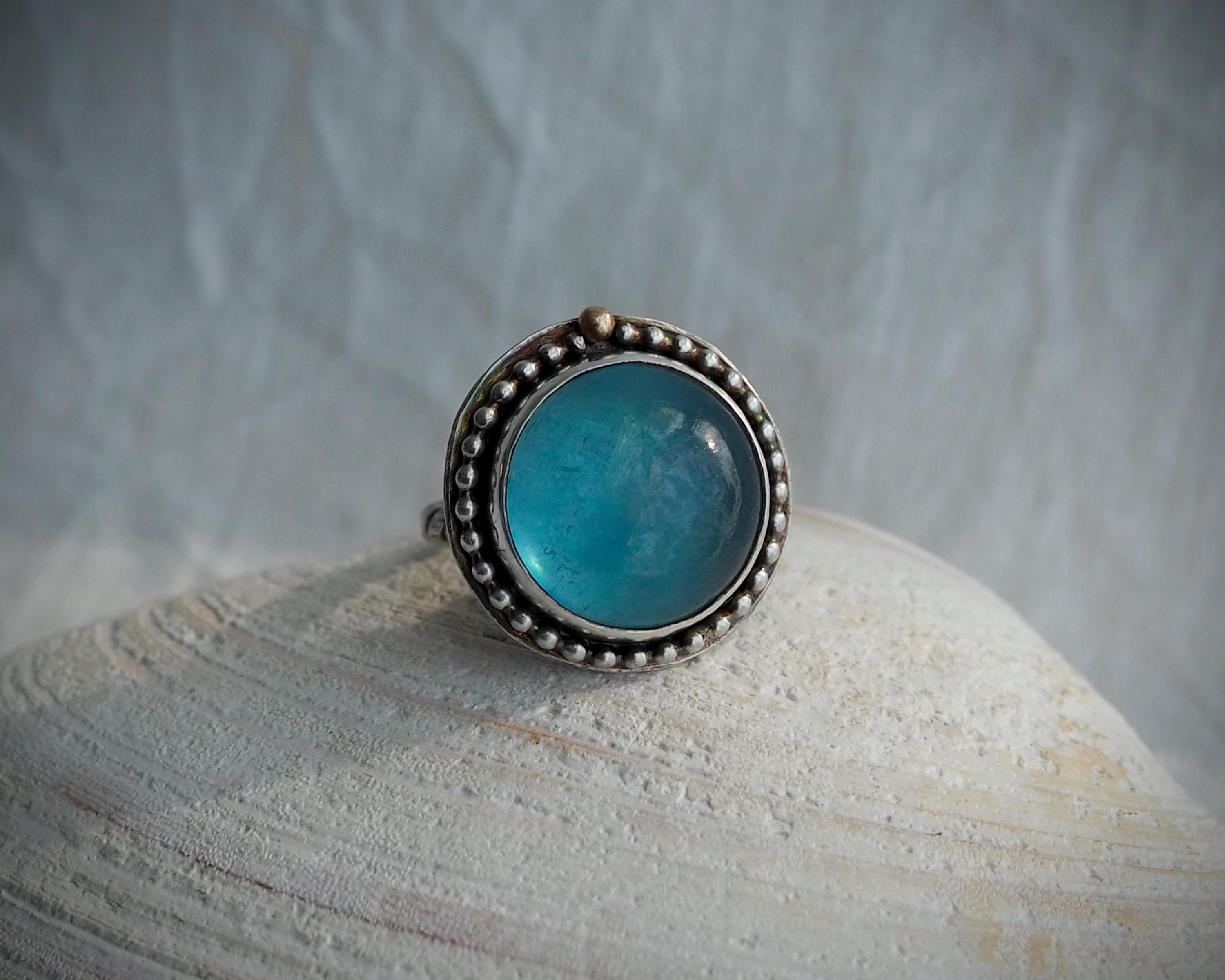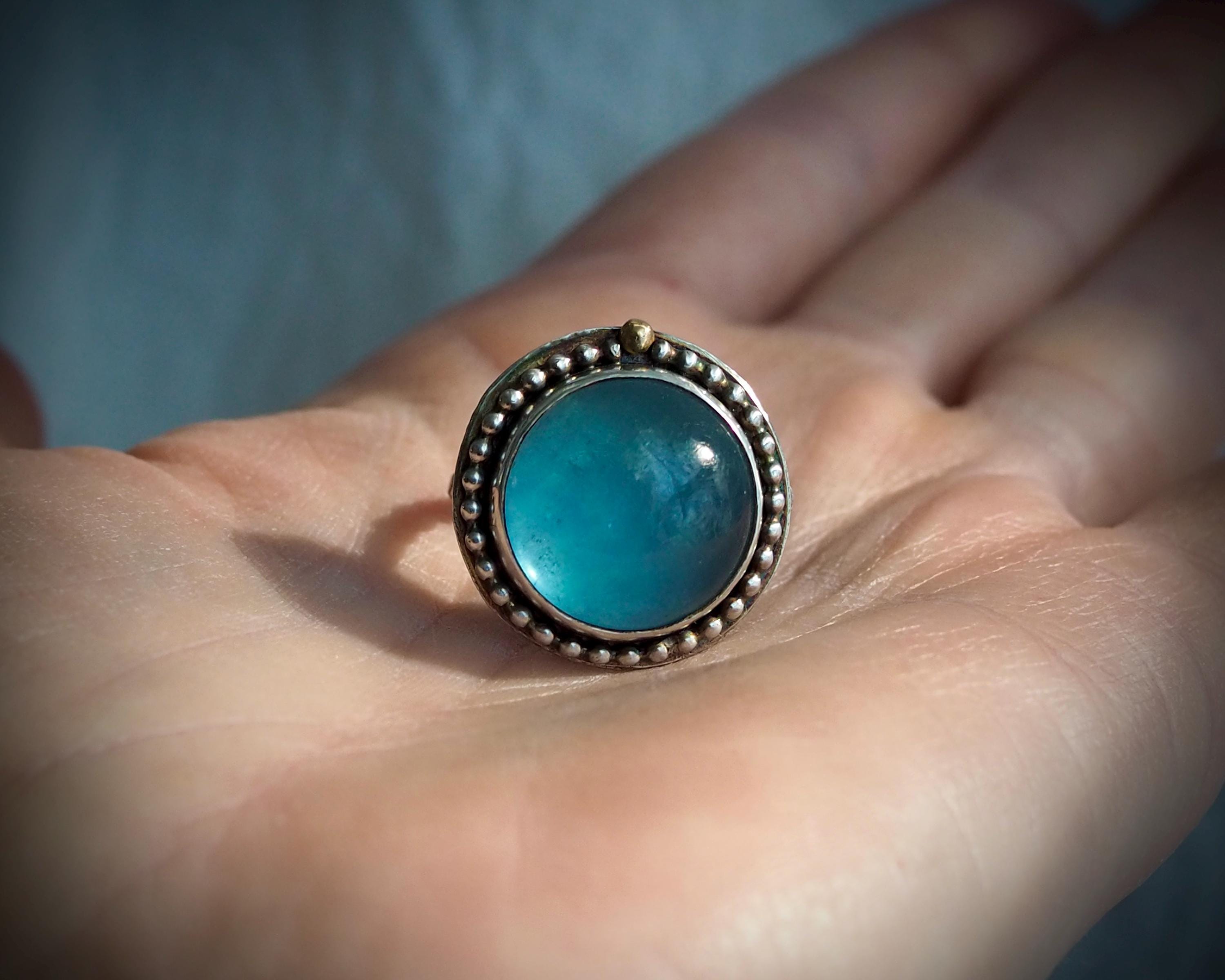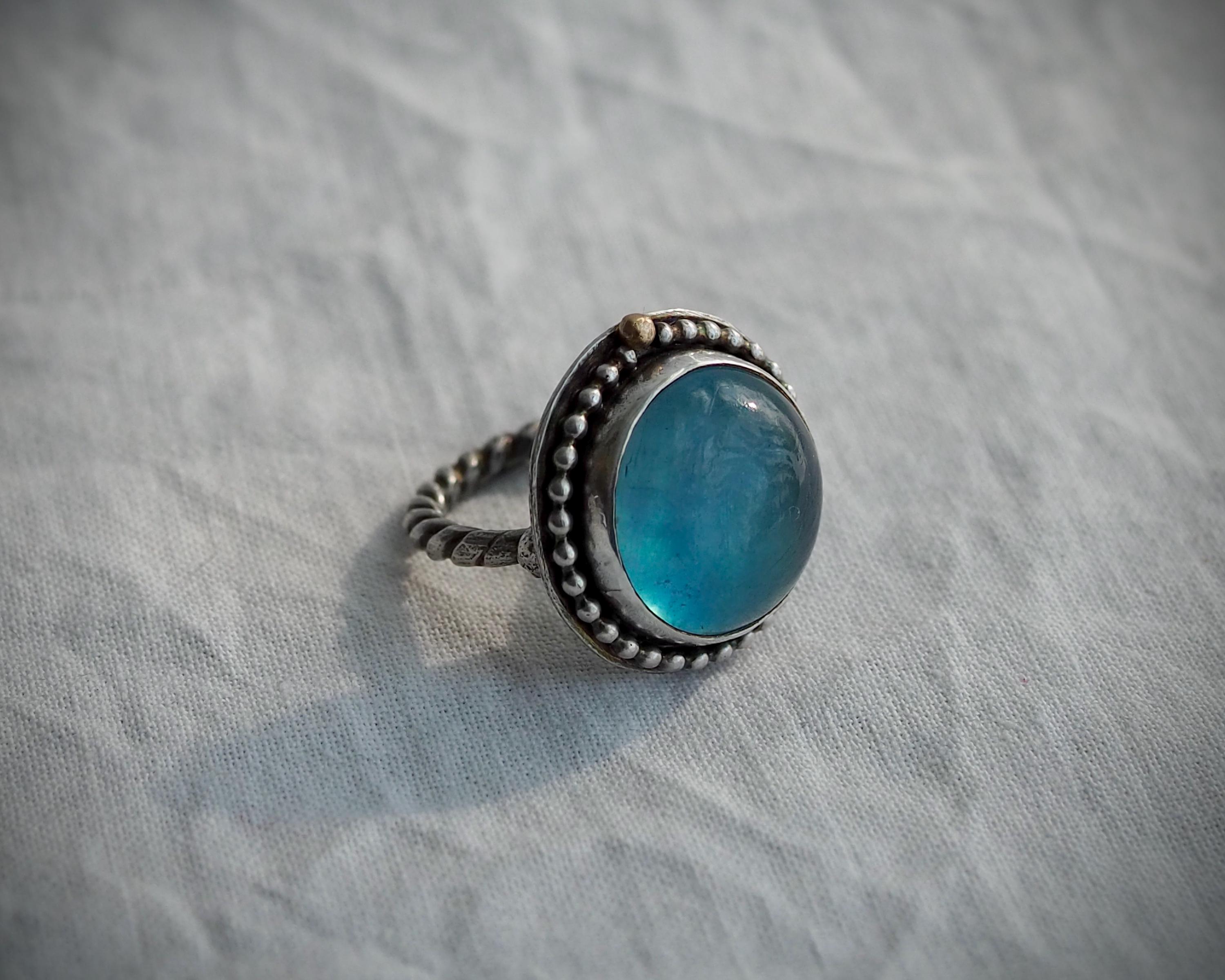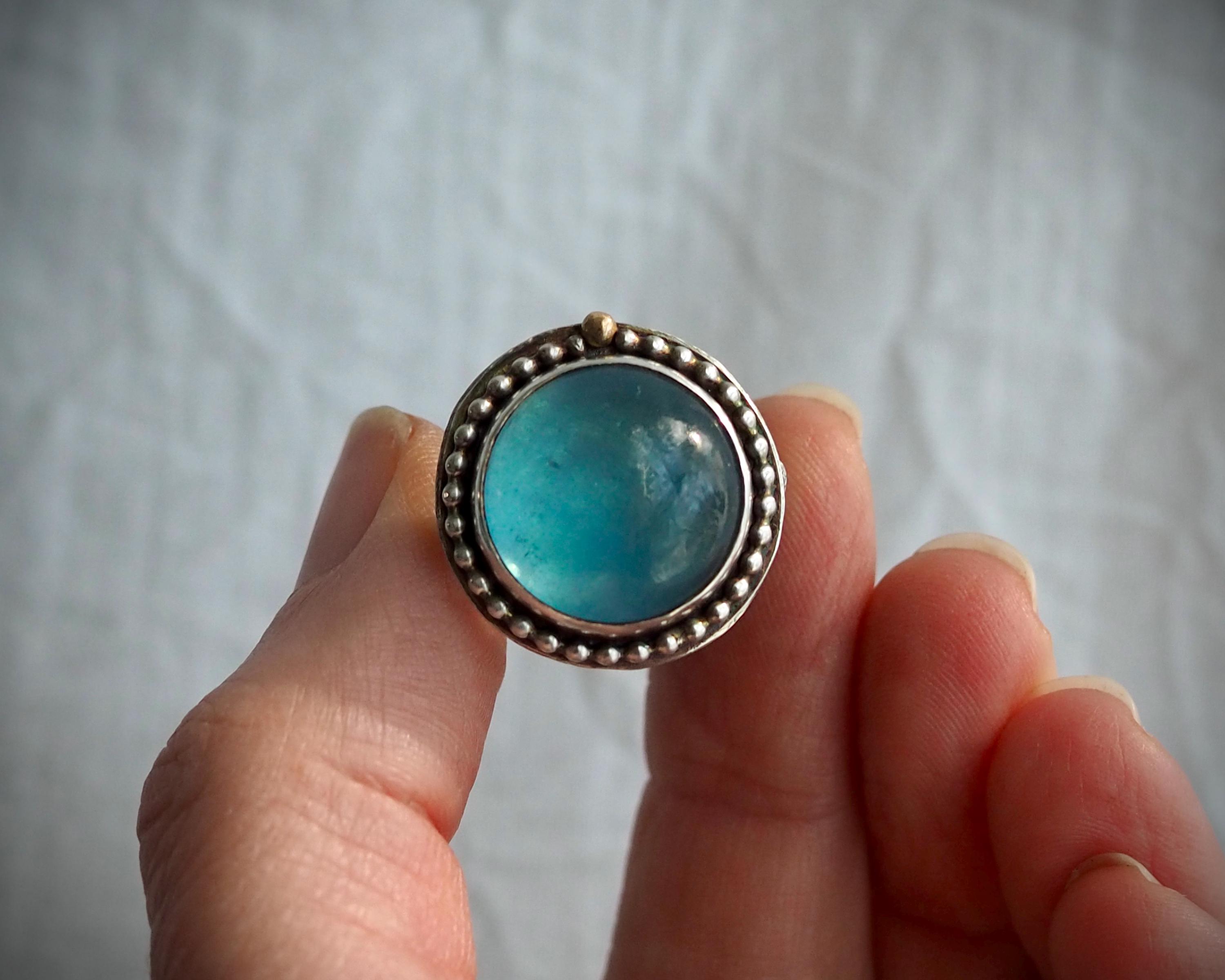 This beautiful stone seems to glow from within. It is such a pretty, vibrant blue color with the subtlest lavender undertone . This glowing gem is set in a fine silver bezel accented by a sterling silver border with an 18k gold granulation. The handmade setting is paired with a U shaped twisted shank and darkened with patina, inspired by ancient jewelry. This natural aquamarine, mined in Afghanistan measures 17.5mm in diameter, the ring is approximately 22mm across, size 7/7.5.