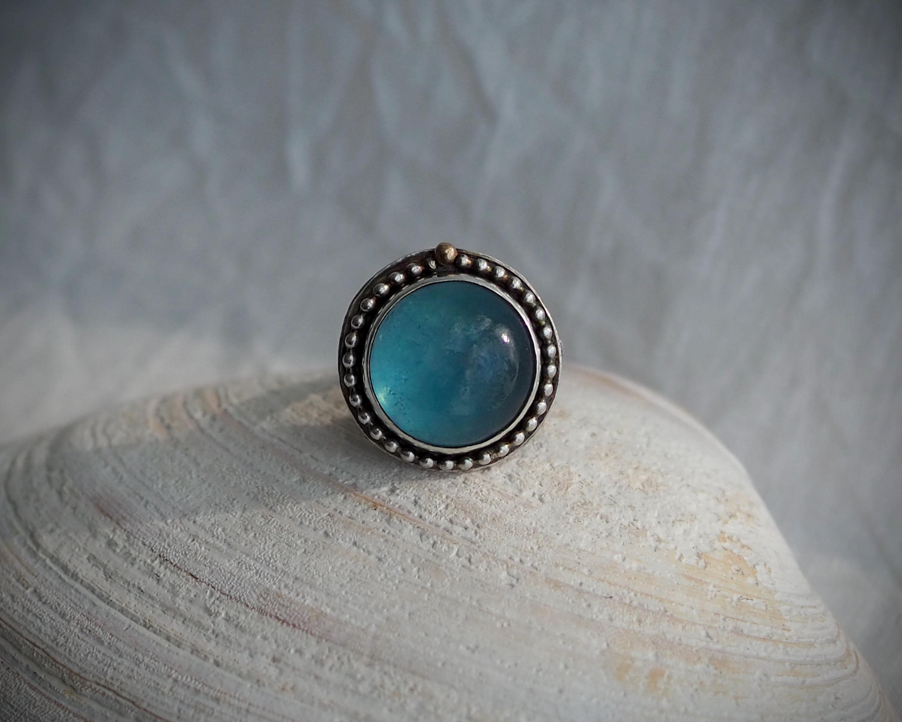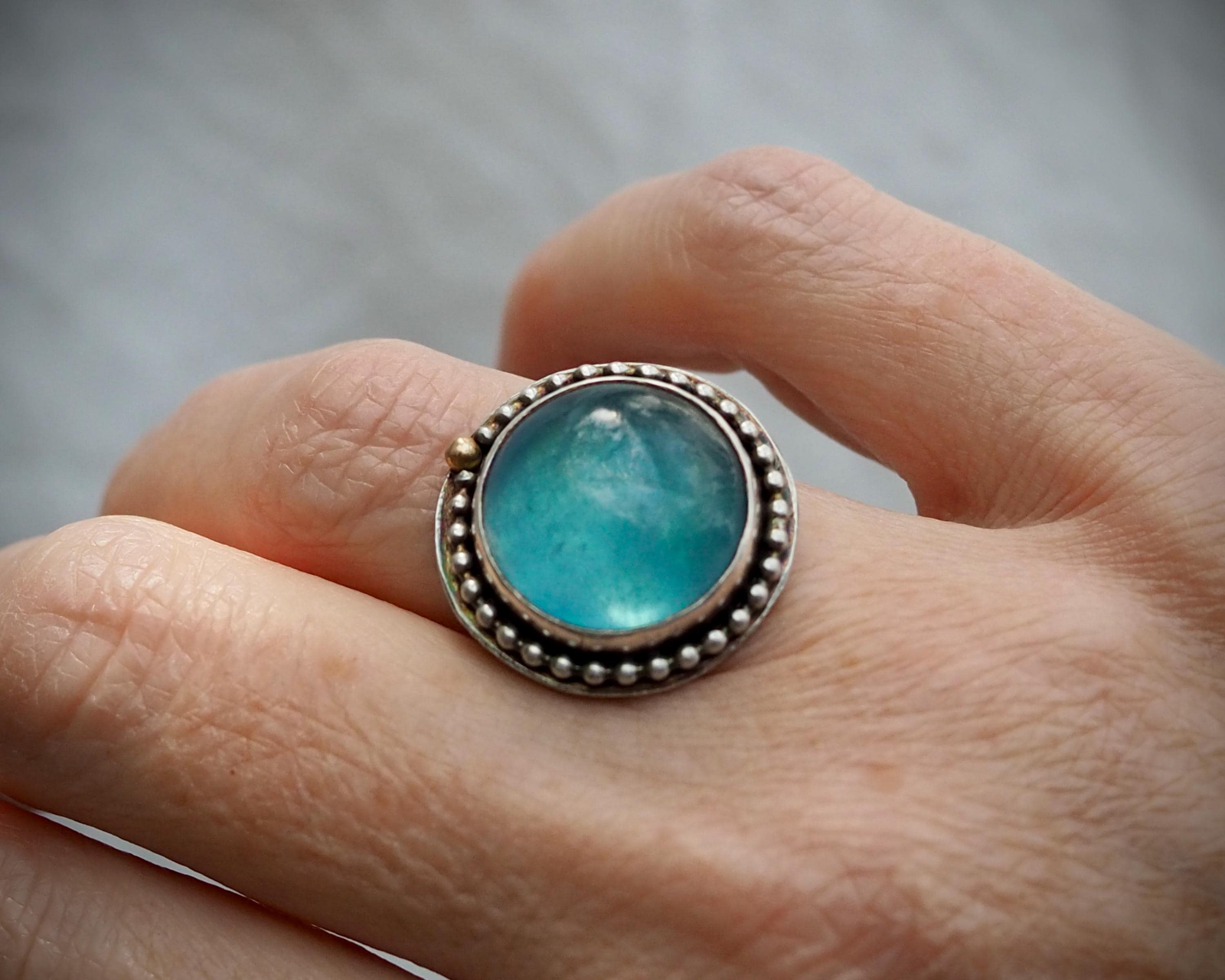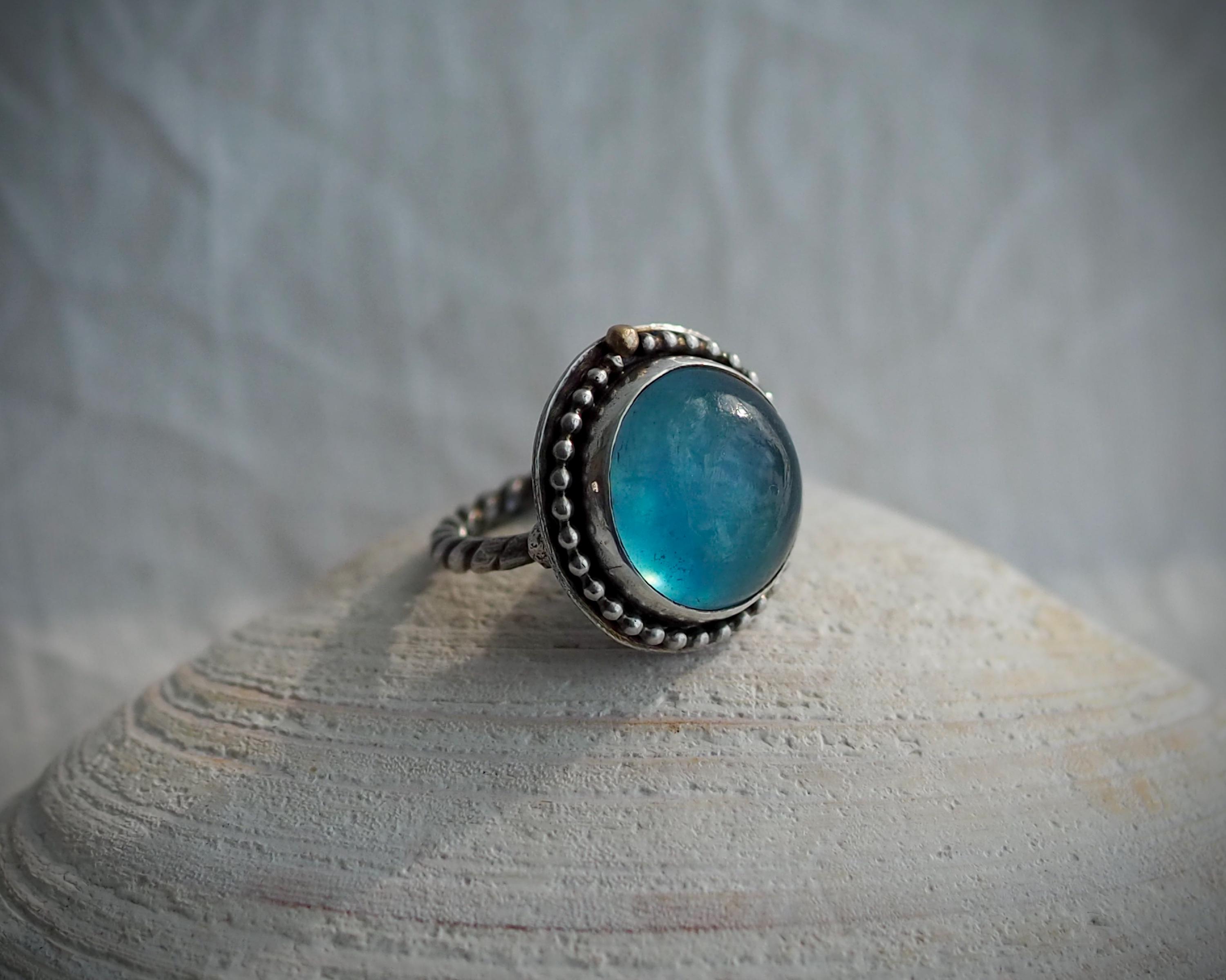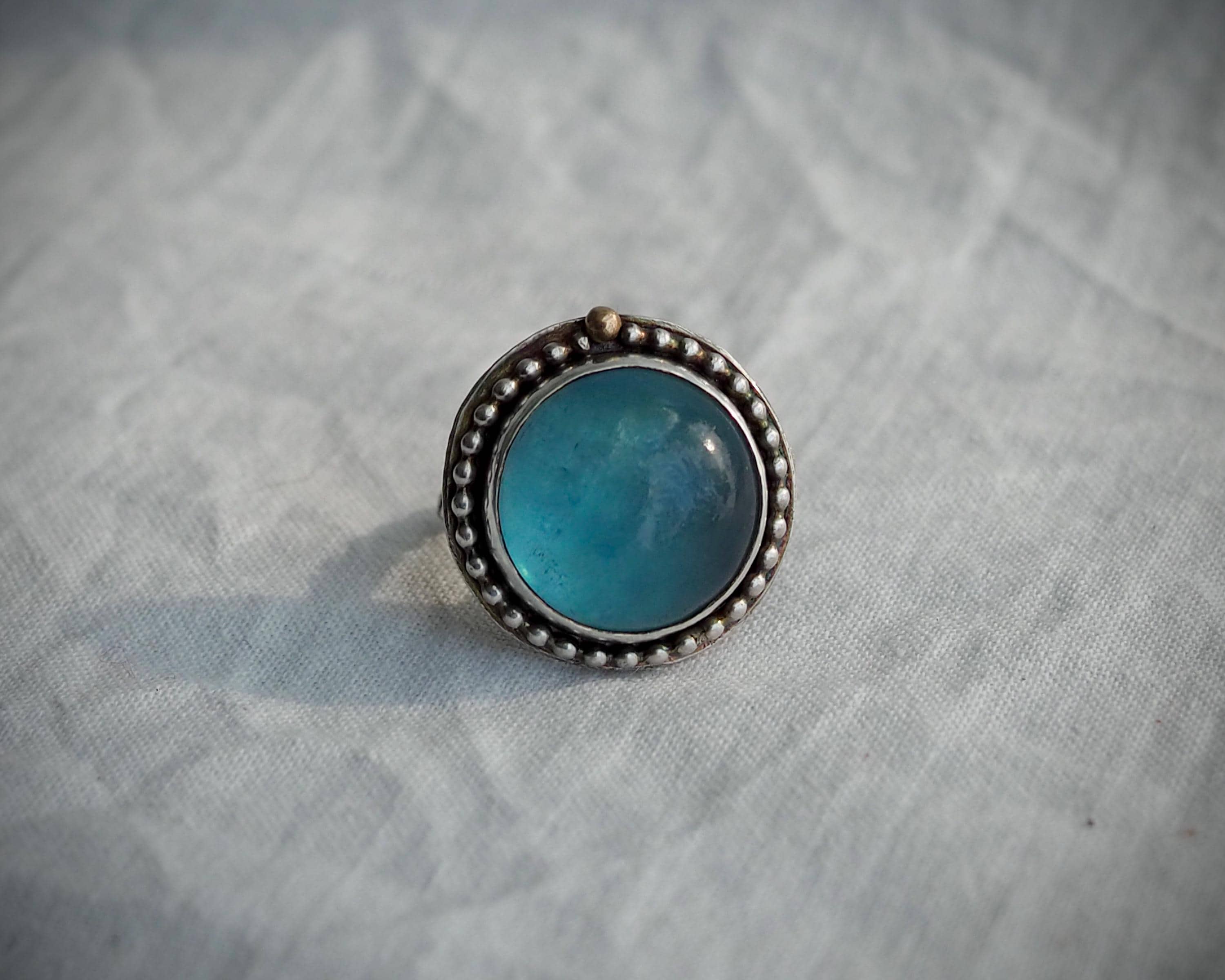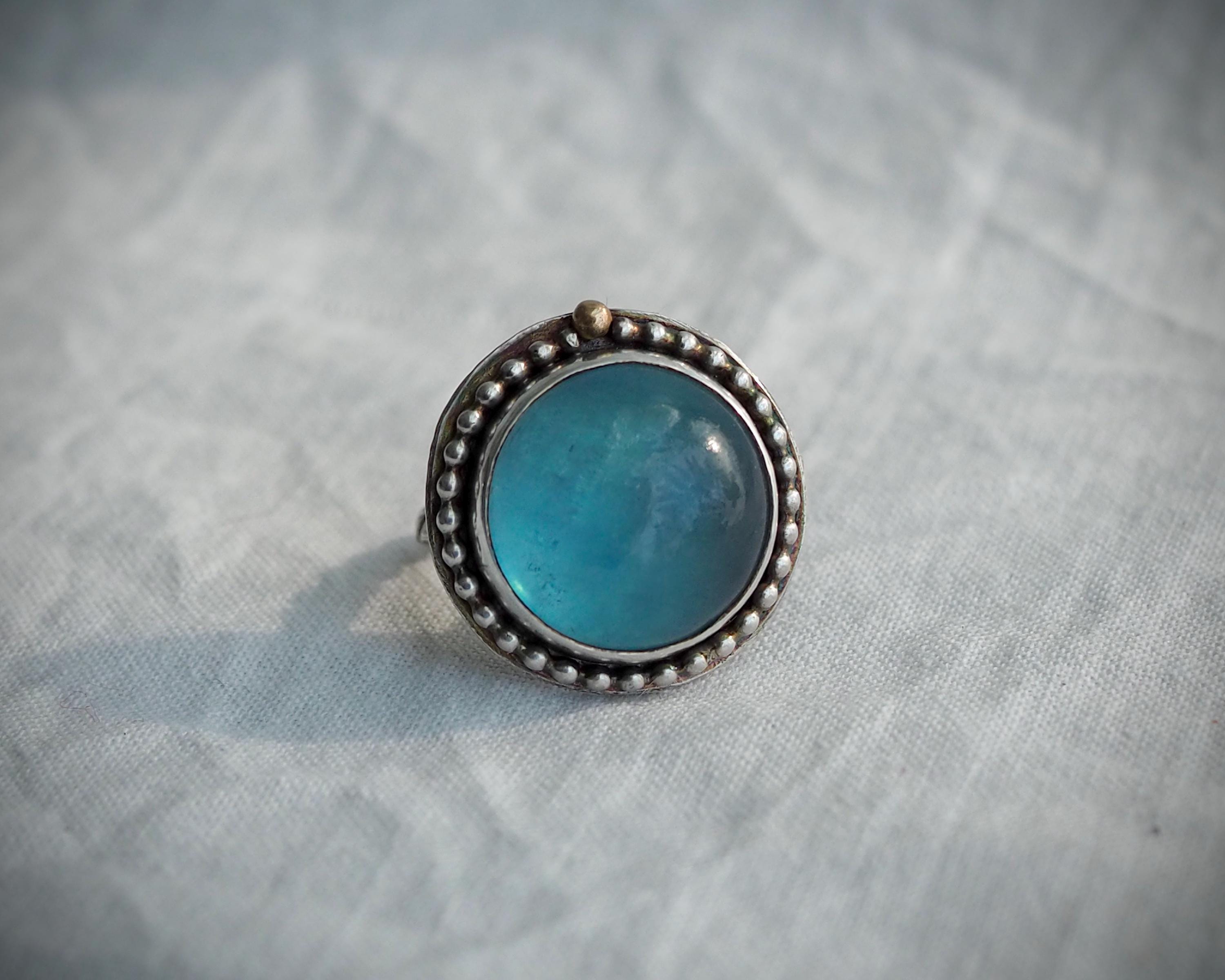 This beautiful stone seems to glow from within. It is such a pretty, vibrant blue color with the subtlest lavender undertone . This glowing gem is set in a fine silver bezel accented by a sterling silver border with an 18k gold granulation. The handmade setting is paired with a U shaped twisted shank and darkened with patina, inspired by ancient jewelry. This natural aquamarine, mined in Afghanistan measures 17.5mm in diameter, the ring is approximately 22mm across, size 7/7.5.