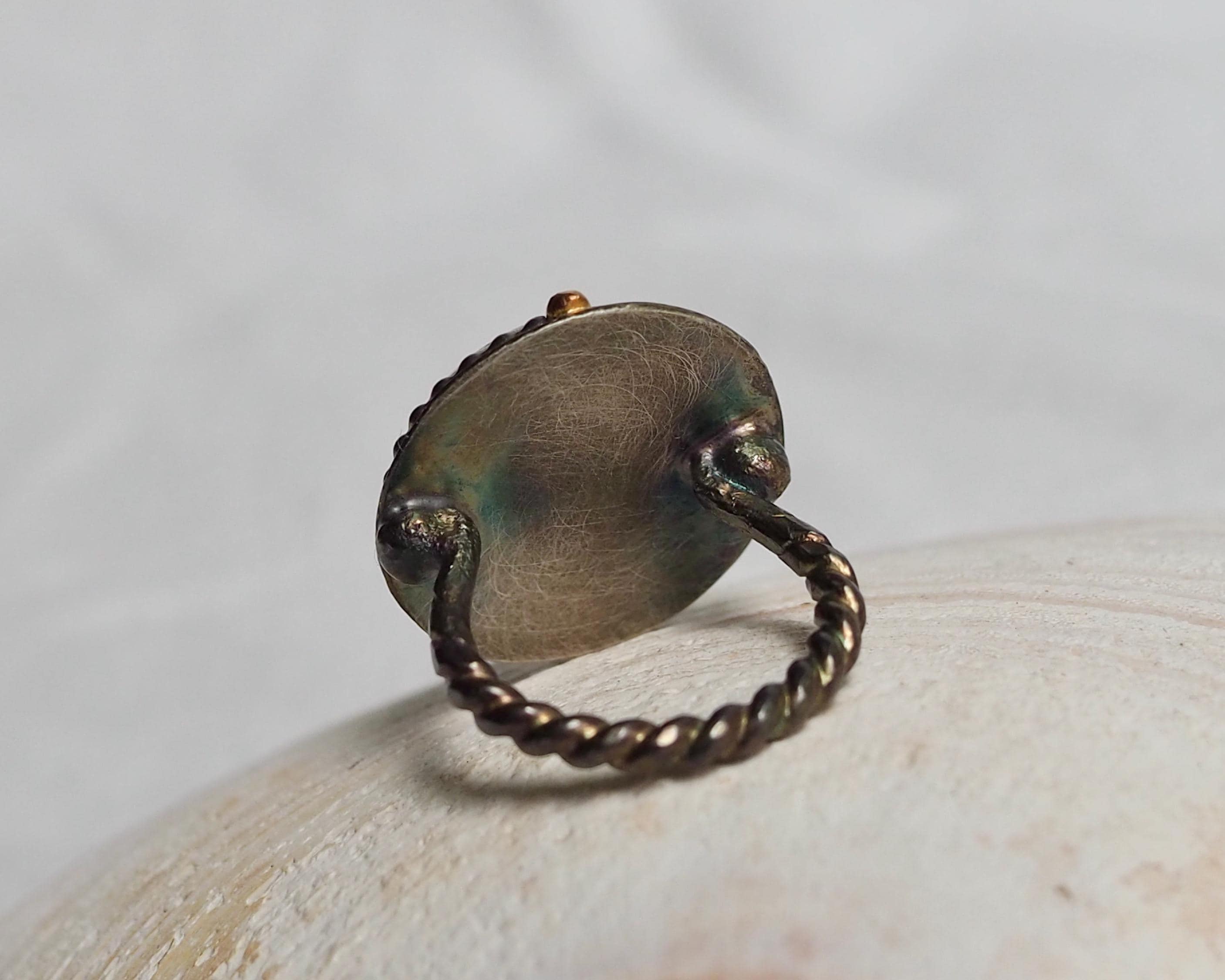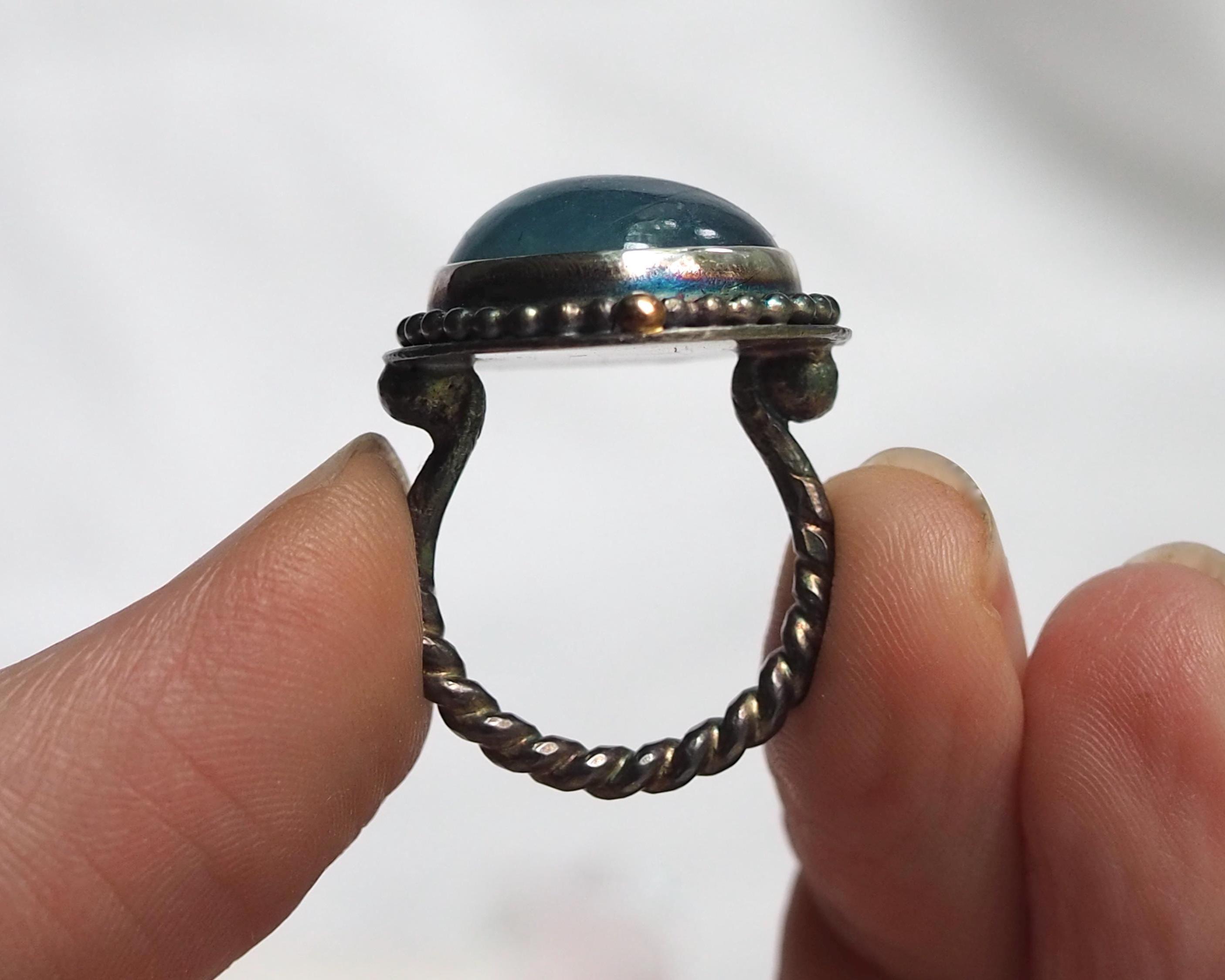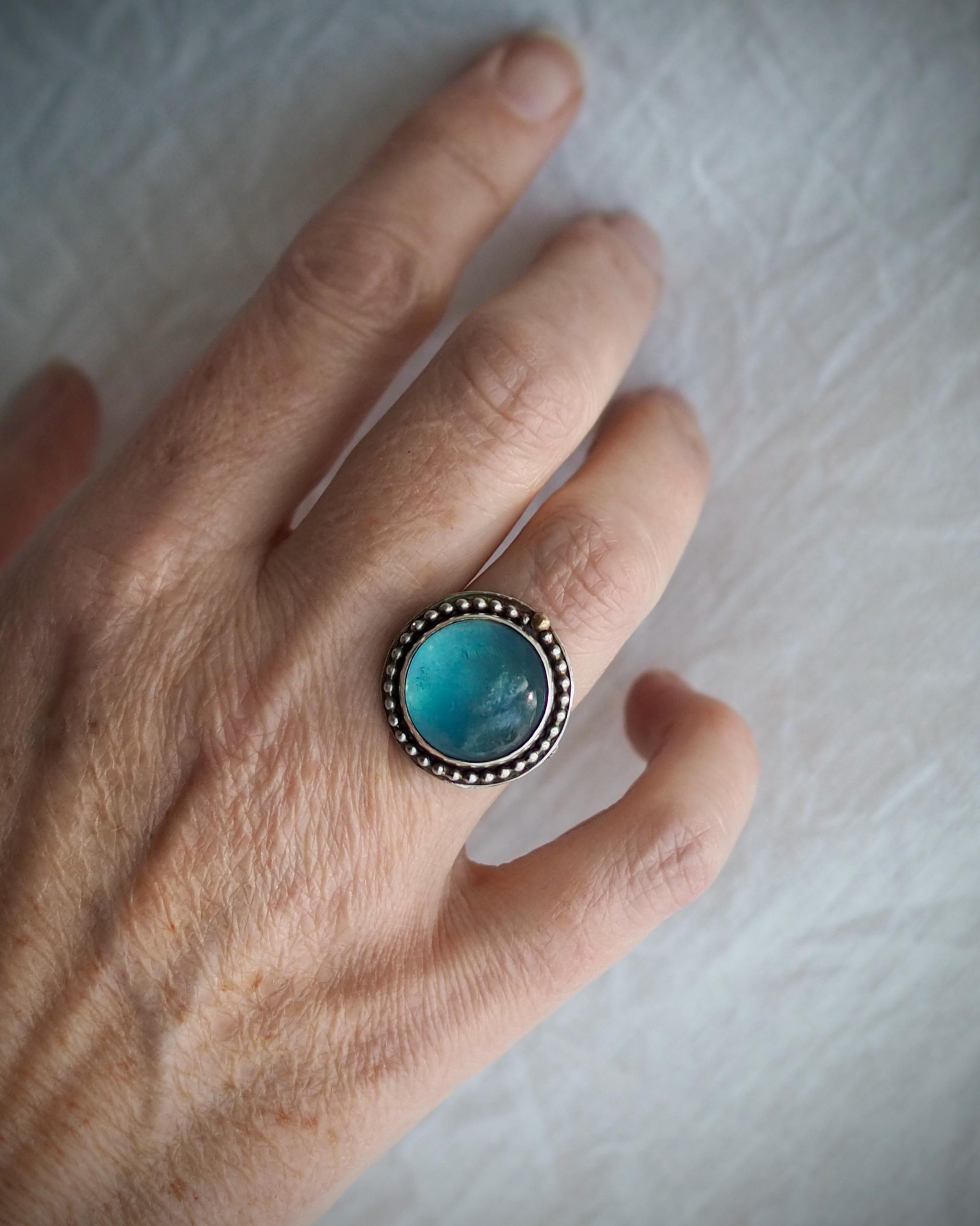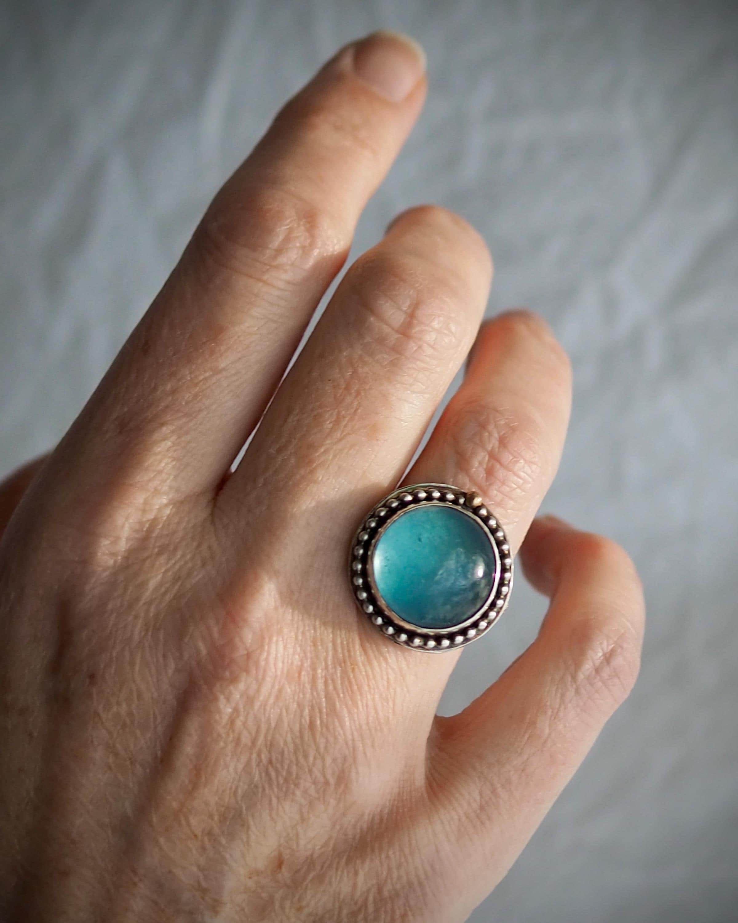 This beautiful stone seems to glow from within. It is such a pretty, vibrant blue color with the subtlest lavender undertone . This glowing gem is set in a fine silver bezel accented by a sterling silver border with an 18k gold granulation. The handmade setting is paired with a U shaped twisted shank and darkened with patina, inspired by ancient jewelry. This natural aquamarine, mined in Afghanistan measures 17.5mm in diameter, the ring is approximately 22mm across, size 7/7.5.