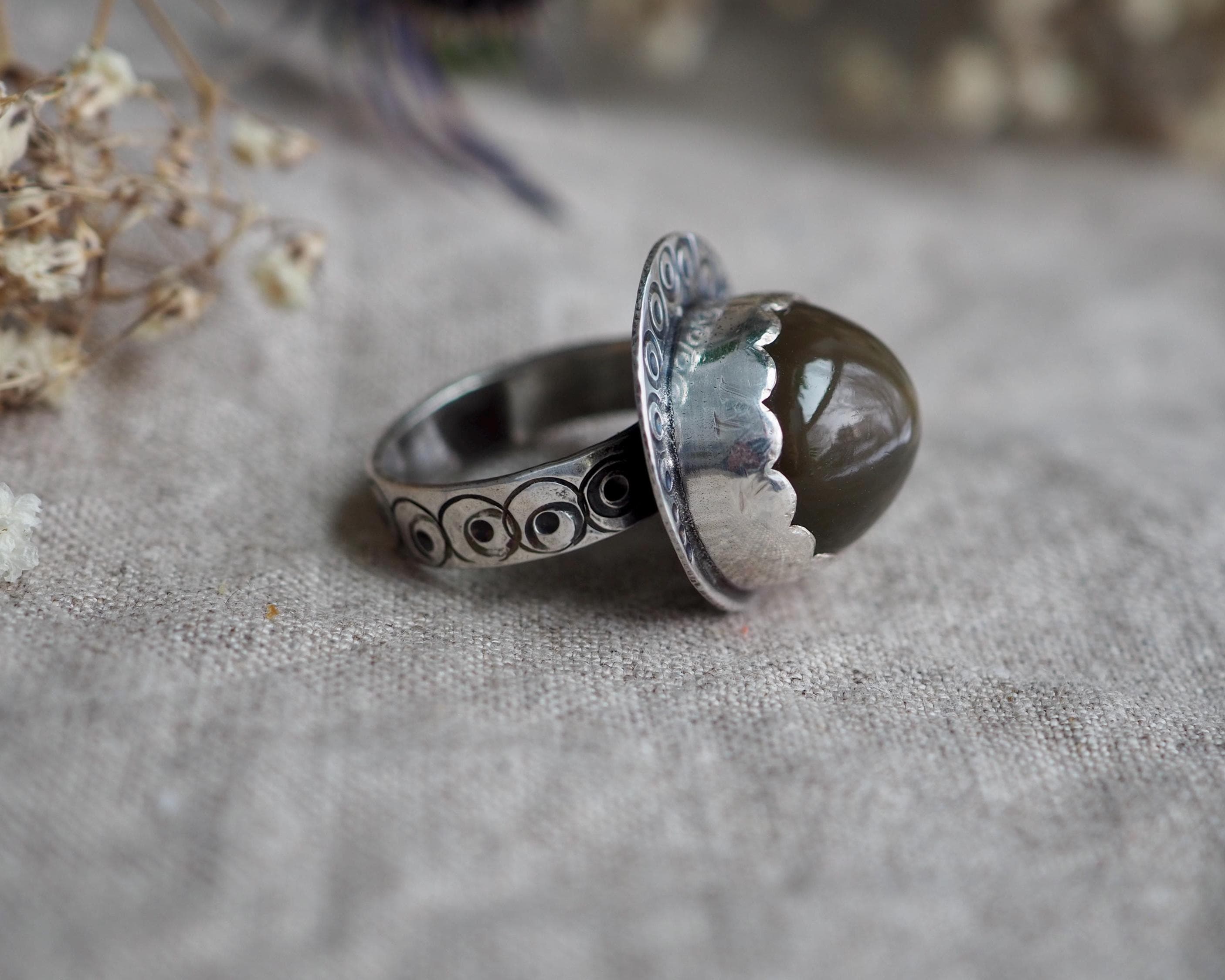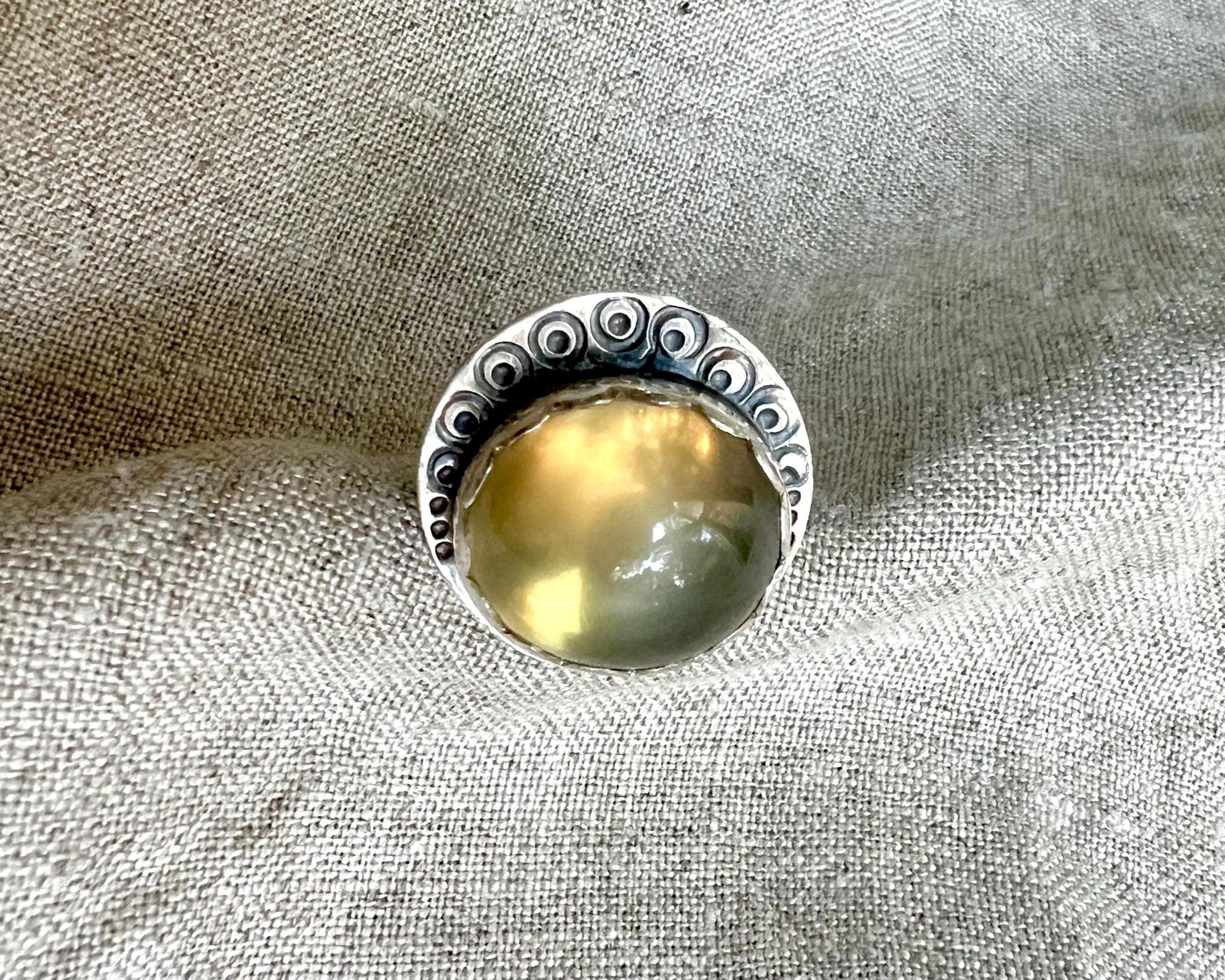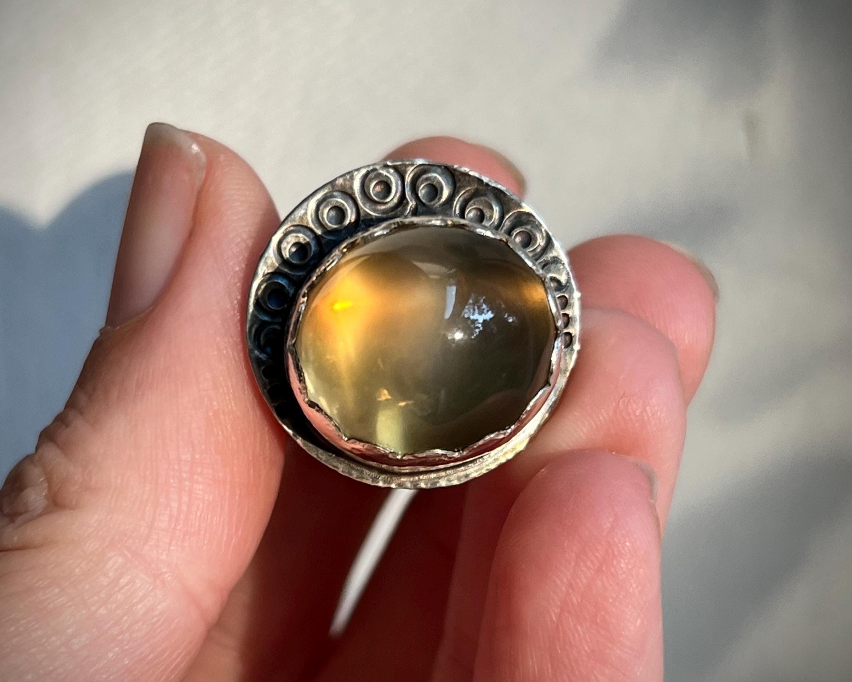 What a gorgeous stone this is! The moonstone has very pretty green and golden flash. It is set in a fine silver bezel with hand cut scalloped edge. The stone measures 16x18mm and sits on a 22mm round backplate and 5mm wide shank, both hand stamped with a circle motif. The whole ring is darkened to accentuate the stamped circle motif. This unique ring is size 8.5-8.75.