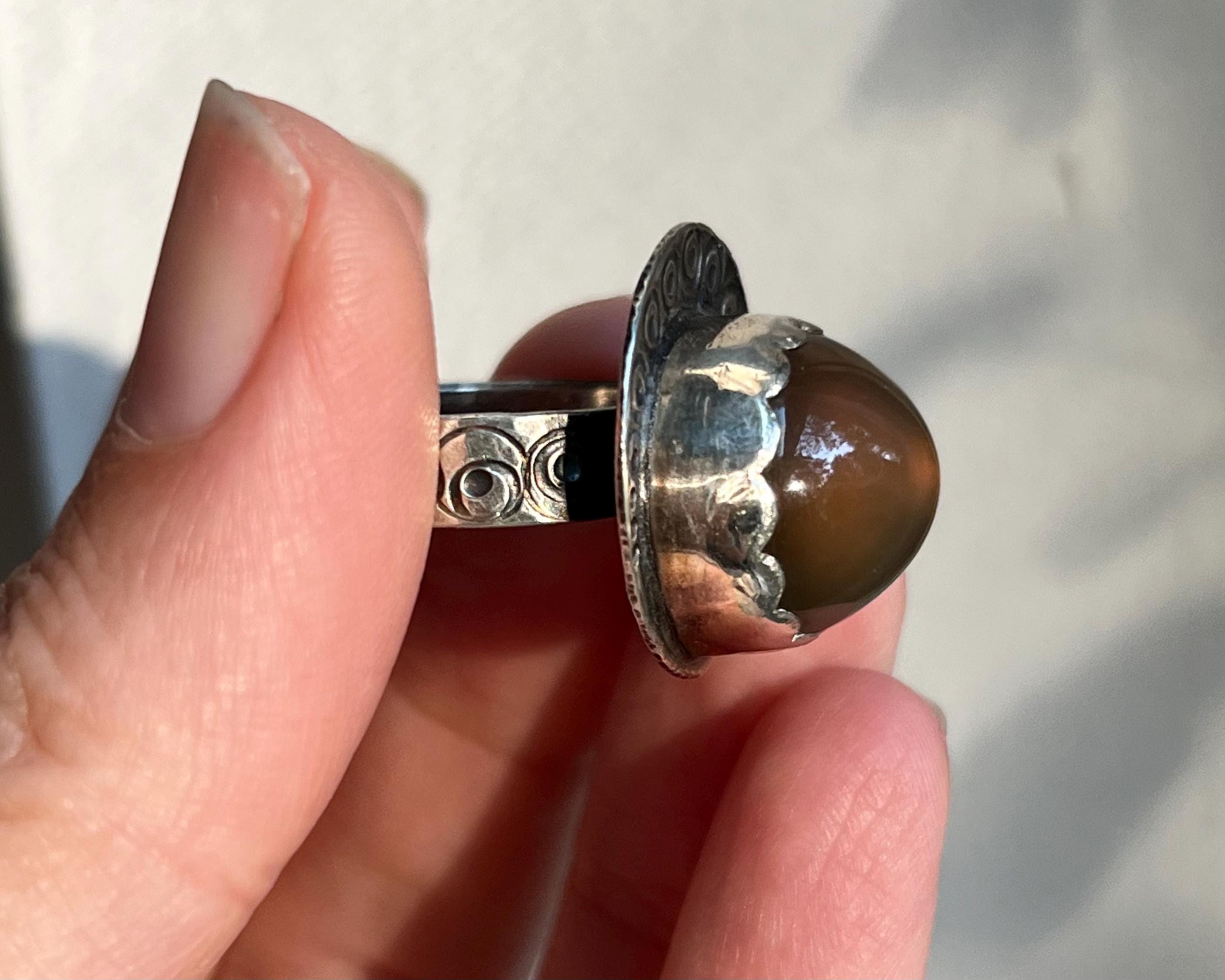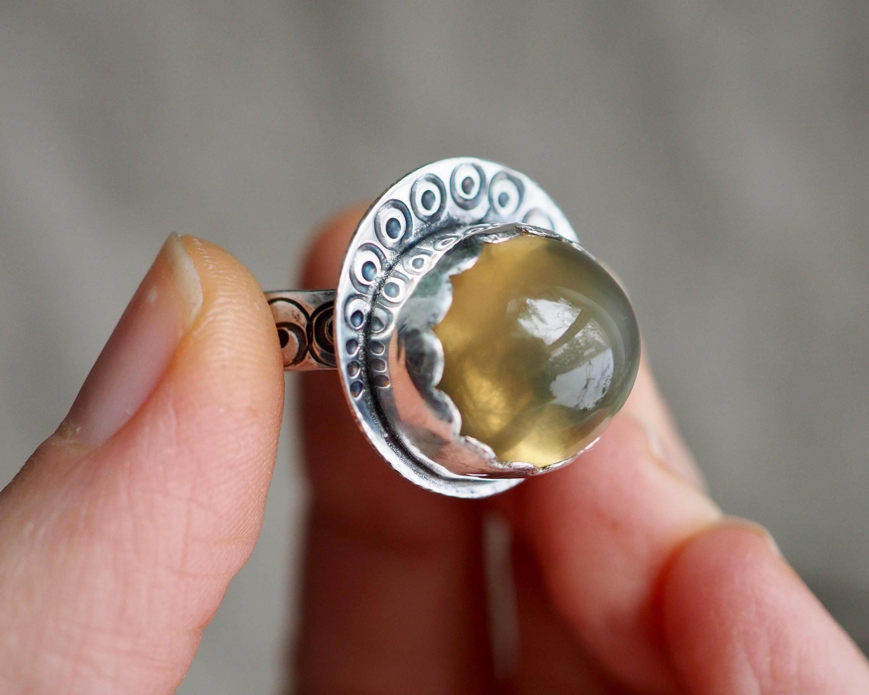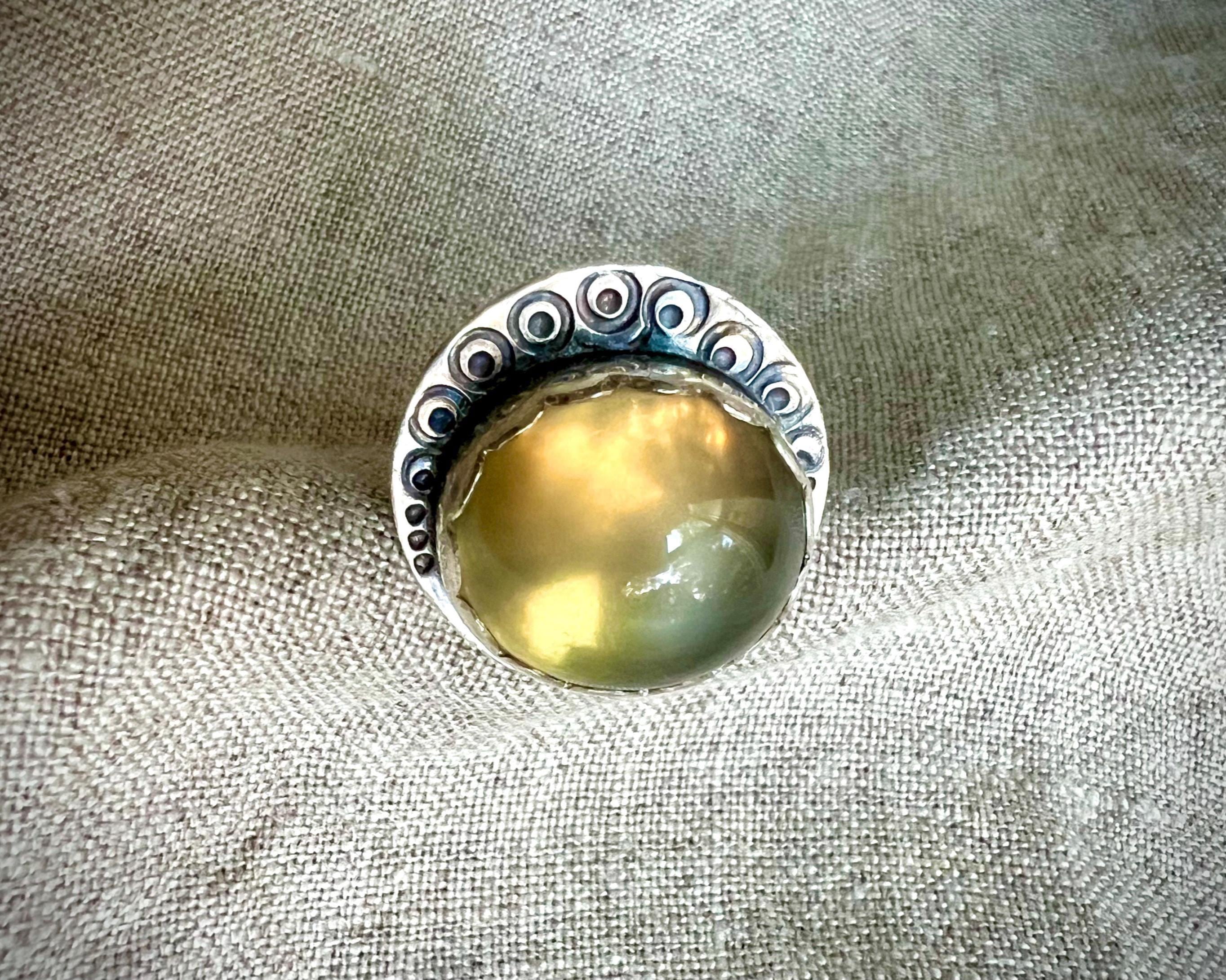 What a gorgeous stone this is! The moonstone has very pretty green and golden flash. It is set in a fine silver bezel with hand cut scalloped edge. The stone measures 16x18mm and sits on a 22mm round backplate and 5mm wide shank, both hand stamped with a circle motif. The whole ring is darkened to accentuate the stamped circle motif. This unique ring is size 8.5-8.75.