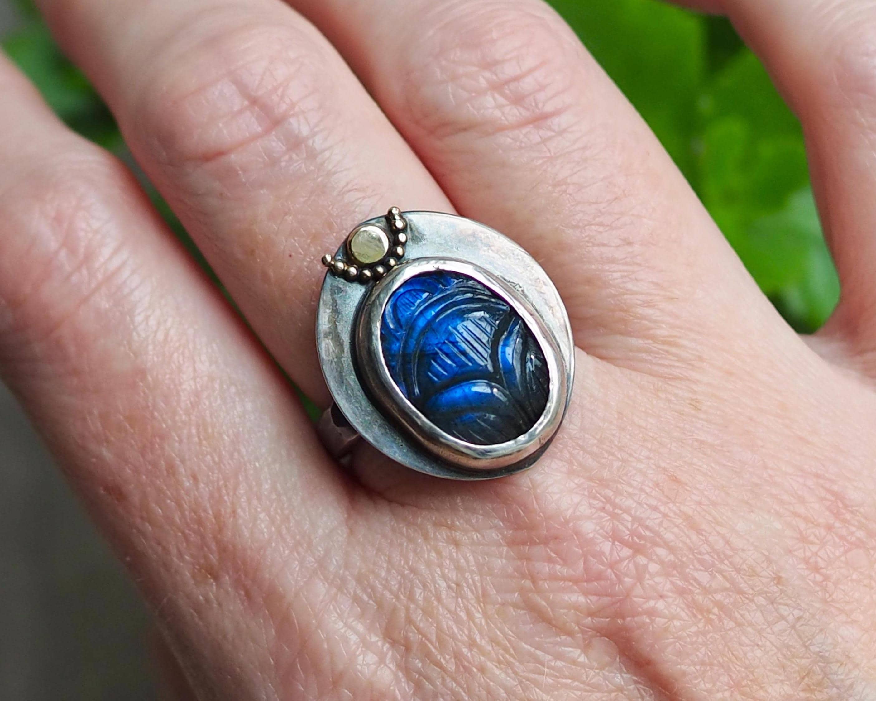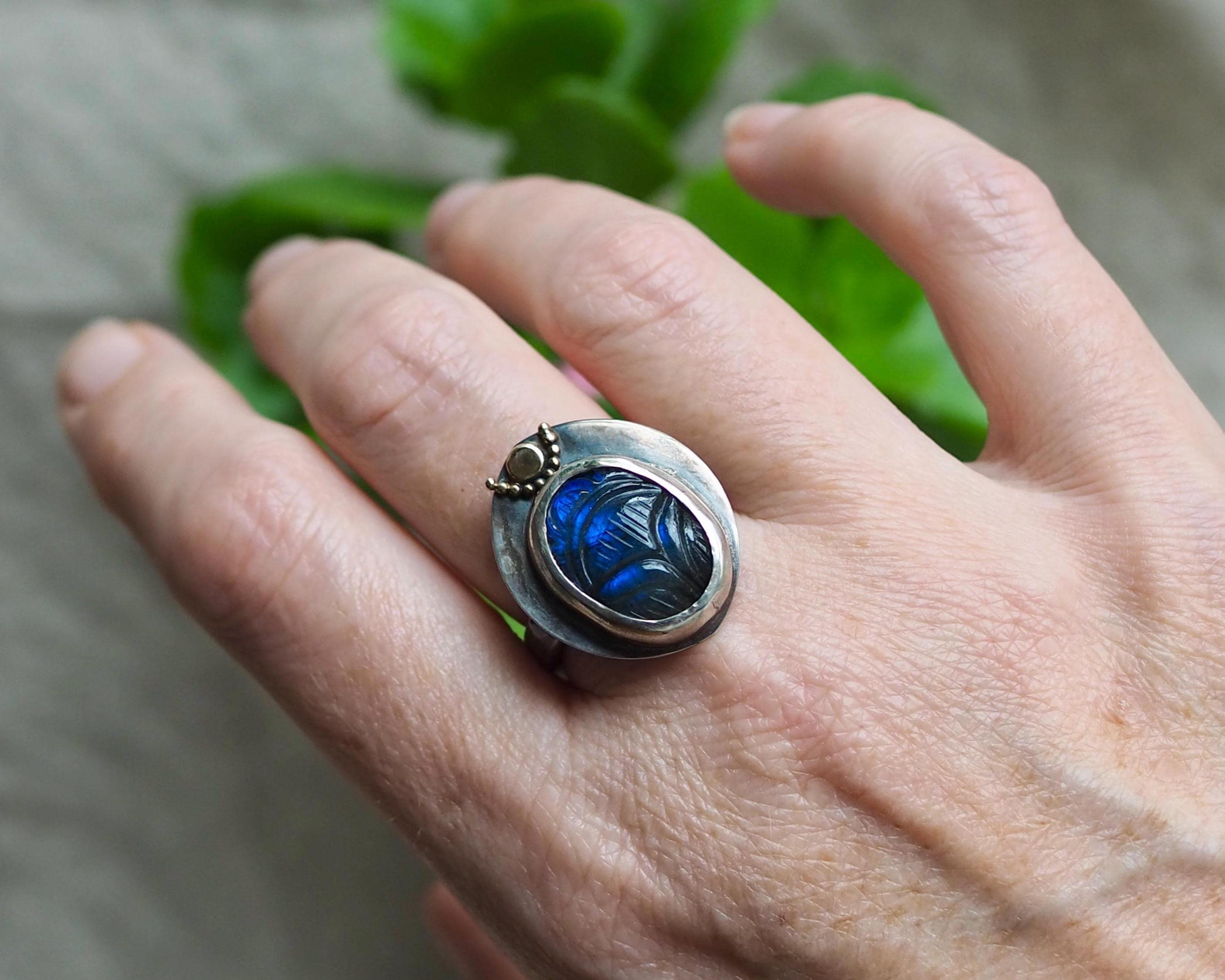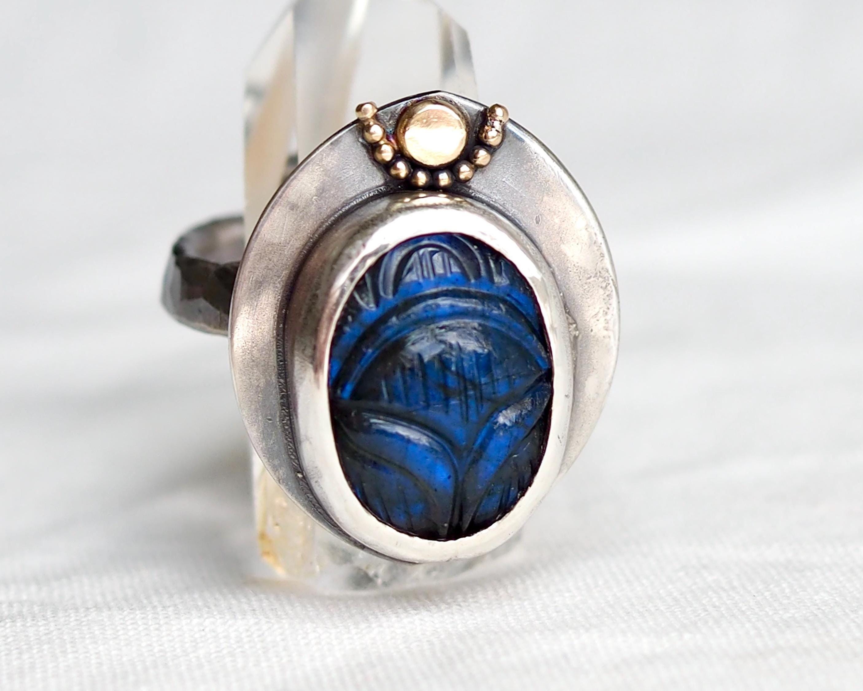 Dreamy, dark blue labradorite beautifully carved into a scarab beetle is all deep dark blue flashes. It is set in a fine silver bezel adorned with a 14k gold Sun disc, with a large marquise shaped closed backplate. It sits on a hammered sterling silver shank with light catching facets, inspired by ancient jewelry. The ring is oxidized to and polished to a luscious tone. This intriguing ring is size 8.5