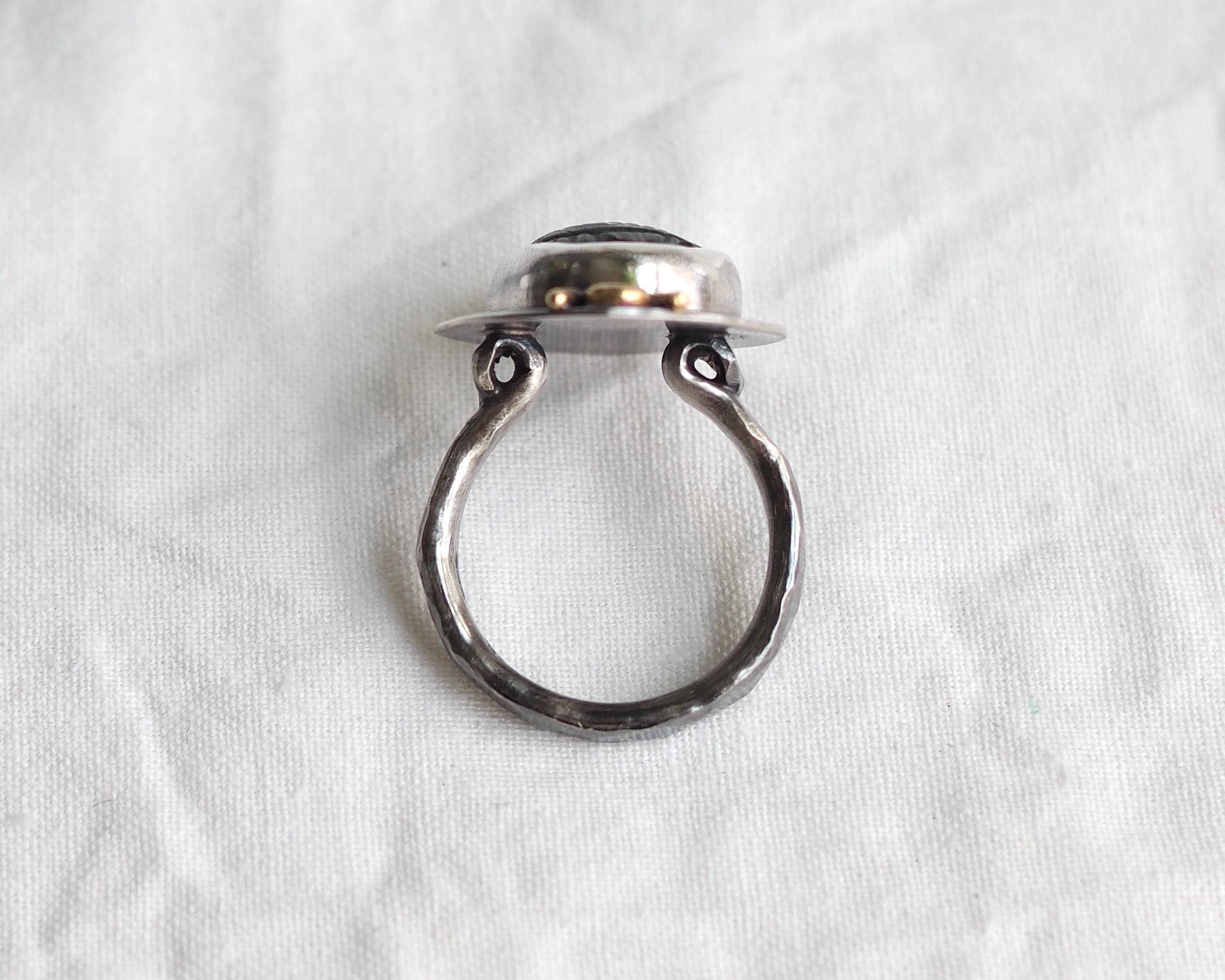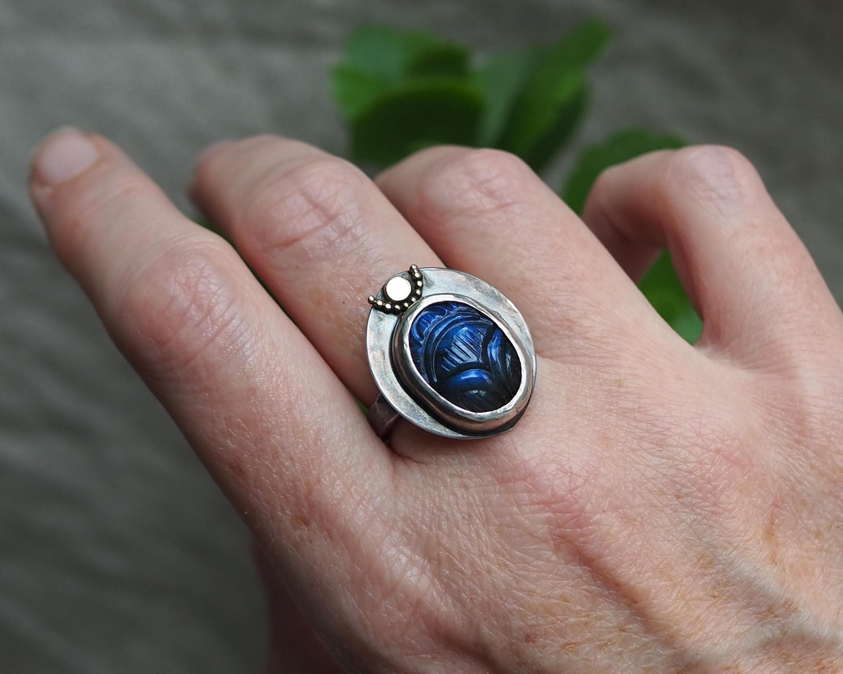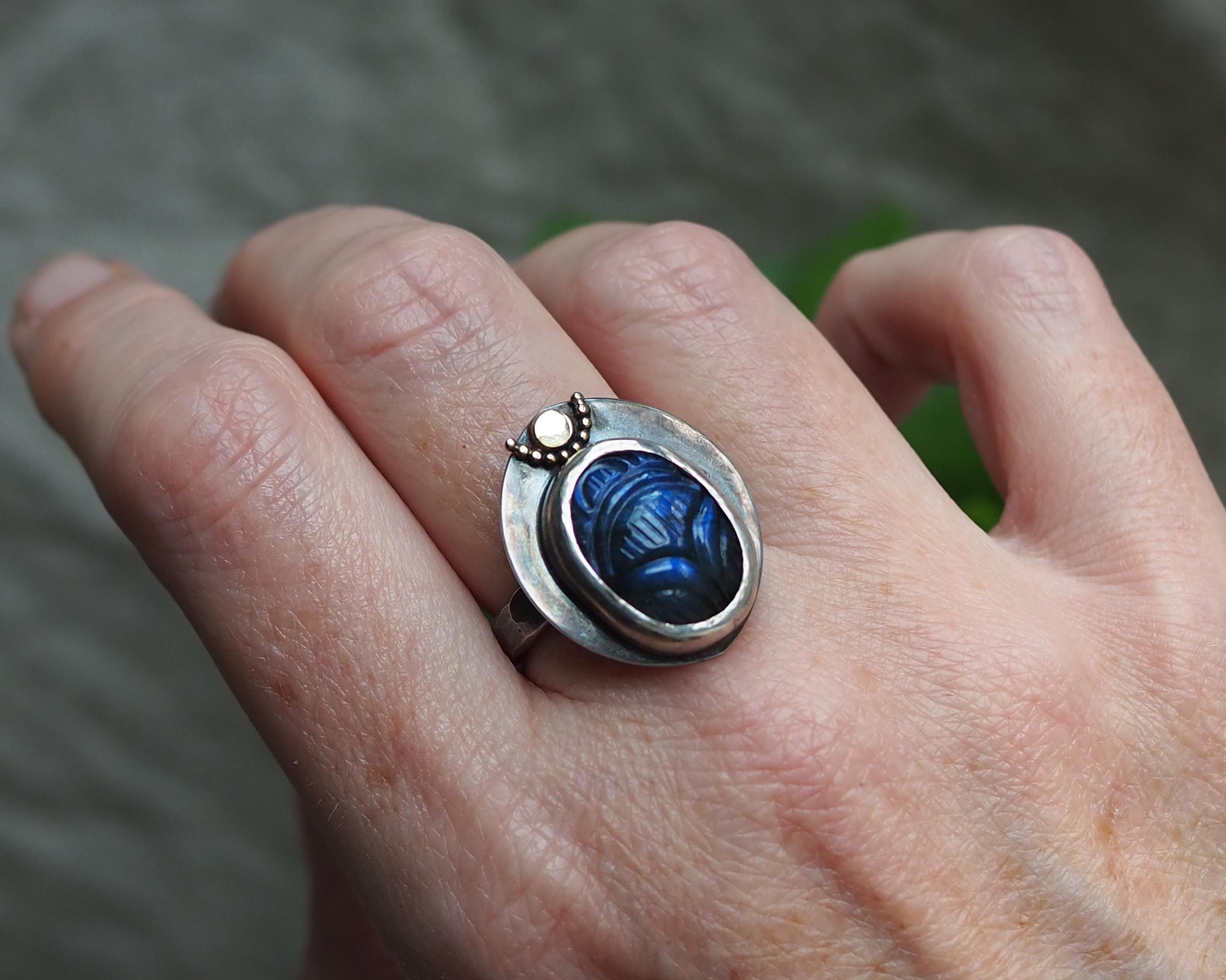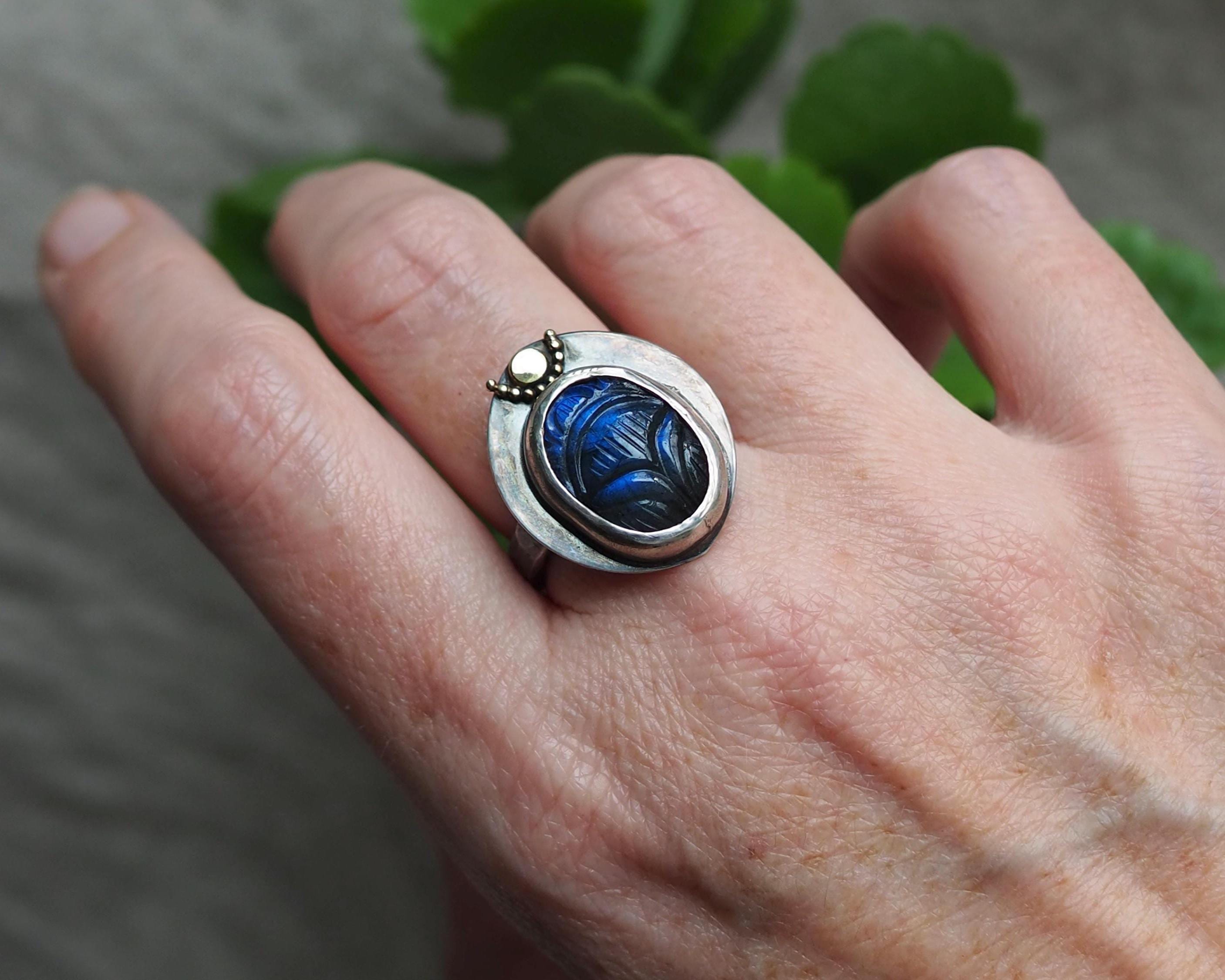 Dreamy, dark blue labradorite beautifully carved into a scarab beetle is all deep dark blue flashes. It is set in a fine silver bezel adorned with a 14k gold Sun disc, with a large marquise shaped closed backplate. It sits on a hammered sterling silver shank with light catching facets, inspired by ancient jewelry. The ring is oxidized to and polished to a luscious tone. This intriguing ring is size 8.5