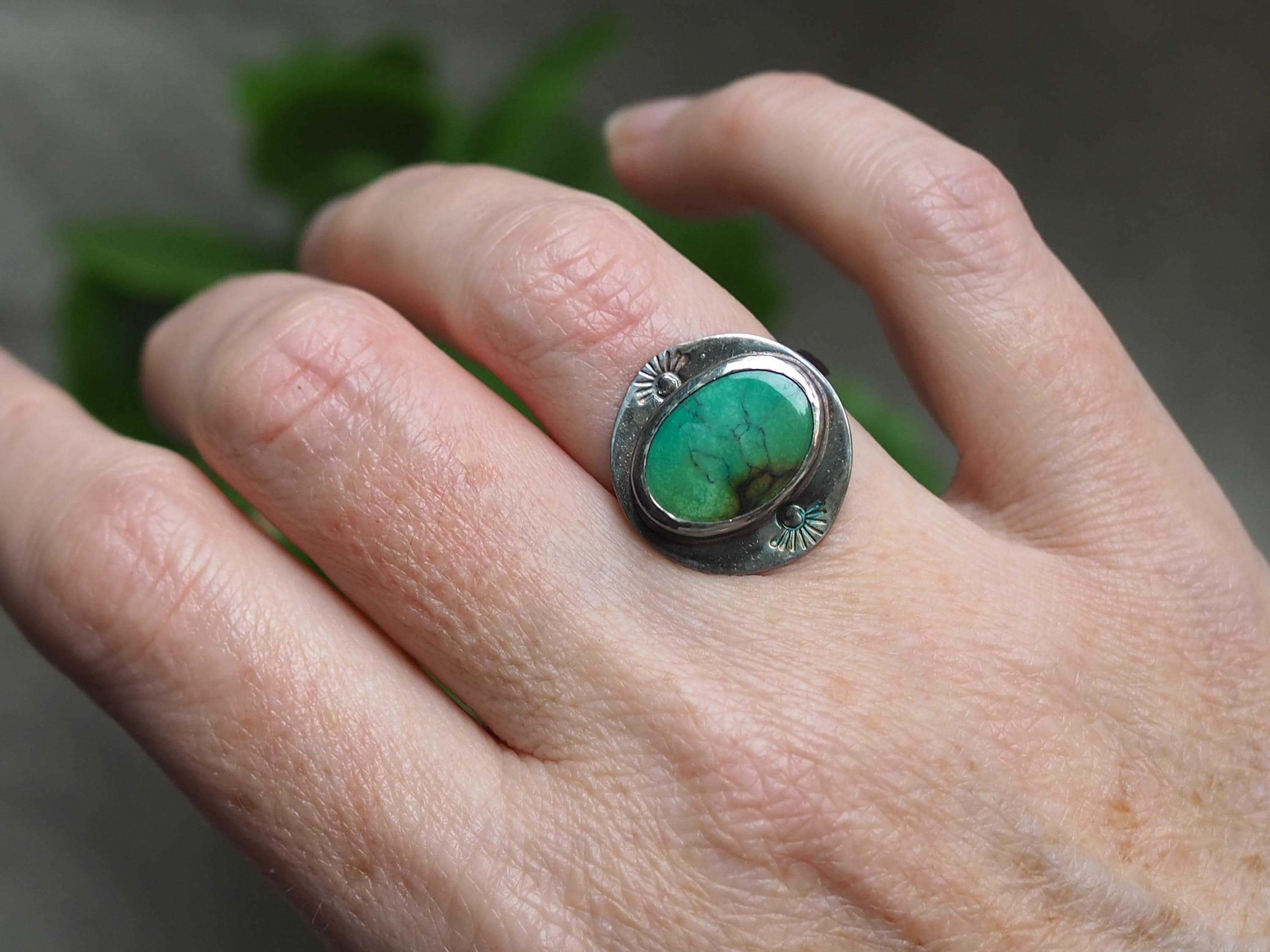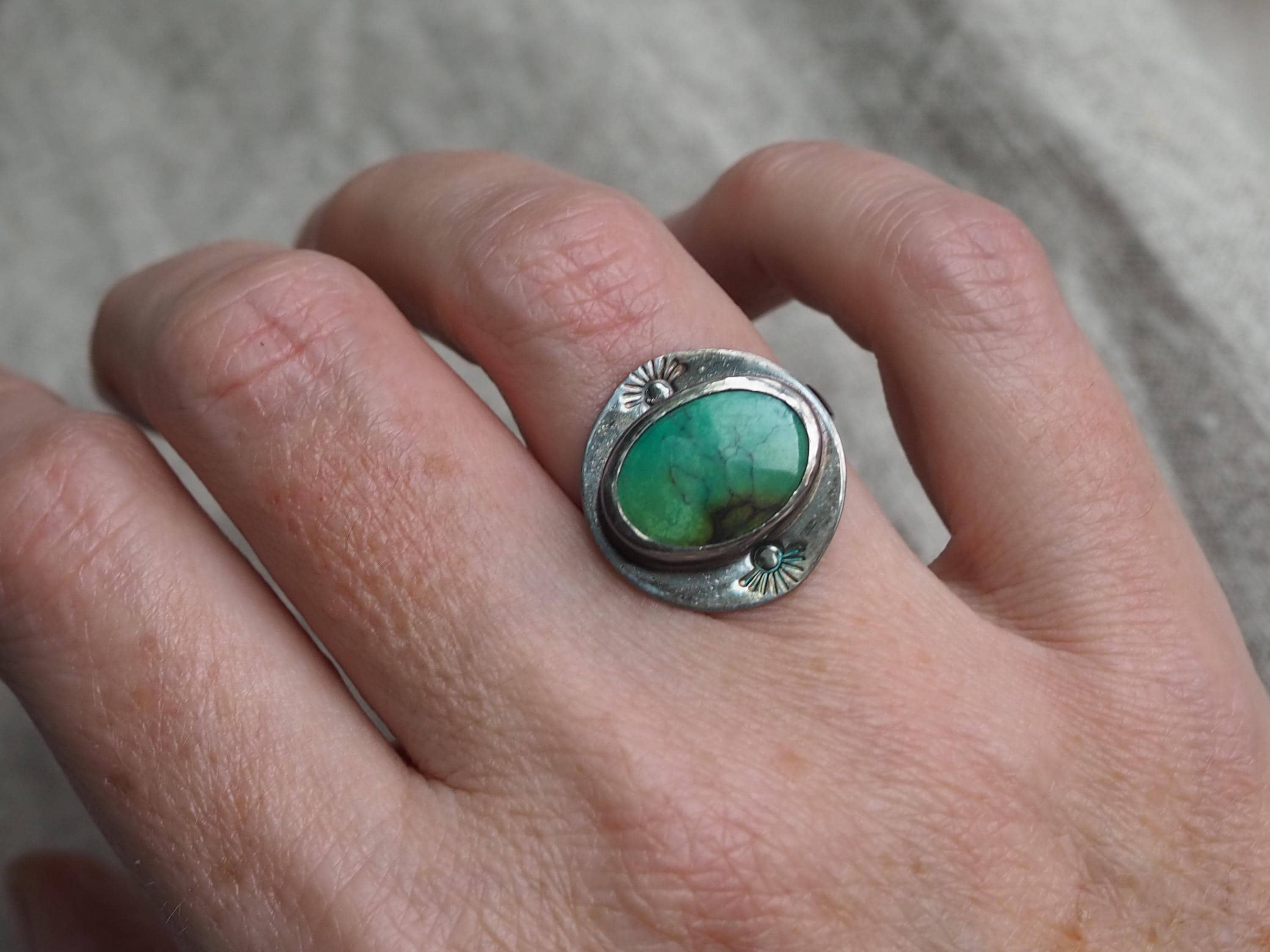 Sweet blue-green turquoise has an inclusion reminiscent of a little hill. The stone measures 12x16mm and is set in a fine silver bezel paired with a hand stamped, marquise shaped backplate and rounded band. The ring is patinated to give it a nice dark tone. This ring is one of a kind, size 7.25-7.5