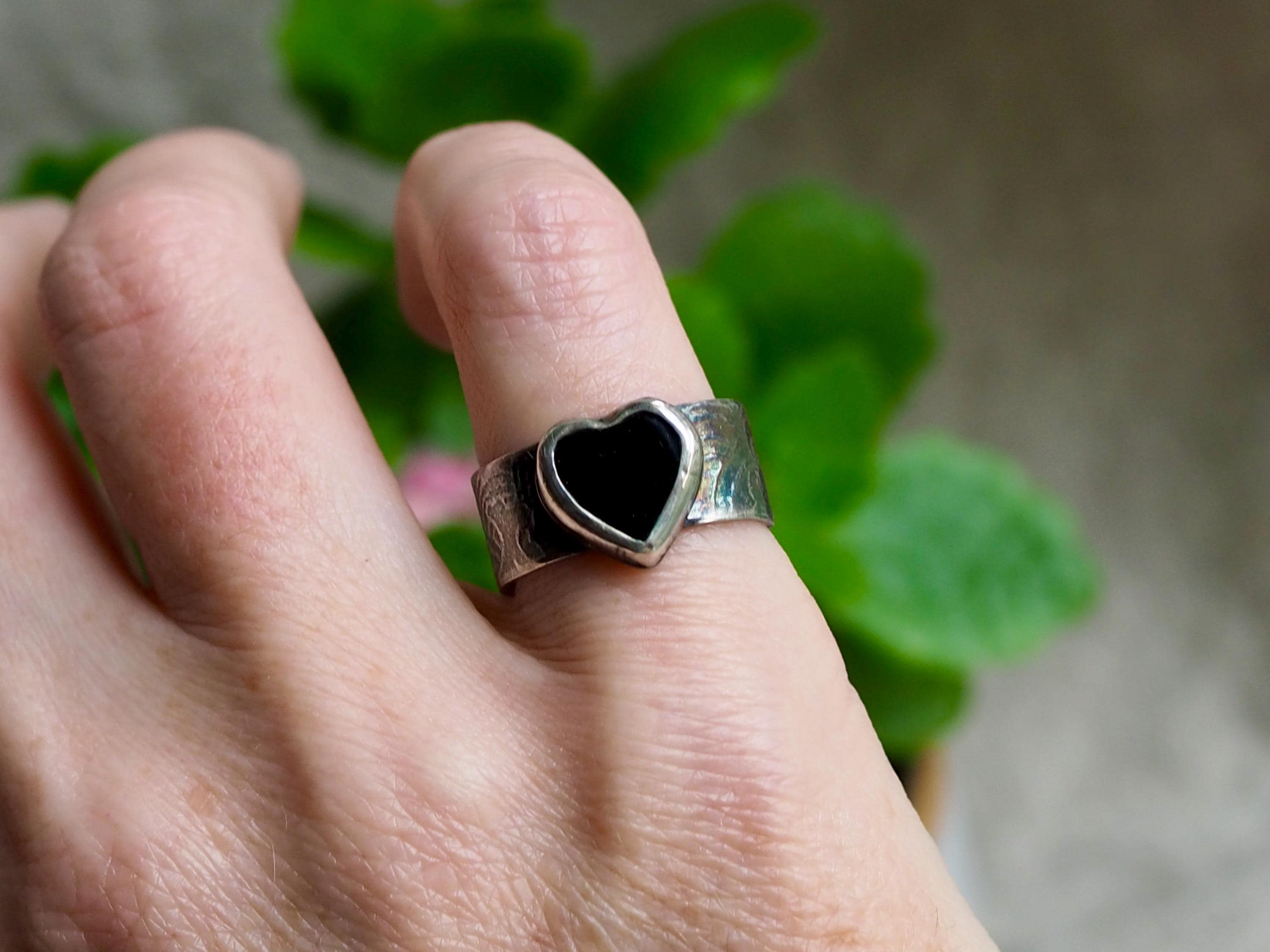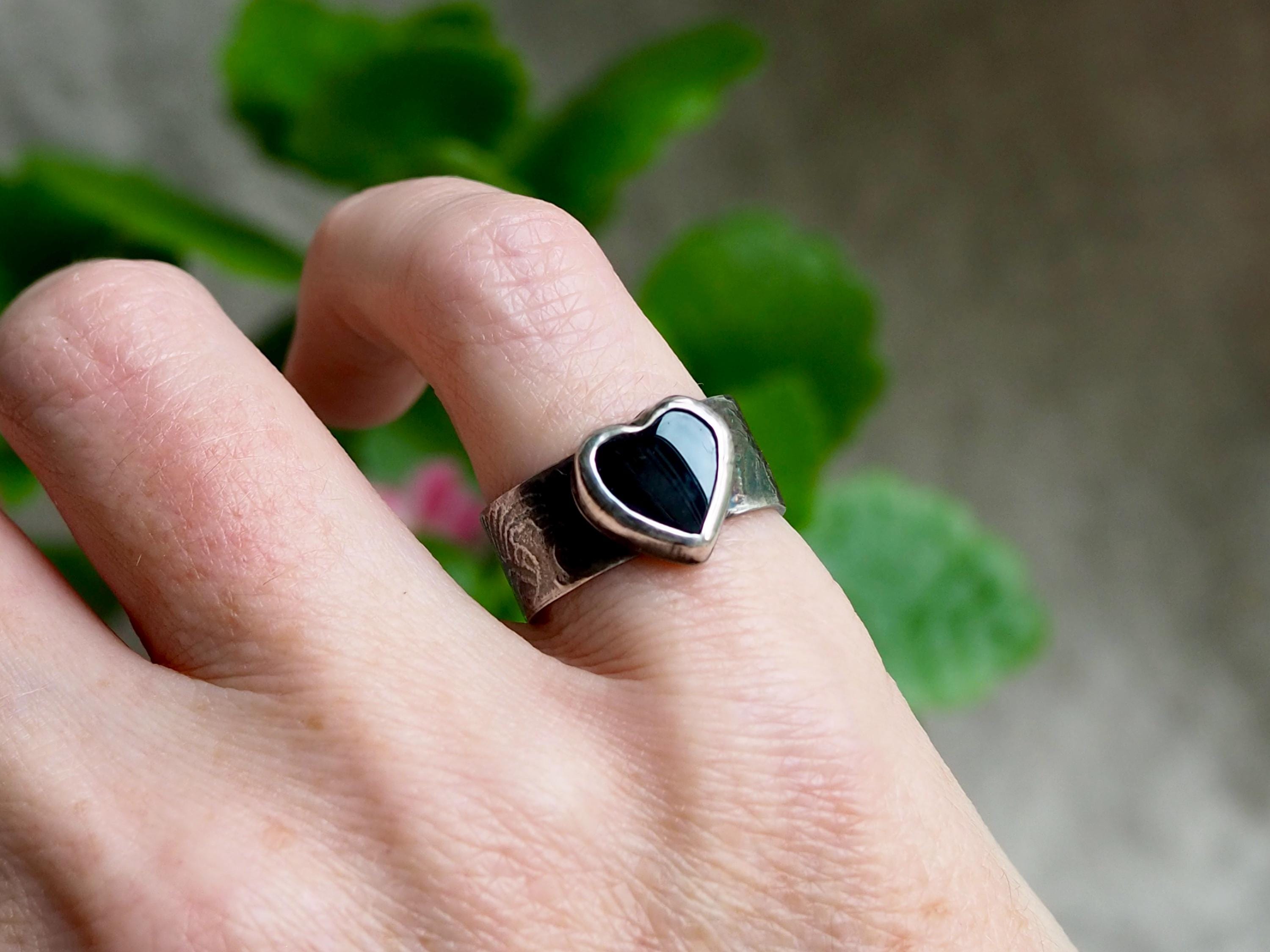 This dark and moody ring has a 10mm black onyx heart set in a fine silver bezel with closed sterling silver backplate. I created the cigar band style shank from sterling silver which I textured with ocean waves motif, it is just over 8.5 mm wide.