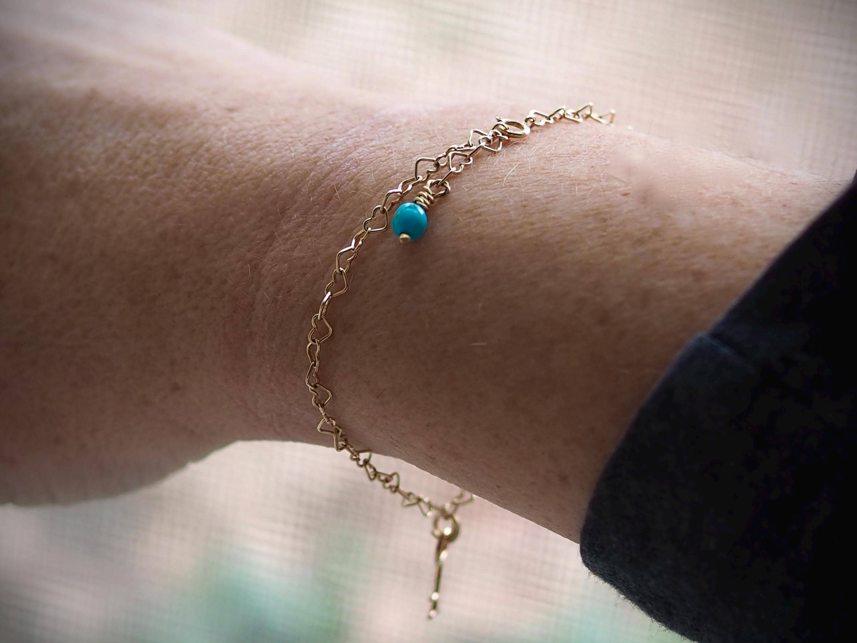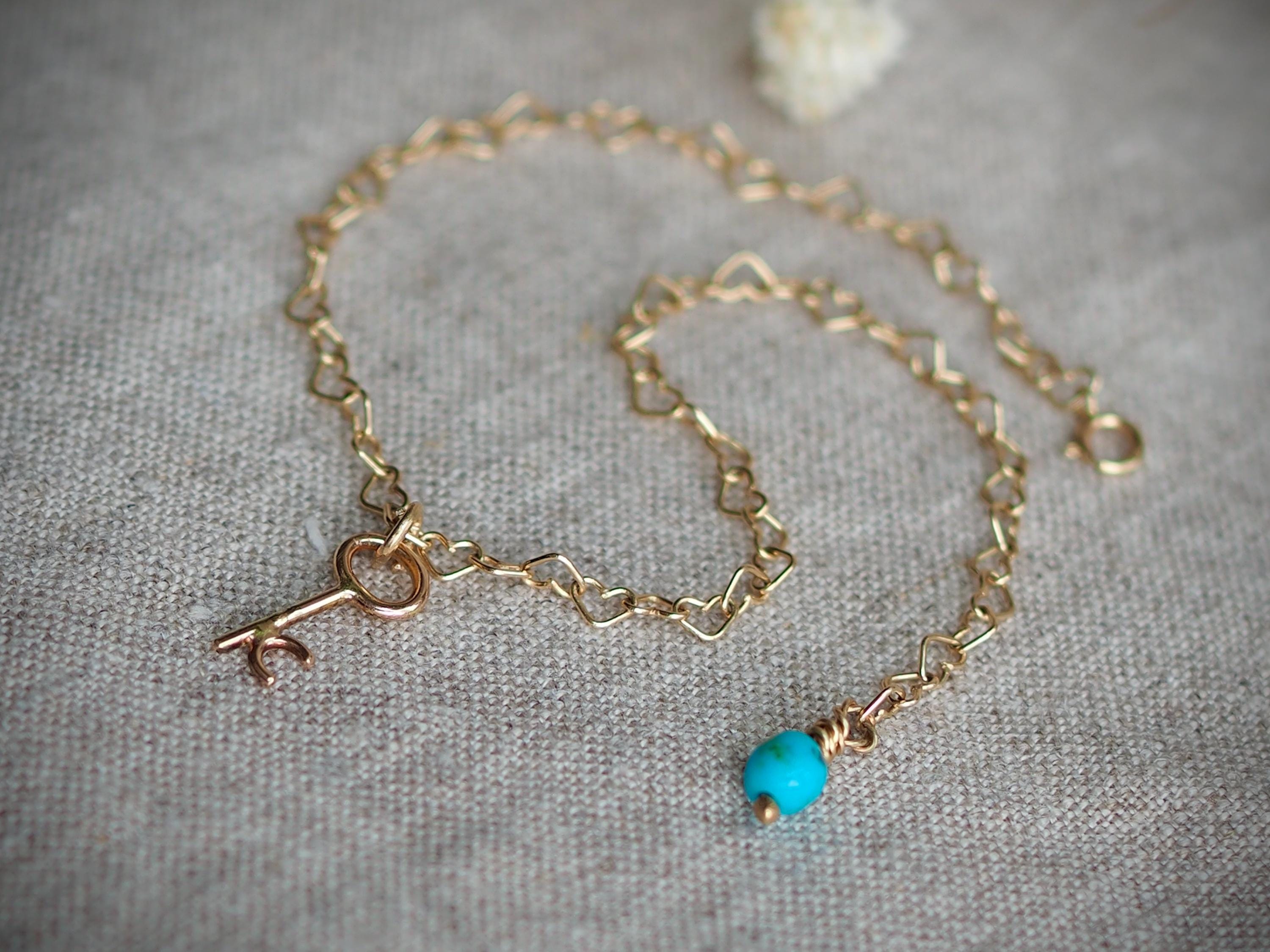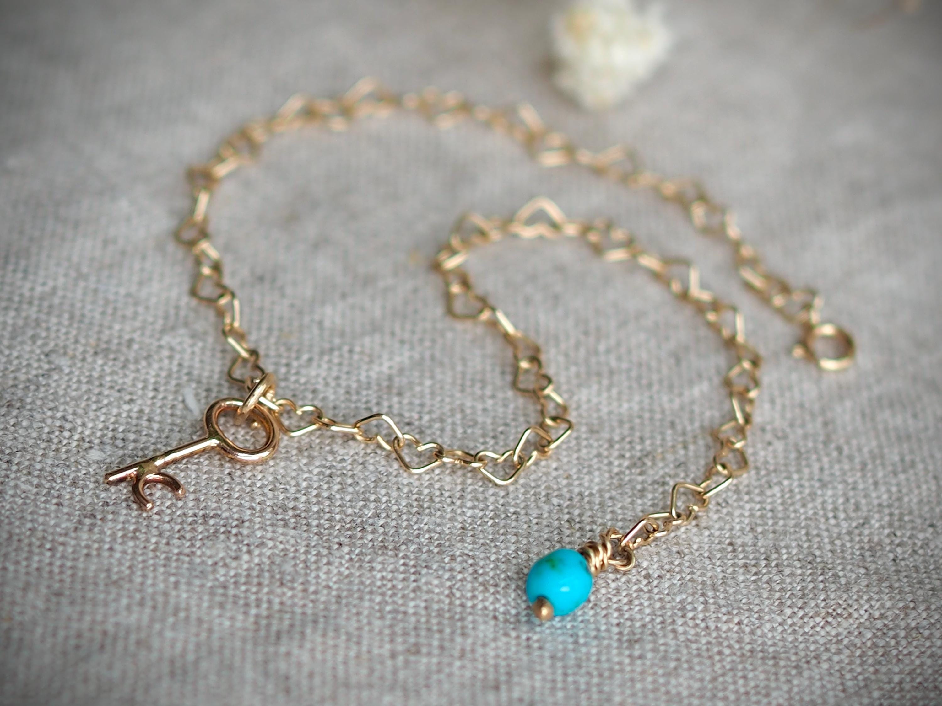 Handmade, solid 14k gold key moves freely on this lovely chain bracelet. The chain links are tiny hearts interlocked together. The bracelet is adorned with a saturated blue turquoise organic shape nugget. The natural turquoise is American mined, from Blue Ridge, Nevada. The key is approximately 0.5" long, the chain is 3.2mm wide, with a small spring ring clasp, all solid 14k gold.