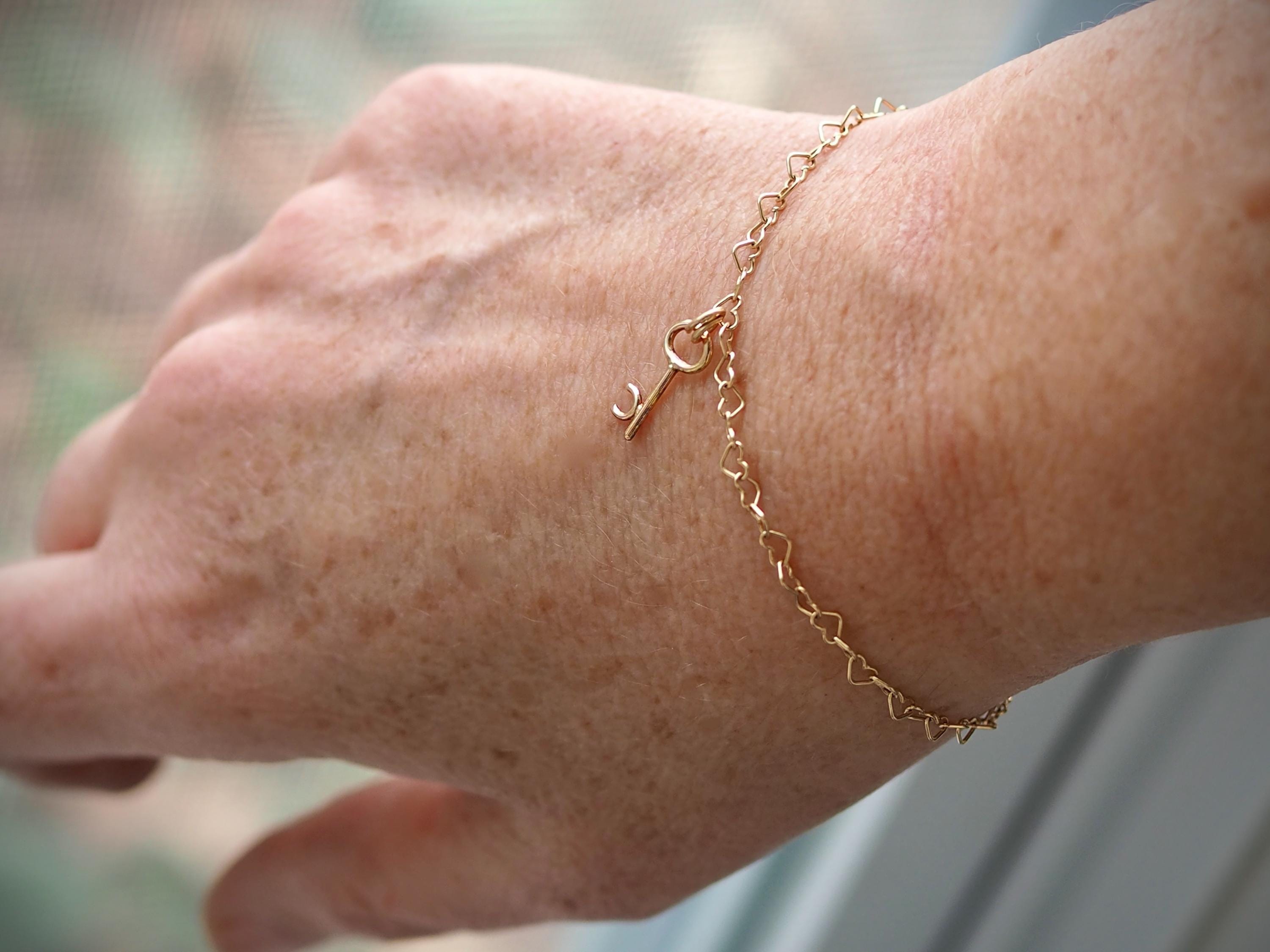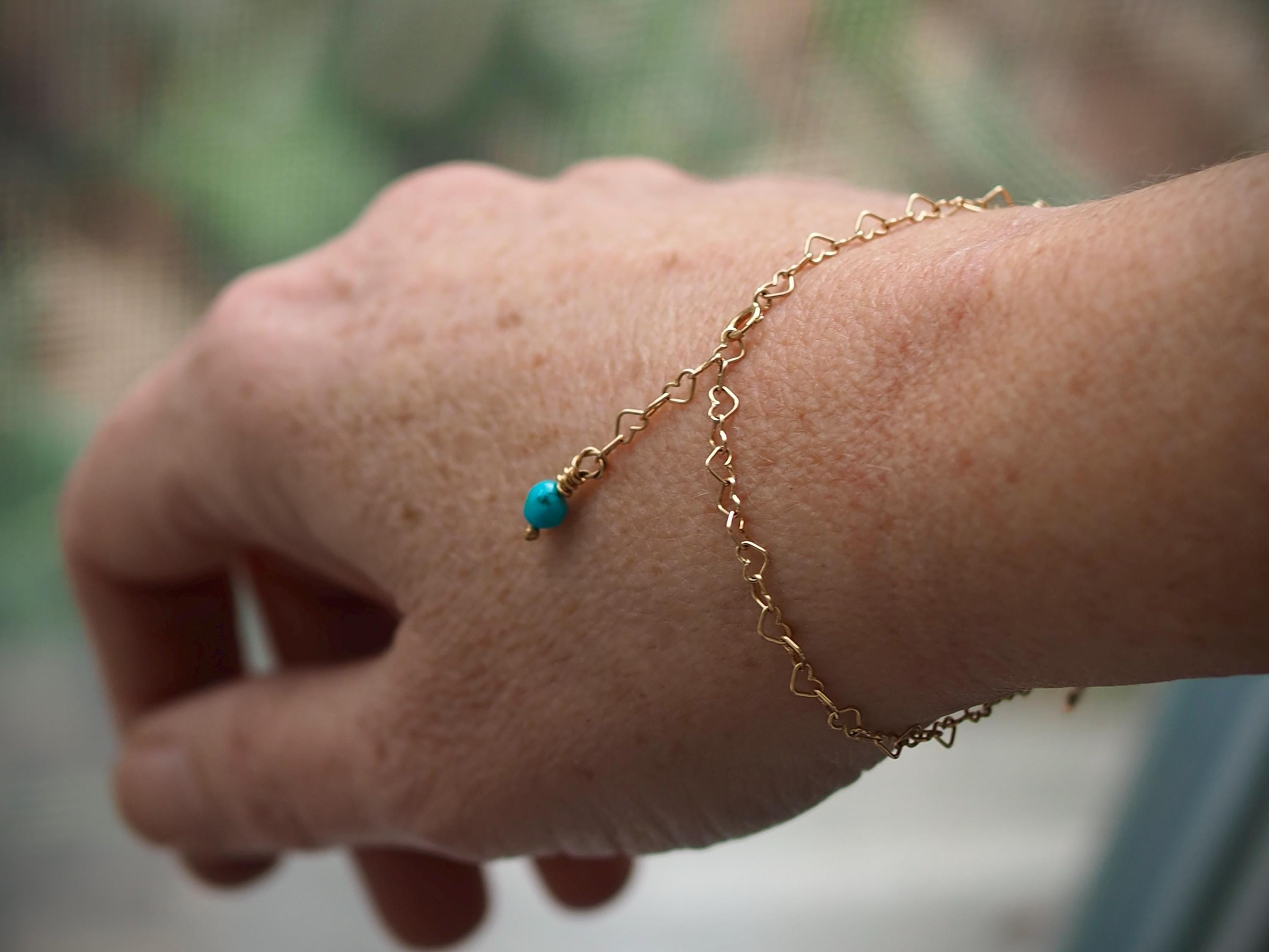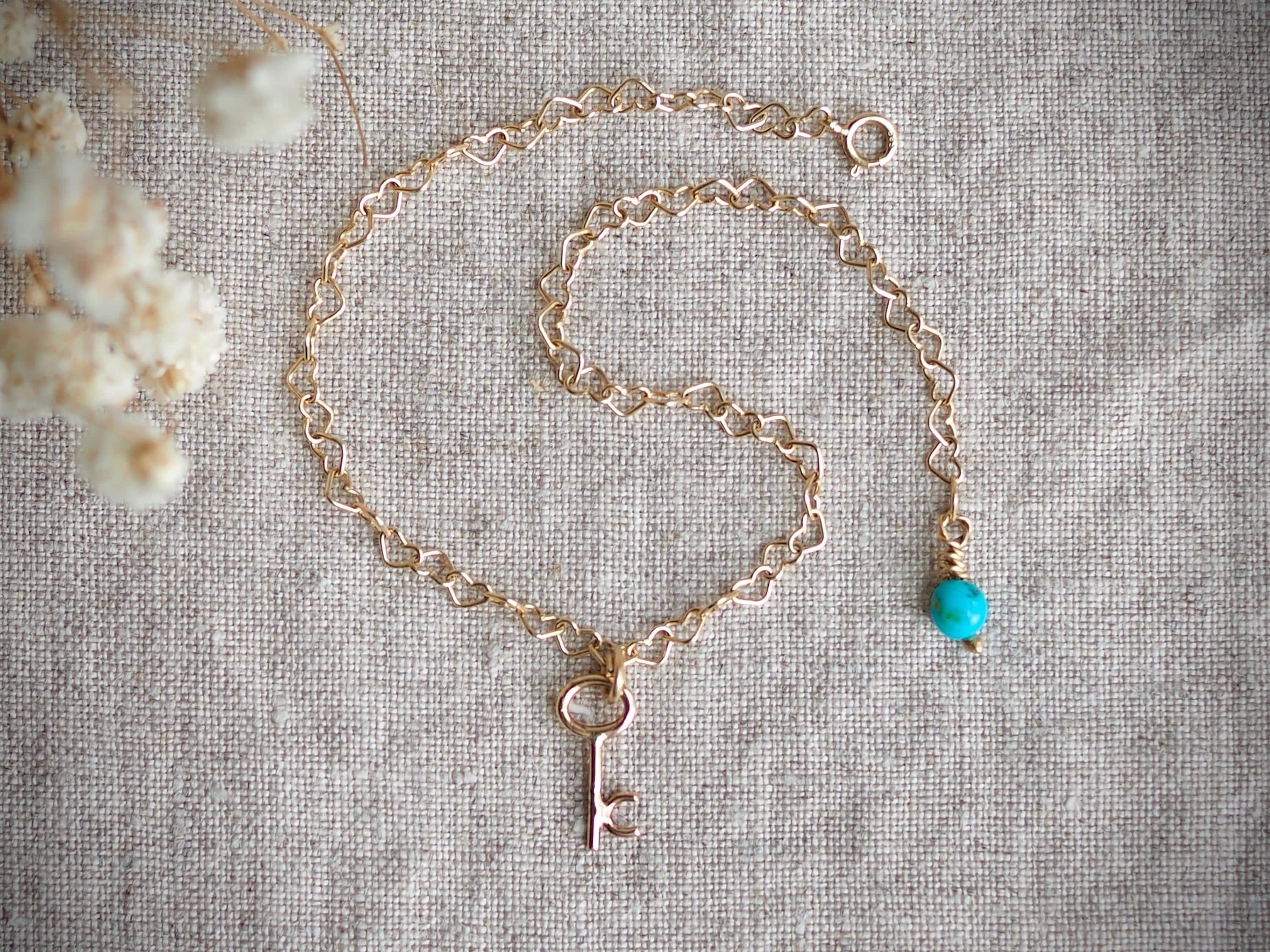Handmade, solid 14k gold key moves freely on this lovely chain bracelet. The chain links are tiny hearts interlocked together. The bracelet is adorned with a saturated blue turquoise organic shape nugget. The natural turquoise is American mined, from Blue Ridge, Nevada. The key is approximately 0.5" long, the chain is 3.2mm wide, with a small spring ring clasp, all solid 14k gold.
