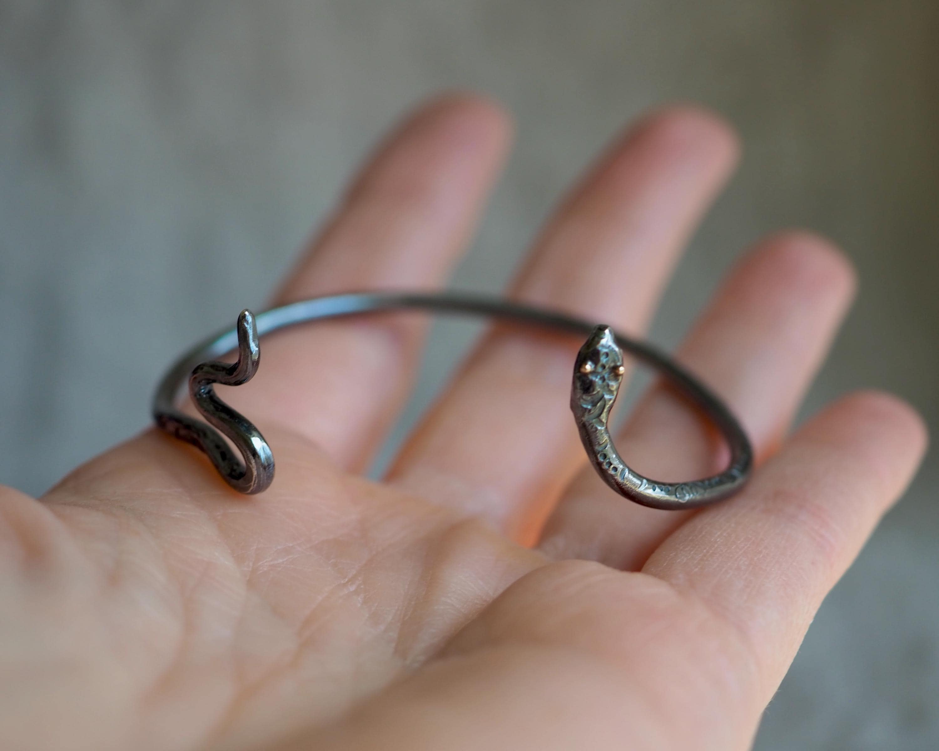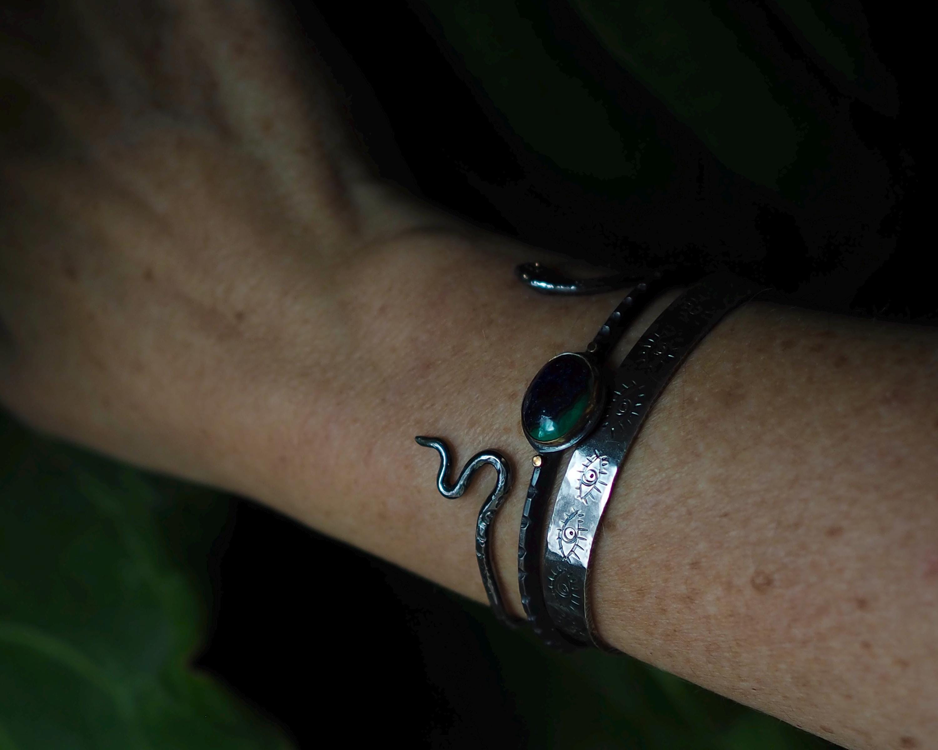 This hand-forged sterling silver snake has glowing 14k gold eyes, and is hand-stamped with decorative motif. The silver cuff has been darkened to a moody, elegant tone. Created with a 3mm thick sterling silver wire and measuring 2x2.3 inches, this cuff is slightly adjustable. Its tapered, wavy tail ensures a comfortable and secure fit.