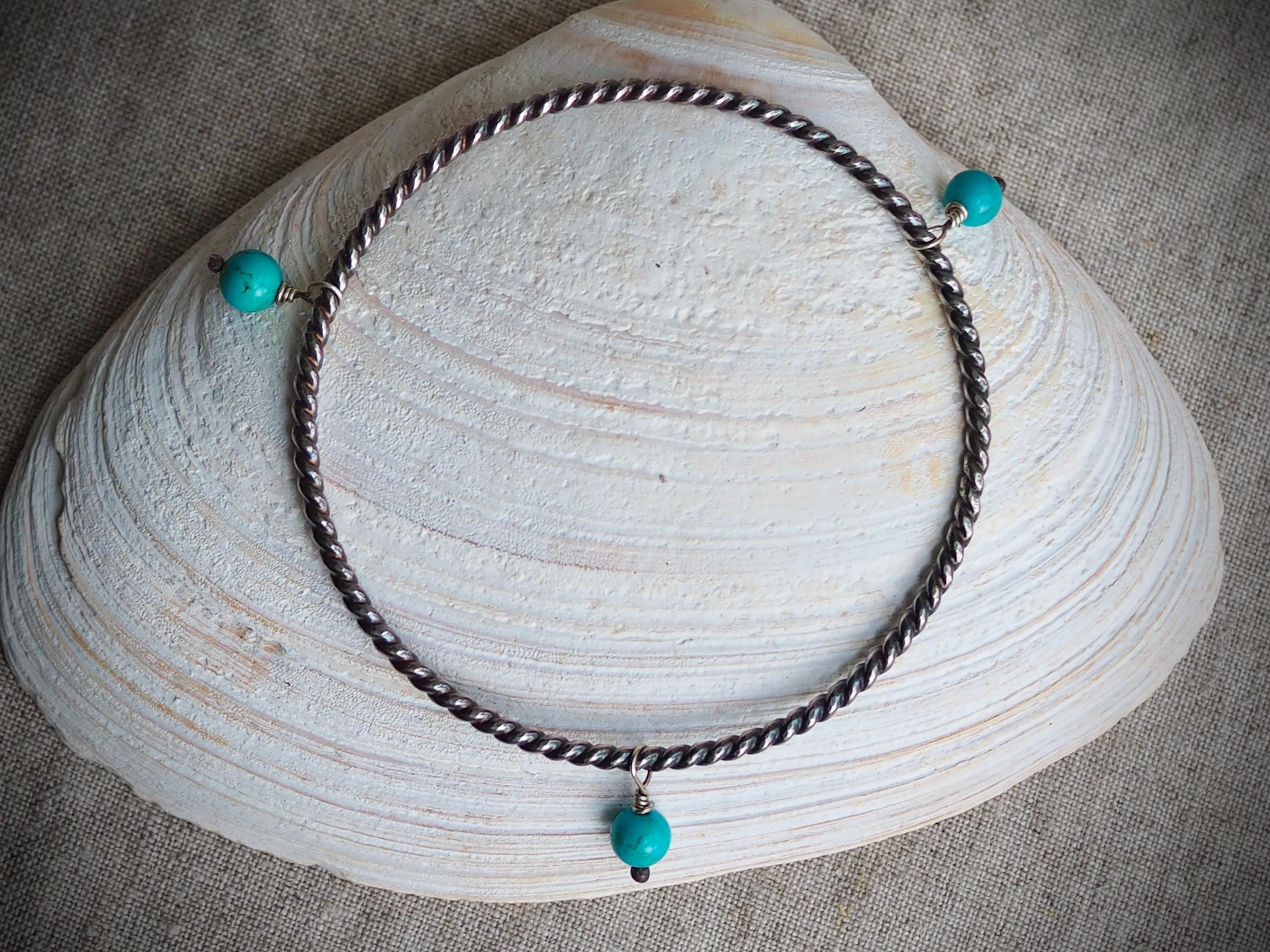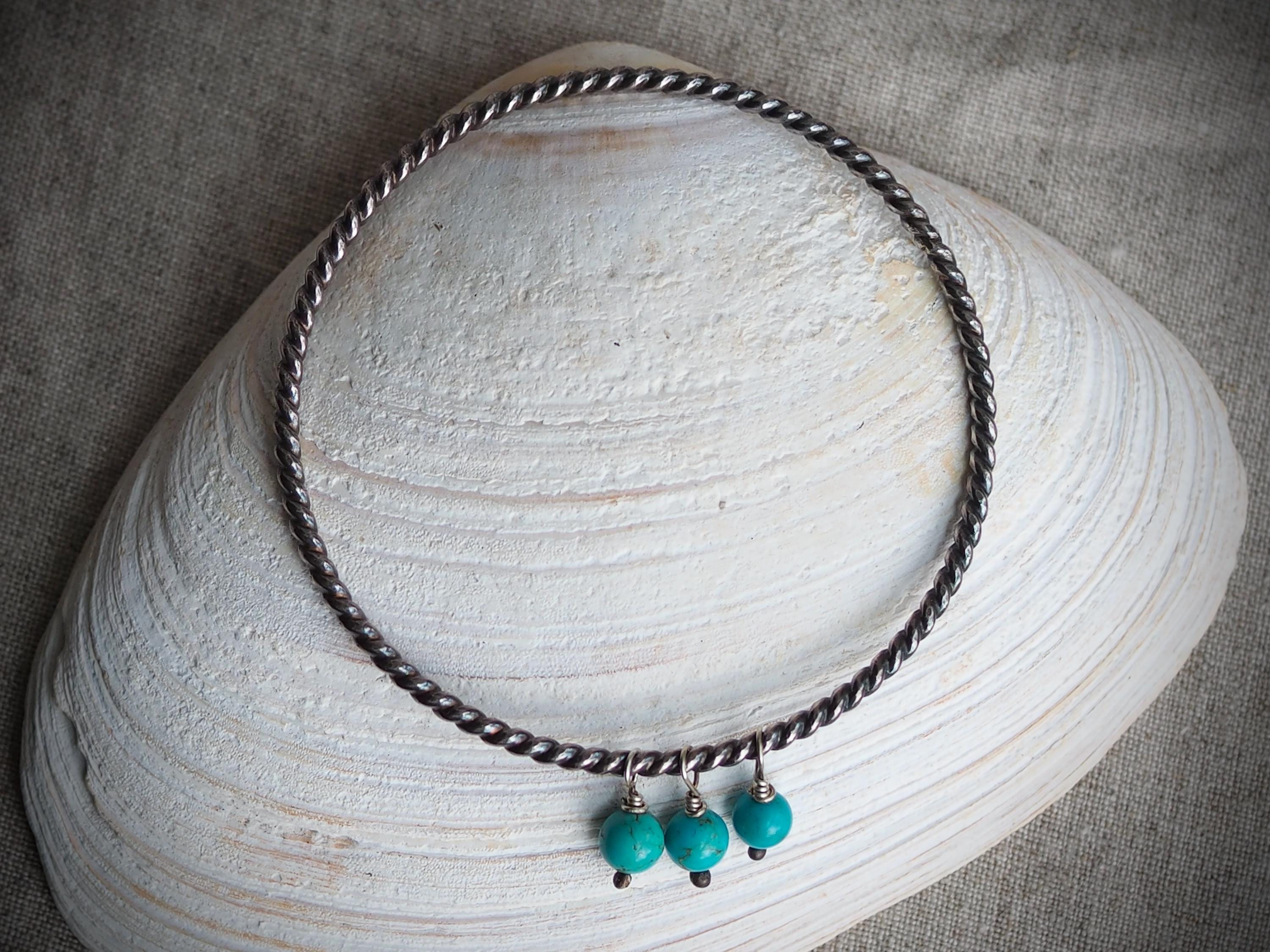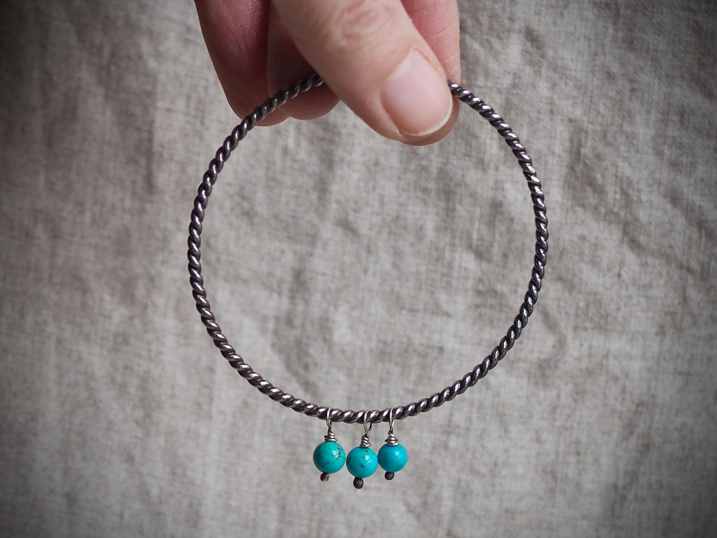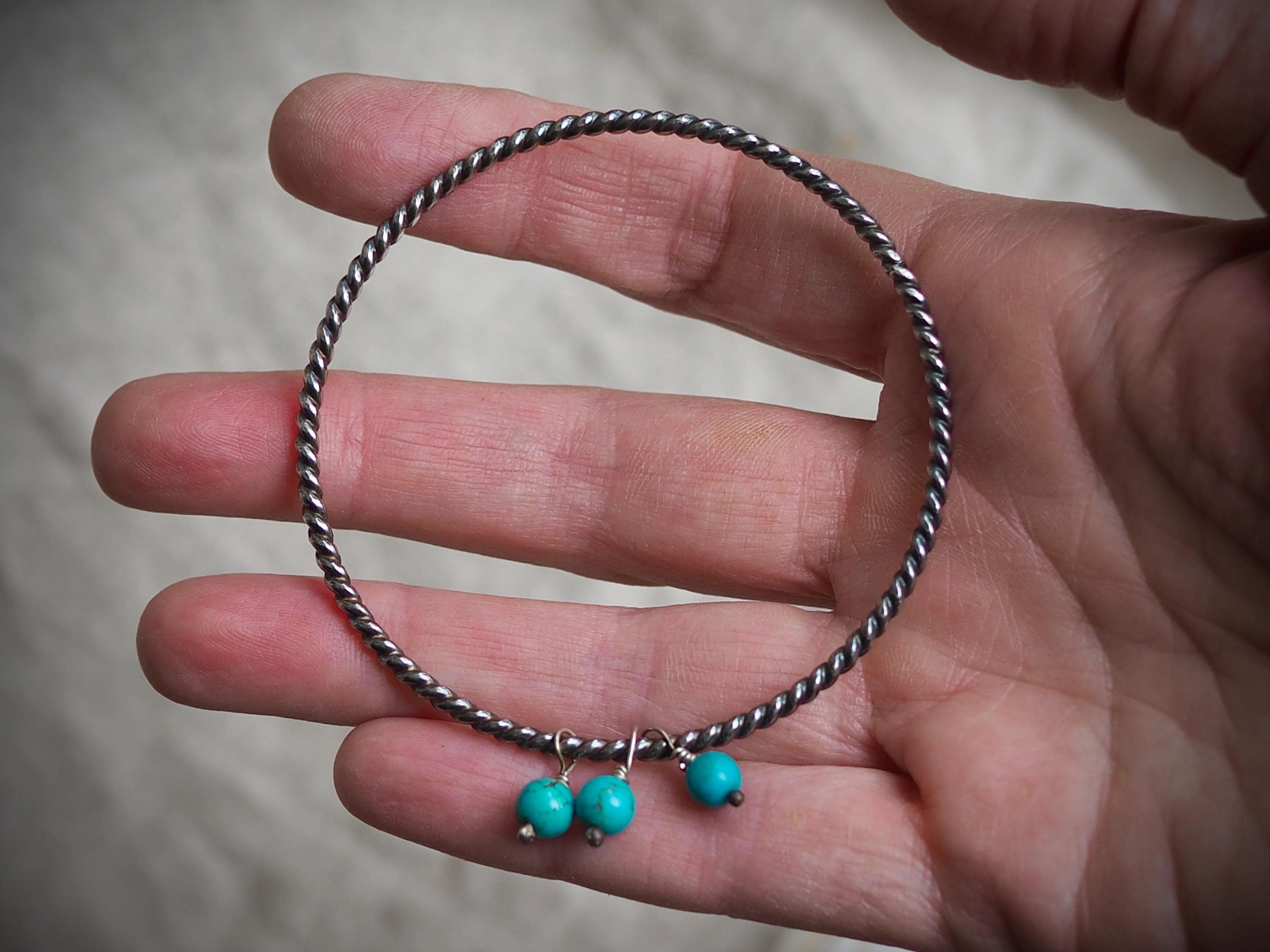 Hand forged twisted rope sterling silver bangle has dark patina and some bright silver highlights. It is adorned with three cheerful blue turquoise beads on handmade sterling silver headpins. This bangle is lovely worn alone, or added to a layered bracelet collection.