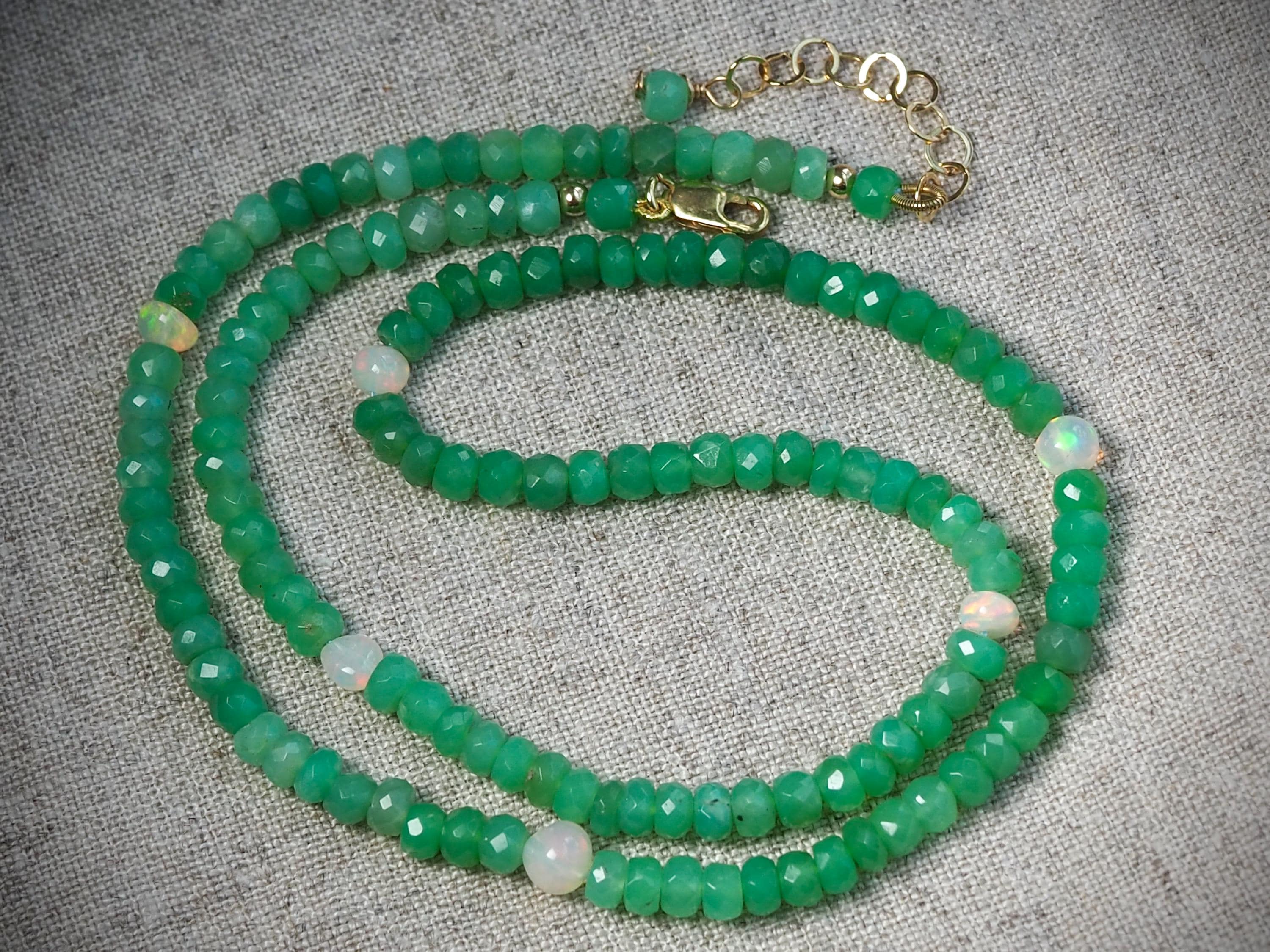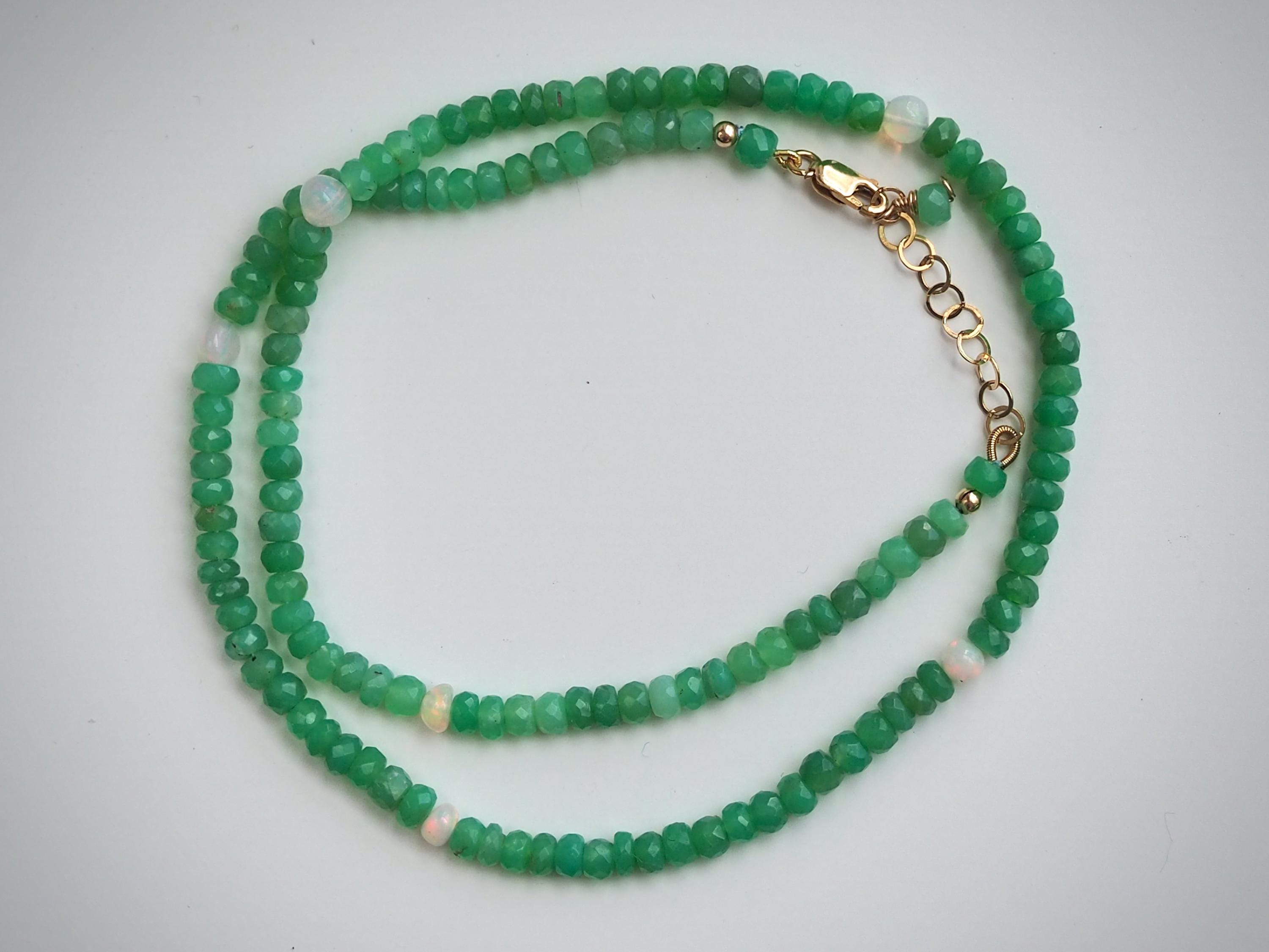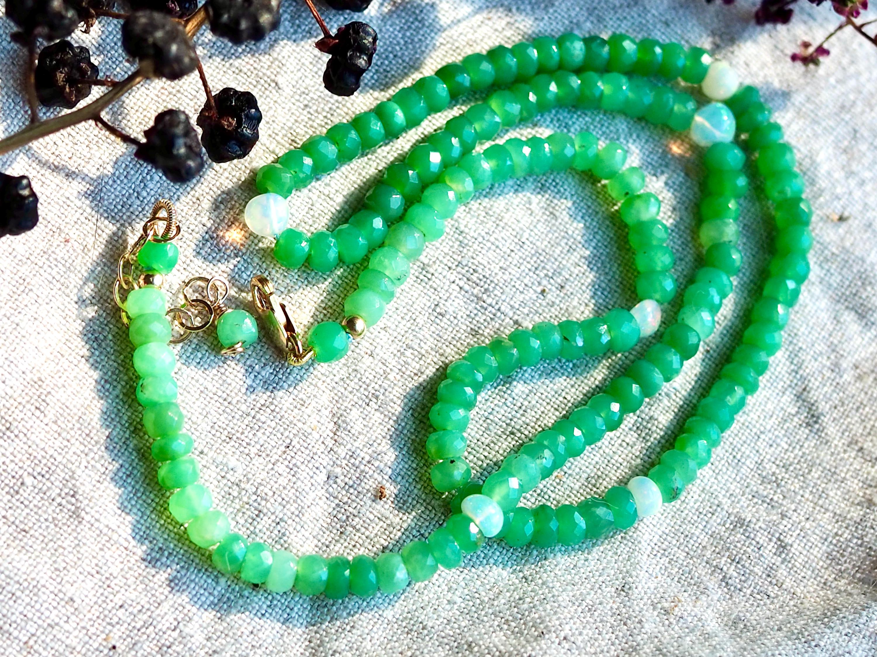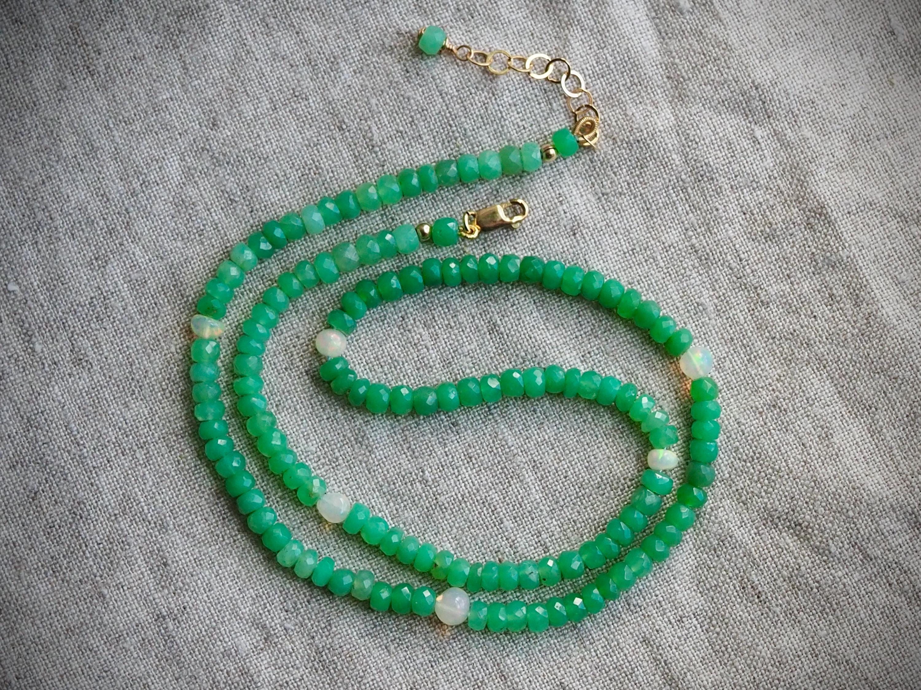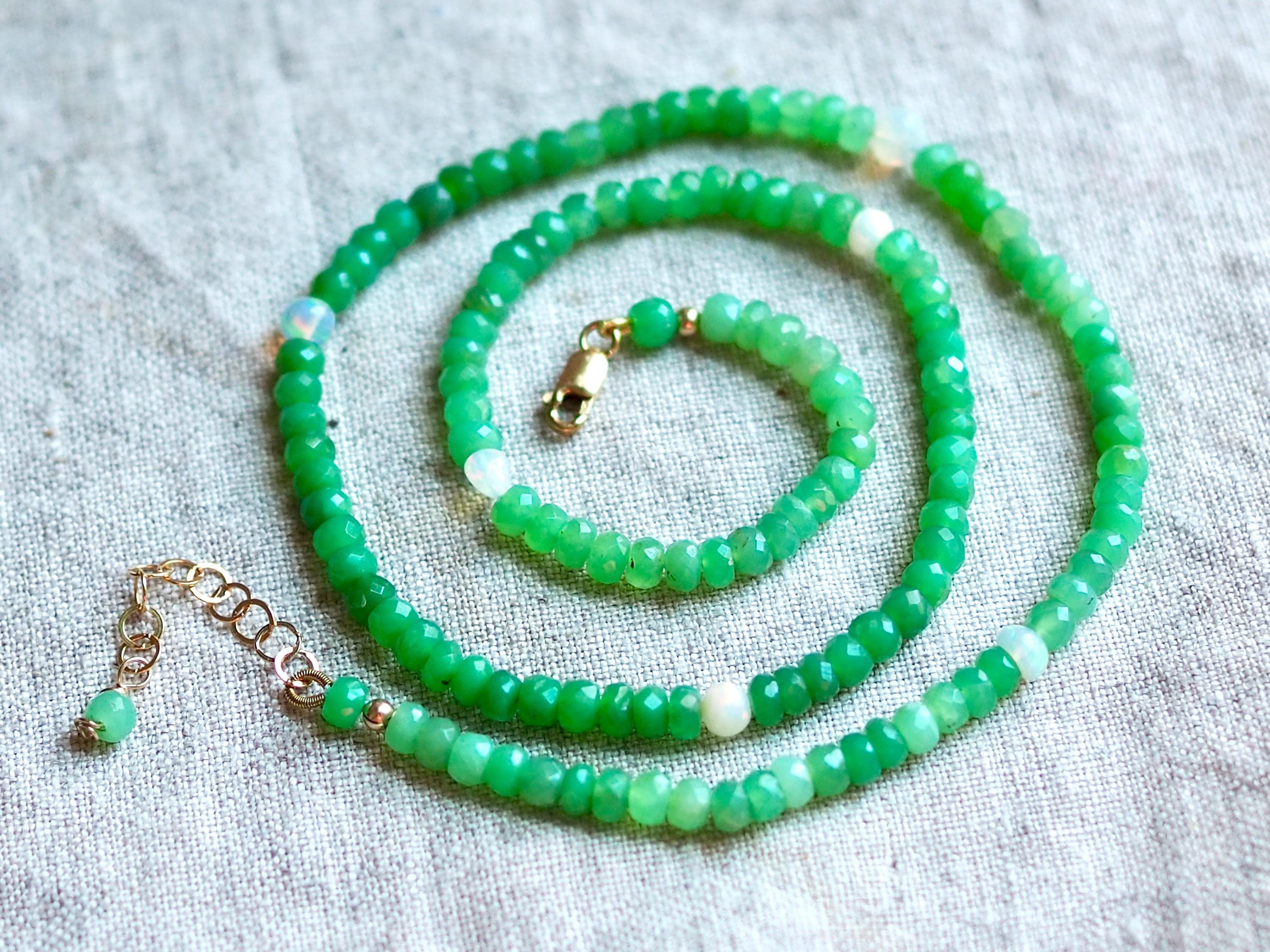This cheerful green chrysoprase and Ethiopian opal necklace is a lovely, vibrant pop of color. Faceted 4mm chrysoprase rondelles are paired with organic, rounded Ethiopian opal beads, reminiscent of tiny flowers on a green vine. This necklace is hand strung on durable silk and finished with a gold-filled lobster clasp and a gold-filled extender chain with a chrysoprase dangle. It has an adjustable length of 16.75-17.75 inches. Perfect for layering or wearing solo.