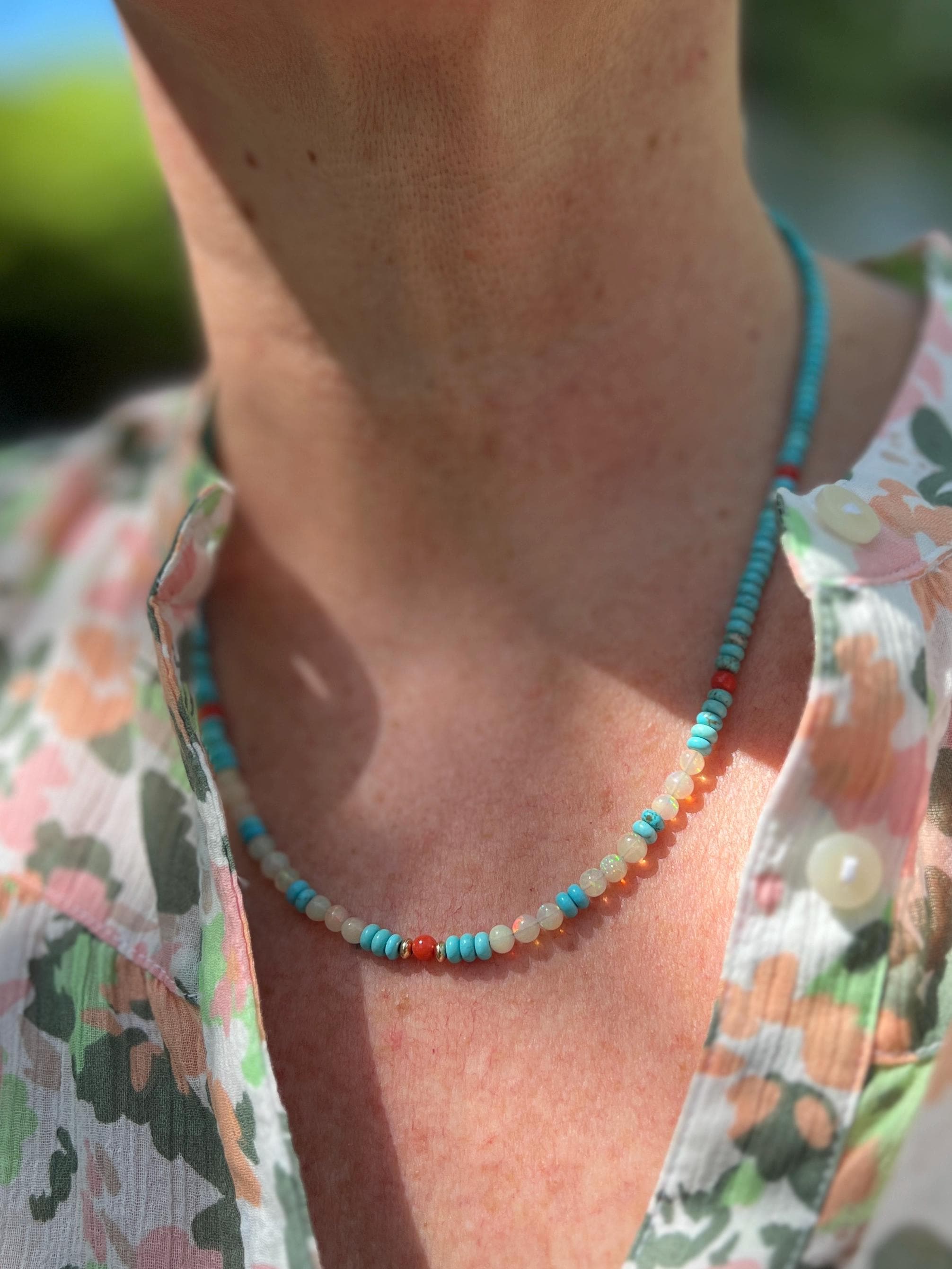 Bright blue Kingman turquoise, fiery Ethiopian opal & tomato red Sardinian coral beads are hand-strung on durable beading wire with solid 14k gold accents. All stones are natural and undyed.The vibrant hues of the stones create a lovely pop of color, contrasting nicely with the warmth of solid 14k gold beads and handmade hook clasp.