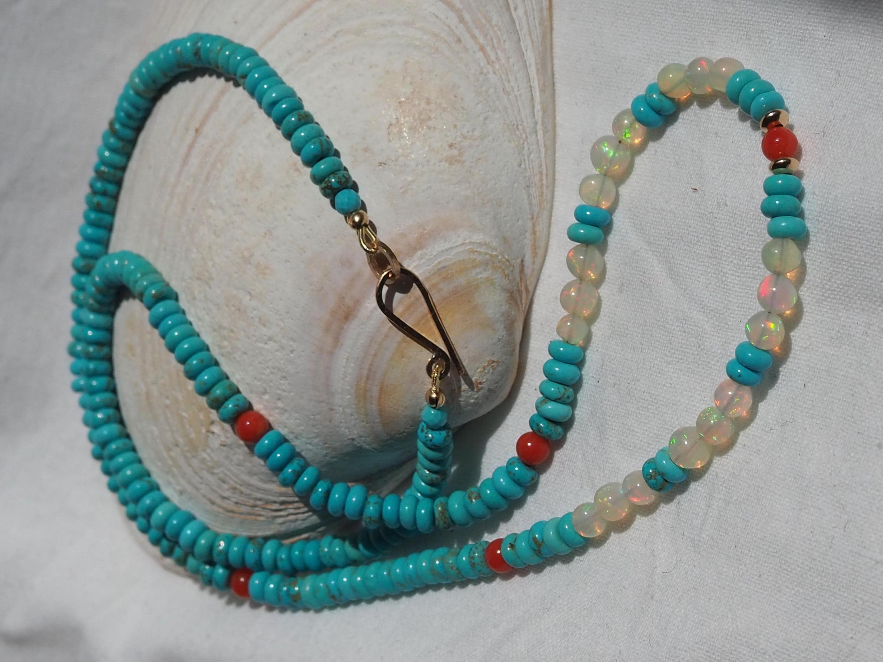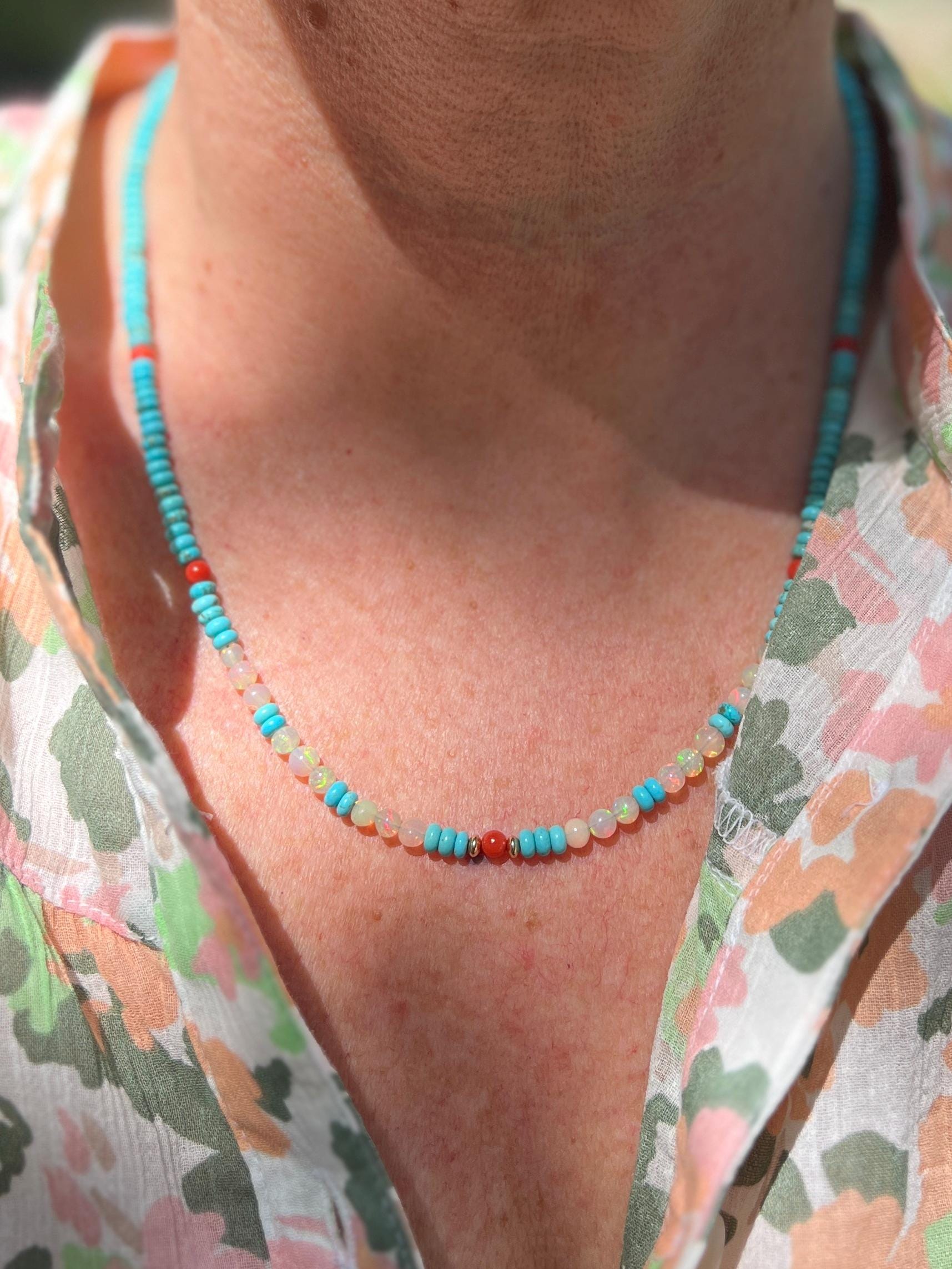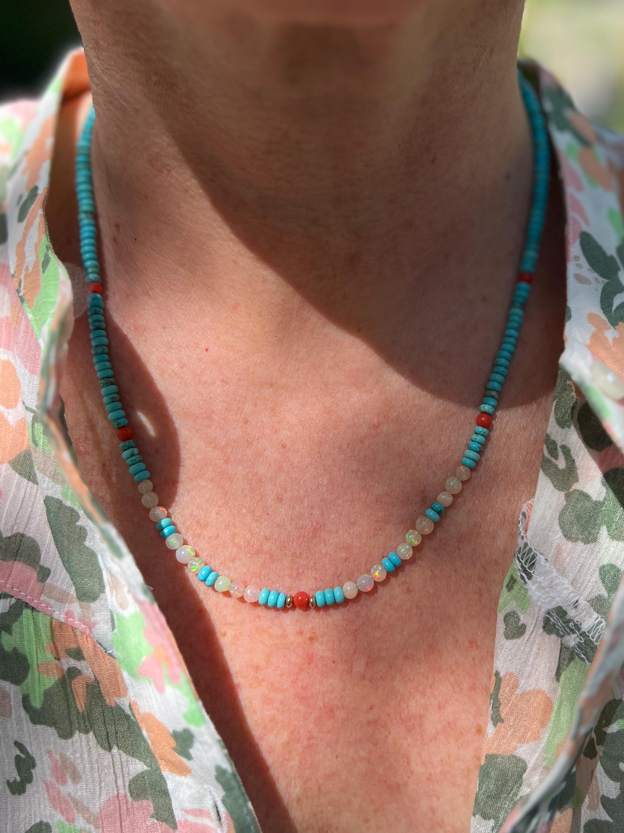 Stones: 5mm natural Kingman turquoise rondelles (Arizona-mined, blue with golden-brown matrix), 4mm tomato-red Sardinian coral beads (natural, undyed), 3.5-4.5mm Ethiopian opals with rainbow flashes