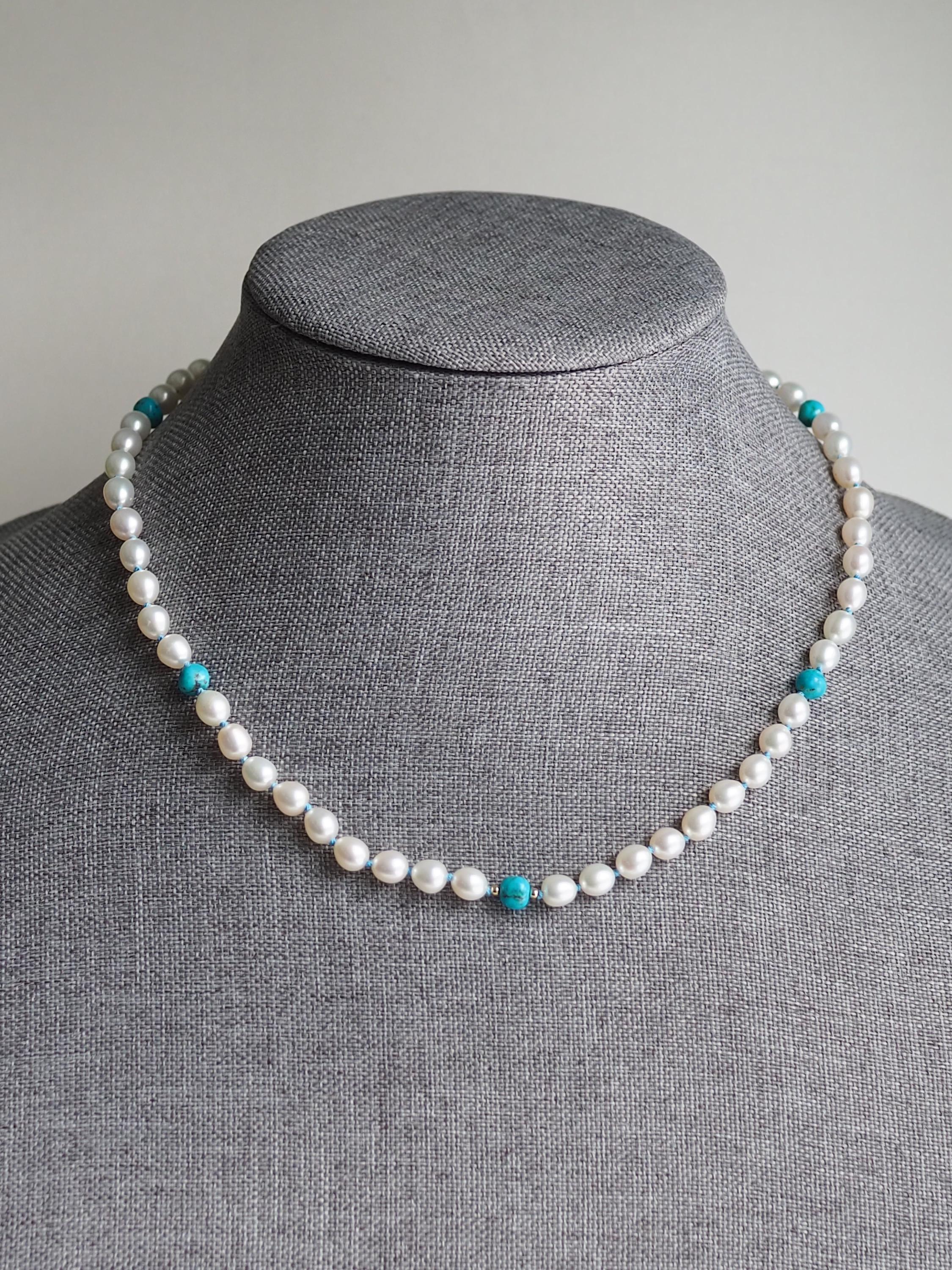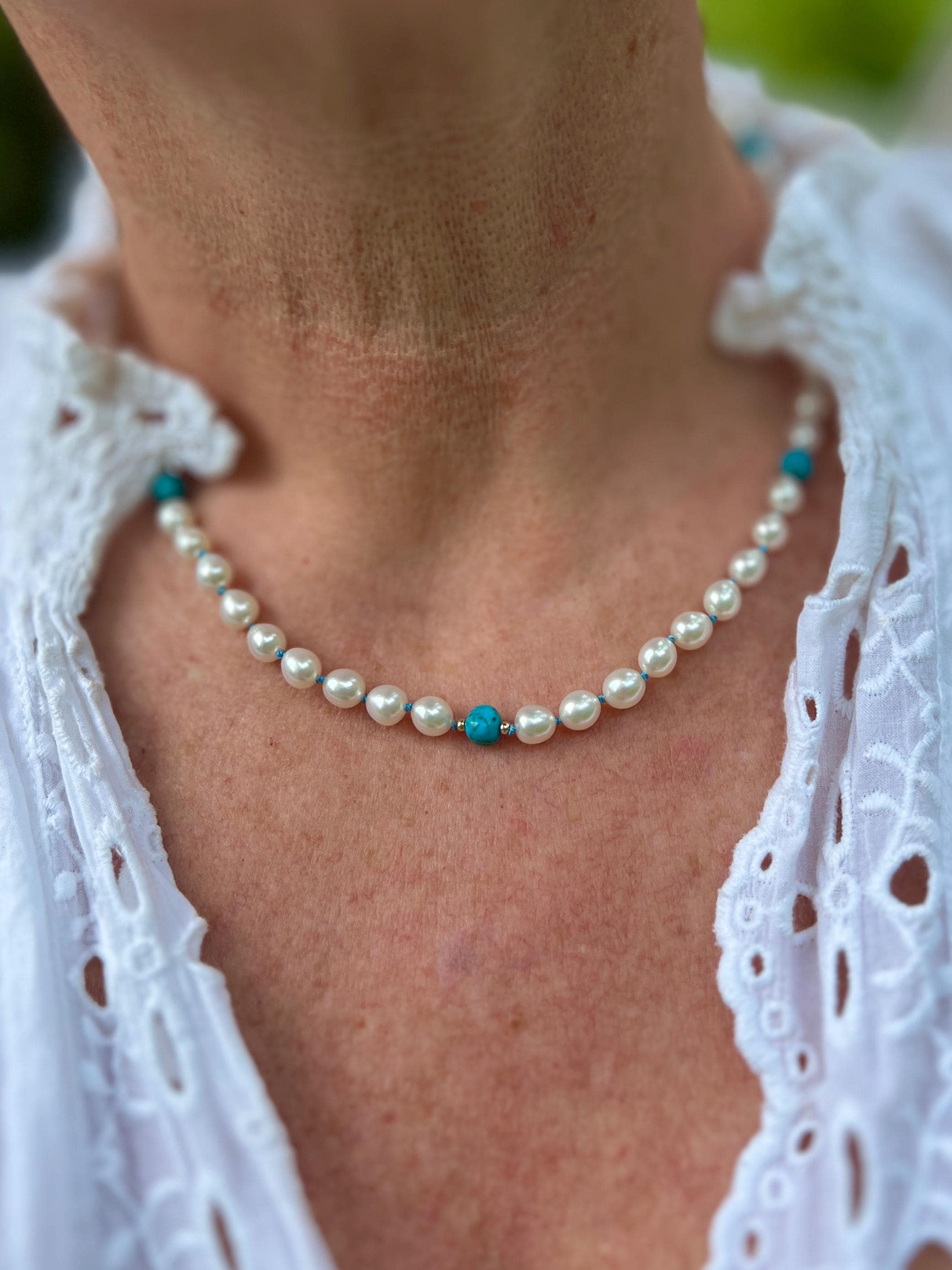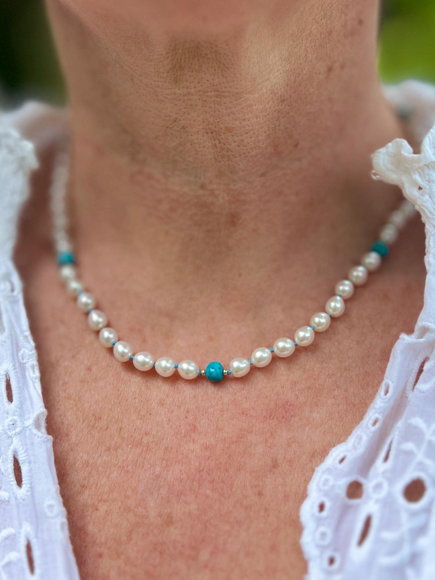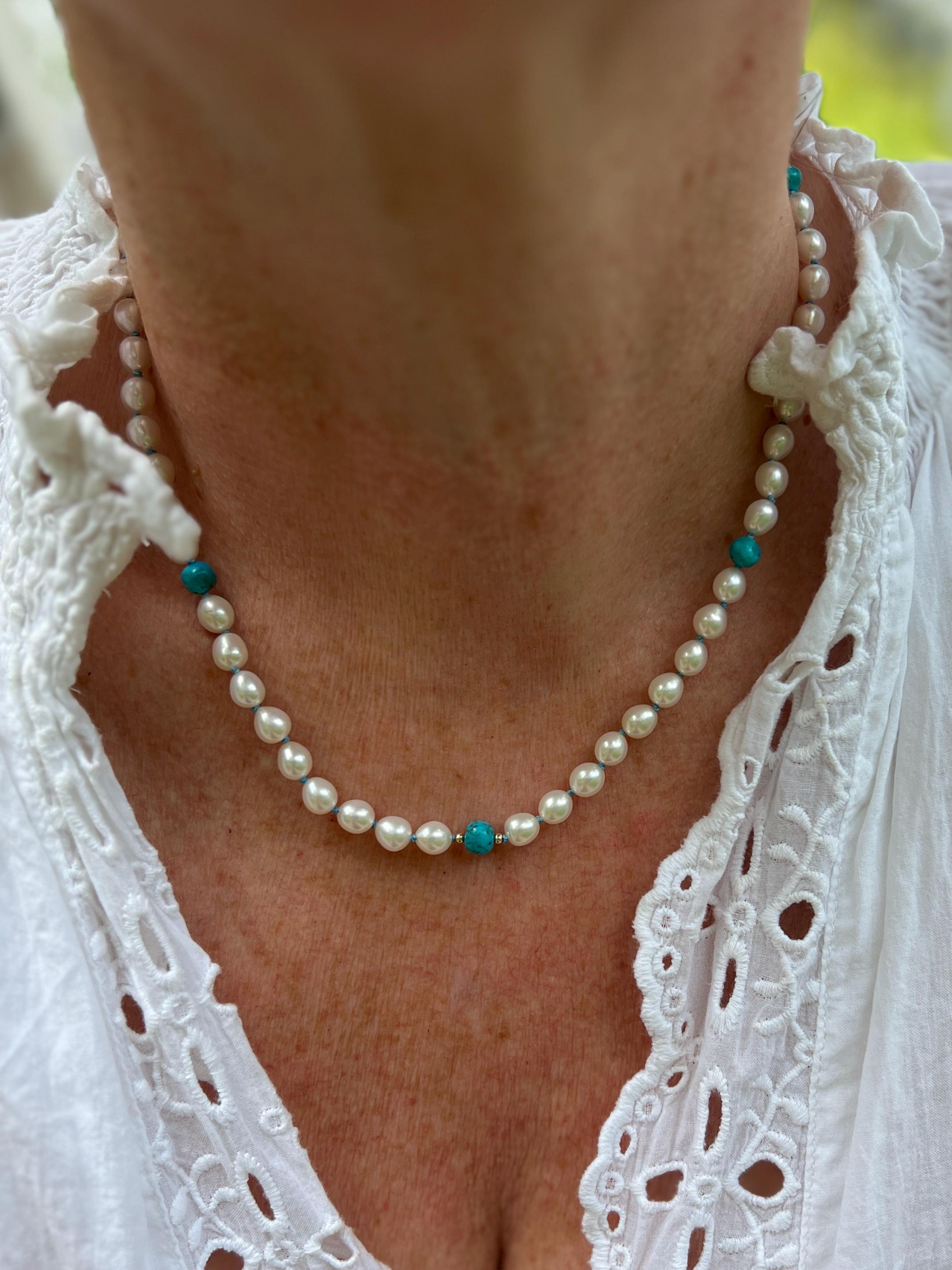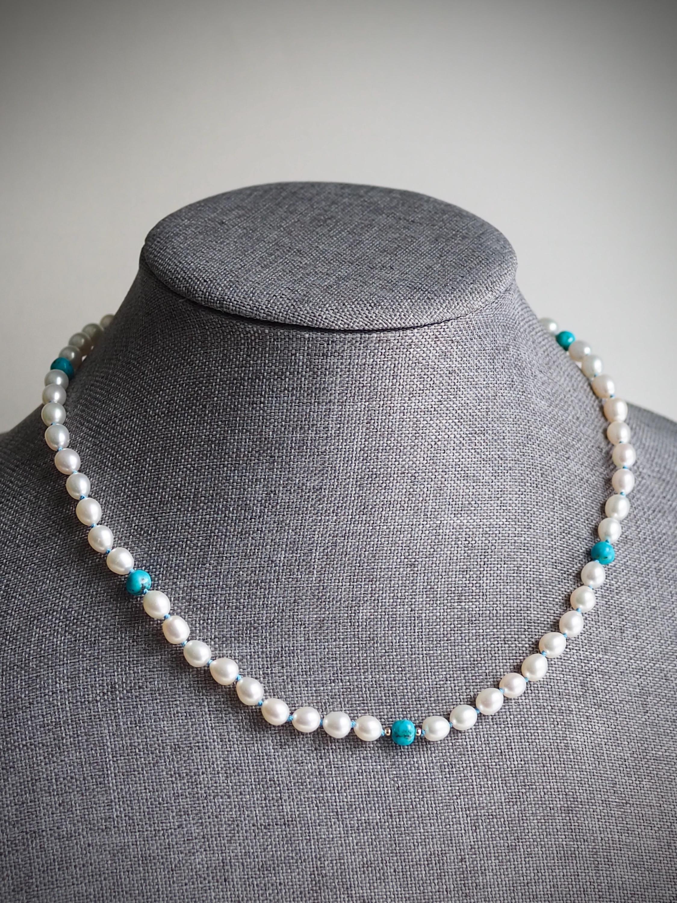 Luminous white pearls are hand-knotted with custom dyed royal blue silk, and paired with five beautiful blue Kingman turquoise beads. The center turquoise has petite 14k gold beads on either side. The white pearls have a lovely luminescence and off-round oval shape. This classy piece is beautiful to wear alone or layered. The pearls are 6-7mm, the rounded turquoise beads are approximately 6mm, the necklace is 18 inches long with a solid 14k gold classic pearl safety clasp.