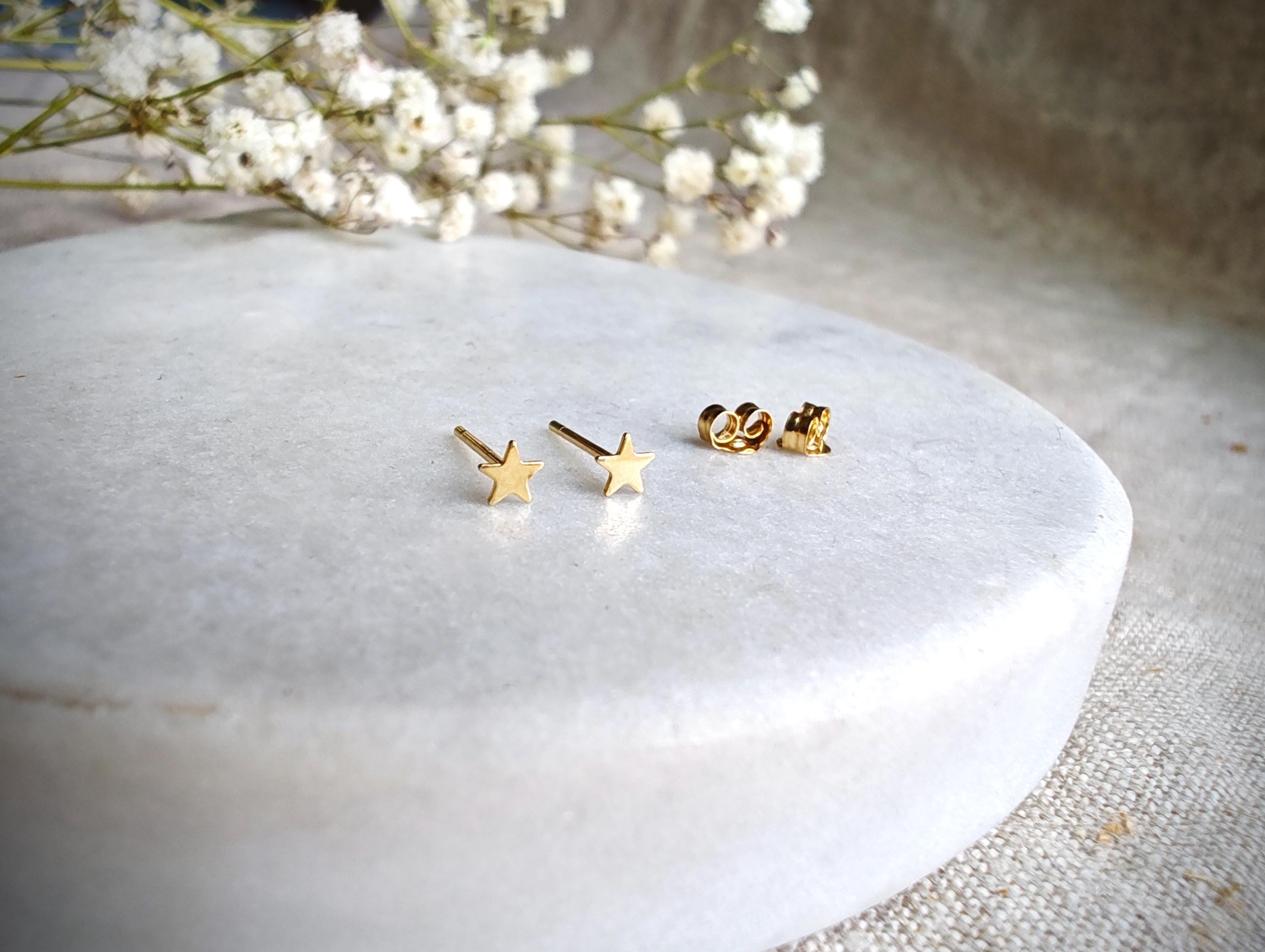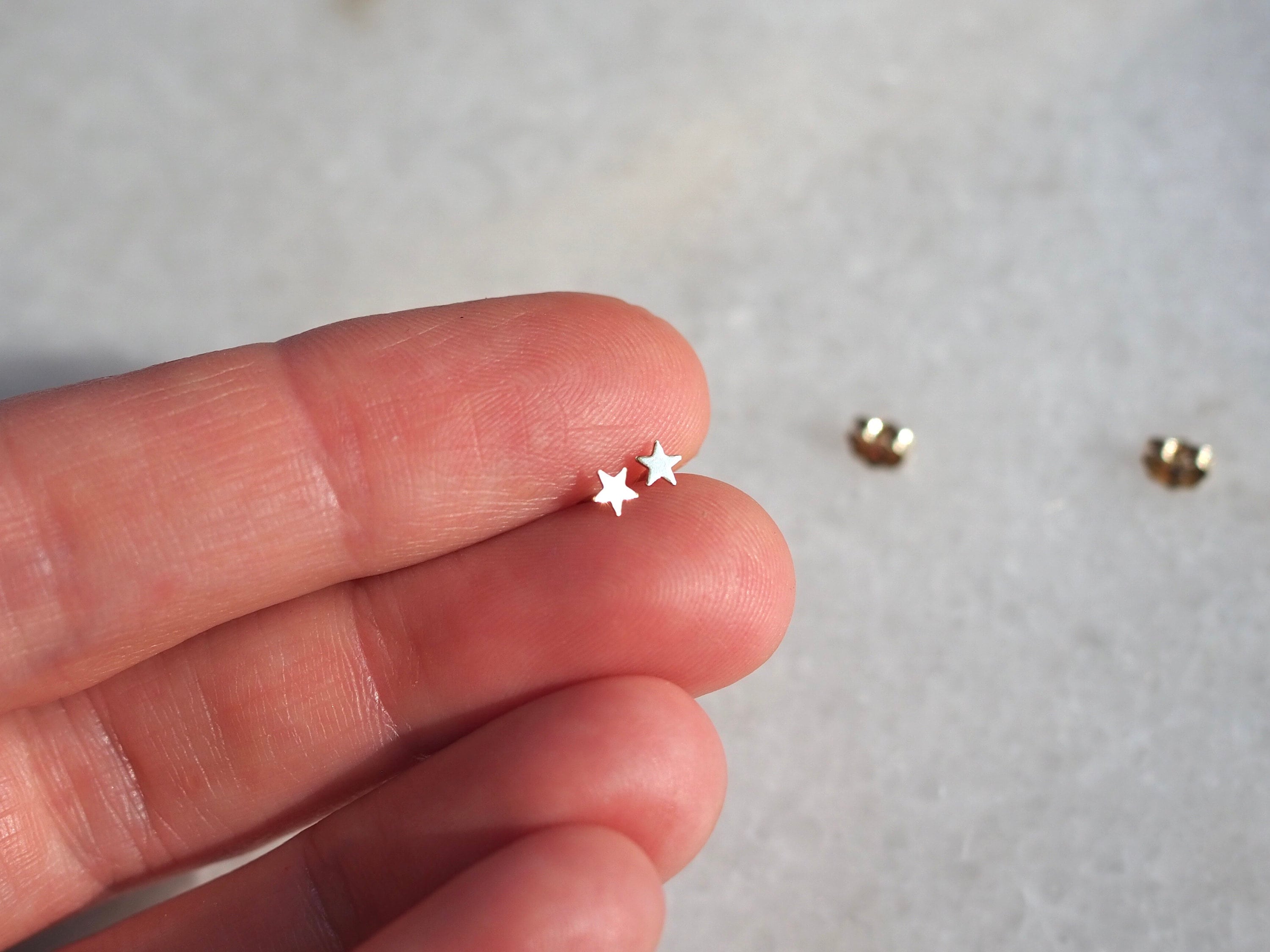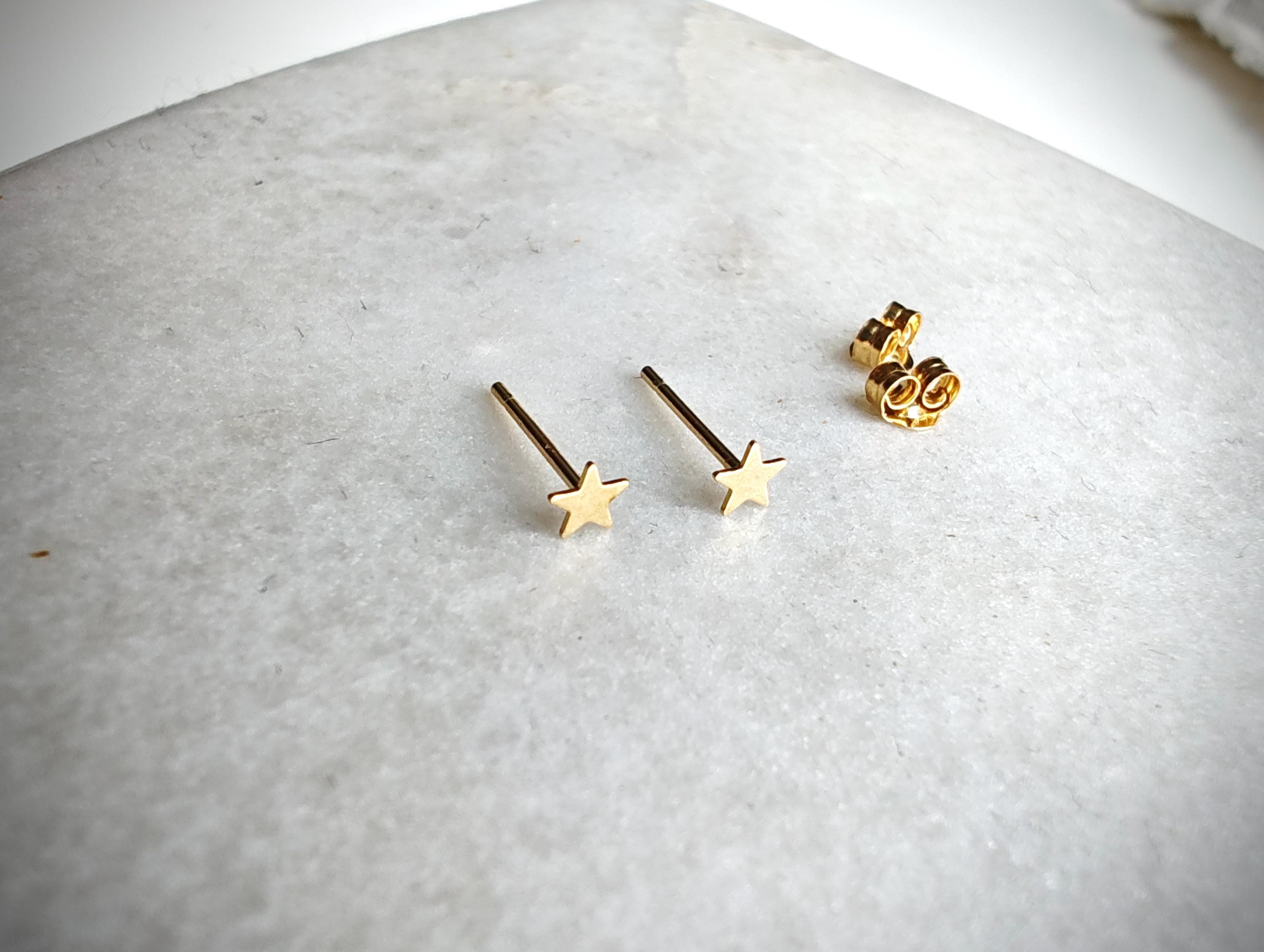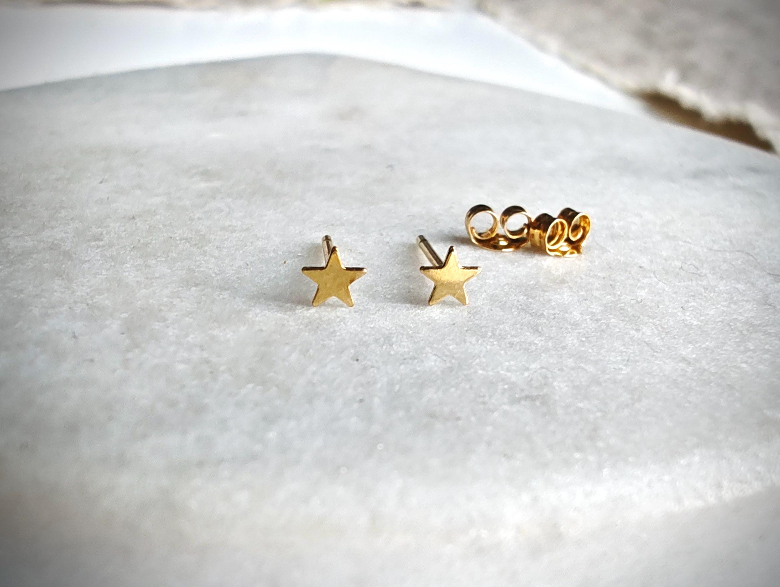 Teeny tiny solid 14k gold stars for the ears, these celestial bodies glimmer in the light. They measure 3.5mm across and are available as a pair. Solid 14k gold push backs are included.