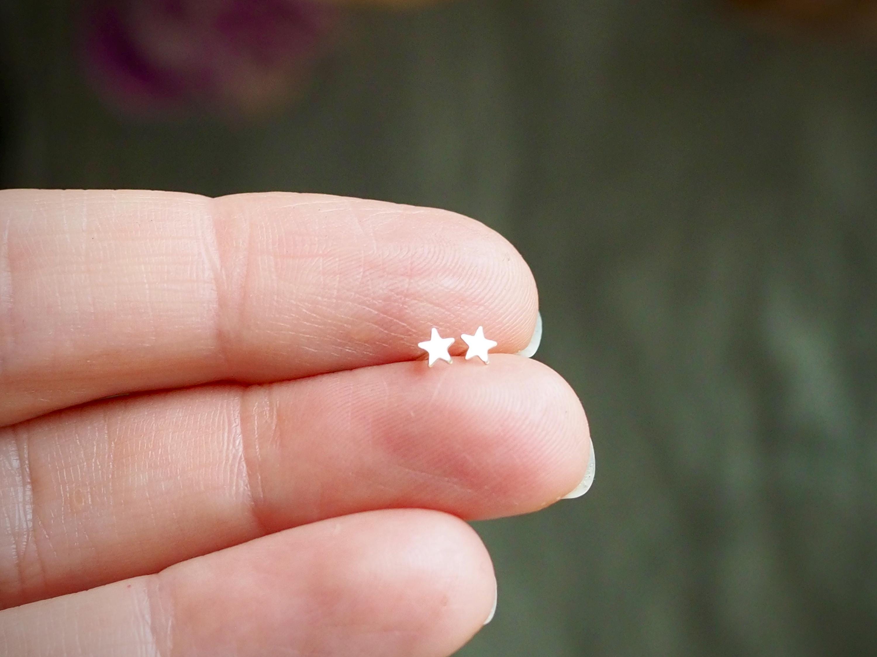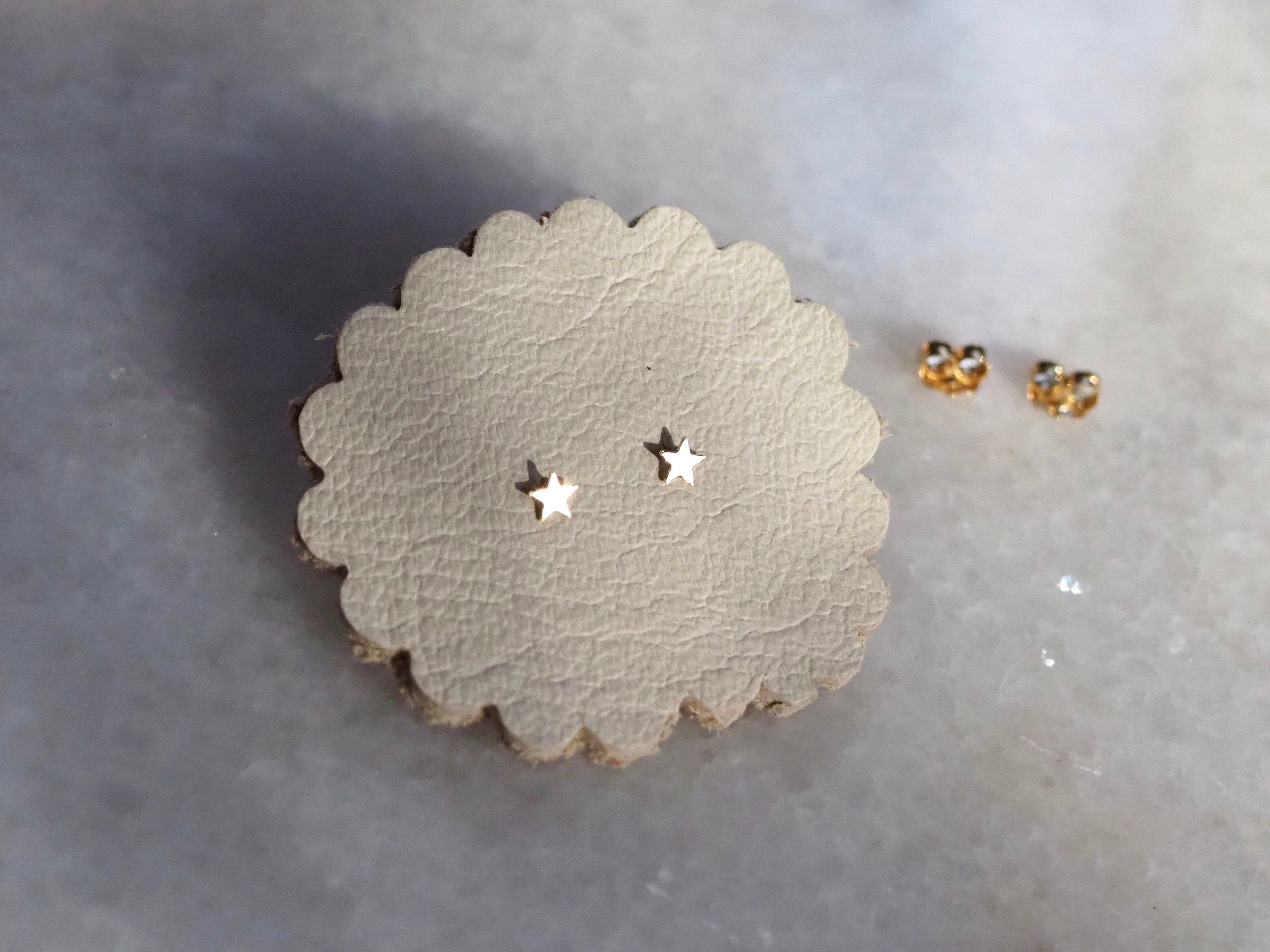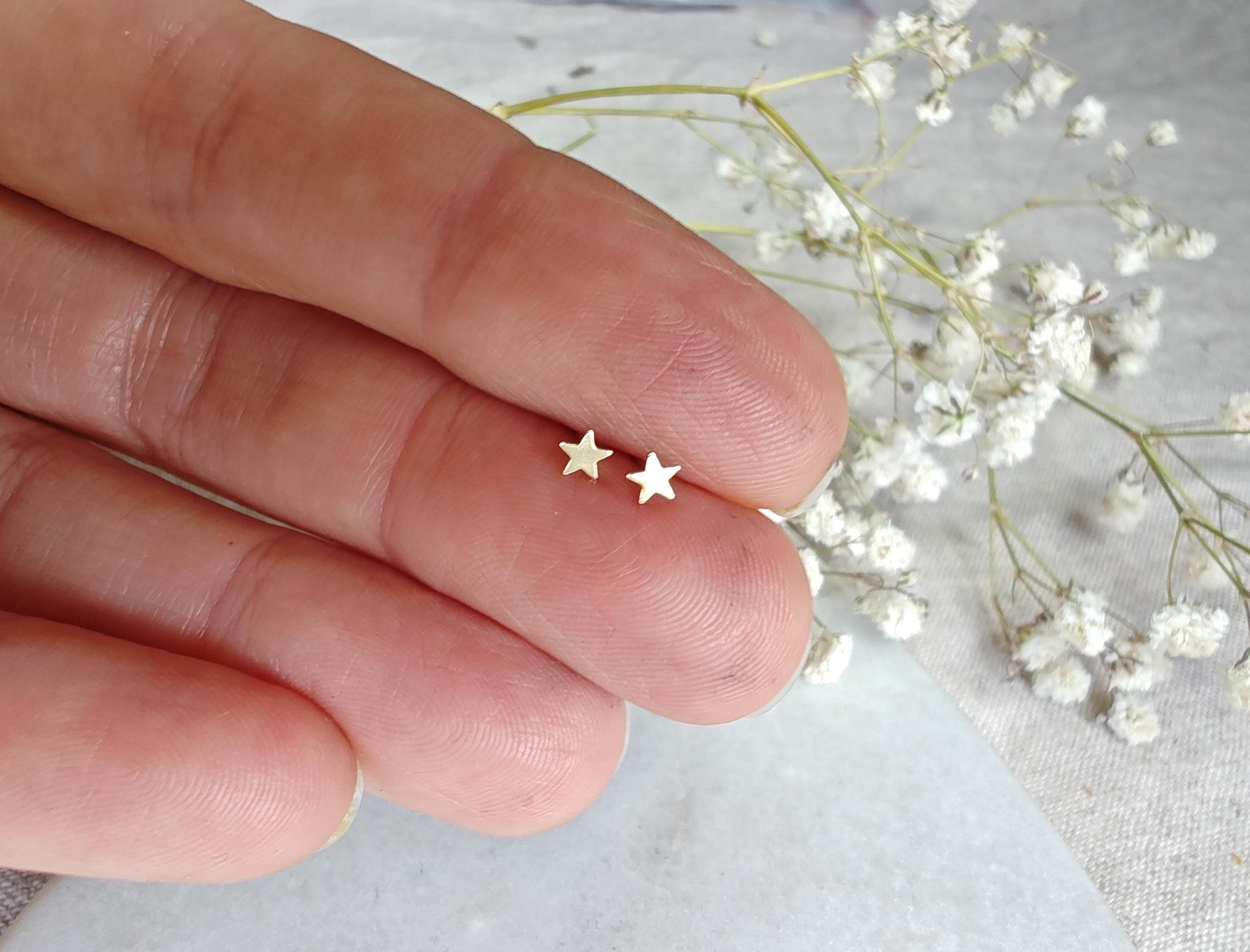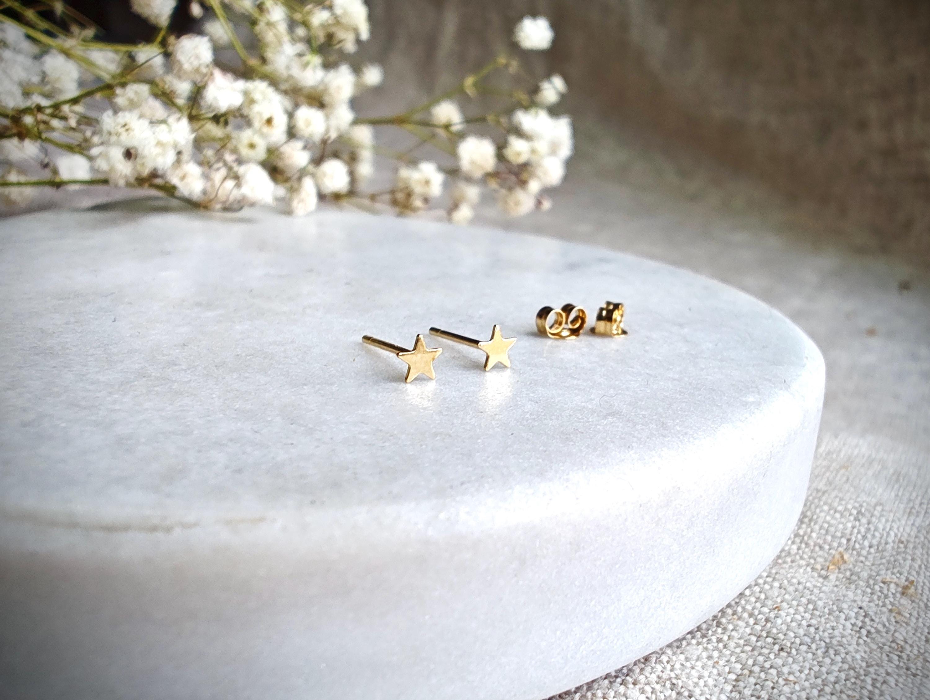 Teeny tiny solid 14k gold stars for the ears, these celestial bodies glimmer in the light. They measure 3.5mm across and are available as a pair. Solid 14k gold push backs are included.