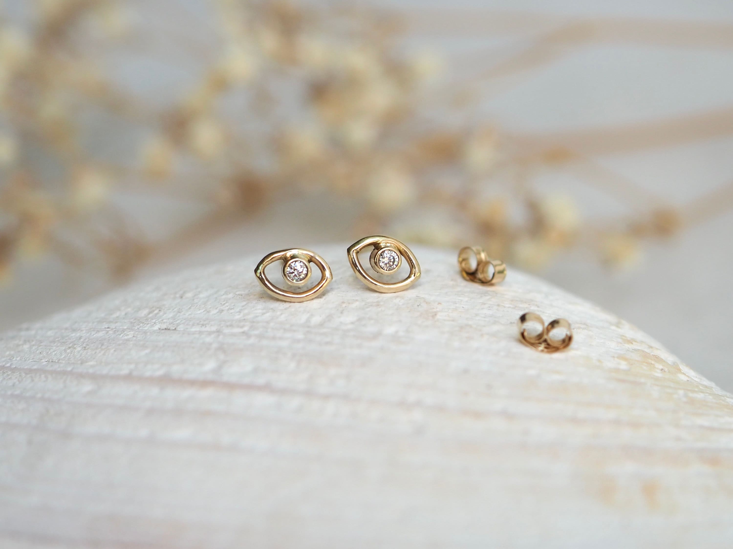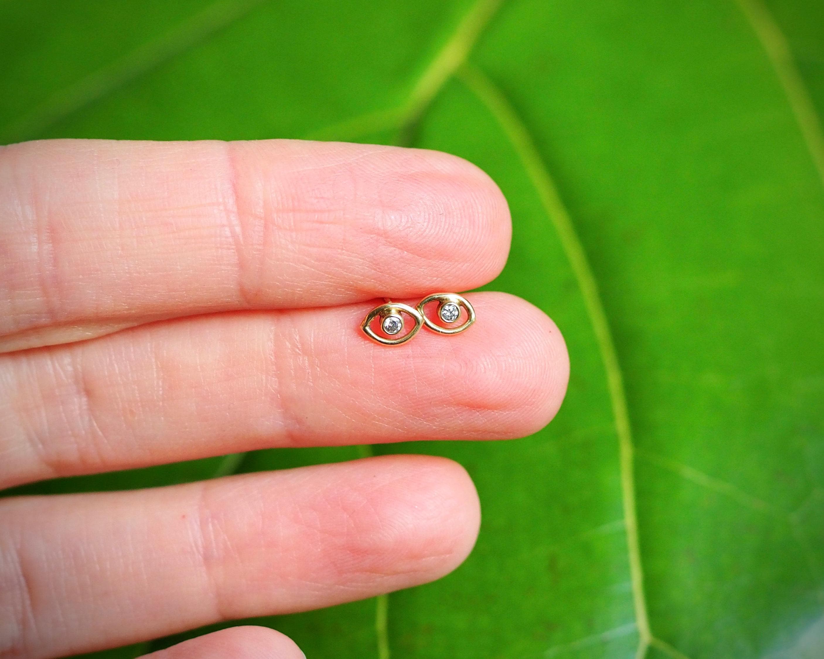 Tiny eyes are set with natural 1.75mm white diamonds. Each eye was made by hand out of recycled 14k gold.