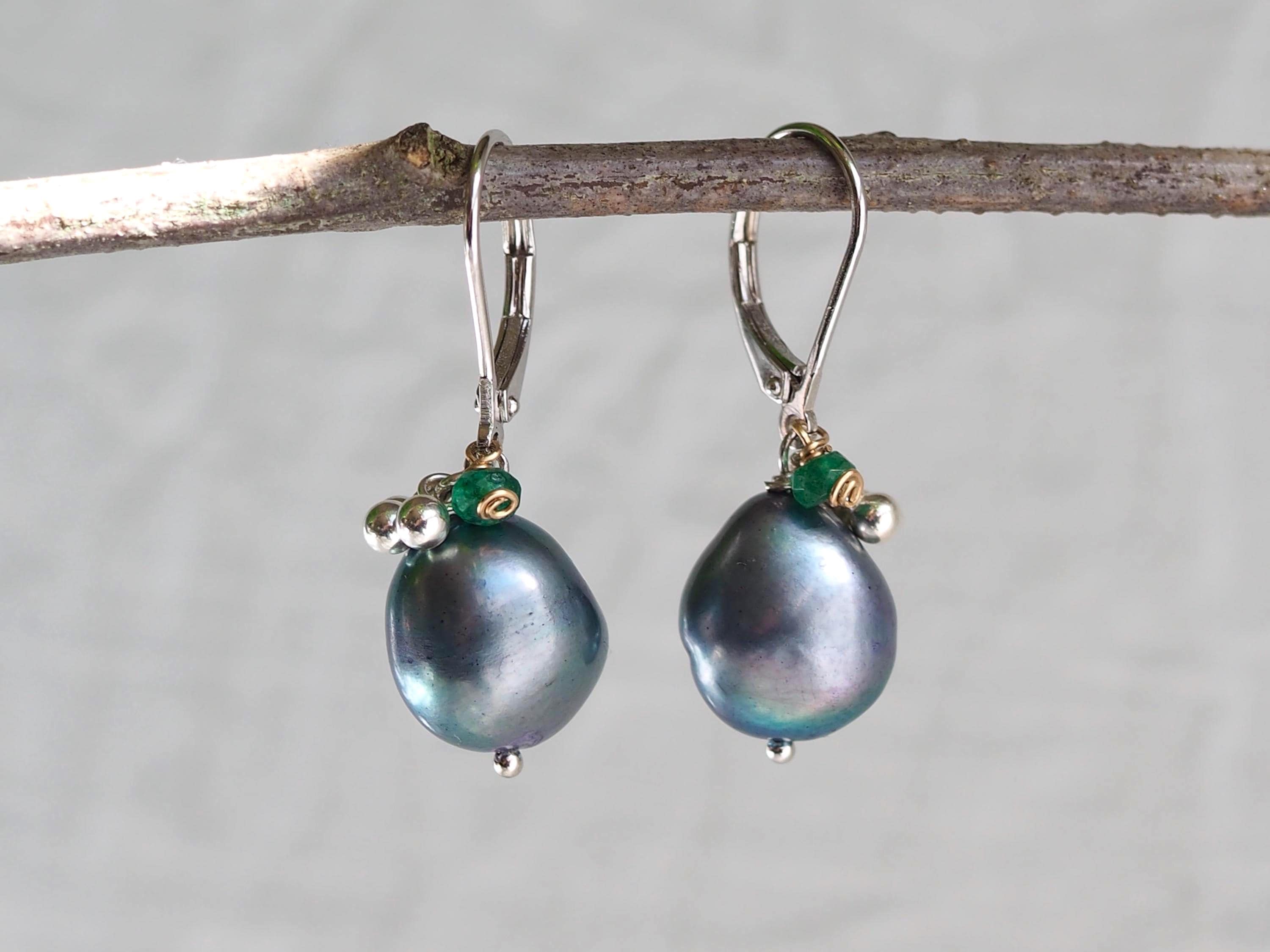 These earrings feature beautiful, organic freshwater peacock pearls and natural emeralds. The pearls have subtle hues of purple and blueish-green, and the bright green emerald beads are faceted, and wire-wrapped in 14k gold-filled wire. A cluster of three sterling silver balls adds a unique and playful touch to the design.