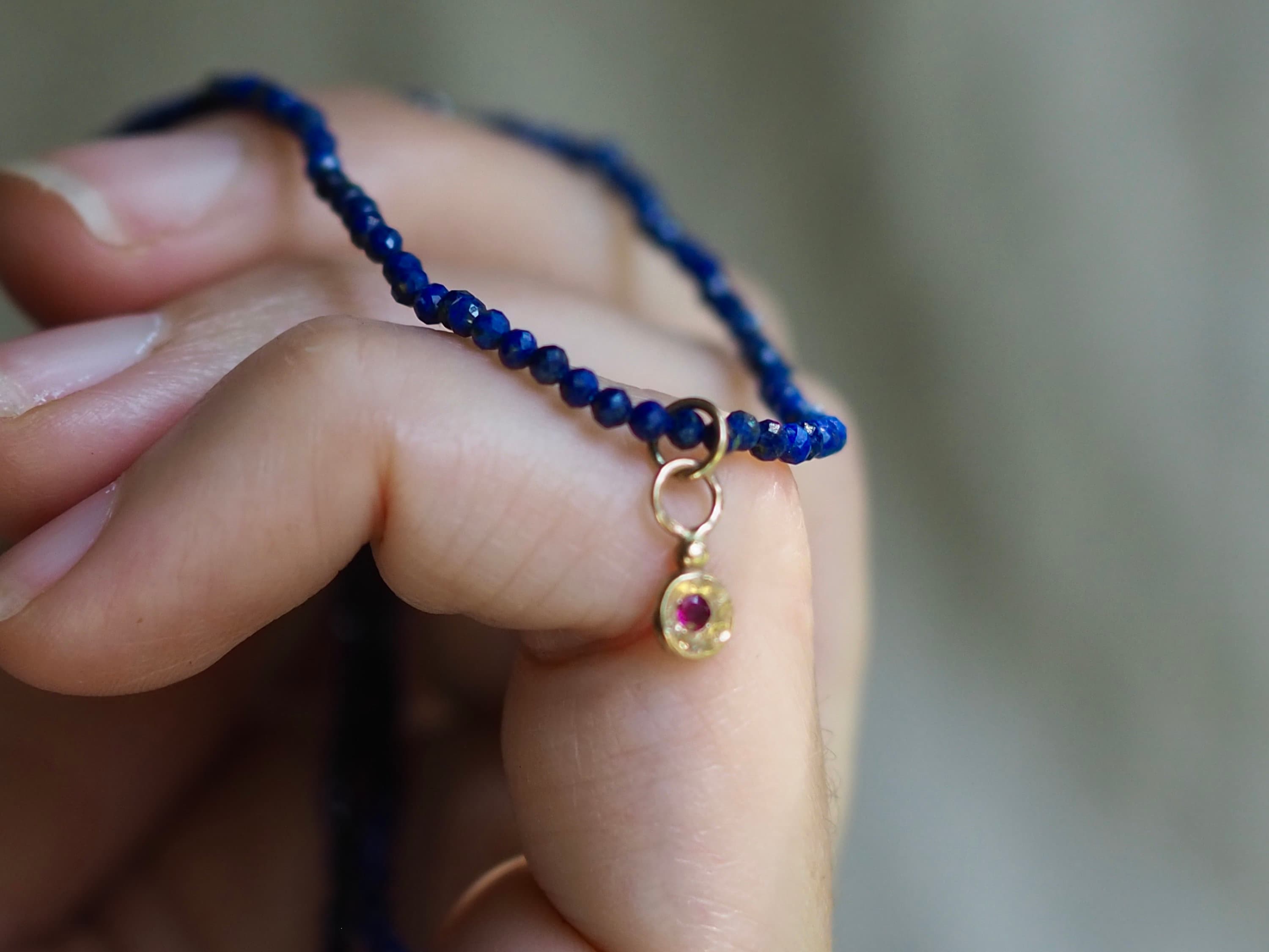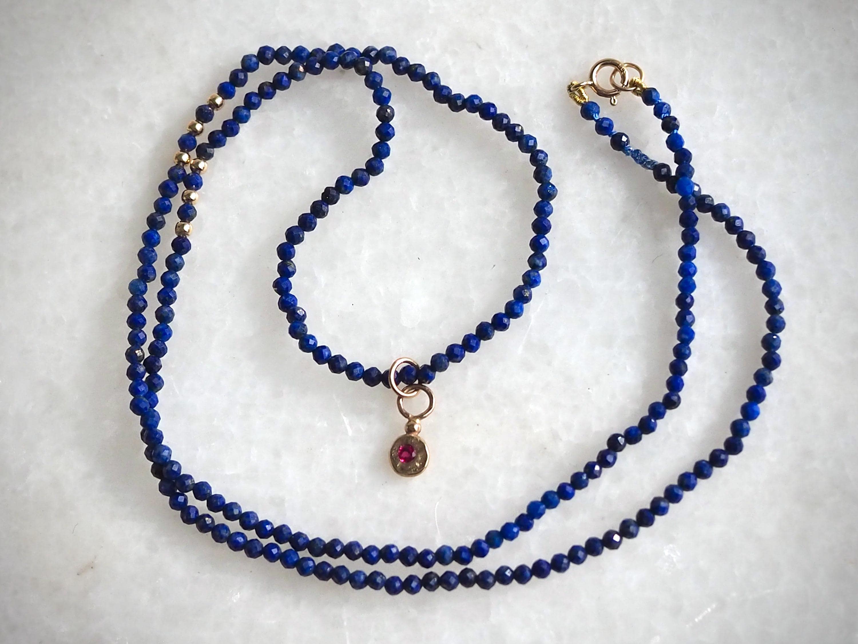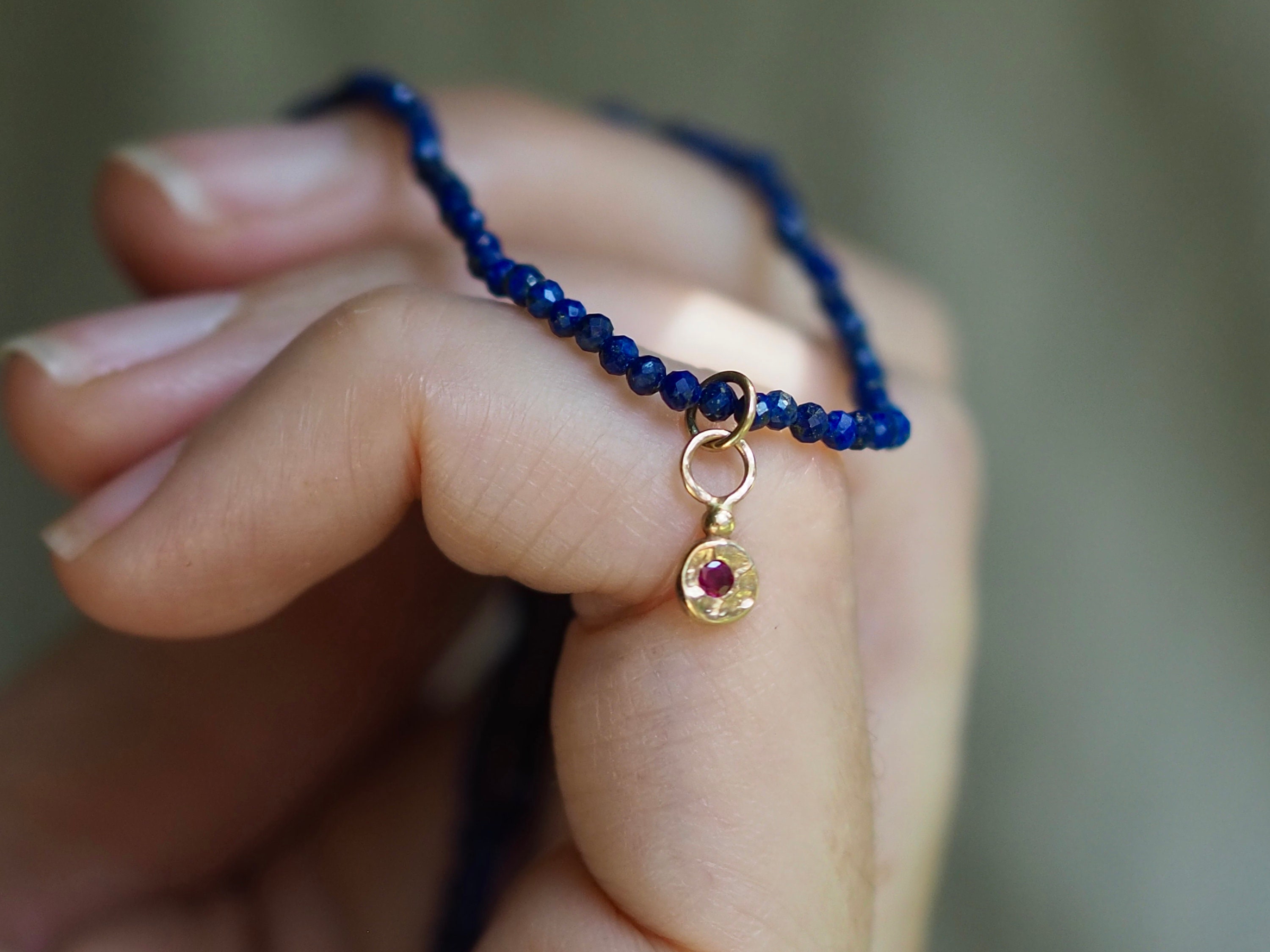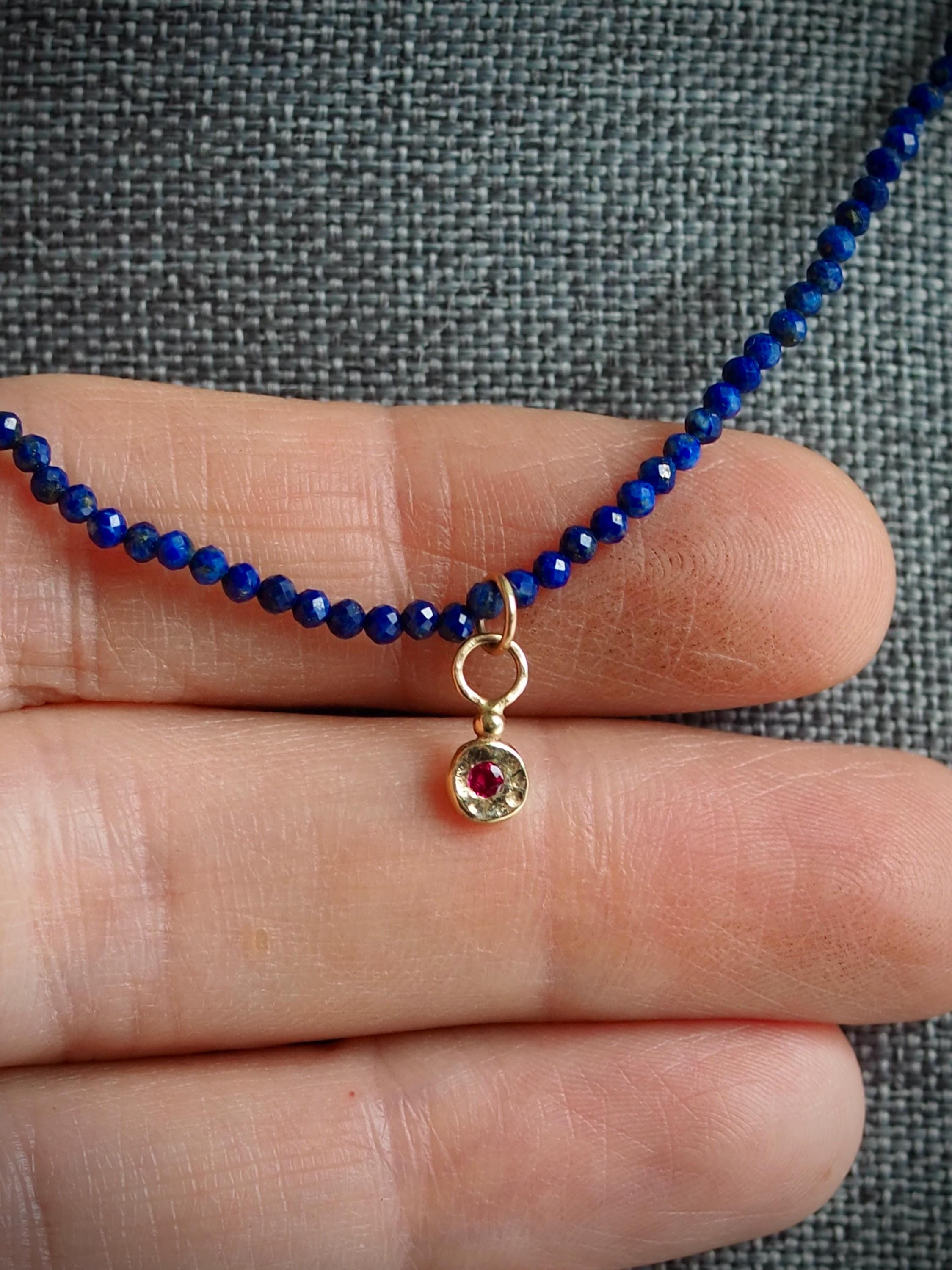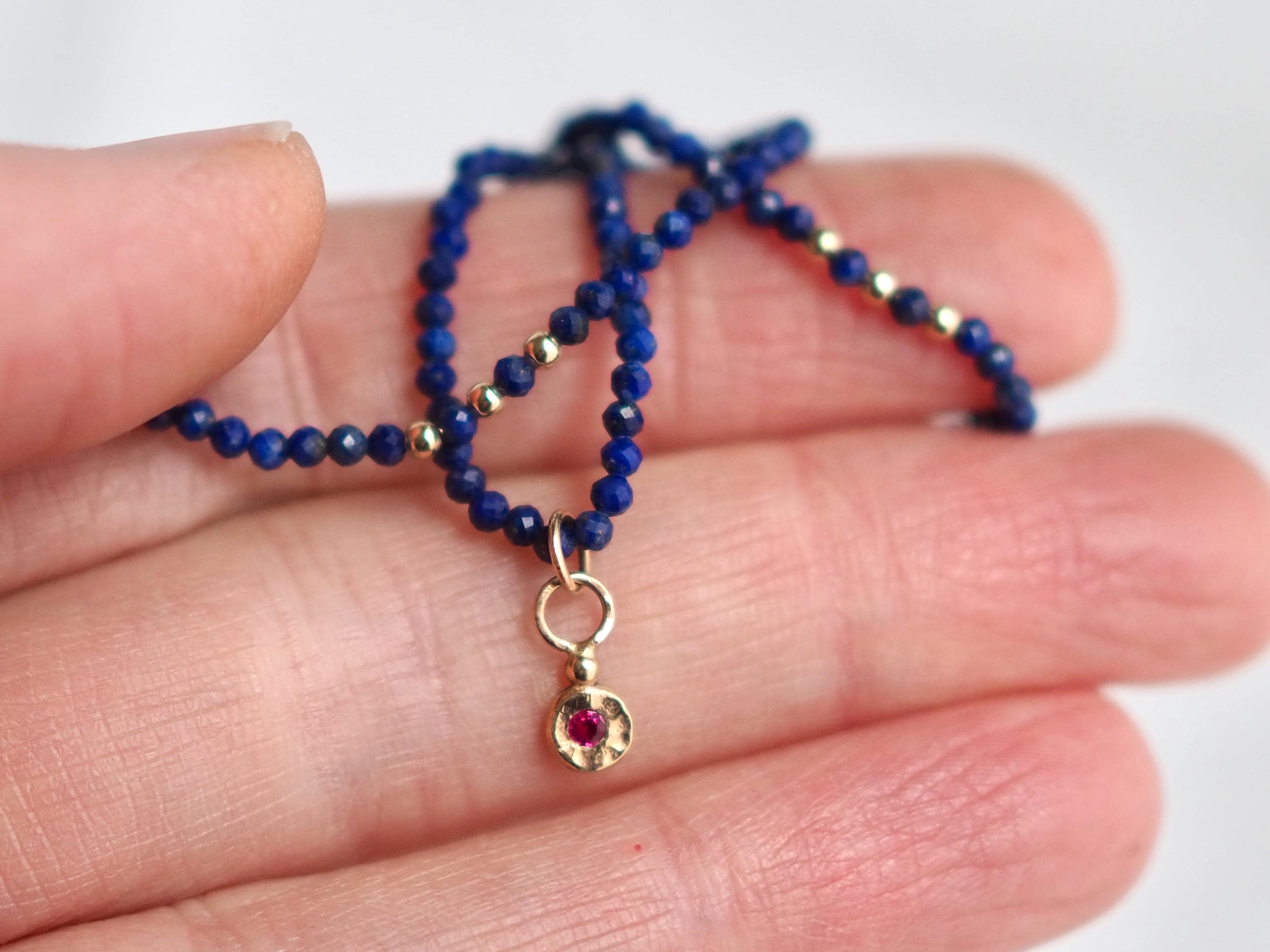 Darling, bright red ruby is nestled in a unique handmade 14k gold hand stamped flower pendant. The pendant hangs on a beautiful beaded necklace made with tiny, 2mm faceted lapis lazuli beads and solid 14k gold round beads. The faceted ruby is AAA quality and measures 2mm. The beaded necklace is hand strung on silk cord and finished with solid 14 gold spring ring clasp.