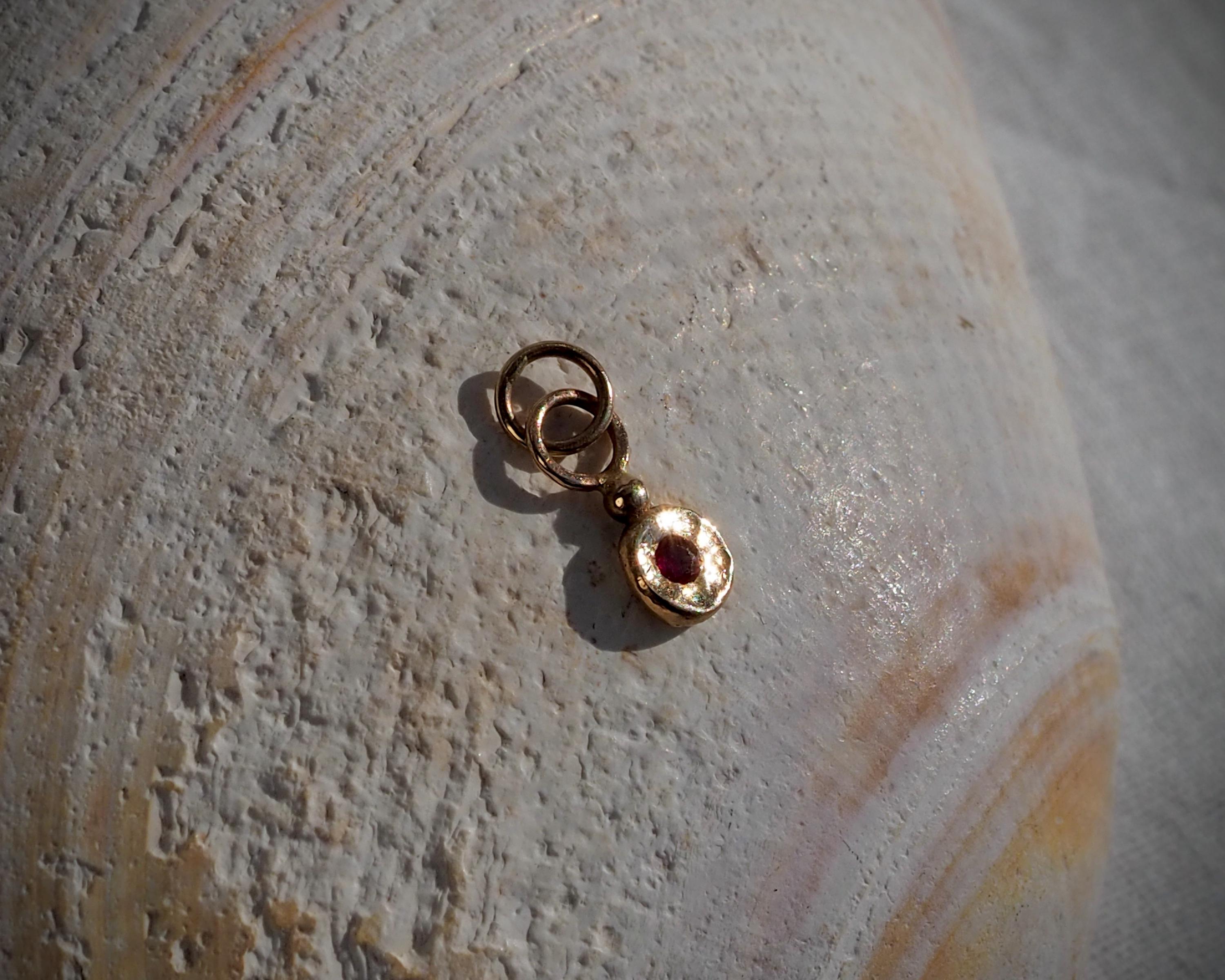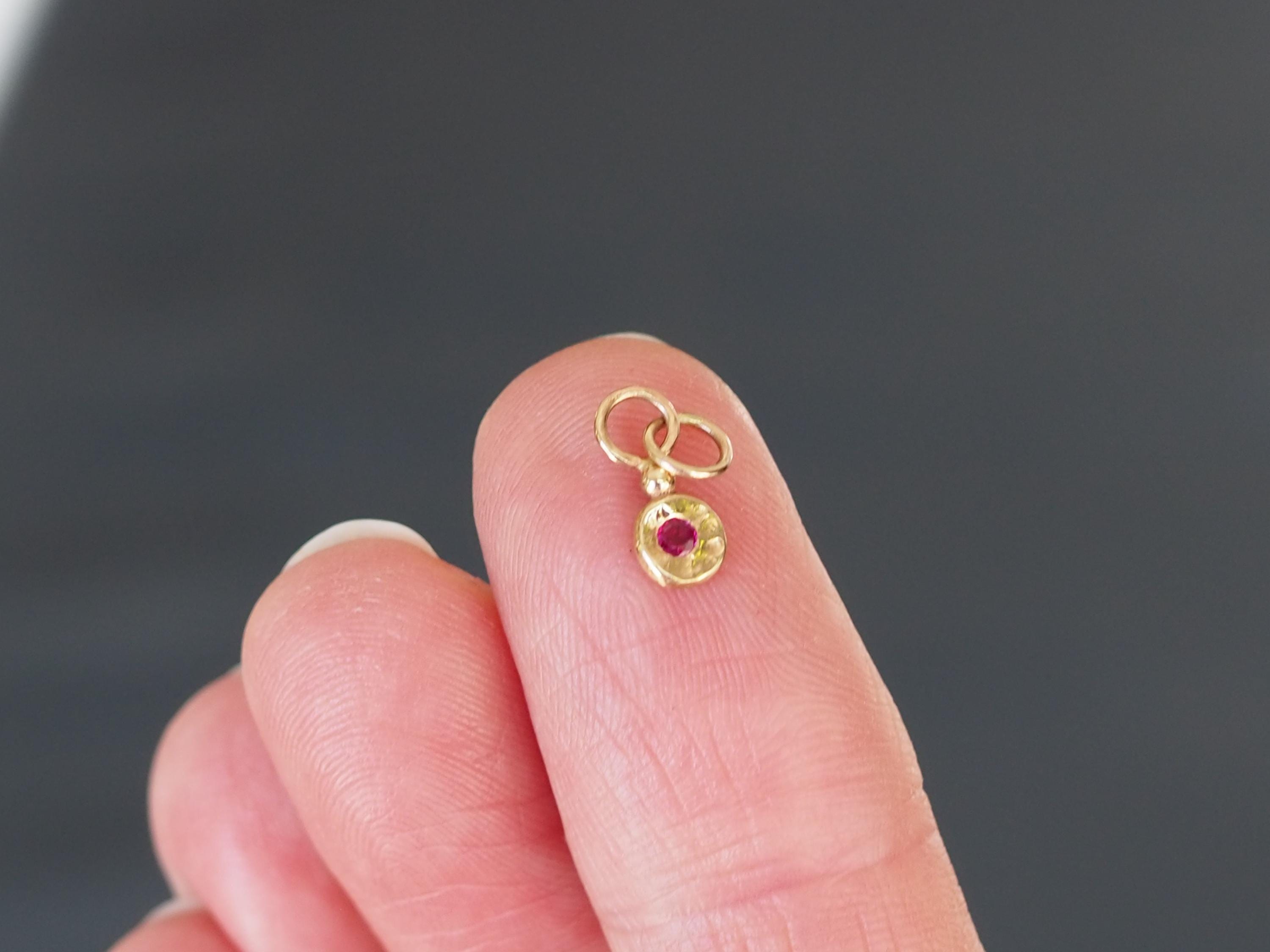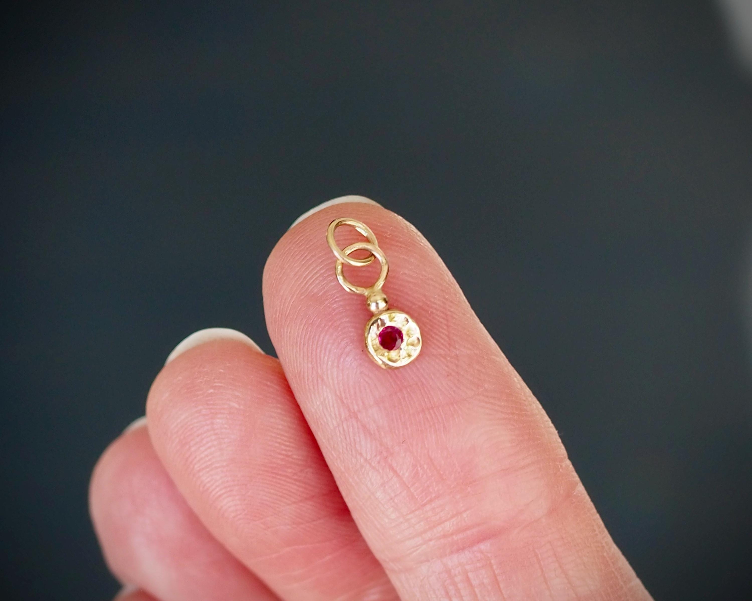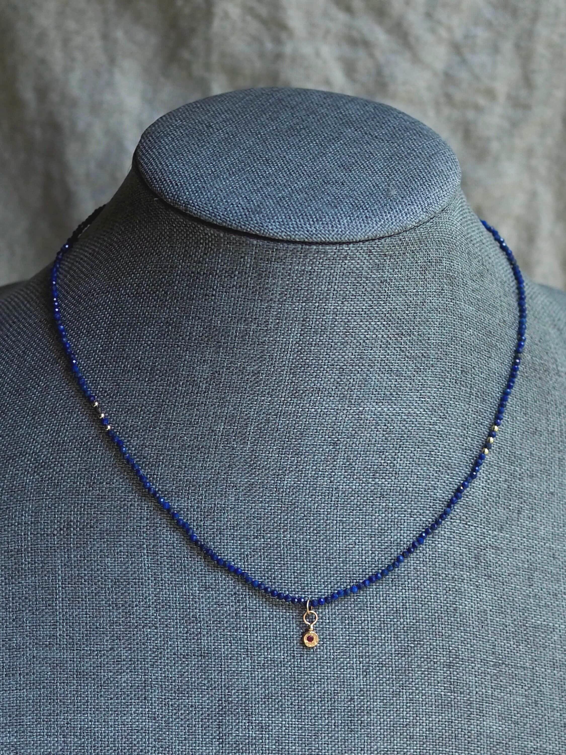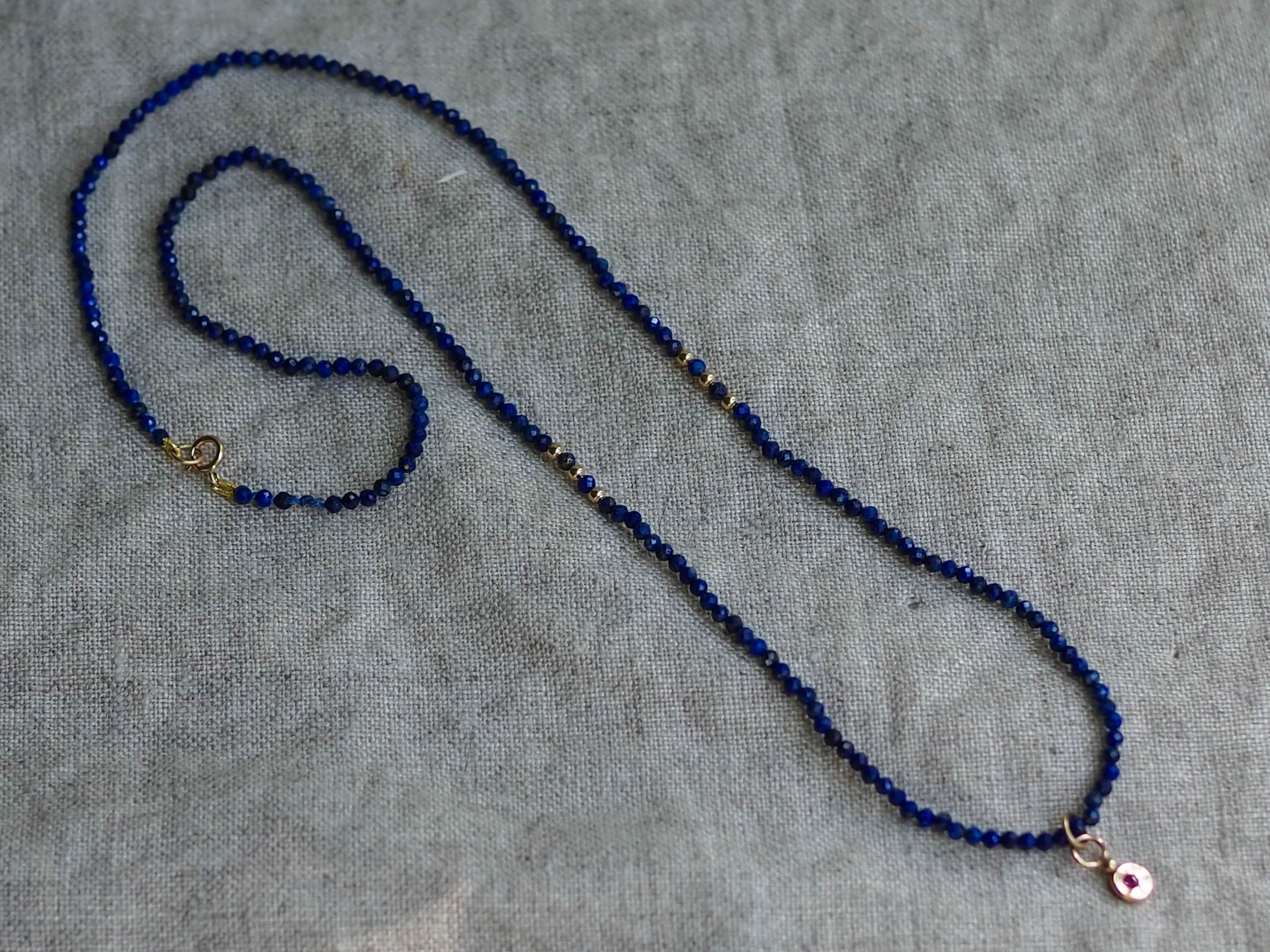 Darling, bright red ruby is nestled in a unique handmade 14k gold hand stamped flower pendant. The pendant hangs on a beautiful beaded necklace made with tiny, 2mm faceted lapis lazuli beads and solid 14k gold round beads. The faceted ruby is AAA quality and measures 2mm. The beaded necklace is hand strung on silk cord and finished with solid 14 gold spring ring clasp.