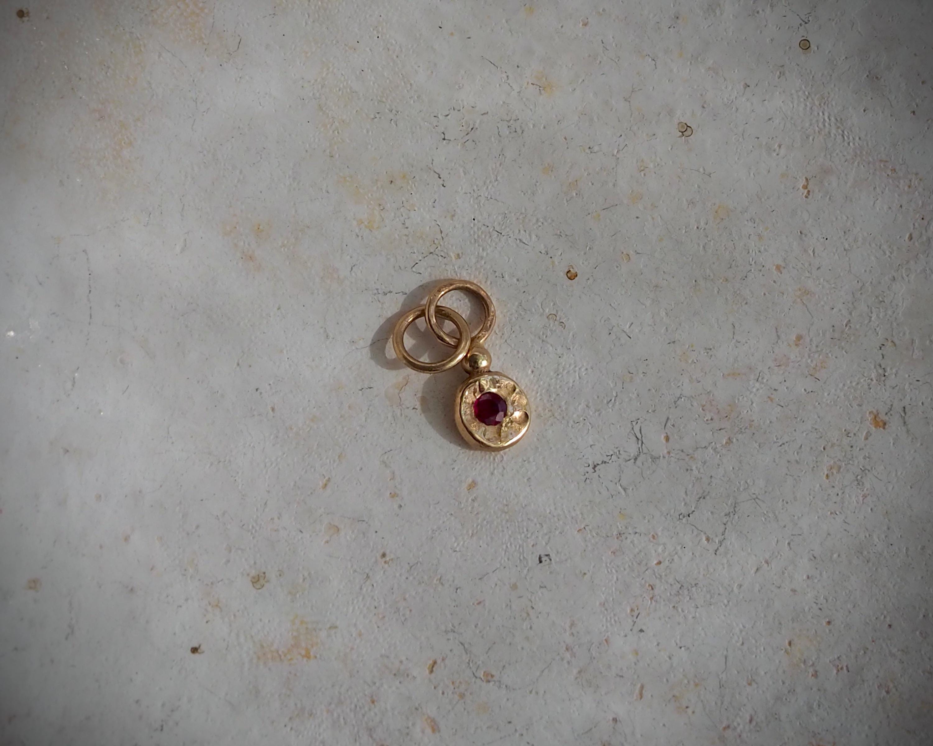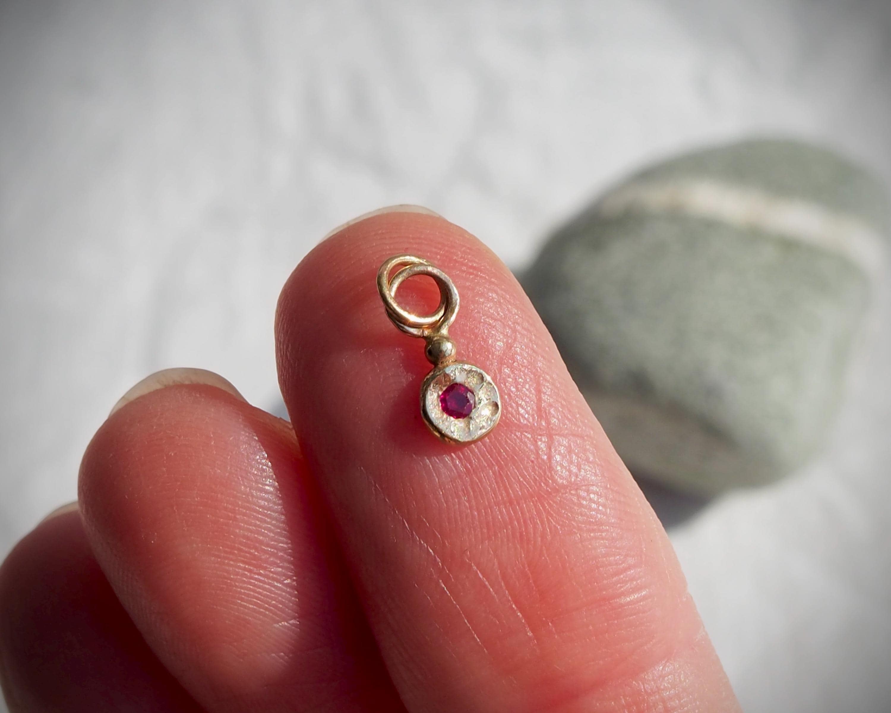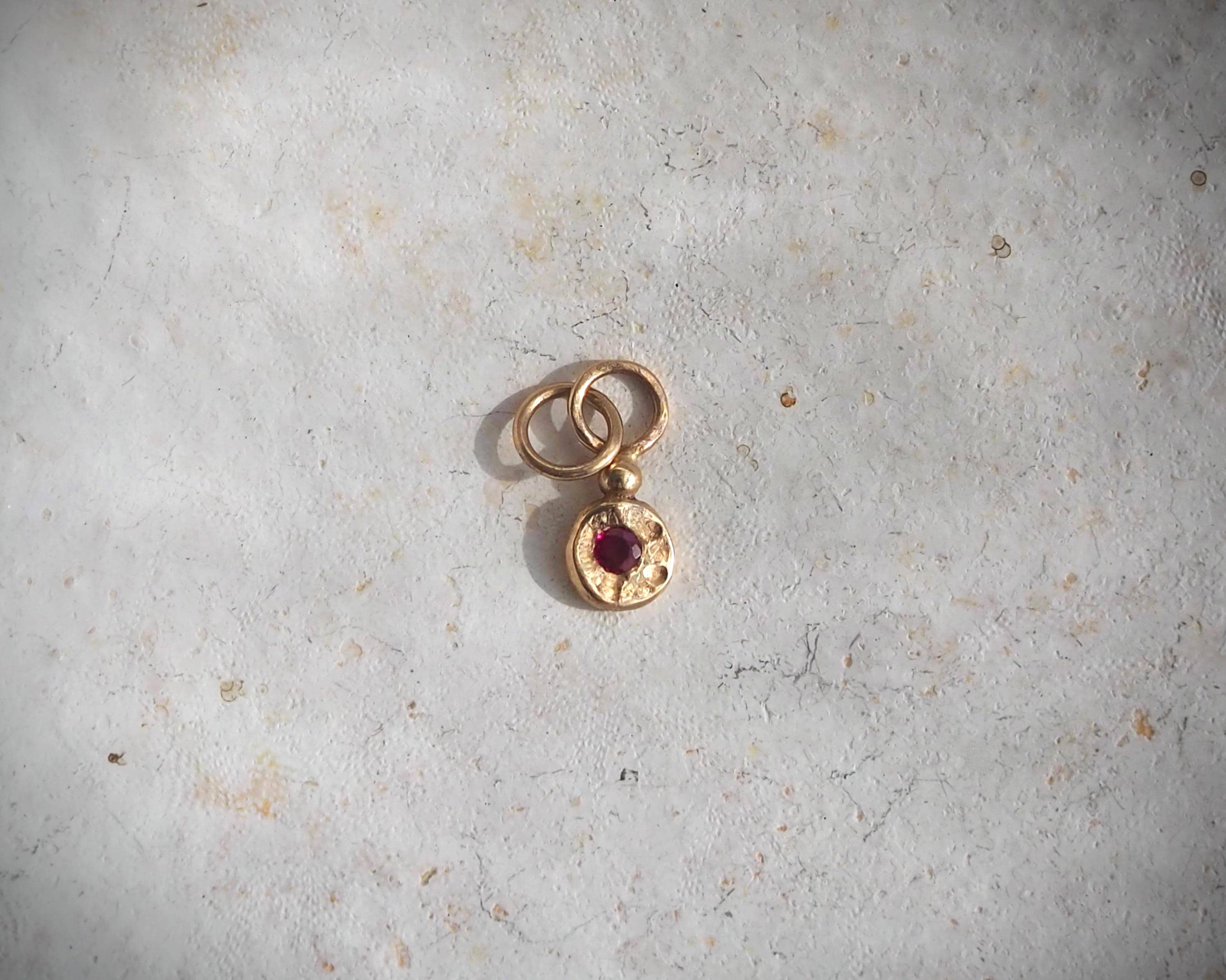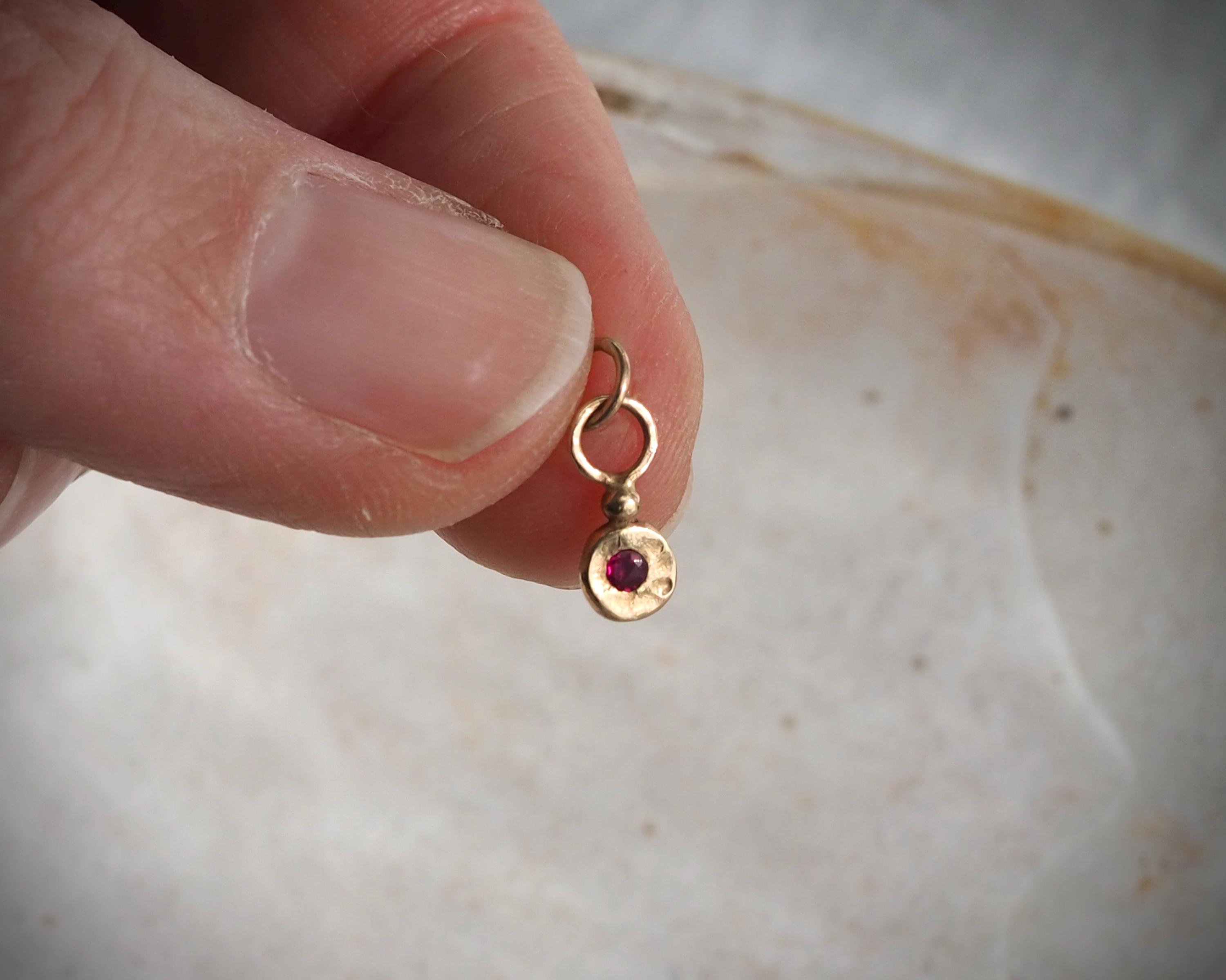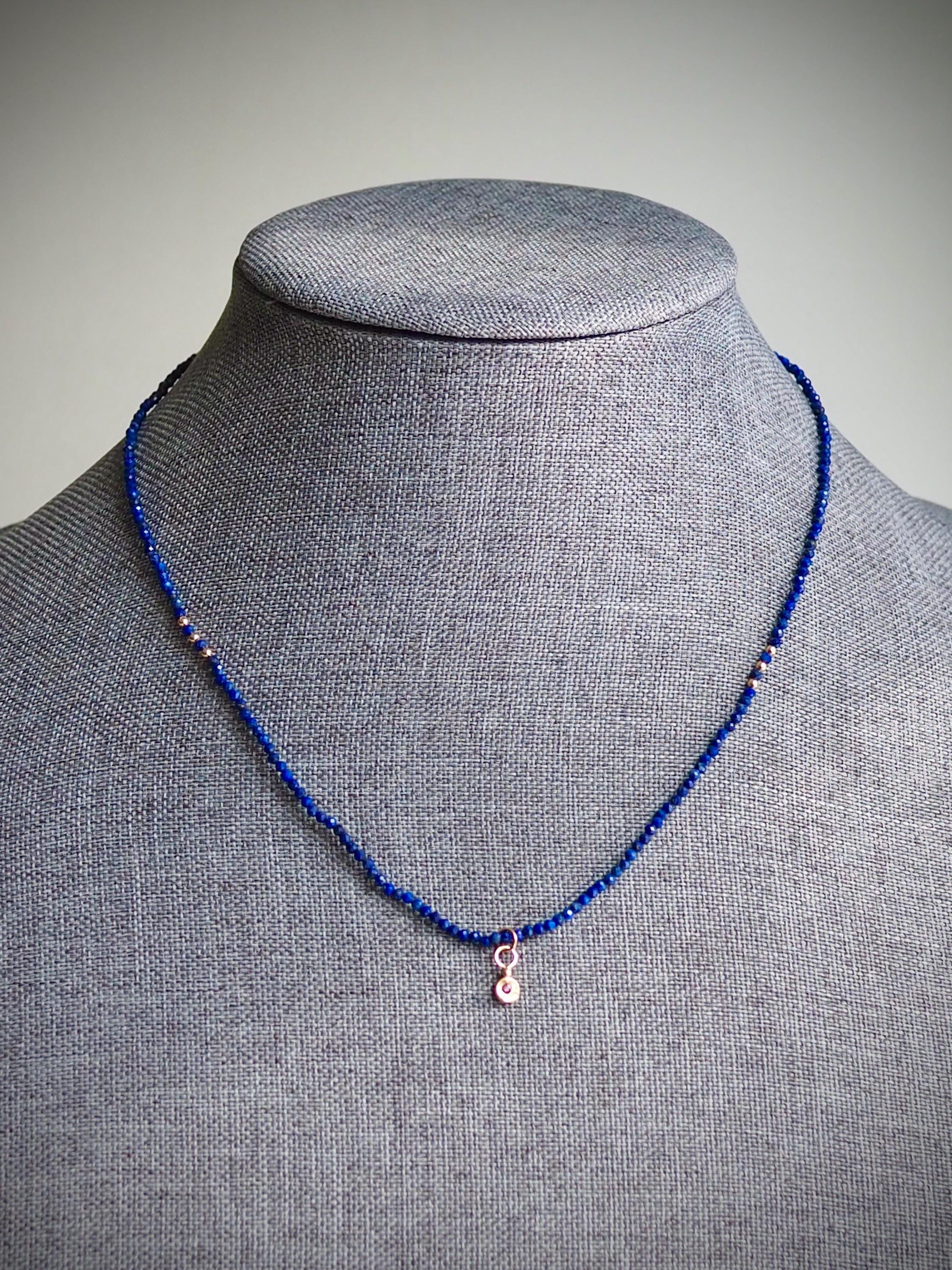 Darling, bright red ruby is nestled in a unique handmade 14k gold hand stamped flower pendant. The pendant hangs on a beautiful beaded necklace made with tiny, 2mm faceted lapis lazuli beads and solid 14k gold round beads. The faceted ruby is AAA quality and measures 2mm. The beaded necklace is hand strung on silk cord and finished with solid 14 gold spring ring clasp.