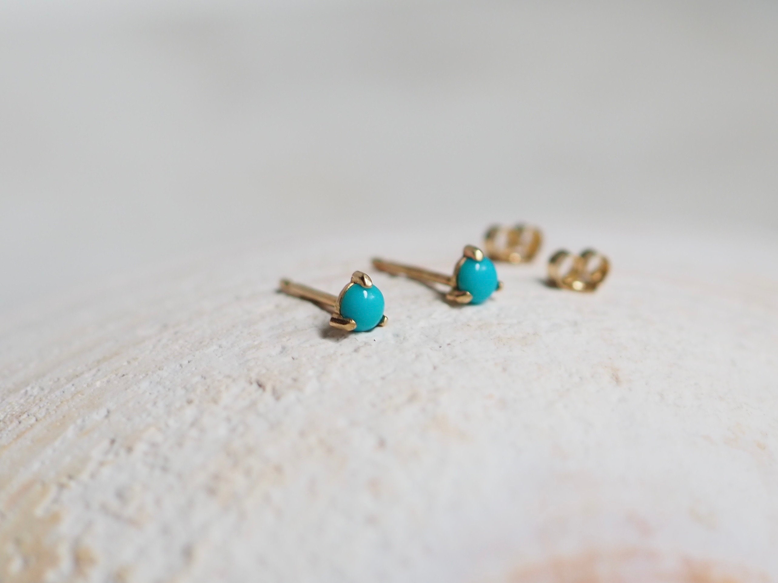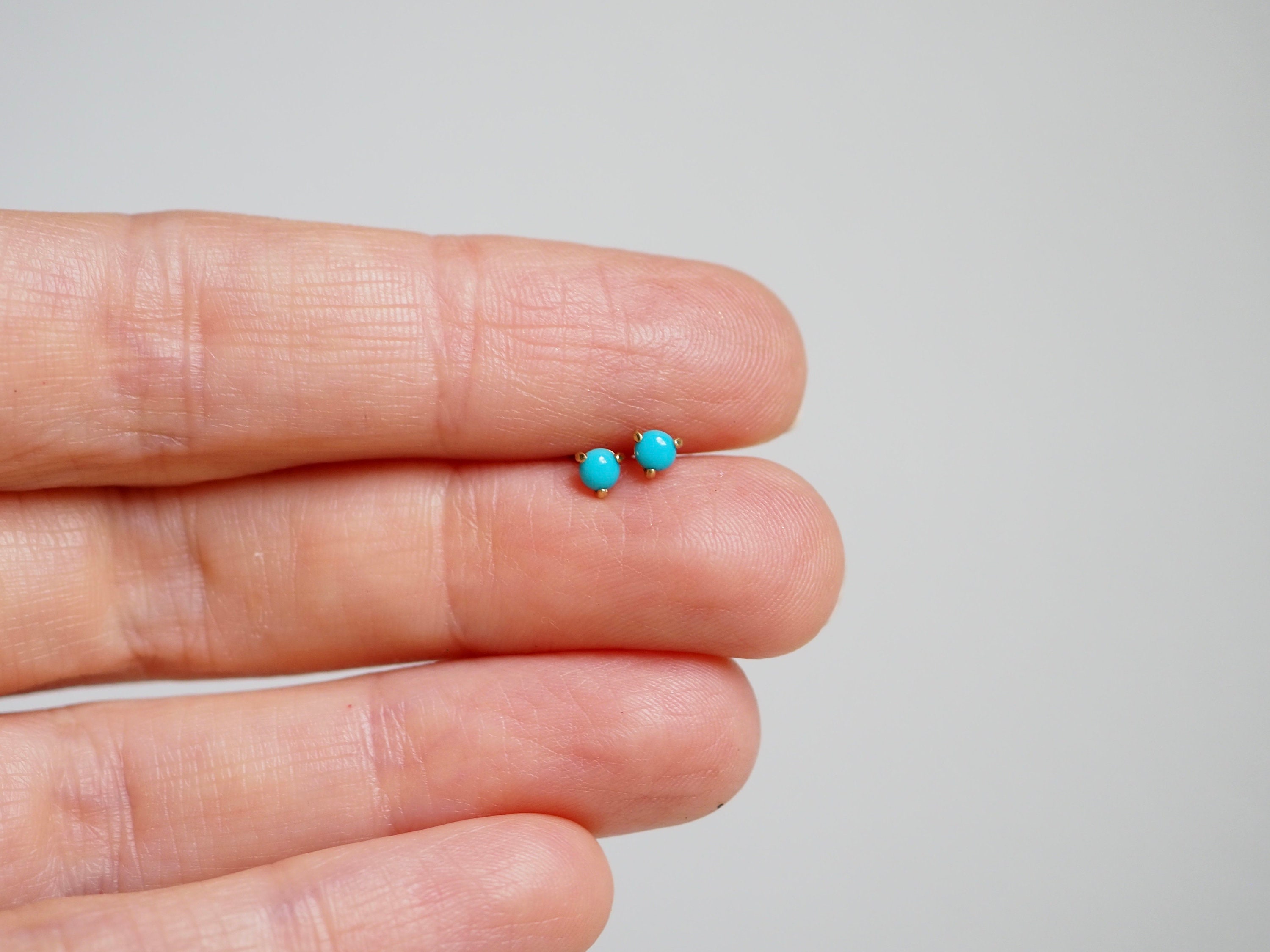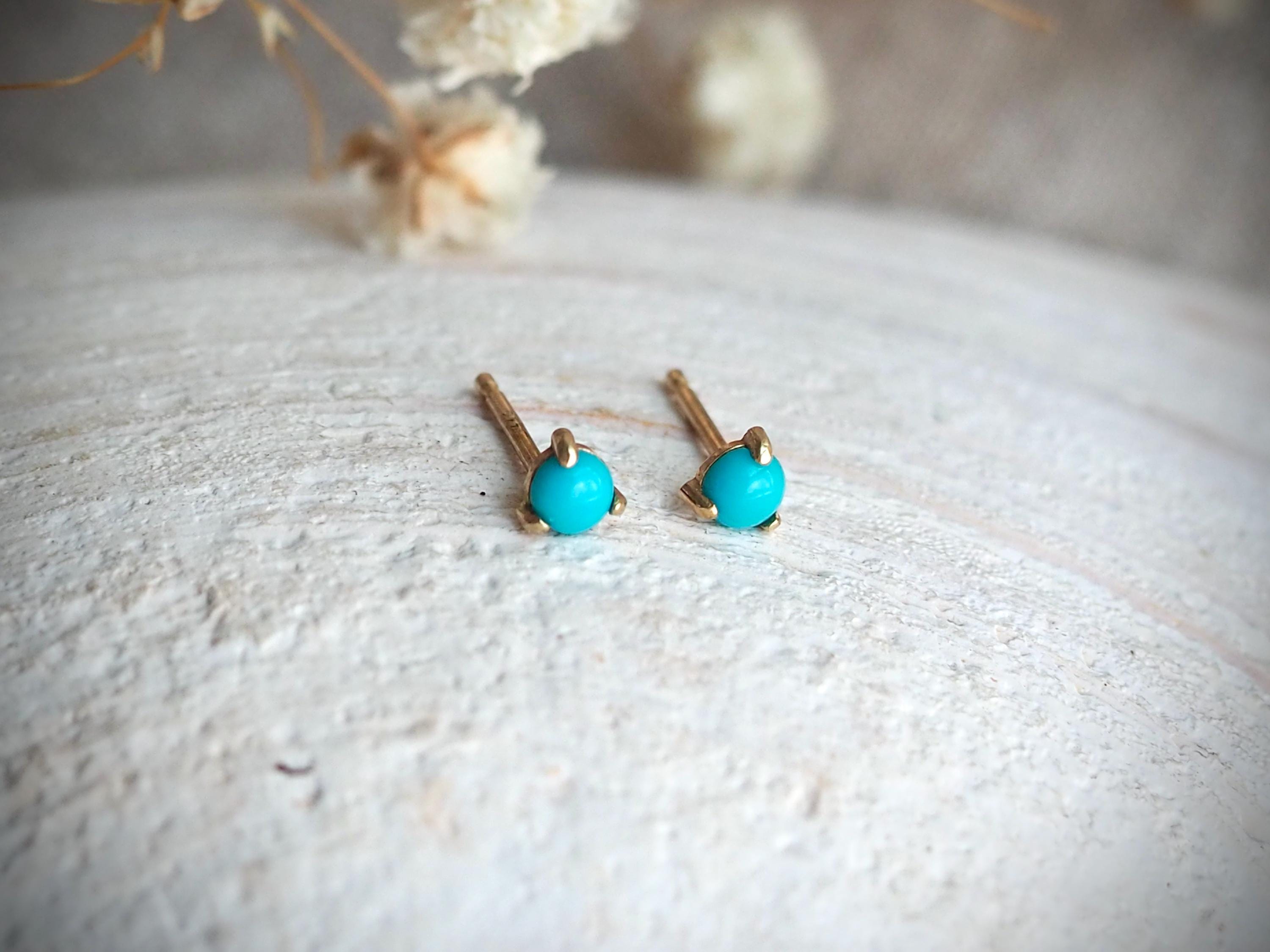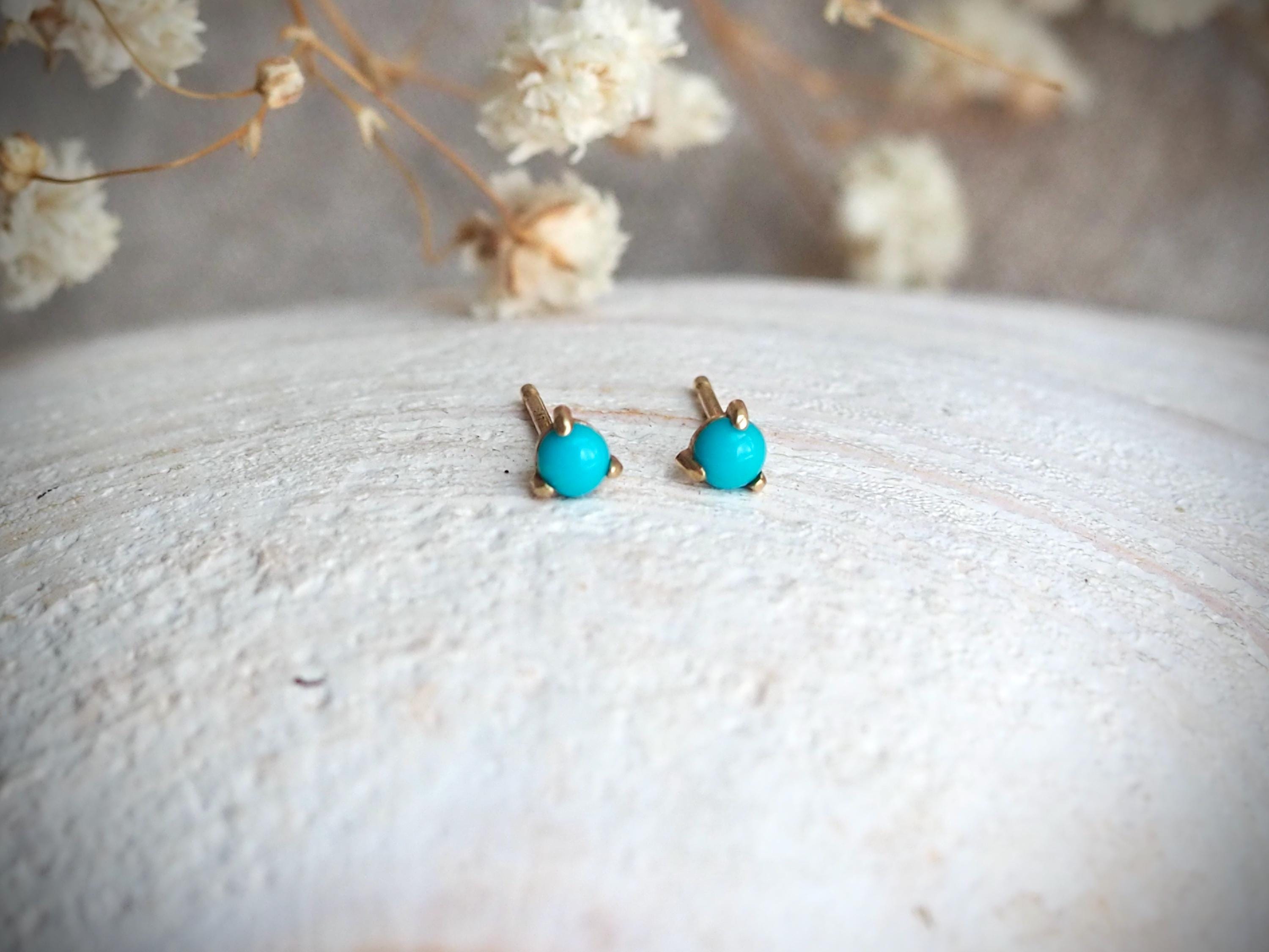 Bright blue 3mm American turquoise cabochons are set in three claws . These petite earrings are solid 14k gold with push backs included.