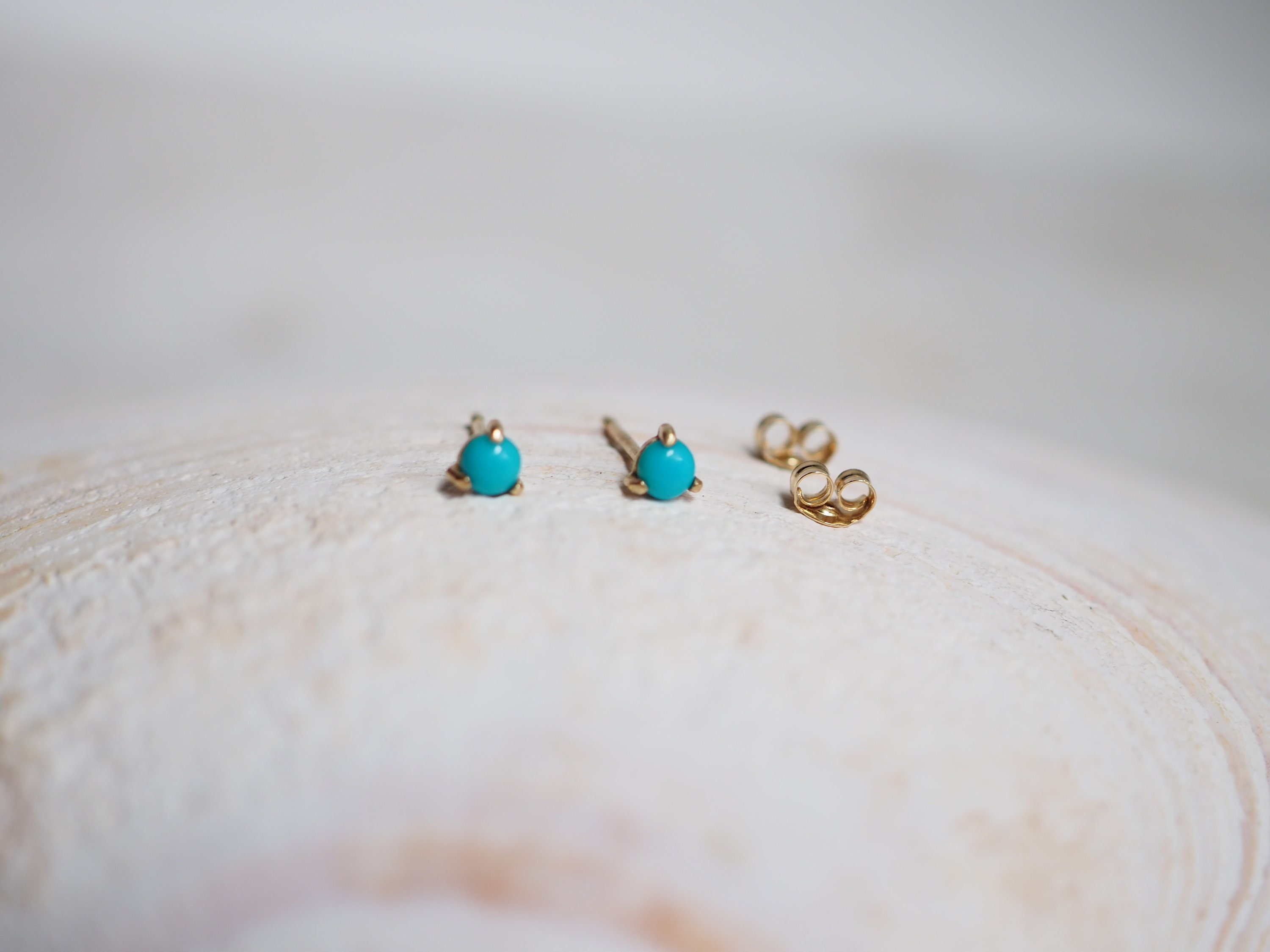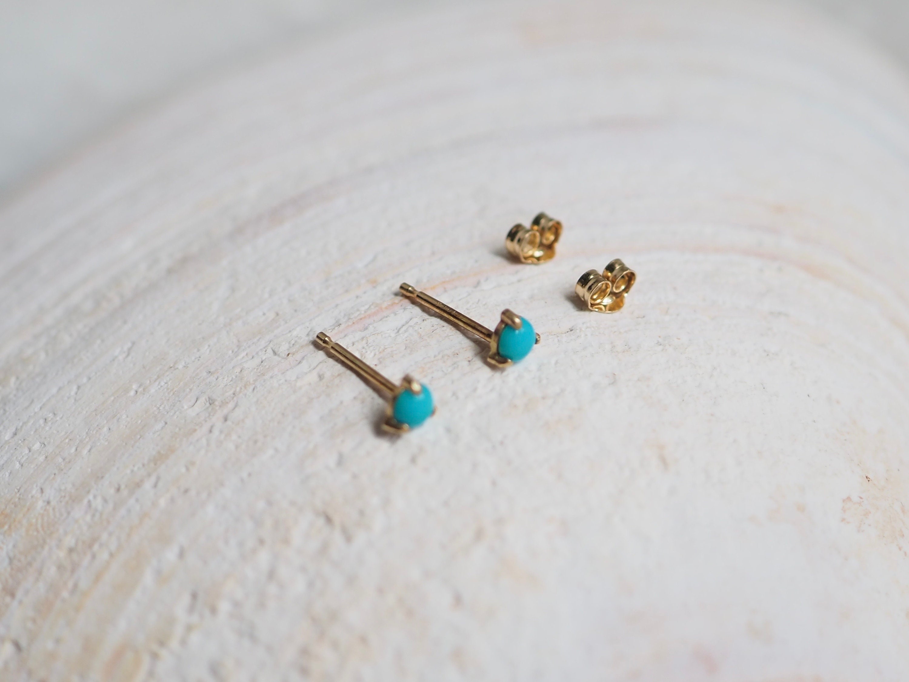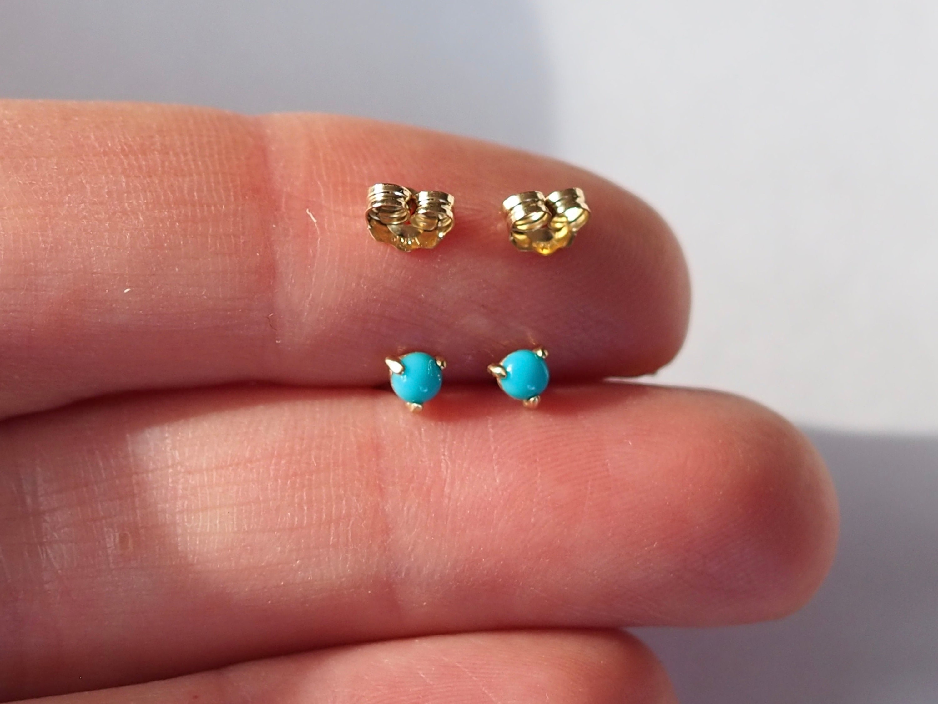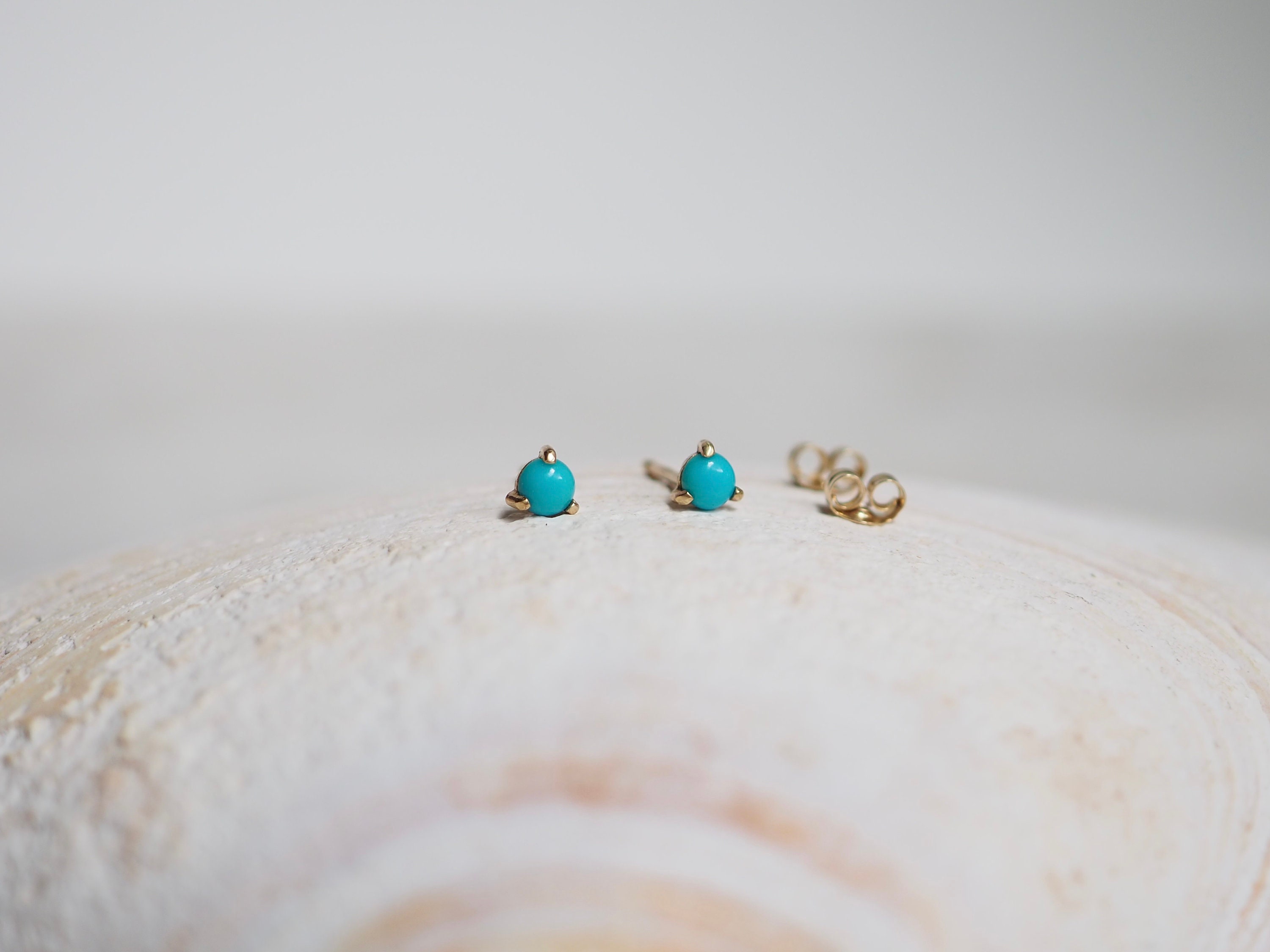 Bright blue 3mm American turquoise cabochons are set in three claws . These petite earrings are solid 14k gold with push backs included.