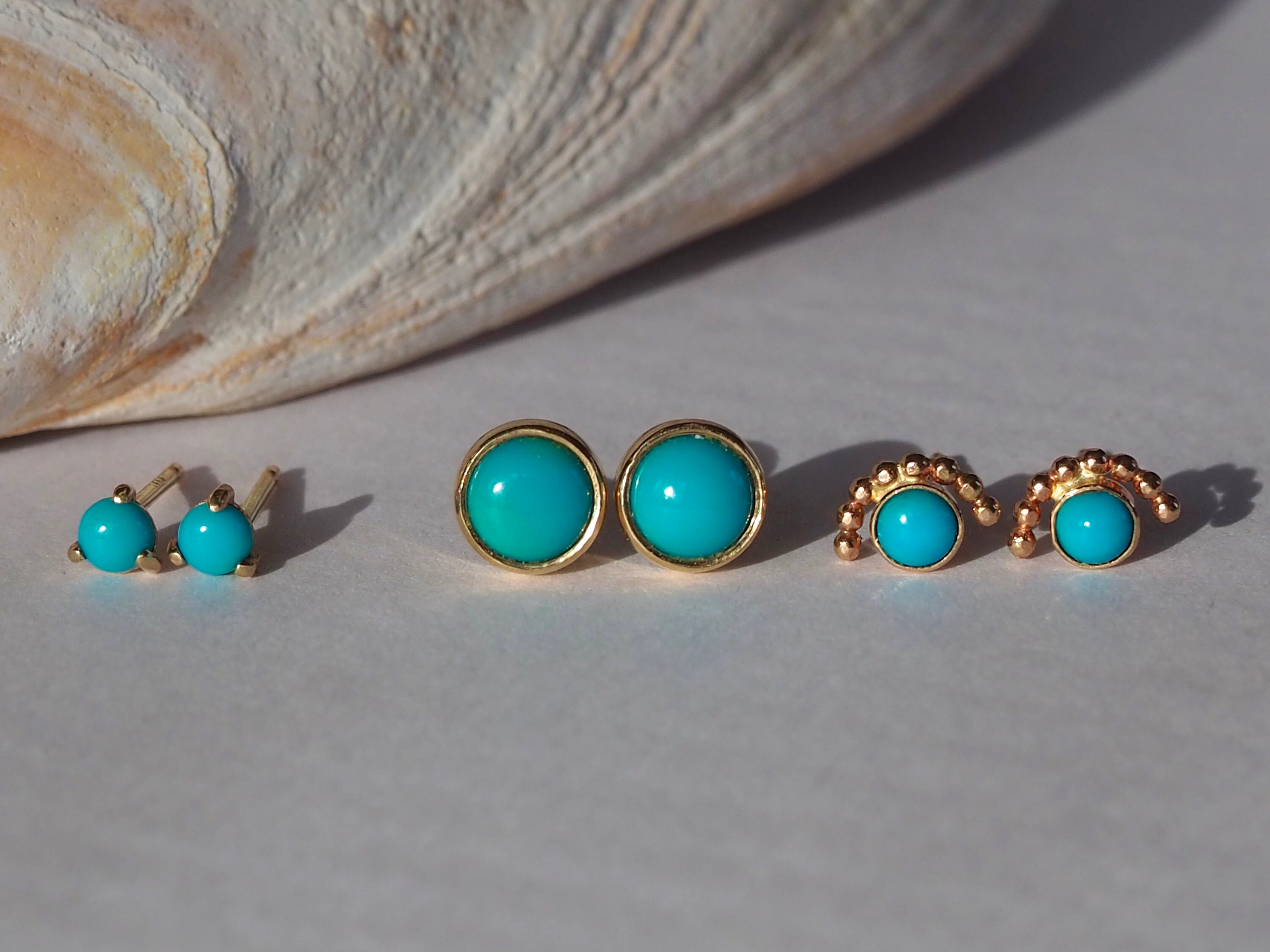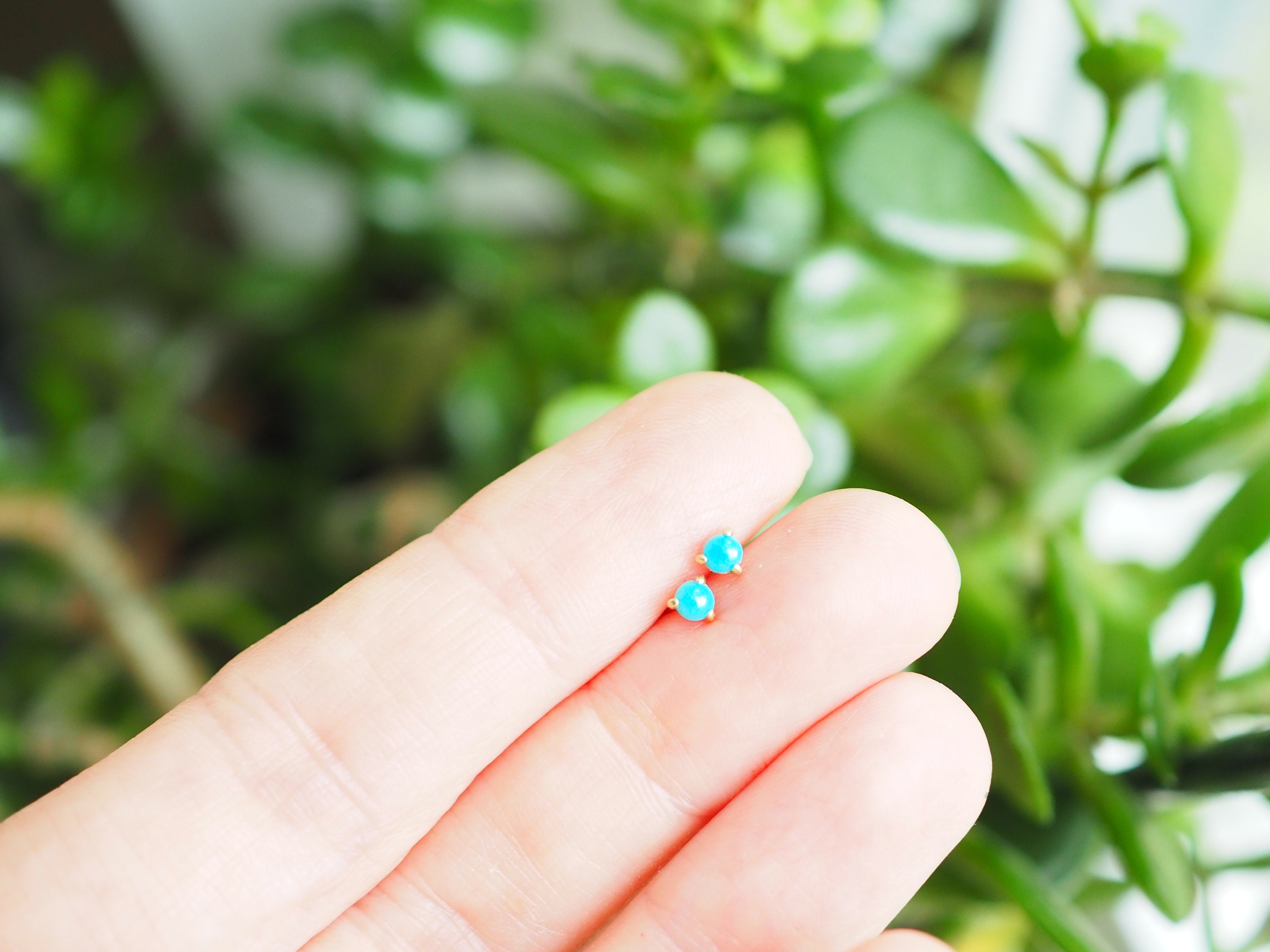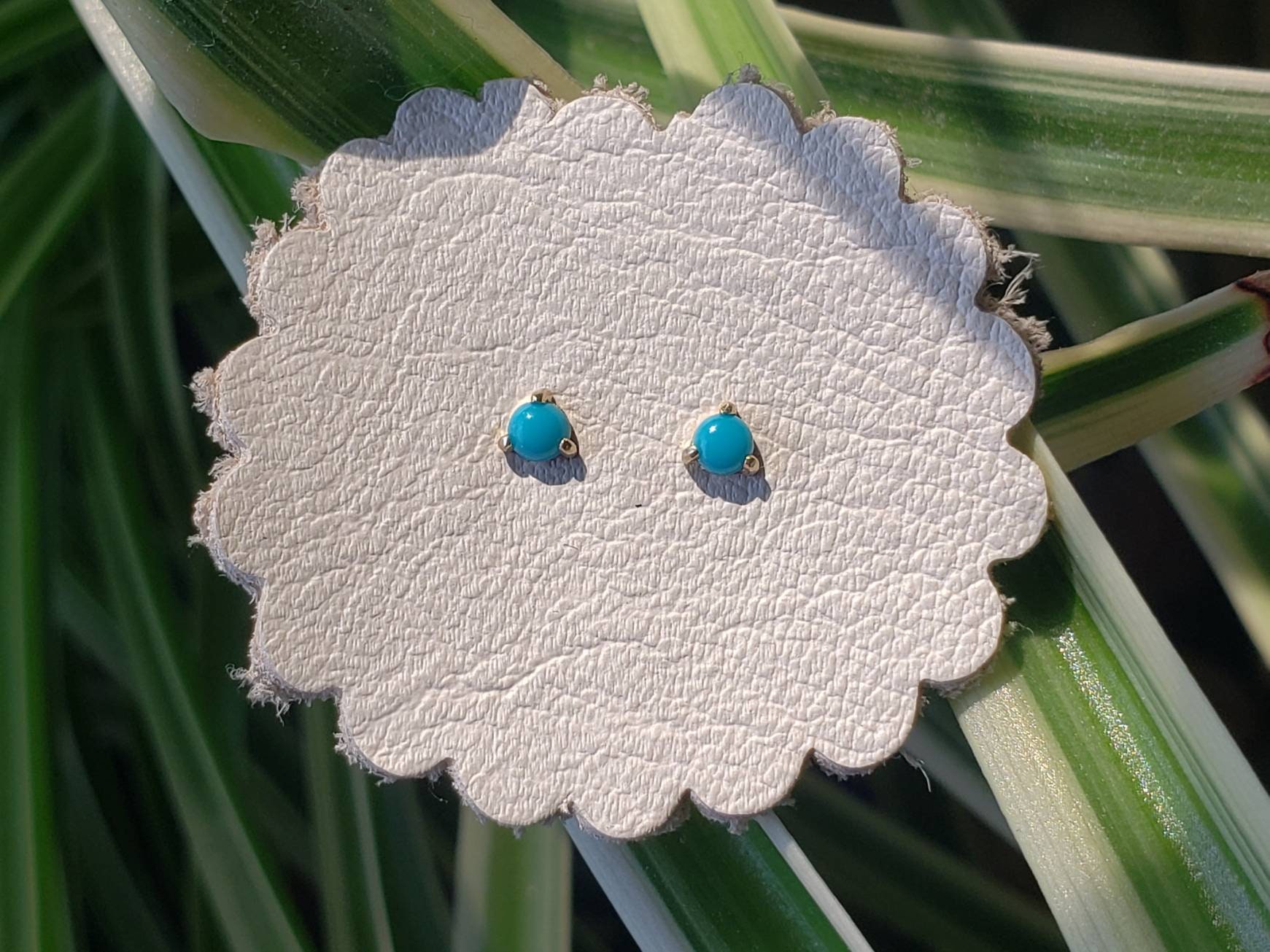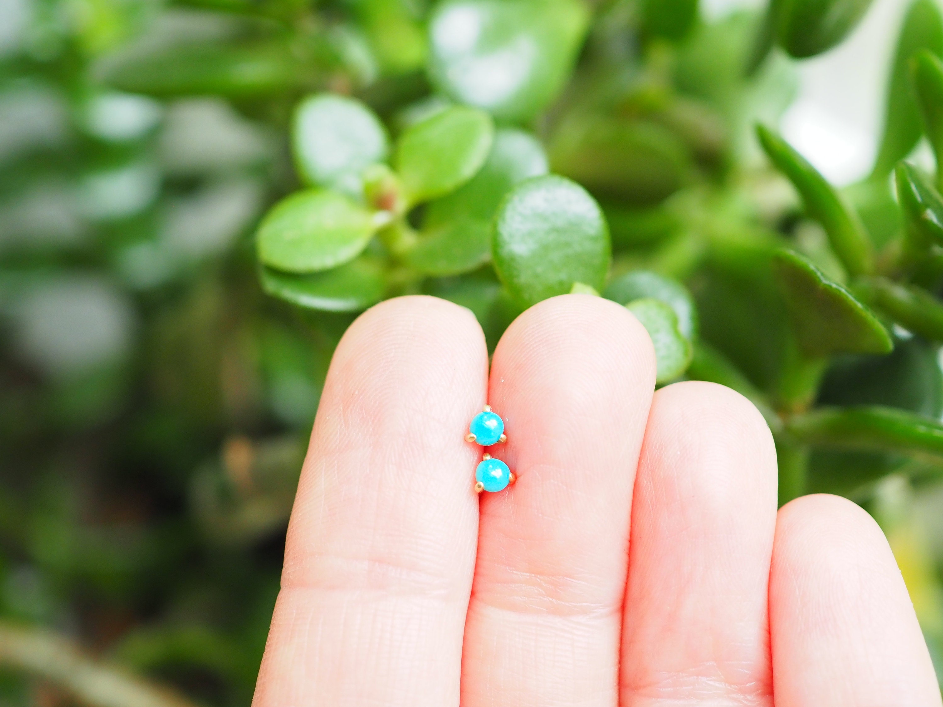 Bright blue 3mm American turquoise cabochons are set in three claws . These petite earrings are solid 14k gold with push backs included.