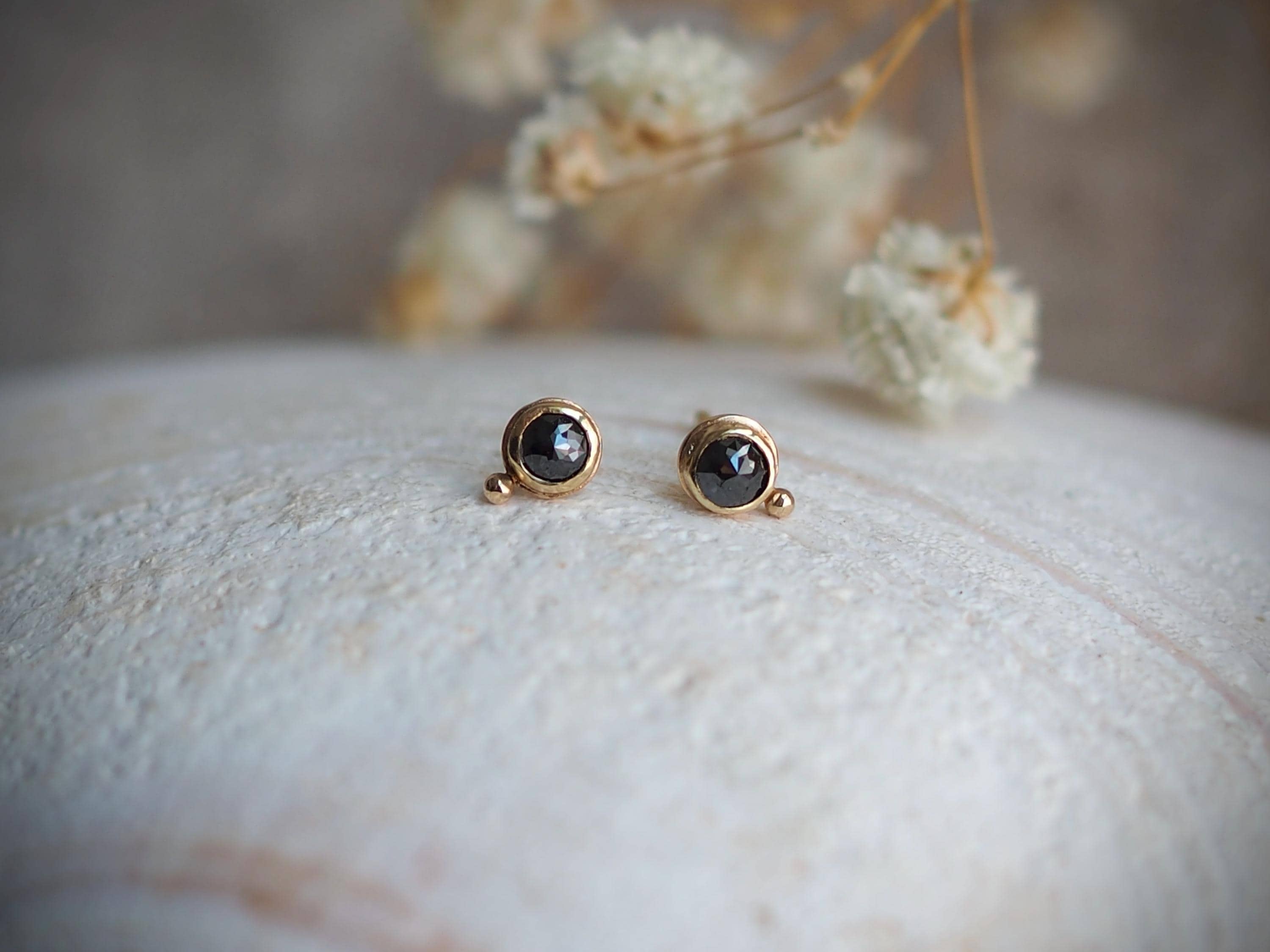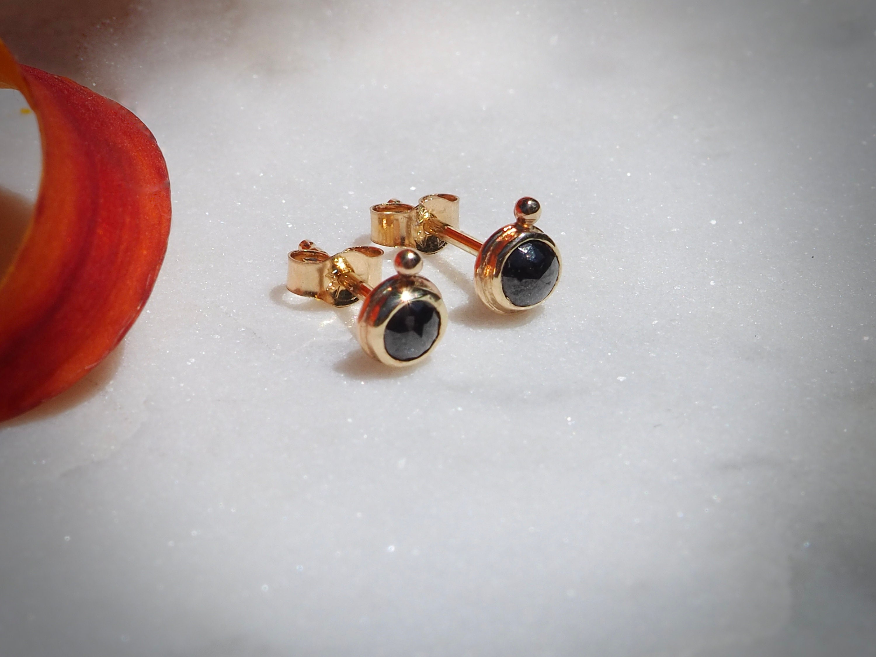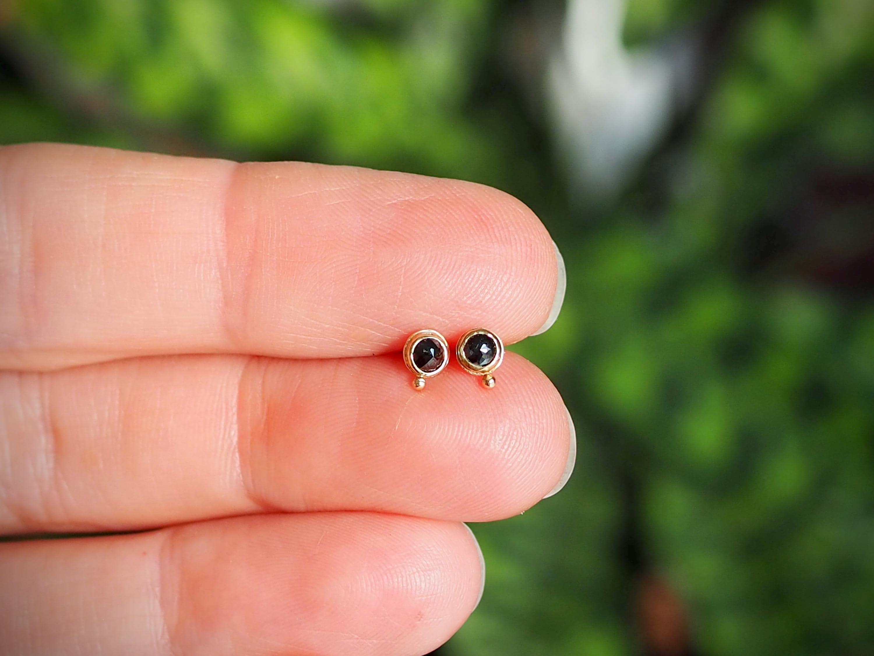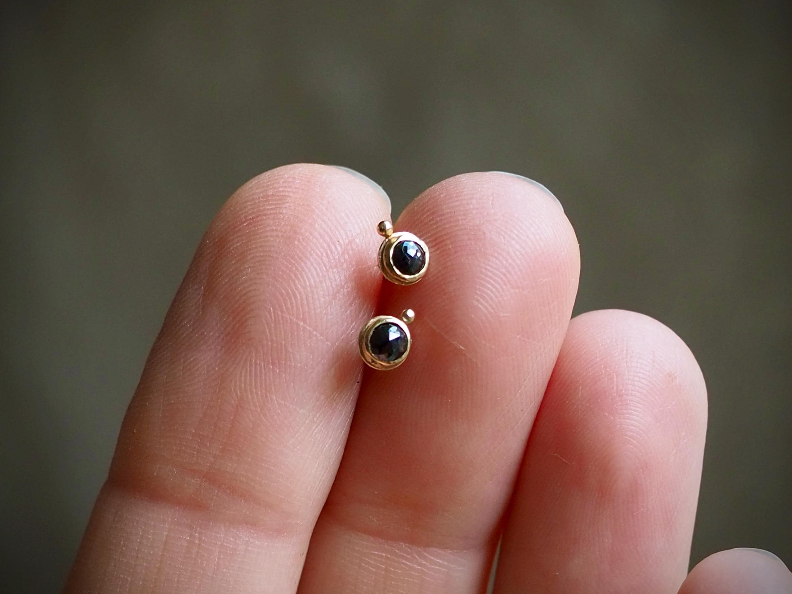 Genuine 3mm black diamonds are rose cut with many delicate kite shaped facets. Set in closed back 14k gold bezels, each adorned with a tiny gold sphere.