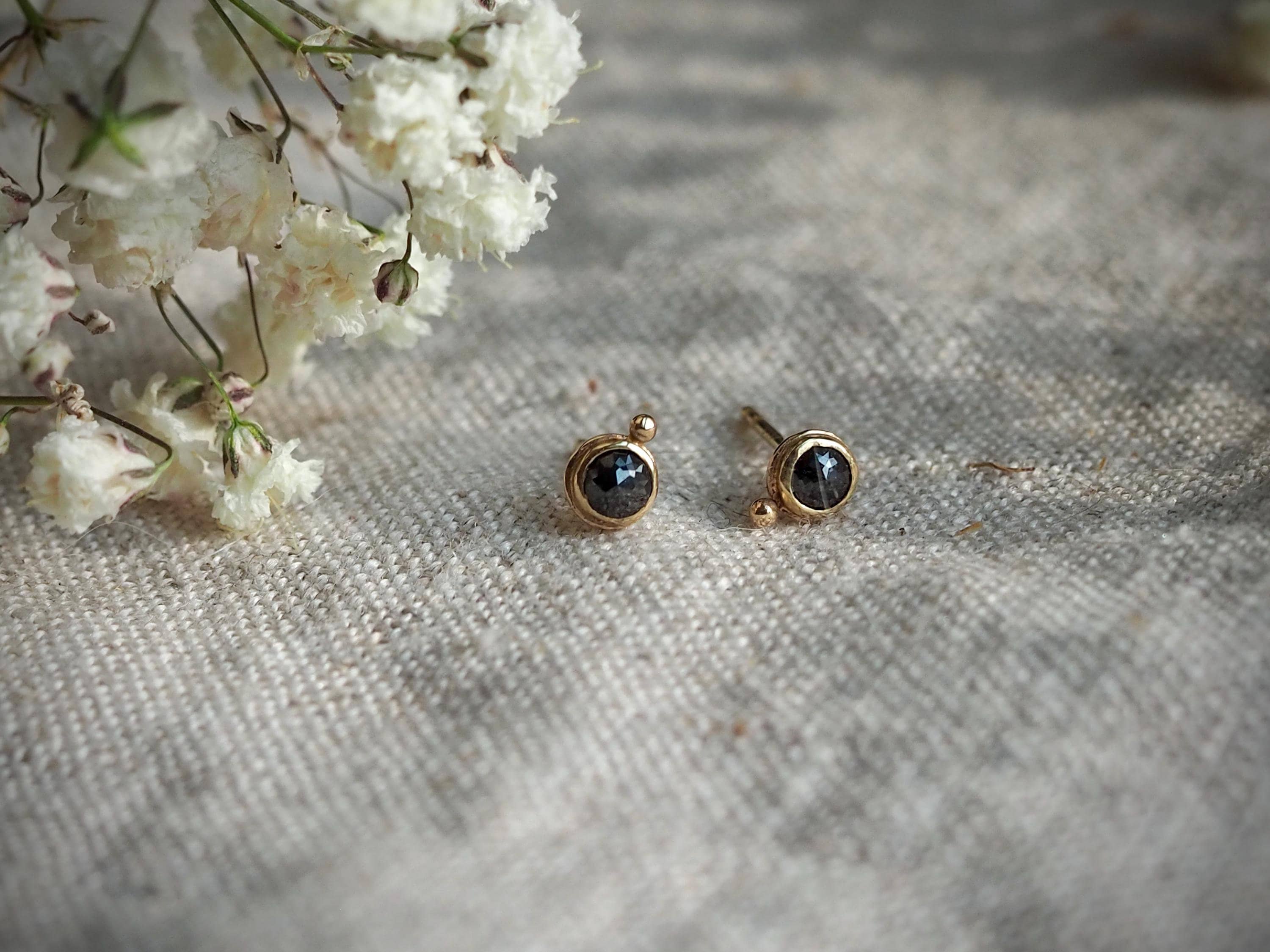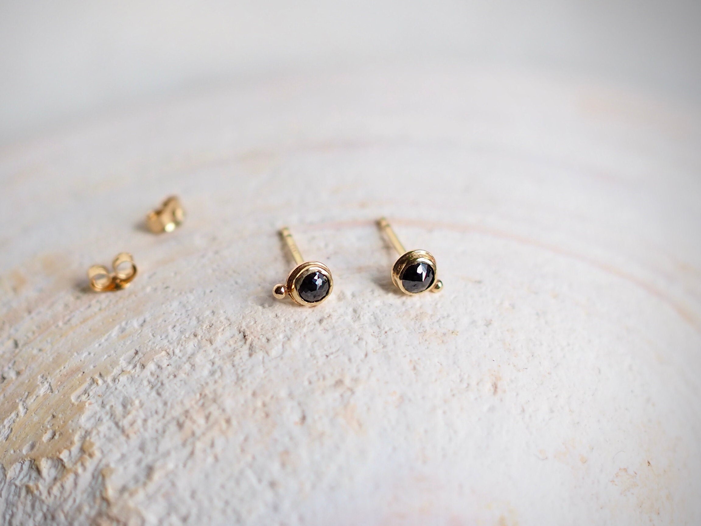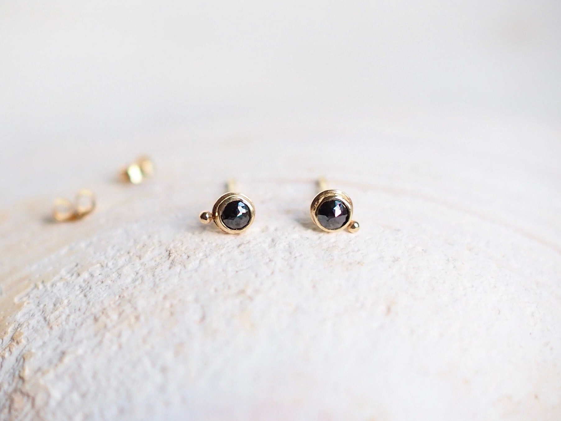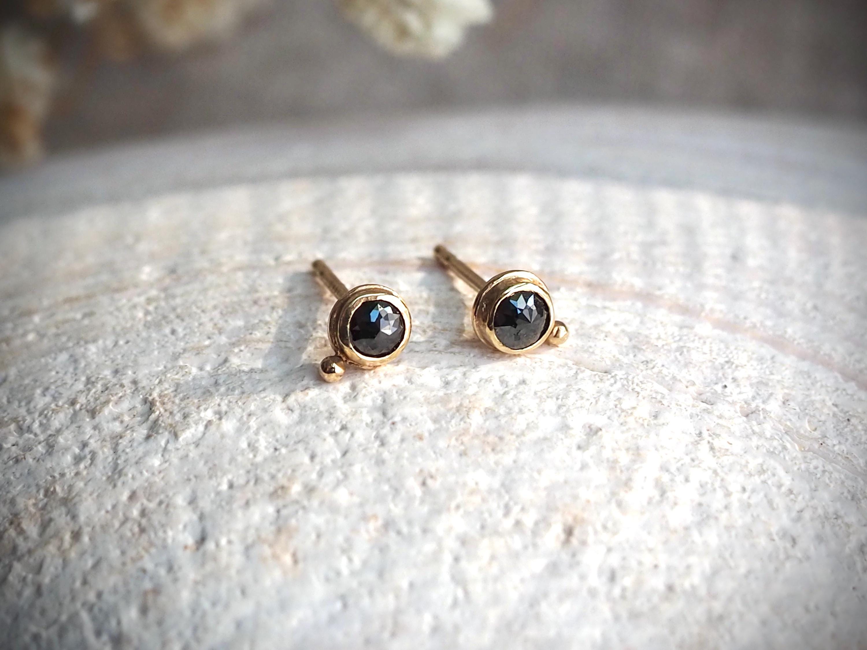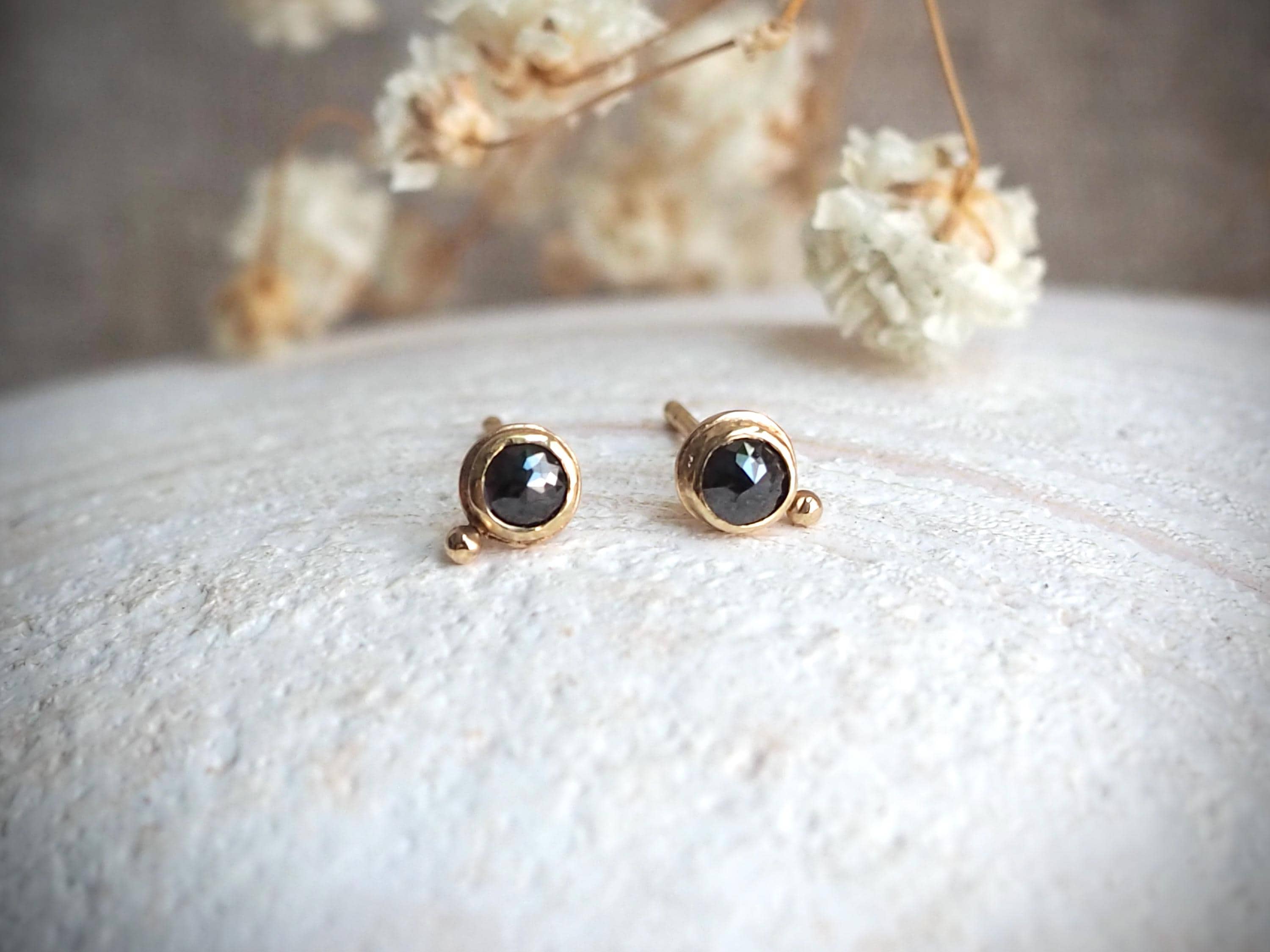 Genuine 3mm black diamonds are rose cut with many delicate kite shaped facets. Set in closed back 14k gold bezels, each adorned with a tiny gold sphere.