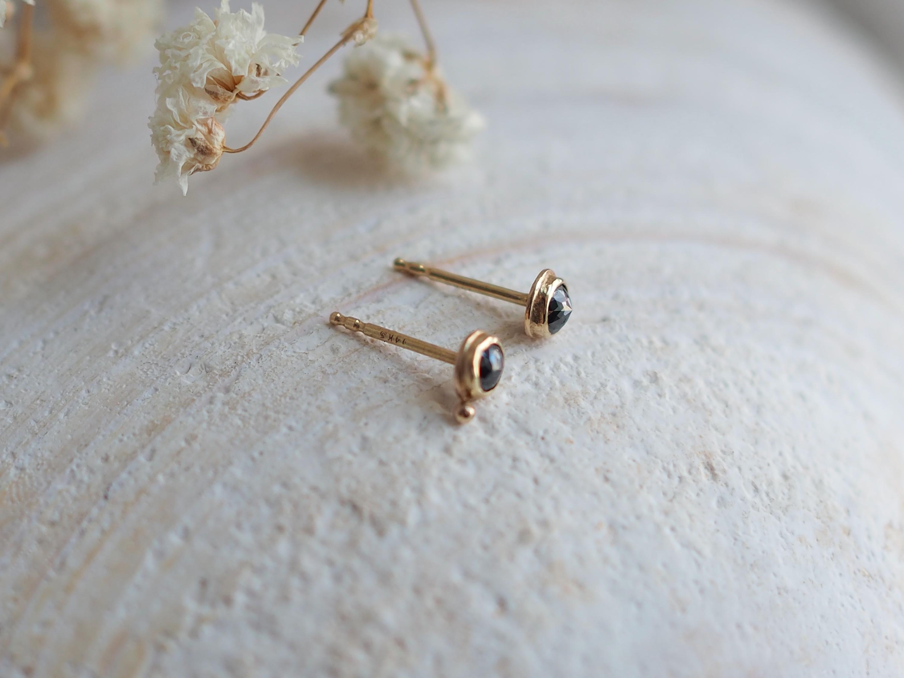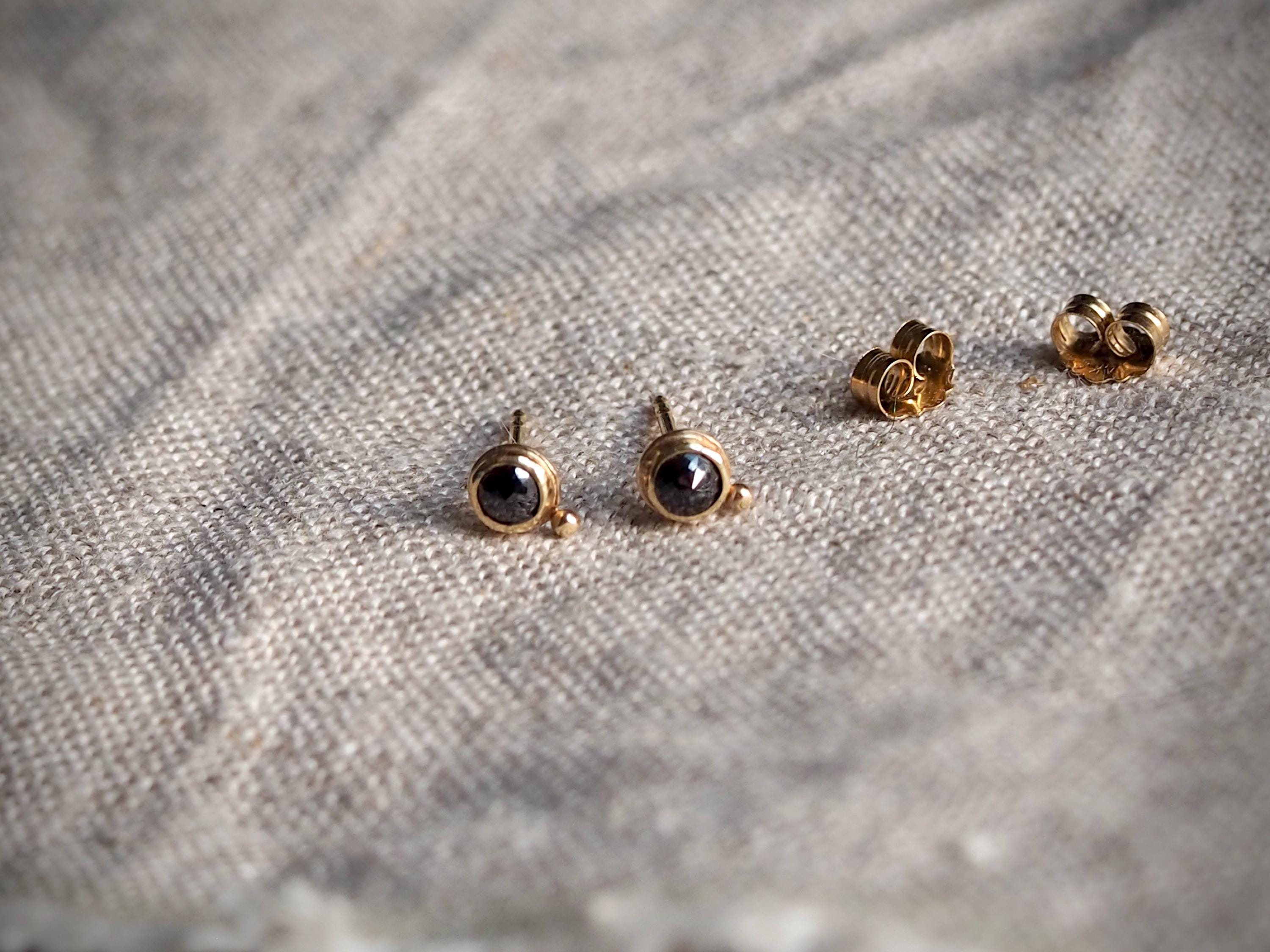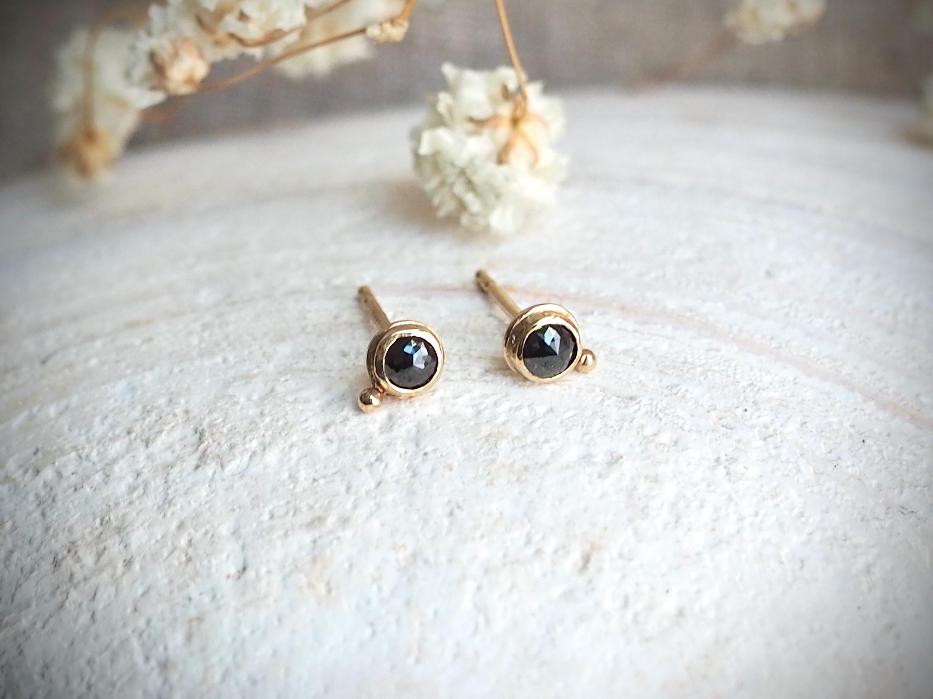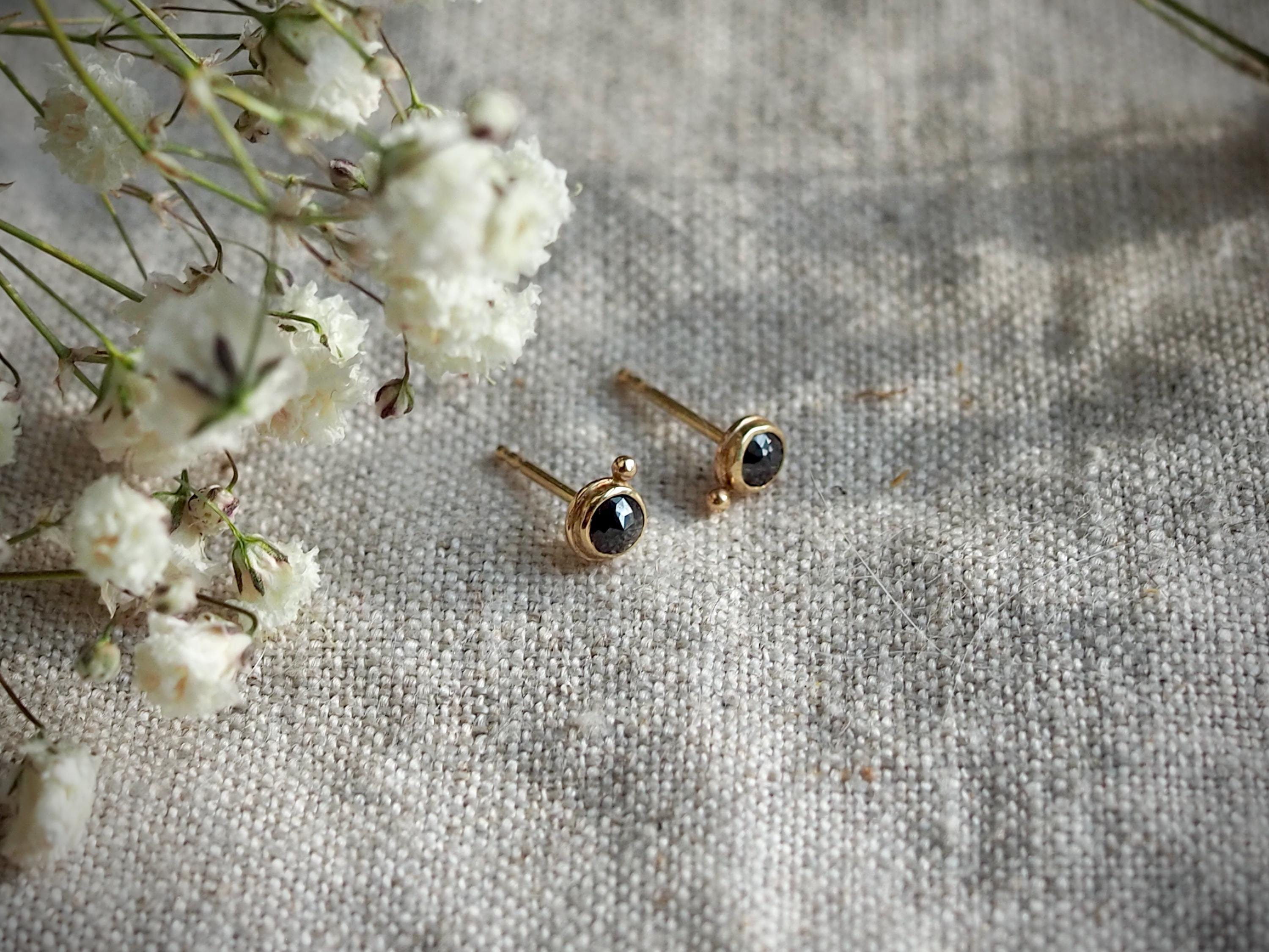 Genuine 3mm black diamonds are rose cut with many delicate kite shaped facets. Set in closed back 14k gold bezels, each adorned with a tiny gold sphere.