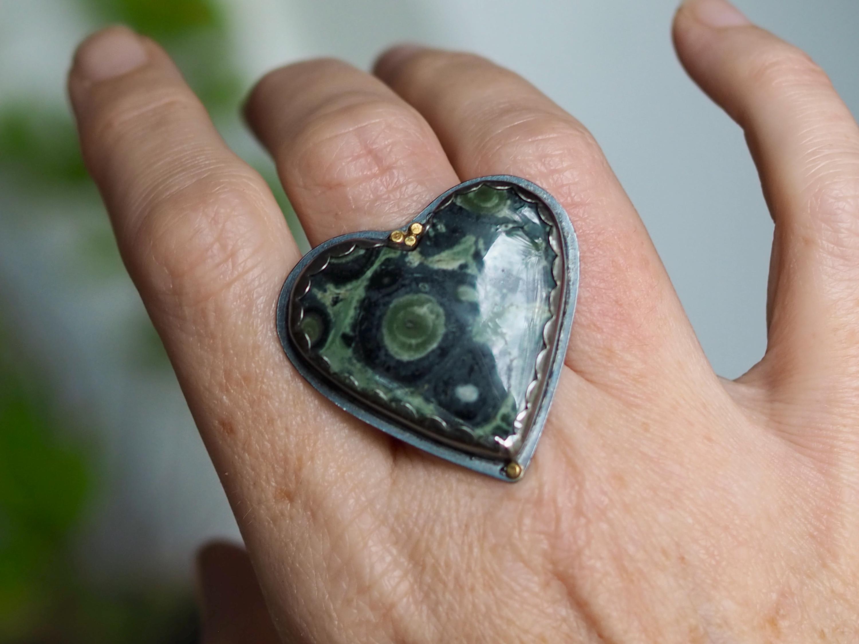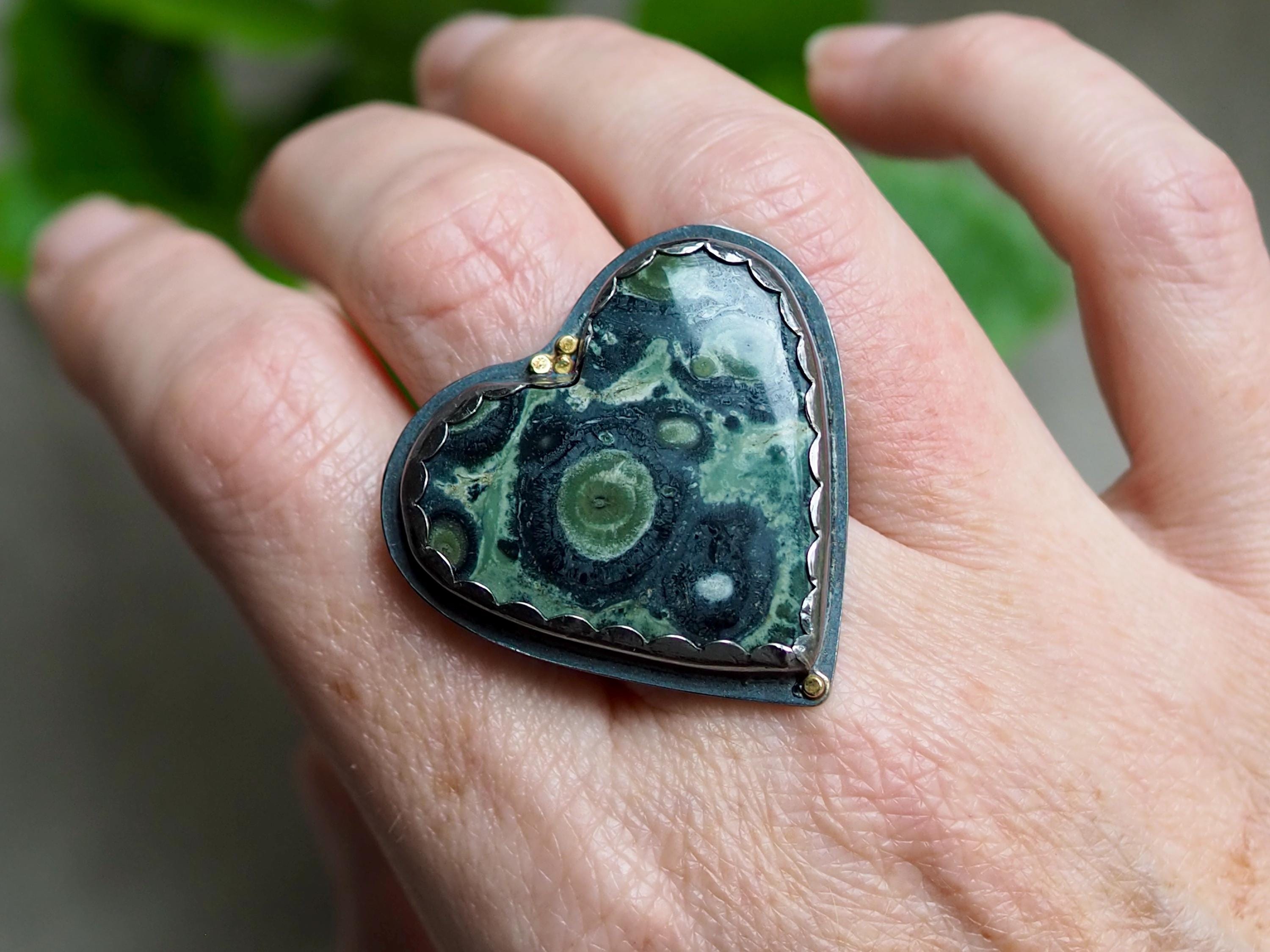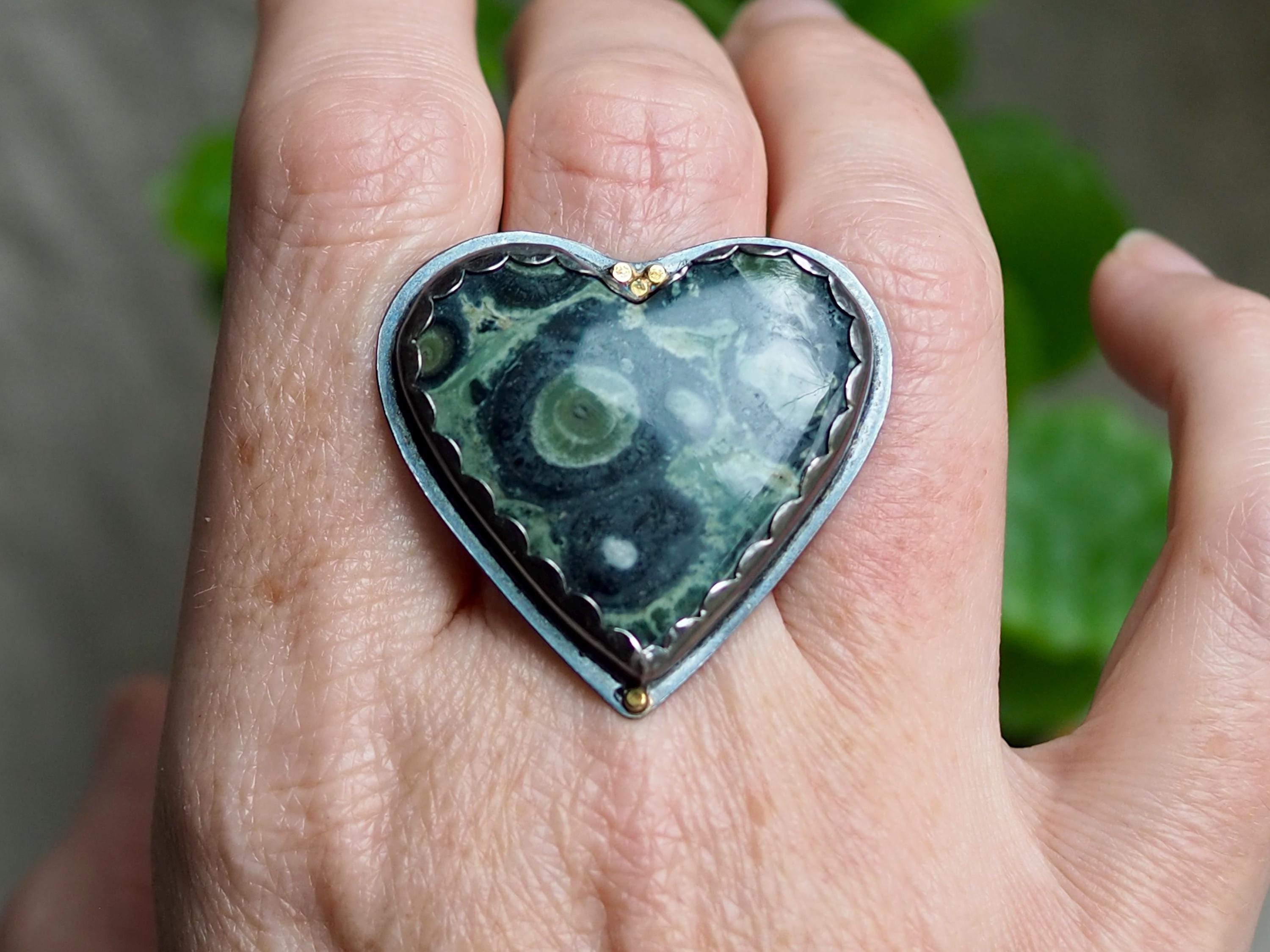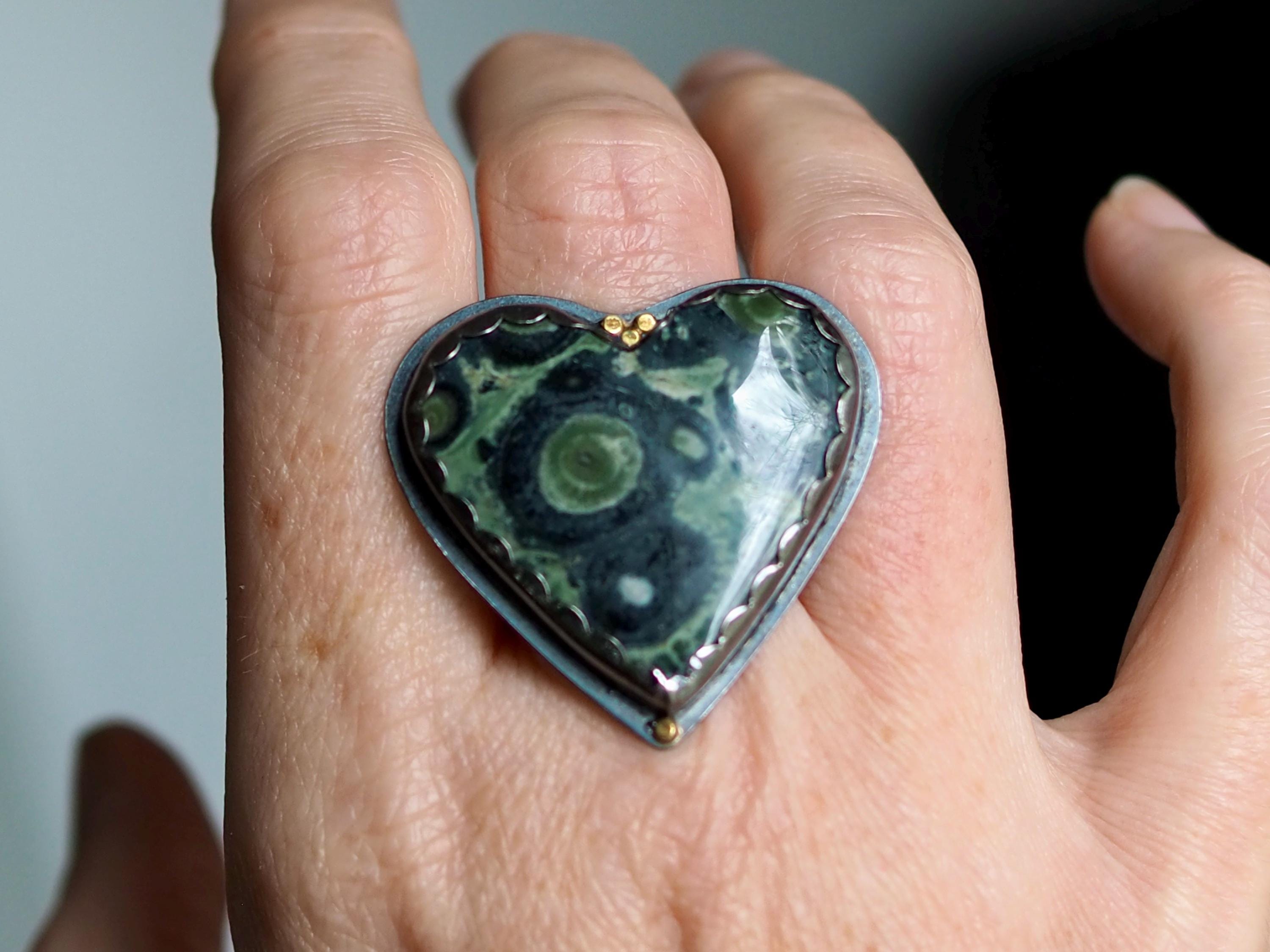 This stone caught my eye! It made me think of Vincent Van Gogh's beautiful painting, Starry Night. This intriguing Kambaba Jasper cabochon is set in a fine silver scalloped bezel adorned with 14k gold dots, and has brushed sterling silver backplate with a heart cutout . The shank has a cool twist in the back. This unique, handmade ring is size 8.5.