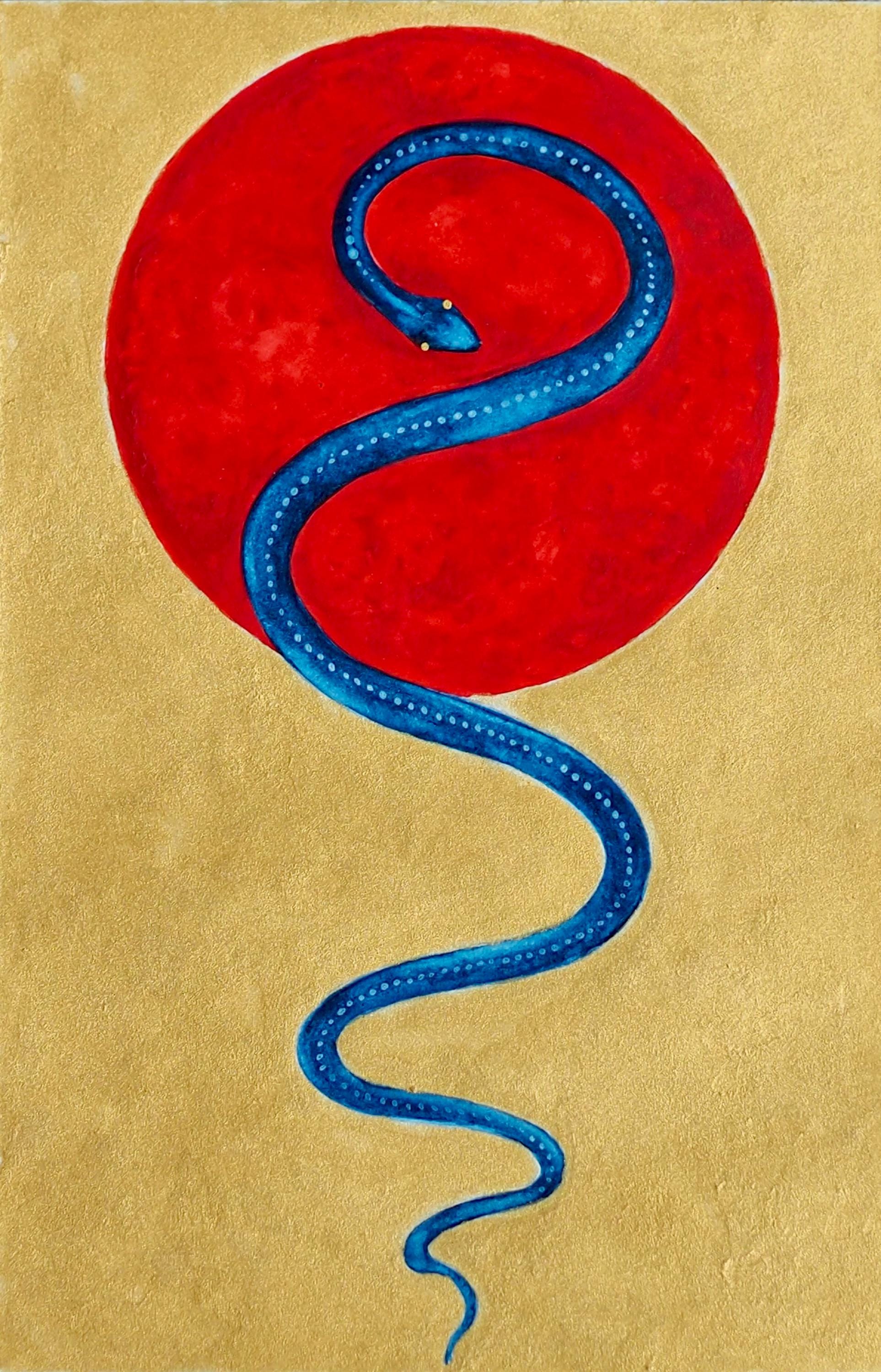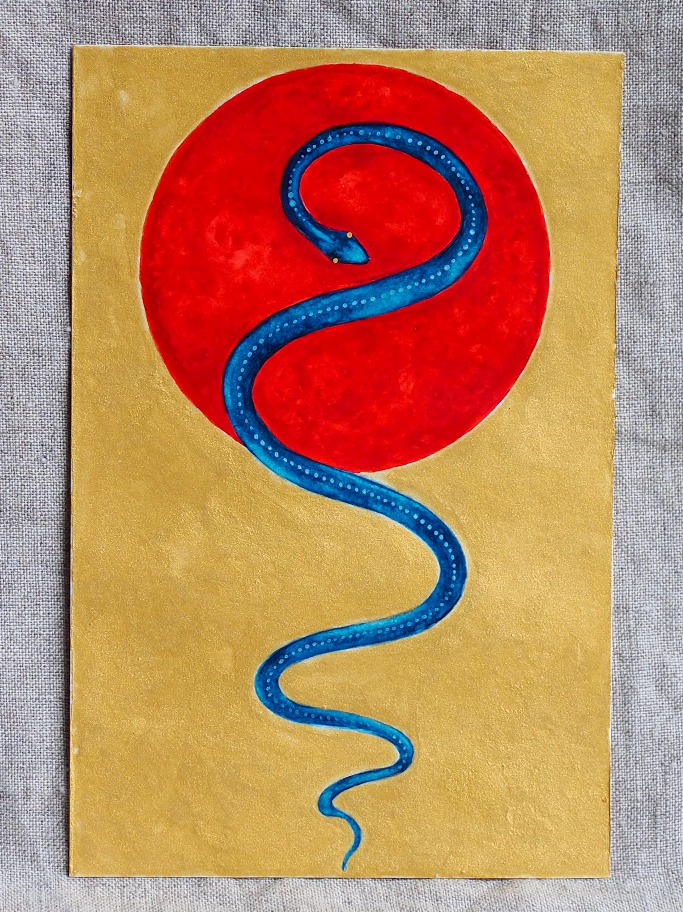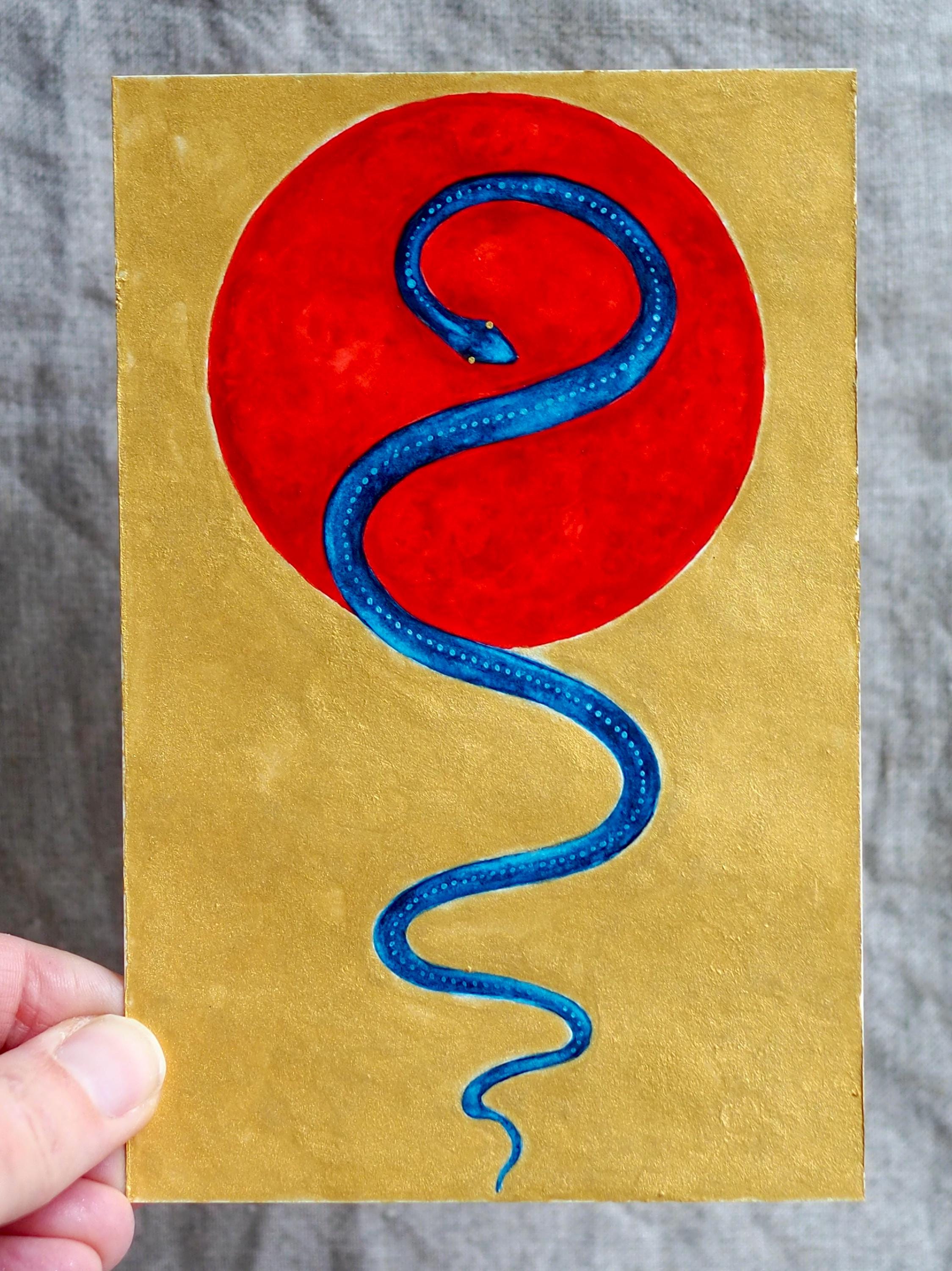 The dark blue serpent is adorned with pale blue dots. It slithers about a red disk, on a metallic gold background. This is an unframed original 4"x6" watercolor, signed by the artist.