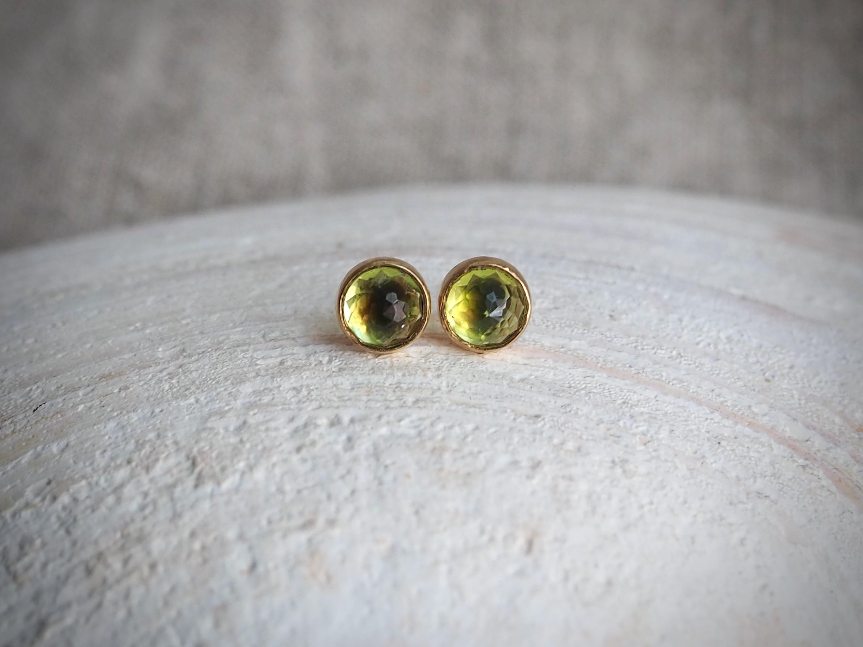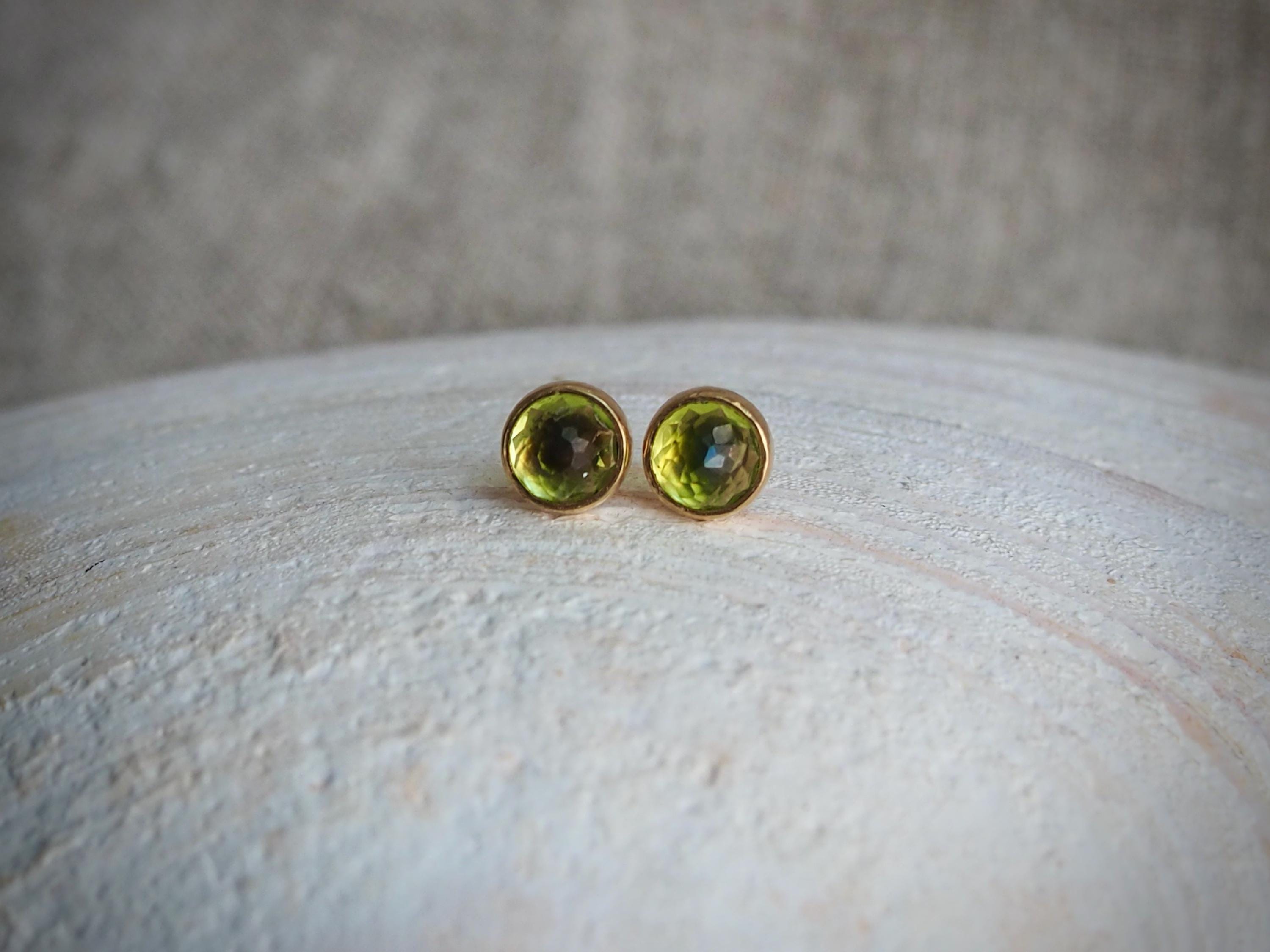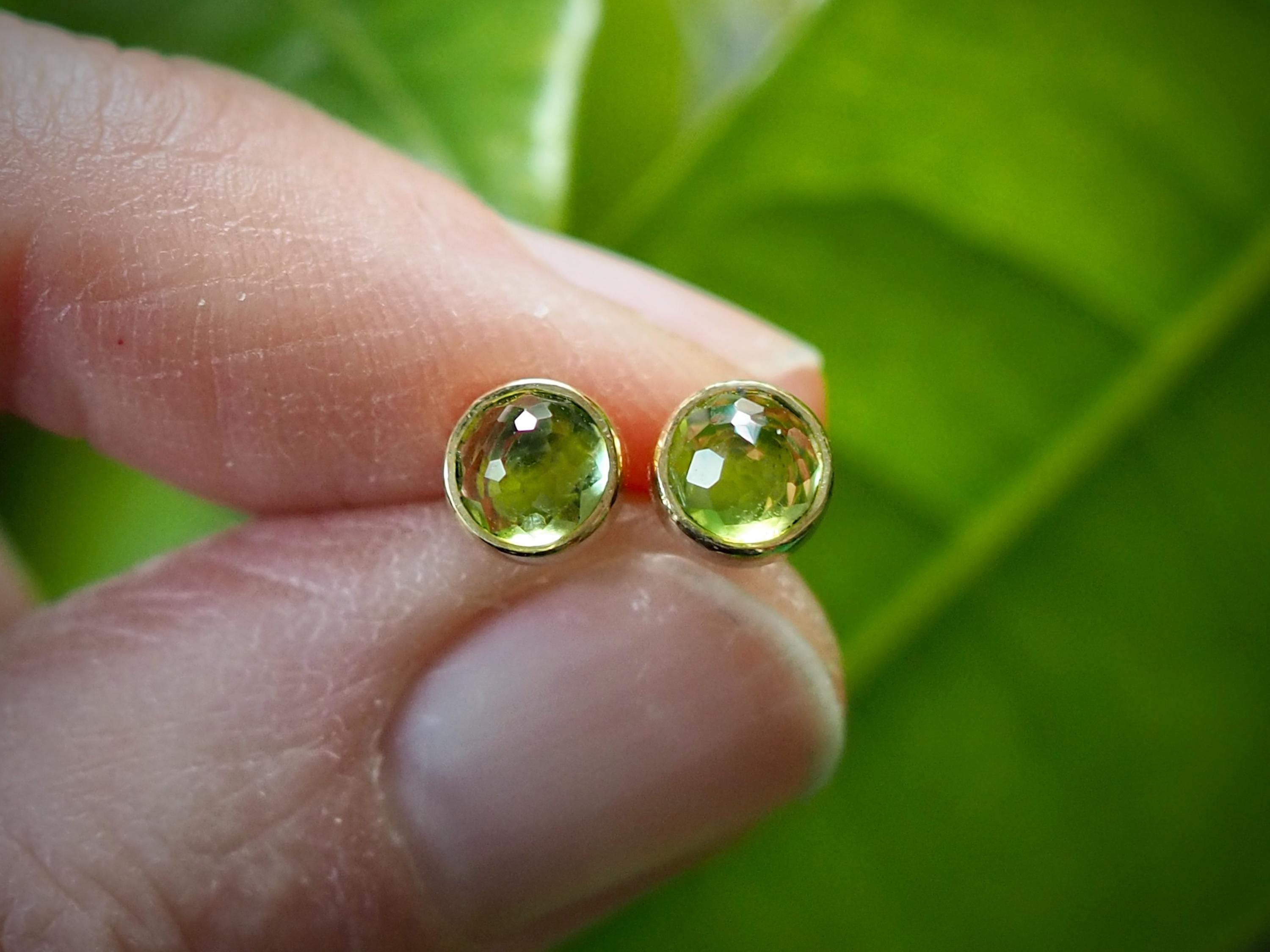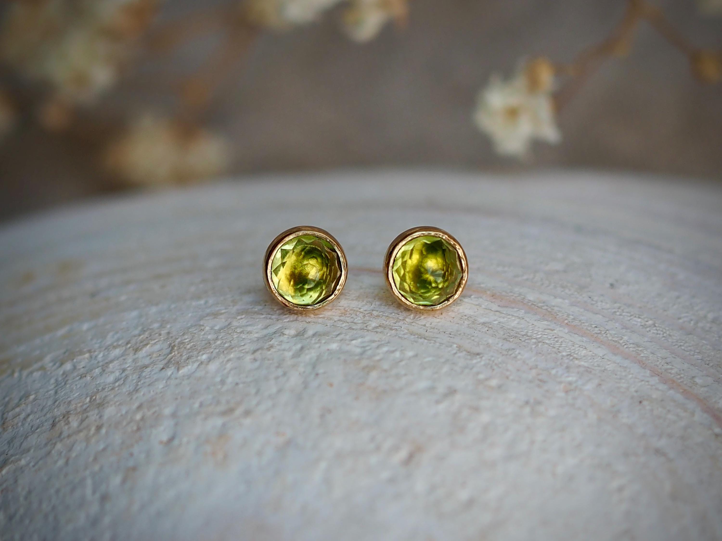 Exquisitely faceted 5mm rose cut peridot stones are set in substantial solid 14k gold bezels with open backs. The stones have beautiful color and clarity, and are cut with kite shaped facets. These earrings are subtle and elegant, with a bright green sparkle. The posts and push backs are solid 14k gold as well.
