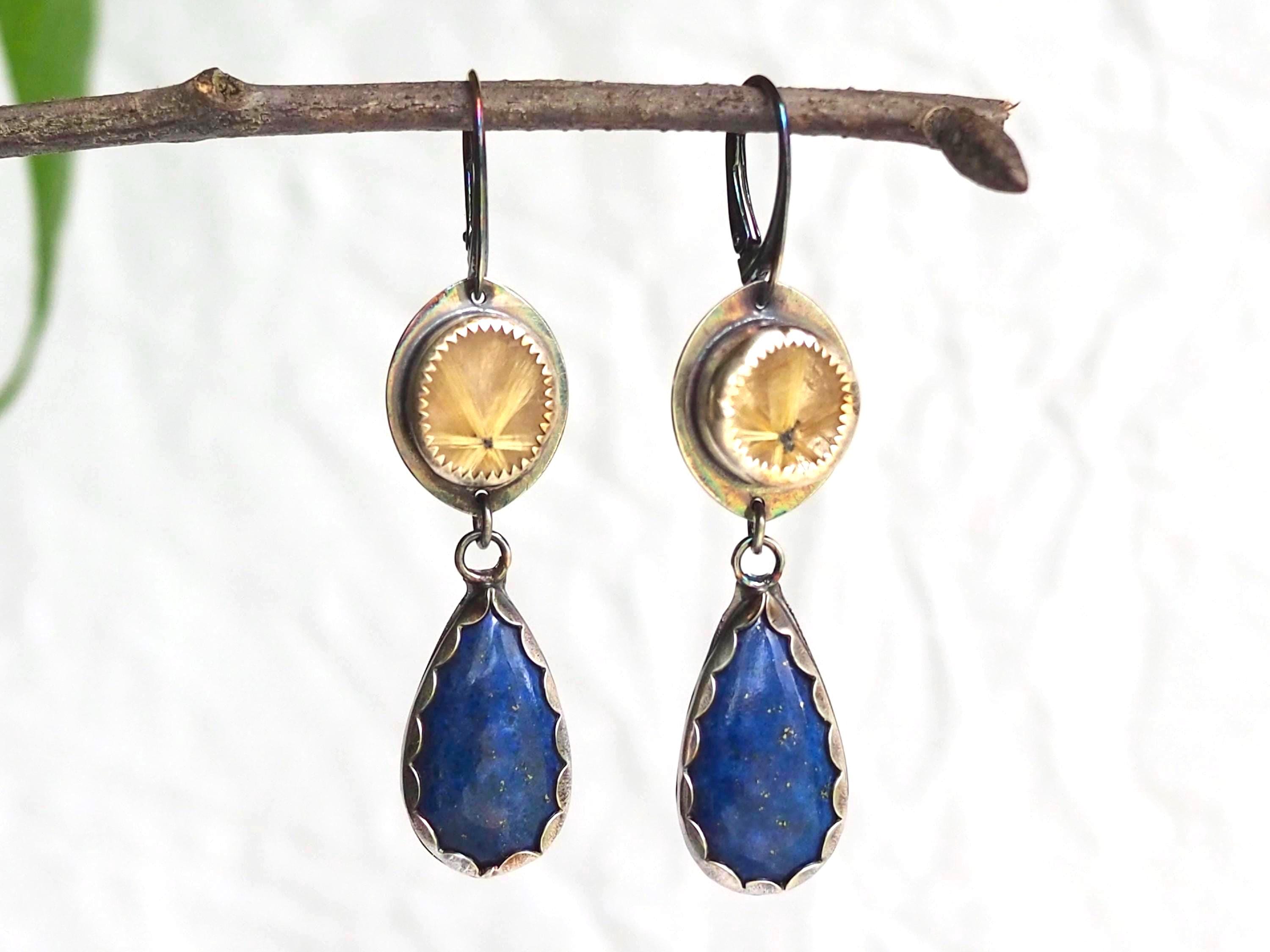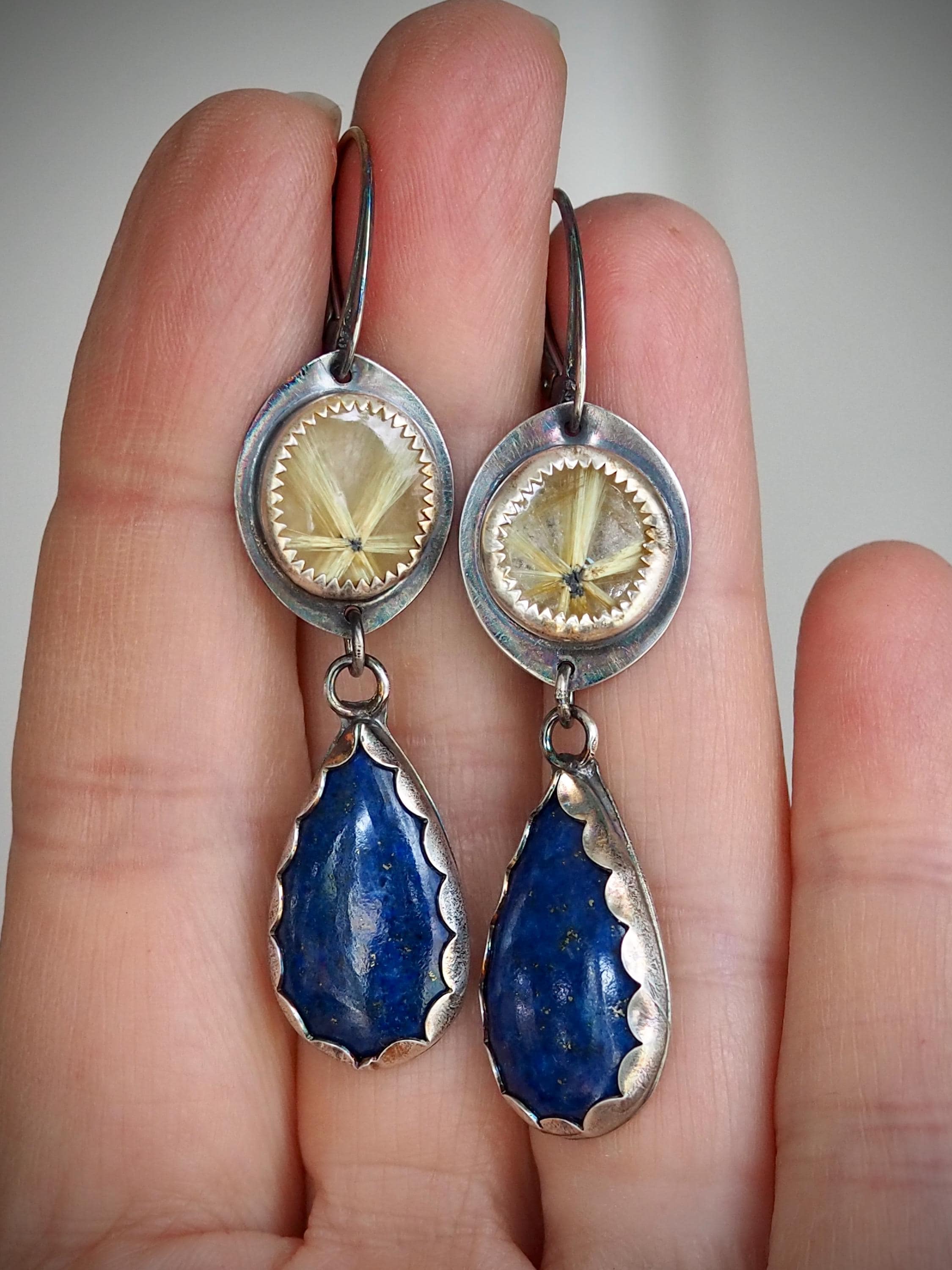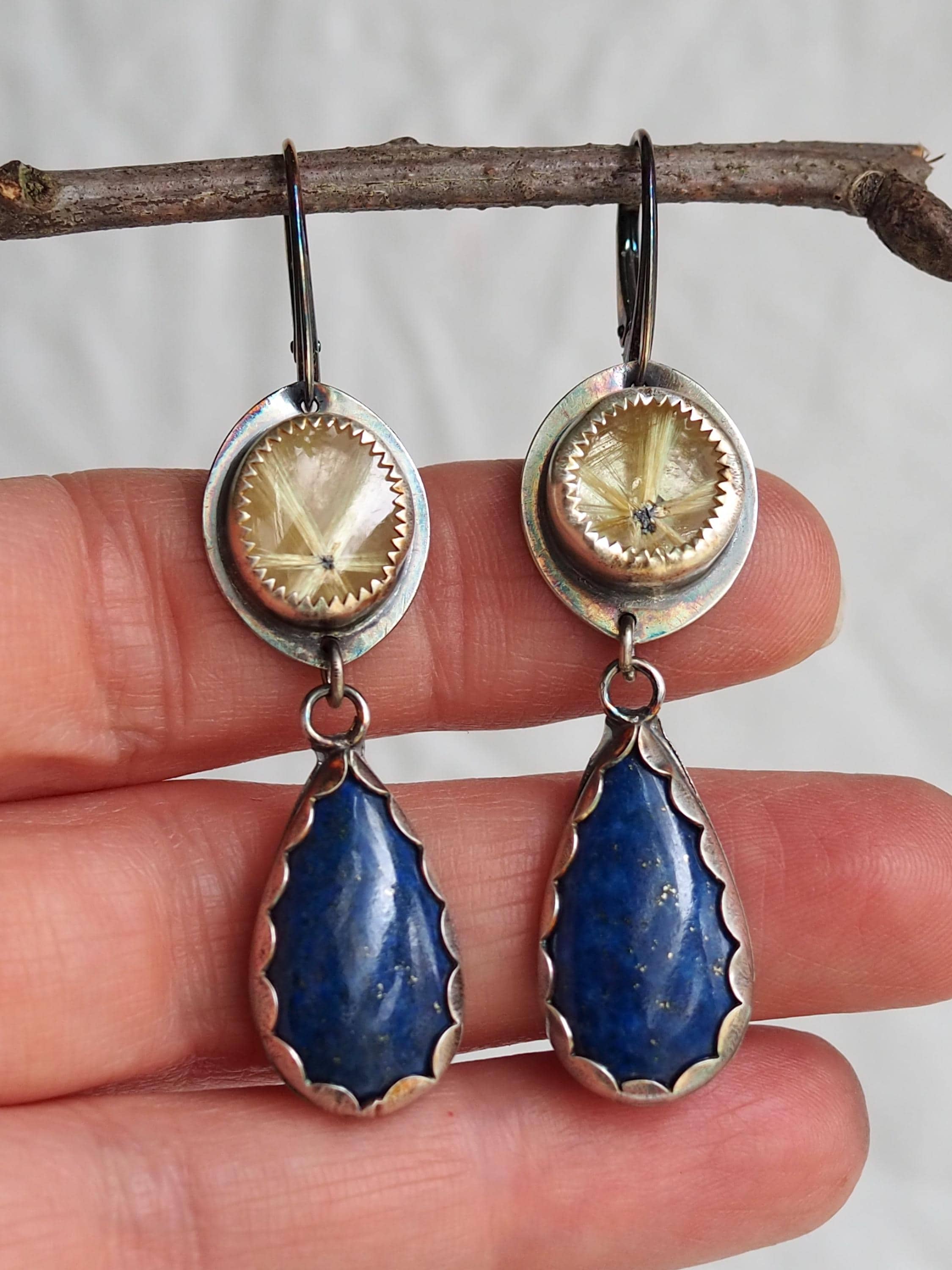 Eye-catching rutilated quartz stones with rich golden starburst inclusions are paired with deep blue lapis lazuli drops speckled with pyrite reminiscent of a starry sky. Stones are set in fine silver with closed sterling silver backplates. The earrings have darkened sterling silver lever back earwires.