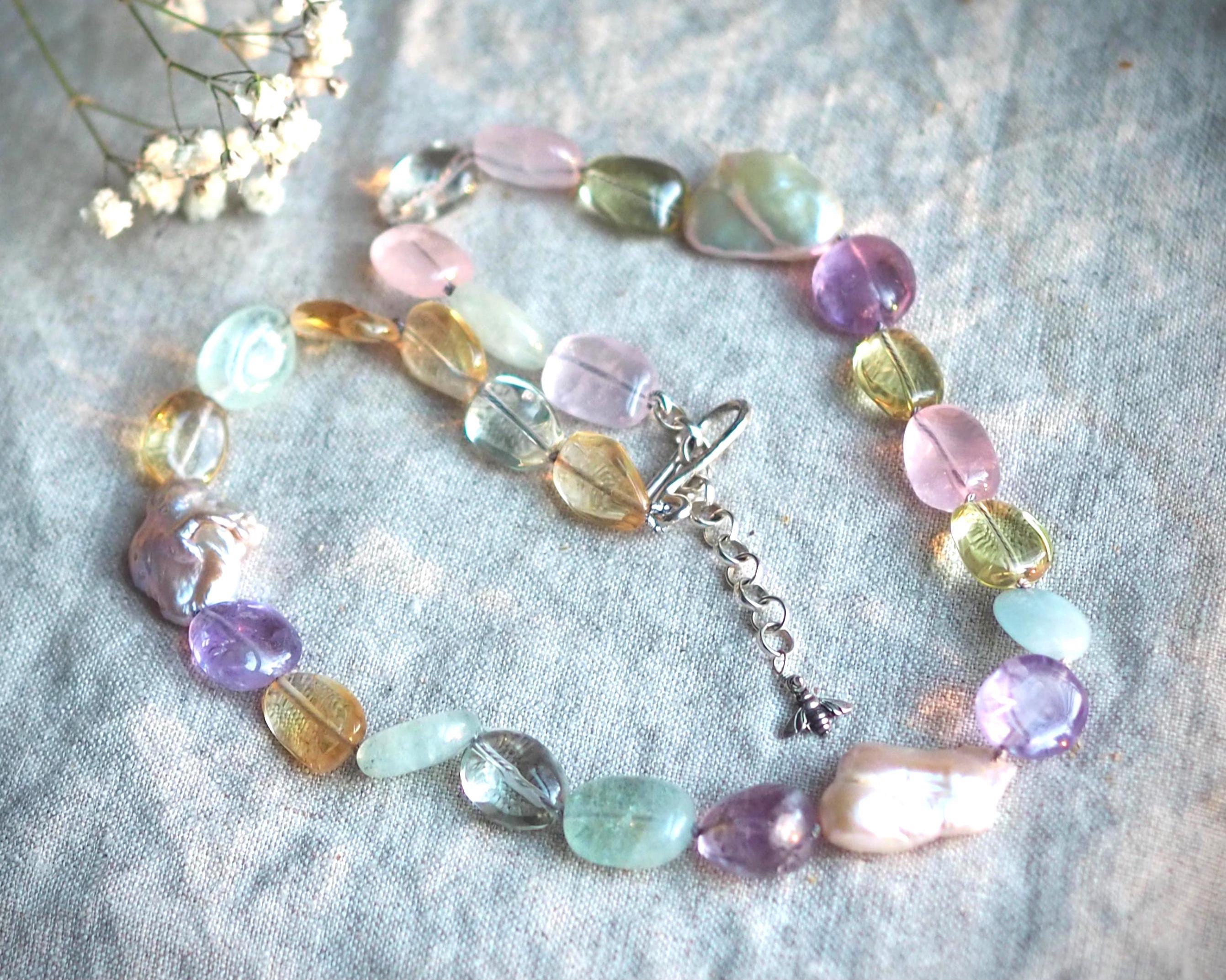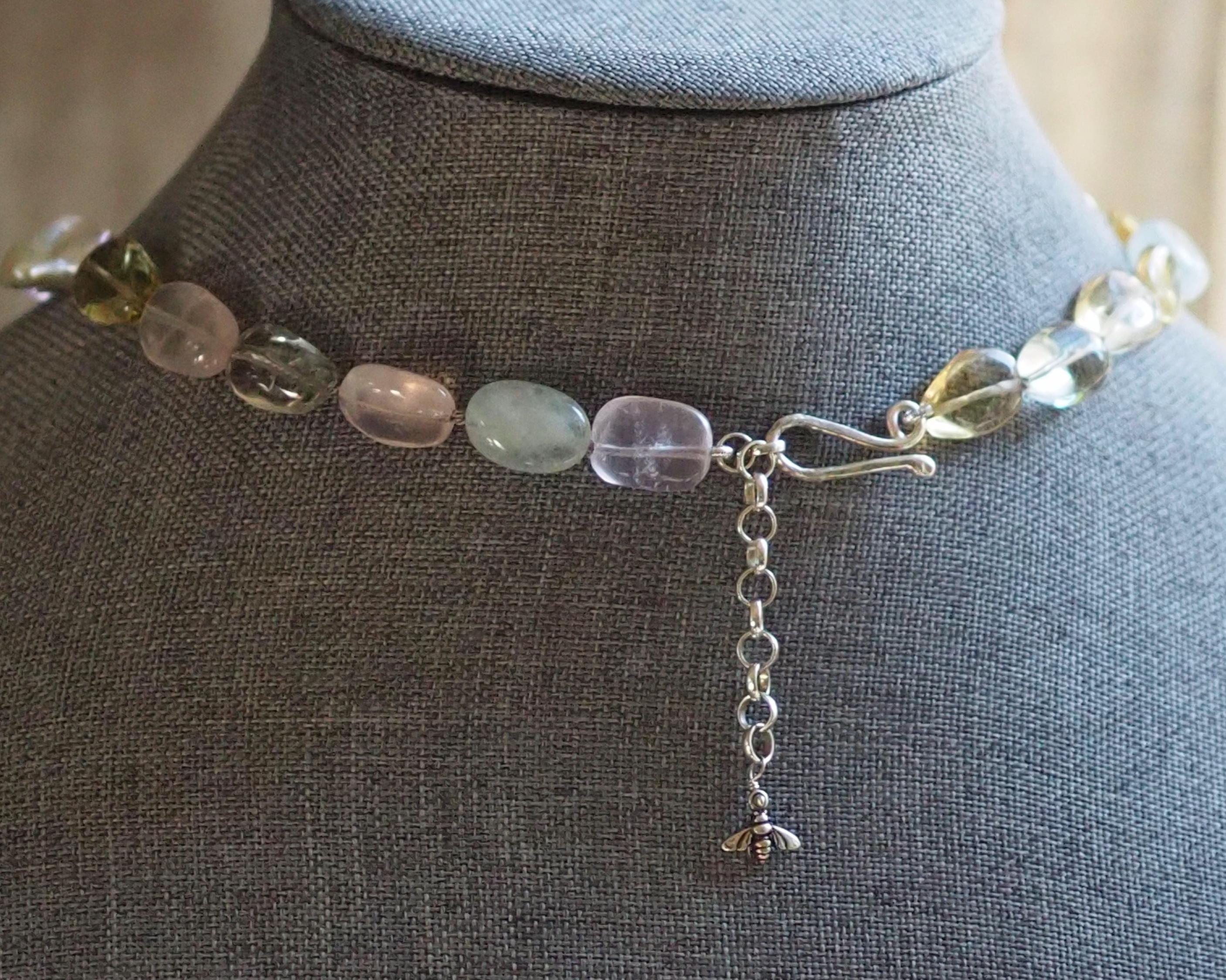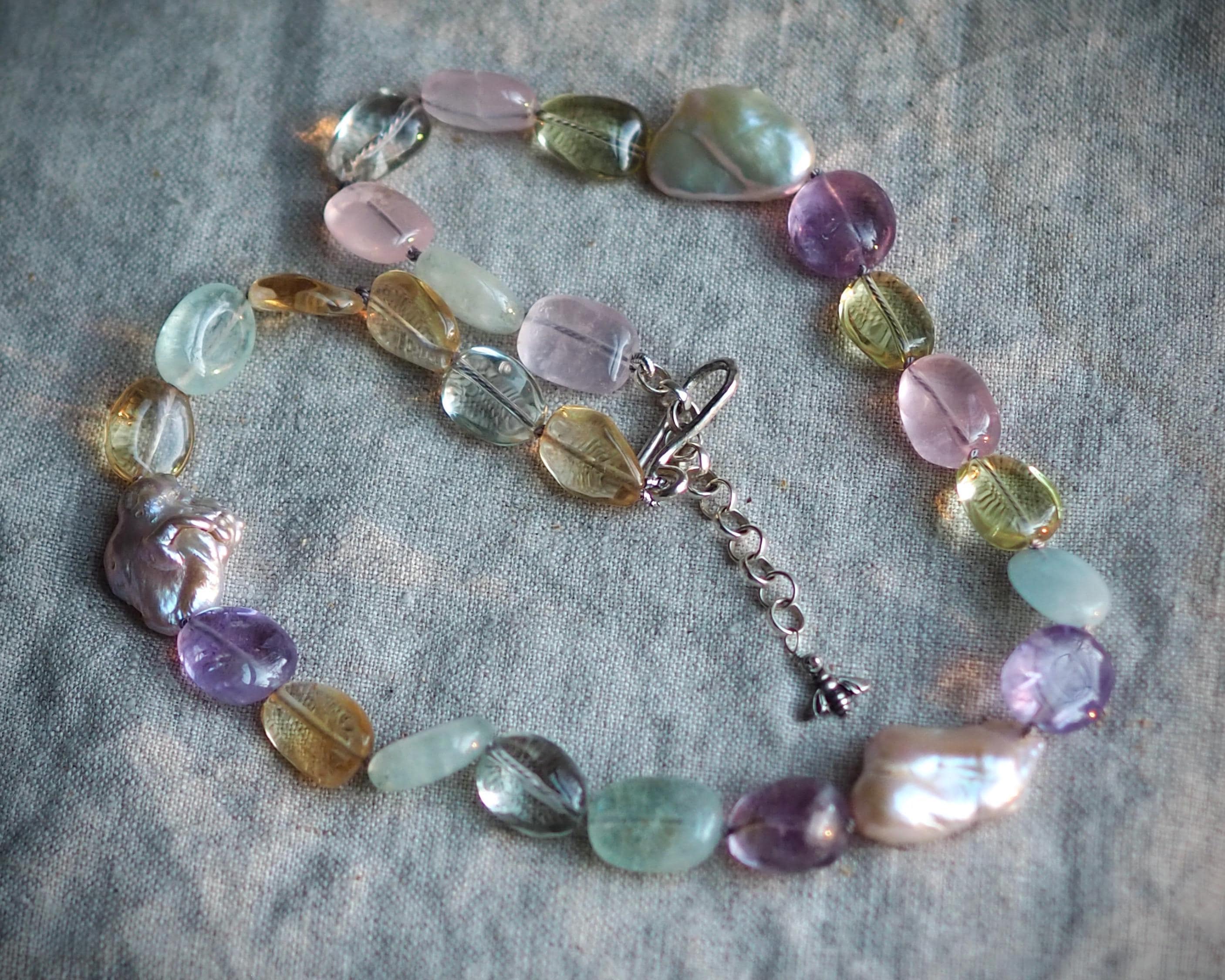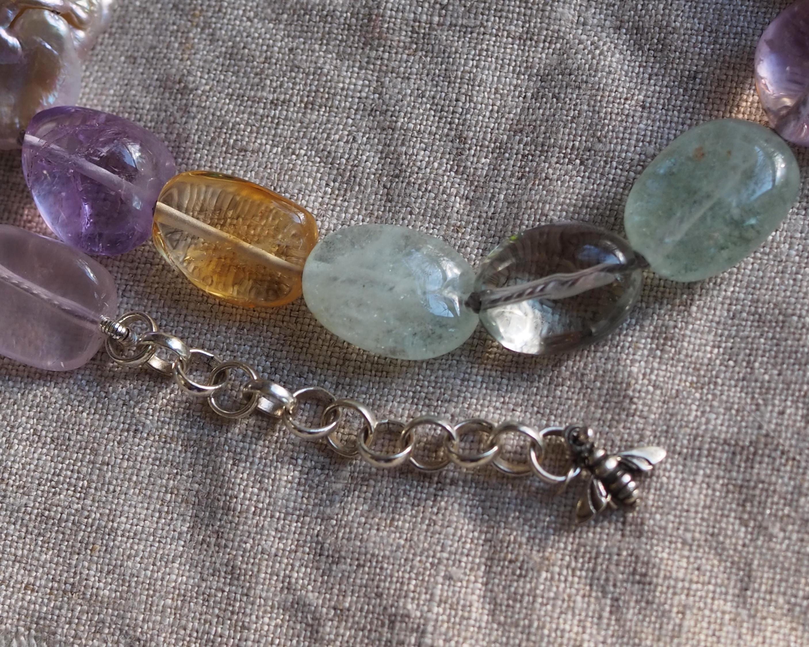 This beautiful and unique necklace has a lovely glow. It is composed of soft purple amethyst, baby blue aquamarine, delicate pink rose quartz, warm golden citrine, cheerful lemon quartz, and three luminescent jumbo baroque pearls. The beads are hand strung and knotted on silvery silk. The length of the necklace is 18" with a handmade sterling silver hook clasp, plus a 2" sterling silver extension chain with a small bee dangle at the end.