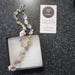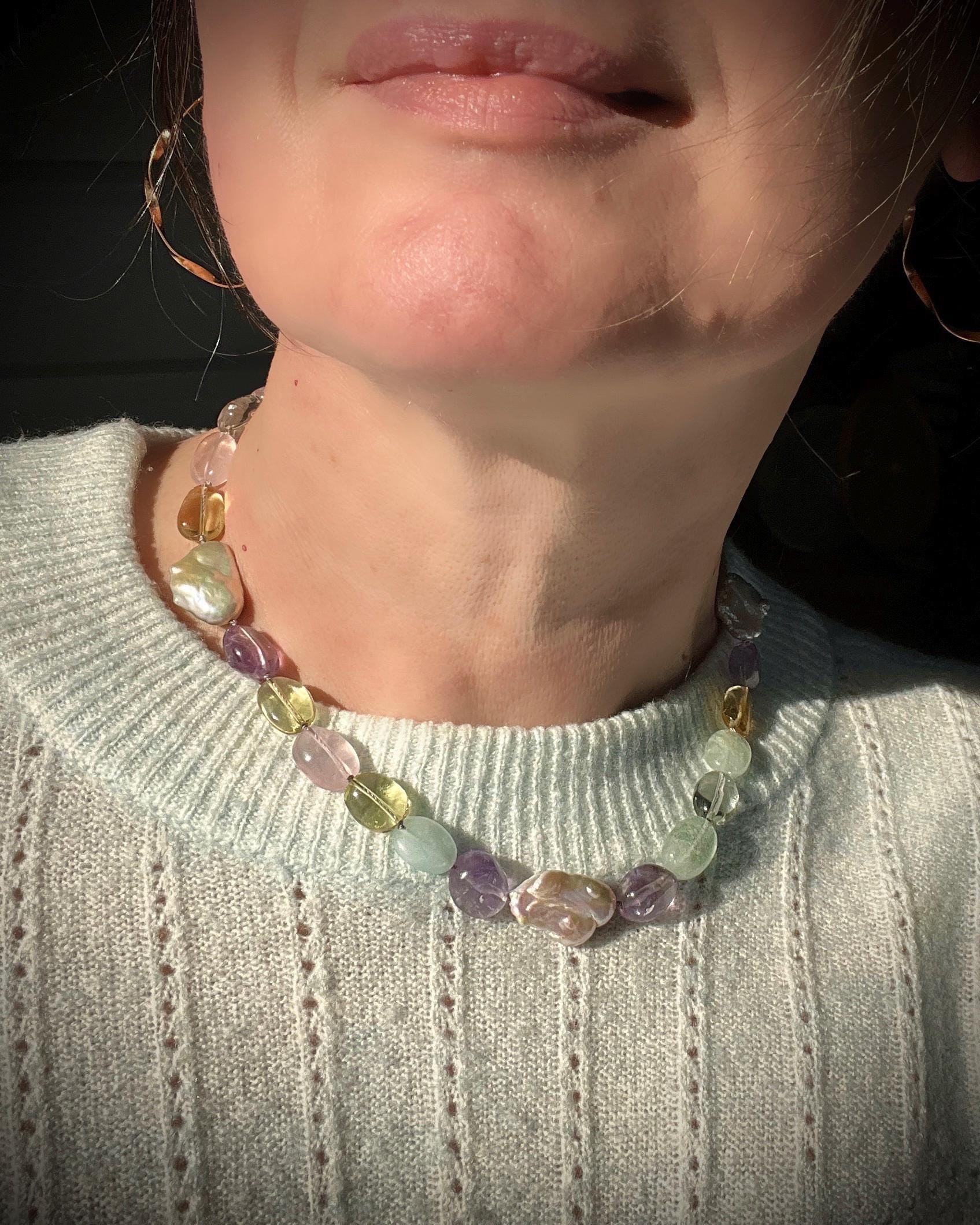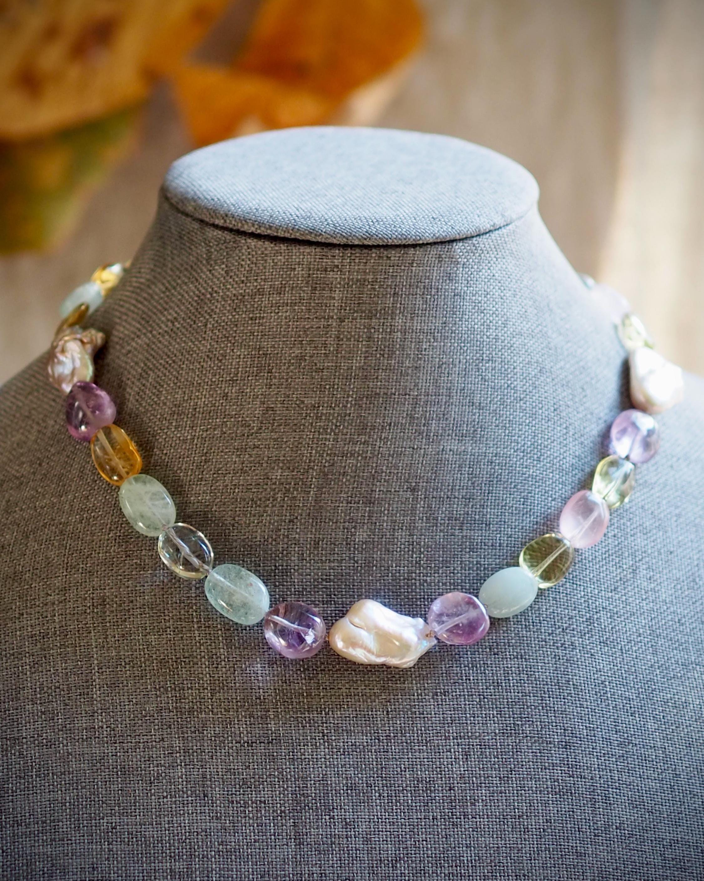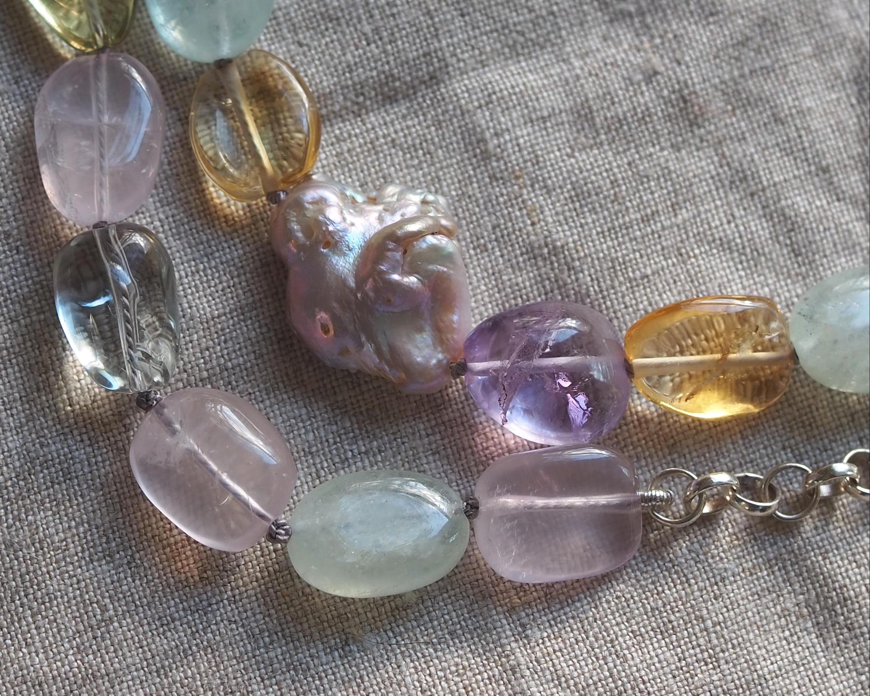 This beautiful and unique necklace has a lovely glow. It is composed of soft purple amethyst, baby blue aquamarine, delicate pink rose quartz, warm golden citrine, cheerful lemon quartz, and three luminescent jumbo baroque pearls. The beads are hand strung and knotted on silvery silk. The length of the necklace is 18" with a handmade sterling silver hook clasp, plus a 2" sterling silver extension chain with a small bee dangle at the end.